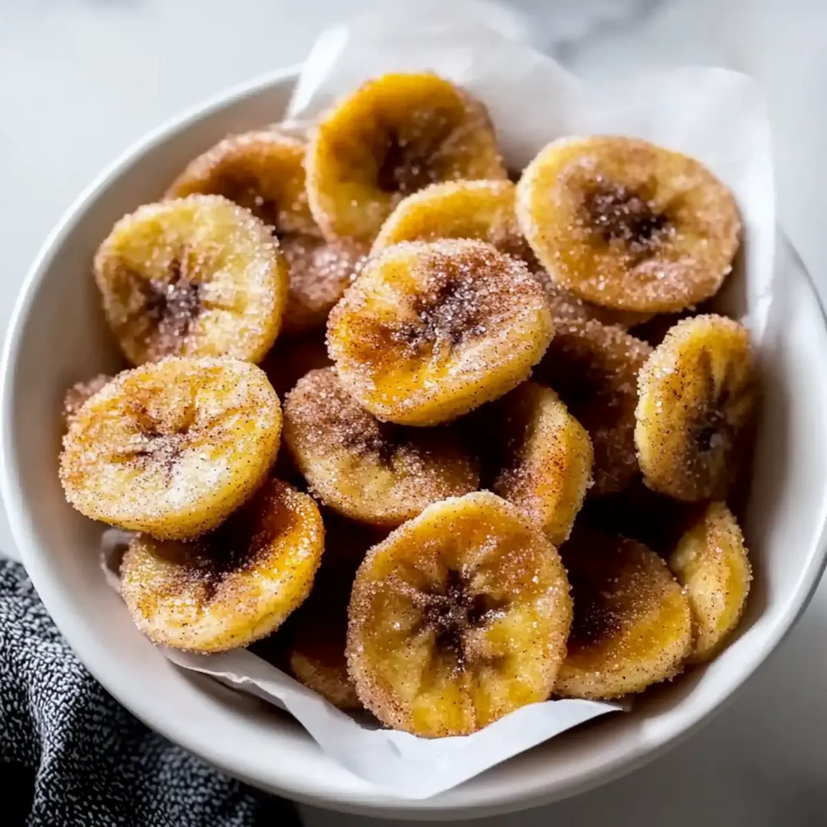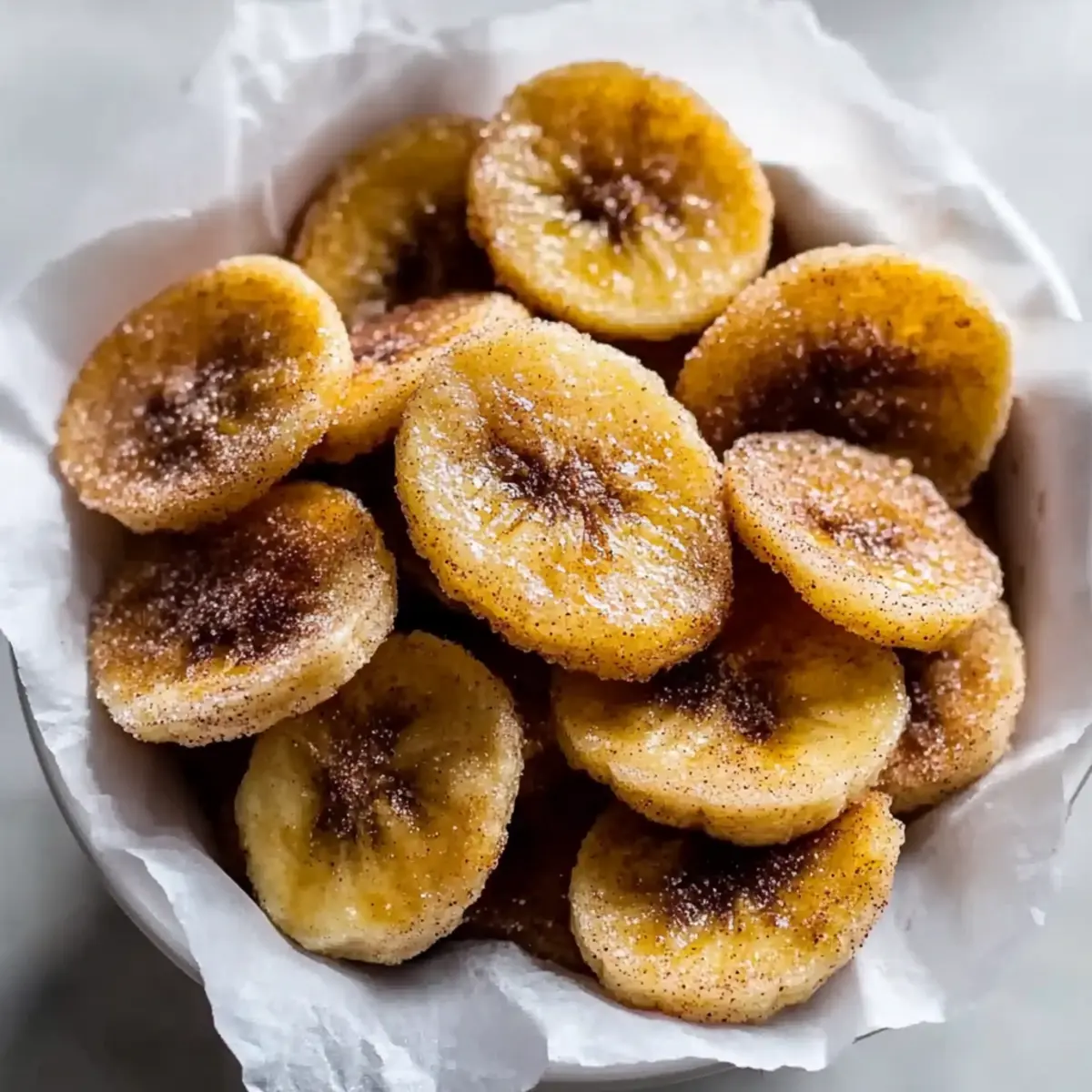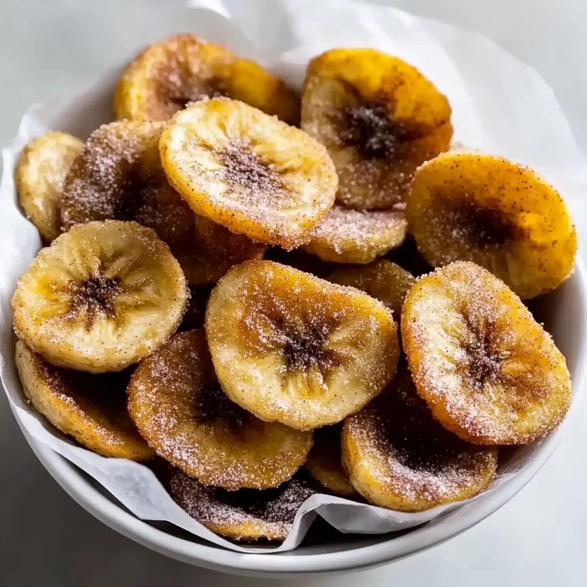 Jump to Recipe Print RecipeThe moment I took my first bite of these Air Fryer Cinnamon Banana Chips, I was transported to a sun-drenched afternoon snack time. Crunchy, sweet, and infused with a warm hint of cinnamon, they tick all the boxes for a delightful treat. Quick to prepare in just 15 minutes, this healthy snack not only satisfies cravings but makes an incredible addition to lunchboxes or a guilt-free nibble throughout the day. With ripe bananas turning into crispy goodness in a matter of minutes, you can indulge without the usual guilt. Whether you’re a seasoned home chef or simply looking for a fun way to use your air fryer, these chips are bound to become a staple in your kitchen. Curious about how to get that perfect crunch? Let’s dive into the recipe! Why Are These Banana Chips So Special? Quick and Easy: In just 15 minutes, you’ll have a deliciously crispy snack without the hassle of deep frying. Healthier Alternative: These Air Fryer Cinnamon Banana Chips are a guilt-free treat, naturally sweetened, making them a perfect snack for both kids and adults. Irresistible Flavor: The warm blend of cinnamon pairs perfectly with the natural sweetness of ripe bananas, offering a truly delightful taste. Versatile Snack: Enjoy them on their own, with yogurt, or use them to elevate your favorite desserts! Crispy Perfection: Each chip boasts a satisfying crunch that rivals traditional snacks while being low in calories and fat. Nutrient-Rich: Packed with potassium, these chips provide a quick energy boost, making them ideal for a midday snack. Try pairing them with nut butter for a balanced treat, or check out our tips for delicious variations! Air Fryer Cinnamon Banana Chips Ingredients For the Chips • Bananas – Use ripe bananas for enhanced sweetness and optimal crunch. • Coconut Oil – Aids in even cooking and adds a subtle flavor; substitute with neutral oil if desired. • Sugar – Provides sweetness and caramelization; consider using a sugar alternative for a lower-calorie option. • Cinnamon – The star spice that enhances flavor; experiment with nutmeg for a different twist if you like. For Serving Suggestions • Yogurt or Nut Butter – Pairing them with yogurt or nut butter creates a balanced, enjoyable snack. Storage Tips • Airtight Container – Store in an airtight container at room temperature for up to three days—or freeze for longer-lasting snacks. These Air Fryer Cinnamon Banana Chips are not just delicious; they provide a healthy, guilt-free way to satisfy your snack cravings! Step‑by‑Step Instructions for Air Fryer Cinnamon Banana Chips Step 1: Prep Bananas Start by peeling 2 ripe bananas, ensuring they are spotty for natural sweetness. Slice the bananas into thin, even rounds, about 1/8 inch thick, using a mandoline slicer or a sharp knife for precision. Uniform slices will ensure even cooking and maximum crunch, setting the stage for your delicious Air Fryer Cinnamon Banana Chips. Step 2: Coat Bananas In a mixing bowl, toss the sliced bananas with 1 tablespoon of melted coconut oil until they are lightly coated on both sides. This coating ensures the banana slices crisp up beautifully rather than stick together during the air frying process. The combination of coconut oil and banana will elevate the natural flavors in your chips. Step 3: Mix Cinnamon Sugar In a small bowl, combine 2 tablespoons of sugar with 1 teaspoon of ground cinnamon. Mix thoroughly until the sugar is evenly coated with cinnamon. This fragrant blend will provide the perfect sweet spice that enhances each bite of your Air Fryer Cinnamon Banana Chips, infusing your kitchen with a warm, inviting aroma. Step 4: Arrange in Air Fryer Lay the banana slices in a single layer in the air fryer basket, ensuring they do not overlap for optimal cooking. Evenly sprinkle the cinnamon sugar mixture over the top of the banana slices, allowing for a uniform sweetness and flavor distribution. This arrangement is key to achieving that irresistible crunch. Step 5: Cook Set the air fryer to 350°F (175°C) and cook the banana chips for 8-10 minutes. Be sure to flip the chips halfway through to ensure even crisping. Keep a close eye on them towards the end of the cooking time; the perfect Air Fryer Cinnamon Banana Chips should be golden brown and crispy without burning. Step 6: Cool Once your chips have finished cooking, carefully transfer them to a wire rack or a plate to cool. Allowing them to rest will enable them to continue crisping up as they cool down. This step is crucial, as the cooling process enhances the crunchy texture you’re after, making these banana chips truly delightful. What to Serve with Air Fryer Cinnamon Banana Chips Elevate your snack game with delicious pairings that bring out the best in these crunchy delights! Greek Yogurt: The creamy texture offers a delightful contrast to the crispy chips, making it a perfect dip that enhances the sweet cinnamon flavor. Nut Butter: Pairing them with almond or peanut butter creates a satisfying blend of crunch and creaminess while adding protein and healthy fat. Fruit Salad: Fresh fruits like berries or apples add a refreshing element. The sweetness of the fruit complements the cinnamon-spiced banana chips beautifully. Smoothies: Enjoy these chips as a side with refreshing smoothies. Their crunchiness provides contrast to the creamy, fruity beverages for a well-rounded snack. Trail Mix: Mix in your chips with nuts and dried fruits for a homemade trail mix. This combination creates a delightful balance of flavors and textures! Ice Cream: For a luxurious treat, crush the chips and sprinkle them over your favorite ice cream. The combination of crunchy, warm cinnamon and cold dessert is simply irresistible. Air Fryer Cinnamon Banana Chips Variations Feel free to get creative with these delightful chips and make them your own! Dairy-Free: Replace coconut oil with almond or avocado oil for a vegan-friendly twist while keeping the chips cr
