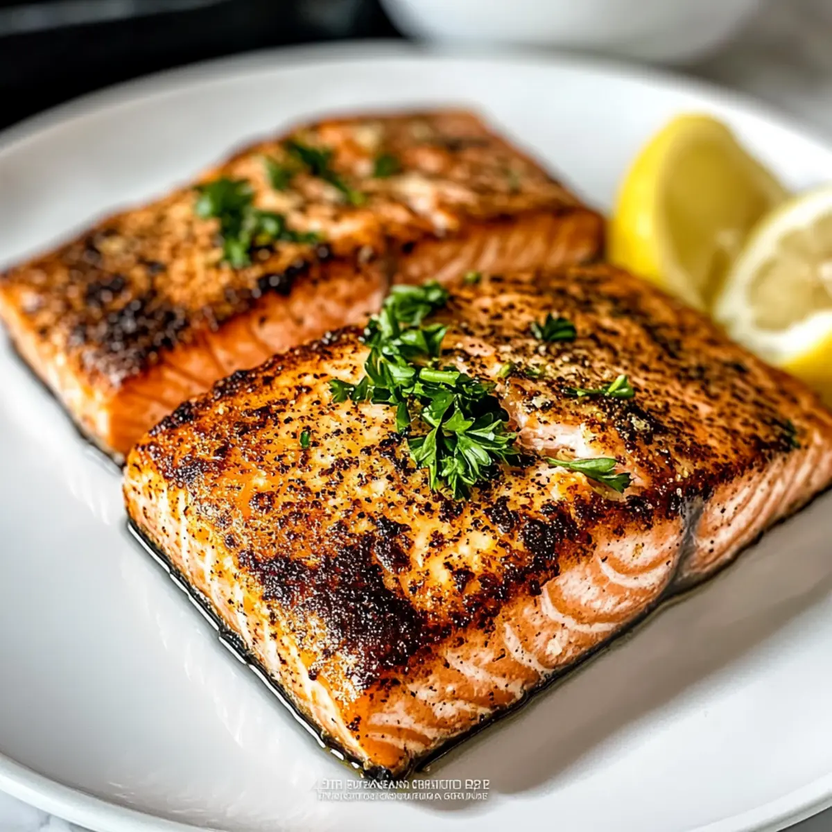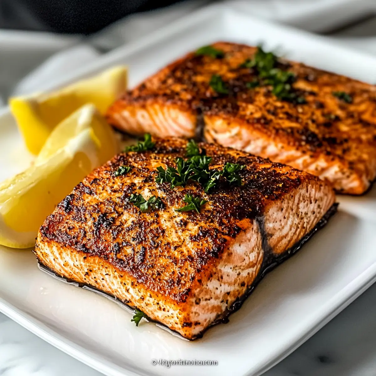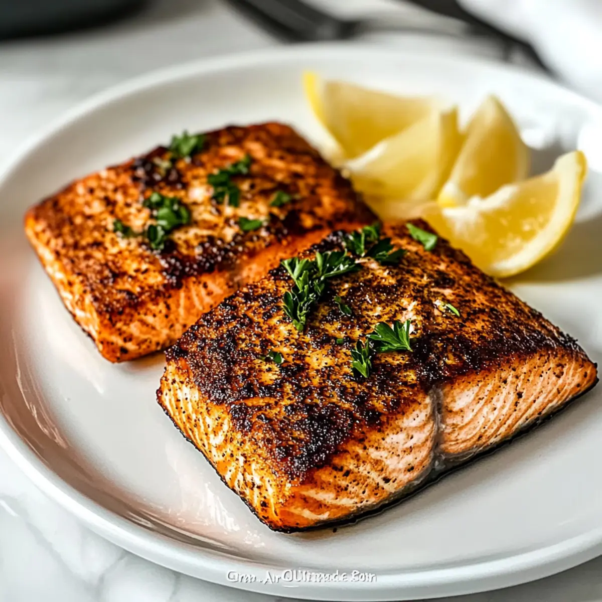 Jump to Recipe Print RecipeAs I stood at my kitchen counter, the enticing aroma of garlic and lemon wafted through the air, instantly making my stomach growl. That’s when I knew I had to share my favorite go-to meal: Air Fryer Salmon. This recipe not only delivers a crispy, golden exterior but also a flaky tenderness that evokes the feeling of a fine dining experience right at home. Packed with nutrients and ready in under 15 minutes, it’s a lifesaver for those busy weeknights when cooking feels more like a chore than a pleasure. With just a handful of simple ingredients and its incredible versatility, you’ll be able to create variations like Garlic Butter Salmon or Honey Glazed Salmon—perfect for impressing guests or treating yourself. Who knew a quick dinner could be so satisfying? Are you ready to dive into this delicious journey? Why is Air Fryer Salmon a Game Changer? Quick Cooking: Imagine a delicious dinner on your table in just 15 minutes! This Air Fryer Salmon is a breeze to make, perfect for those busy evenings. Delicious Variations: Whether you crave Garlic Butter Salmon or a sweet twist with Honey Glazed Salmon, this recipe is incredibly versatile, allowing you to switch up flavors easily. Healthful Ingredients: Packed with nutrients, salmon offers essential omega-3 fatty acids, making this dish not just tasty but also good for you. Texture Excellence: The combination of a crispy exterior and tender, flaky inside delivers a satisfying bite that rivals any restaurant dish. Simple Prep: With minimal ingredients and straightforward steps, even beginner cooks will feel confident whipping this up. Crowd-Pleasing Appeal: This meal is sure to impress guests, making it an ideal choice for intimate dinners or larger gatherings. Plus, it’s gluten-free! Air Fryer Salmon Ingredients For the Salmon Salmon Fillets – Key protein source; look for fresh, skin-on fillets for the best results. For the Marinade Olive Oil – Adds moisture and helps achieve a crispy exterior; avocado oil can be substituted if desired. Garlic Powder – Provides savory flavor; fresh garlic can add a bolder taste if you prefer. Paprika – Adds mild spice and vibrant color; consider using smoked paprika for a deeper flavor profile. Salt & Black Pepper – Essential seasonings that enhance all flavors; sea salt adds great texture. Onion Powder – Contributes sweetness and depth; finely chopped shallots can be used as a substitute. Cayenne Pepper (optional) – For a bit of heat; feel free to omit for a milder flavor. Lemon Juice – Brightens the dish and adds necessary acidity; fresh lemon is always preferred for zestiness. For Garnish Fresh Parsley – Adds a pop of color and freshness; you can substitute with dill or cilantro for a different twist. Lemon Wedges – Serve alongside for an added refreshing touch. Embrace the joy of making Air Fryer Salmon, a dish that promises quick preparation without skimping on taste! Step‑by‑Step Instructions for Air Fryer Salmon Step 1: Prepare the Salmon Start by patting the salmon fillets dry with a paper towel; this step ensures a crispy exterior. Check for any pin bones and remove them with tweezers if necessary, then set the fillets aside while you prepare the flavorful seasoning mix. Step 2: Mix the Marinade In a small bowl, combine olive oil, garlic powder, paprika, salt, black pepper, onion powder, and cayenne pepper if using. Stir until well blended to create a savory marinade that will infuse the Air Fryer Salmon with delicious flavor. Step 3: Season the Fillets Rub the seasoning mixture generously over each salmon fillet, ensuring an even coating for maximum flavor. Drizzle lemon juice on top of the fillets to enhance the vibrant taste and aroma. Let the salmon sit for a few minutes to absorb all the flavors. Step 4: Preheat the Air Fryer Preheat your air fryer to 375°F (190°C) for about 3 minutes. This step is crucial for achieving that perfect crispy finish. While the air fryer heats, you can prepare your serving plates or side dishes for a delightful meal. Step 5: Arrange the Salmon Carefully place the seasoned salmon fillets skin-side down in the air fryer basket. Make sure they are not overcrowded to allow for even cooking. This positioning helps in minimizing any sticking and keeps the fillets intact while cooking. Step 6: Cook the Salmon Cook the salmon in the air fryer for 8 to 10 minutes, depending on the thickness of the fillets. You’ll know the Air Fryer Salmon is done when it flakes easily with a fork and reaches an internal temperature of 145°F (63°C). Step 7: Garnish and Serve Once cooked, carefully remove the fillets from the air fryer and garnish with freshly chopped parsley. Serve immediately with lemon wedges alongside, allowing everyone to add a refreshing squeeze of lemon to their salmon for that extra zest! Make Ahead Options These Air Fryer Salmon fillets are perfect for meal prep enthusiasts! You can season the salmon with your marinade and refrigerate it up to 24 hours in advance, allowing the flavors to meld beautifully. For best results, pat the fillets dry before applying the seasoning to maintain that delightful crispy texture when cooked. Additionally, feel free to prepare the marinade a few days ahead; store it in an airtight container in the refrigerator. When it’s time to cook, simply preheat the air fryer, arrange the marinated salmon in the basket, and follow the cooking instructions. This prep-ahead strategy not only saves you valuable time but also ensures a delicious, stress-free dinner on busy weeknights! Air Fryer Salmon: Delicious Variations Customize your Air Fryer Salmon to match your cravings and elevate your dinner experience with these playful twists and substitutions! Garlic Butter: Brush with melted garlic butter just before air frying for a luscious flavor boost. Teriyaki Twist: Coat your salmon fillets in teriyaki sauce for a sweet and savory profile that adds depth to the dish. Spicy Cajun: S