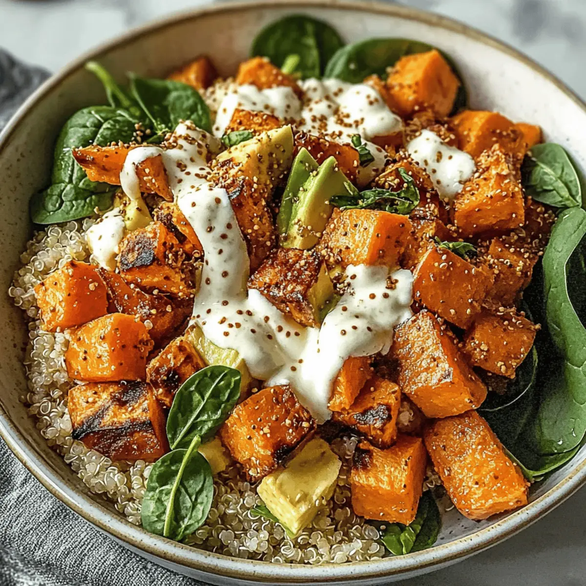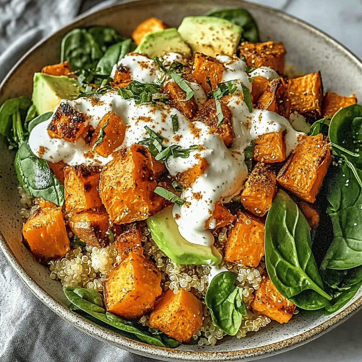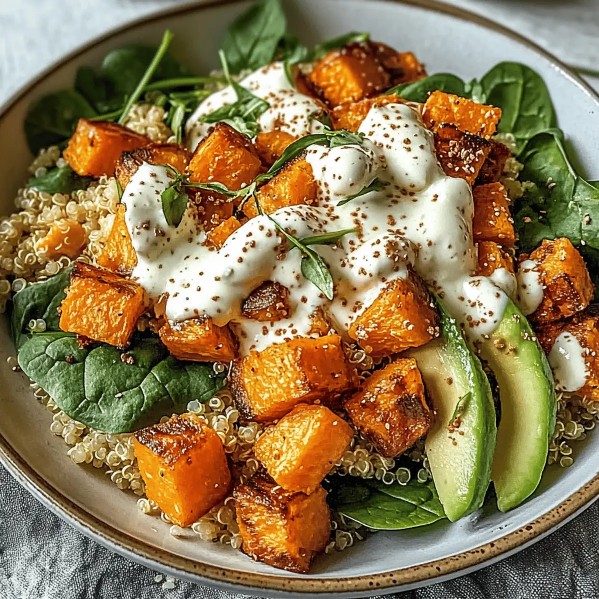 Jump to Recipe Print RecipeThe scent of roasted sweet potatoes wafts through my kitchen, instantly bringing a smile to my face. If you’re on the lookout for a colorful, nutritious meal to brighten your day, my Anti-Inflammatory Glow Bowl with Creamy Tahini Yogurt is just the ticket. This dish, brimming with crispy sweet potatoes and hearty quinoa, is not only a feast for the eyes but also incredibly easy to whip up. It’s a customizable delight that can fit perfectly into your meal prep routine or serve as a nourishing dinner after a long day. Filled with anti-inflammatory ingredients, this bowl promises to enhance your well-being while satisfying your cravings. Are you ready to create a meal that’s as good for you as it is delicious? Why is the Glow Bowl a must-try? Vibrant Colors: This Anti-Inflammatory Glow Bowl is a visual treat, with a beautiful balance of colors that make healthy eating appealing and fun. Nutrient-Rich: Packed with wholesome ingredients like quinoa and sweet potatoes, it’s a powerhouse of nutrients designed to nourish your body. Customizable: Easily adapt it to your tastes—swap quinoa for brown rice or throw in your favorite veggies for a personal touch. Time-Saving: Perfect for meal prep, it can be made in advance and stored, helping you stay on track with healthy eating during busy weeks. Crowd-Pleaser: Whether for family dinner or a gathering, this dish impresses everyone with its delightful flavors and textures. For more great meal ideas, check out my Sriracha Salmon Bowls or indulge in a sweet treat with Chocolate Oat Cookies! Anti-Inflammatory Glow Bowl Ingredients For the Base • Quinoa – Provides protein and fiber; rinse before cooking for best results. • Sweet Potatoes – Adds natural sweetness and creaminess; use firm potatoes for optimal texture. • Chickpeas – Canned for convenience, they contribute protein and heartiness to the bowl. For the Greens • Fresh Baby Spinach – Offers a mild flavor and bright color; wash thoroughly to eliminate grit. • Avocado – Adds creaminess; select ripe avocados that yield slightly when pressed. For the Sauce • Tahini – A rich sesame paste; ensure thorough stirring before measuring. • Lemon Juice – Freshly squeezed enhances flavor; avoid bottled juice for best taste. For Seasoning • Ground Cumin & Turmeric – These spices deliver key anti-inflammatory benefits; use ground versions for ease. • Extra Virgin Olive Oil – Enhances flavors and provides healthy fats; drizzle over veggies. • Salt & Pepper – Essential seasonings; adjust to your taste preference for maximum flavor impact. Step‑by‑Step Instructions for Anti-Inflammatory Glow Bowl Step 1: Cook Quinoa Start by rinsing 1 cup of quinoa under cold water to remove any bitterness. In a medium saucepan, combine the rinsed quinoa with 2 cups of water and bring it to a boil over high heat. Once boiling, reduce the heat to low, cover, and let it simmer for approximately 15 minutes, or until the water has been absorbed. Fluff the quinoa with a fork and set aside to cool. Step 2: Roast Sweet Potatoes Preheat your oven to 425°F (220°C). While the oven heats, peel and dice 2 medium sweet potatoes into bite-sized pieces. Toss them in a large bowl with a drizzle of extra virgin olive oil, ground cumin, salt, and pepper until evenly coated. Spread the sweet potatoes on a parchment-lined baking sheet and roast for about 25 minutes, flipping halfway through, until they are golden, tender, and slightly crispy. Step 3: Sauté Chickpeas In a skillet, heat a splash of olive oil over medium heat. Drain and rinse 1 can of chickpeas, then add them to the skillet along with ground turmeric, cumin, salt, and pepper. Sauté the chickpeas for about 10 minutes, stirring occasionally, until they are warmed through and develop a light crispness on the outside. This adds a lovely texture to your Anti-Inflammatory Glow Bowl. Step 4: Make Tahini Yogurt Sauce In a mixing bowl, whisk together 3 tablespoons of tahini, 1 cup of plain yogurt, the juice of 1 lemon, and a pinch of salt. Gradually add water, a tablespoon at a time, until you reach your desired creamy consistency. This sauce will provide a smooth, nutrient-rich layer to your Anti-Inflammatory Glow Bowl, enhancing each delicious bite. Step 5: Assemble the Bowl Begin layering your Anti-Inflammatory Glow Bowl by placing a generous scoop of the cooked quinoa at the bottom of each bowl. Top with the roasted sweet potatoes, crispy sautéed chickpeas, a handful of fresh baby spinach, and slices of ripe avocado. Finally, drizzle the creamy tahini yogurt sauce over the top, allowing it to blend perfectly with all the vibrant ingredients. Make Ahead Options These Anti-Inflammatory Glow Bowls are perfect for meal prep enthusiasts! You can cook the quinoa and roast the sweet potatoes up to 3 days in advance, storing them in airtight containers in the refrigerator to maintain freshness. Additionally, the tahini yogurt sauce can be made ahead of time, as it keeps well for up to 5 days; just give it a good stir before serving to restore its creamy consistency. When you’re ready to serve, simply reheat the quinoa and sweet potatoes, toss everything together with the fresh spinach and avocado, and drizzle the tahini sauce on top. This way, you’ll enjoy a nourishing meal with minimal effort on busy weeknights! What to Serve with Anti-Inflammatory Glow Bowl with Tahini Yogurt Elevate your mealtime experience with delightful sides and beverages that complement the vibrant flavors of your bowl. Tangy Citrus Salad: A refreshing mix of citrus fruits brightens the palate, enhancing the glow bowl’s earthy tones with a zesty contrast. Crispy Roasted Brussels Sprouts: Their crunch and nutty flavor pair beautifully with the creamy tahini yogurt, adding an extra layer of texture. Herbed Quinoa Salad: A chilled quinoa salad tossed with fresh herbs can add a lightness that balances the hearty components of the bowl. St