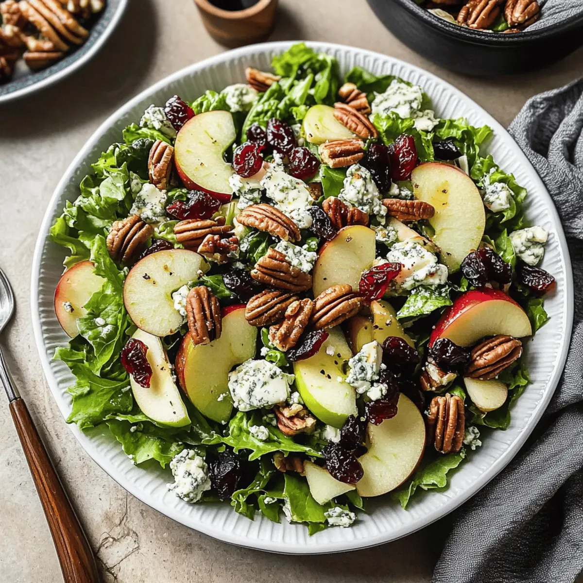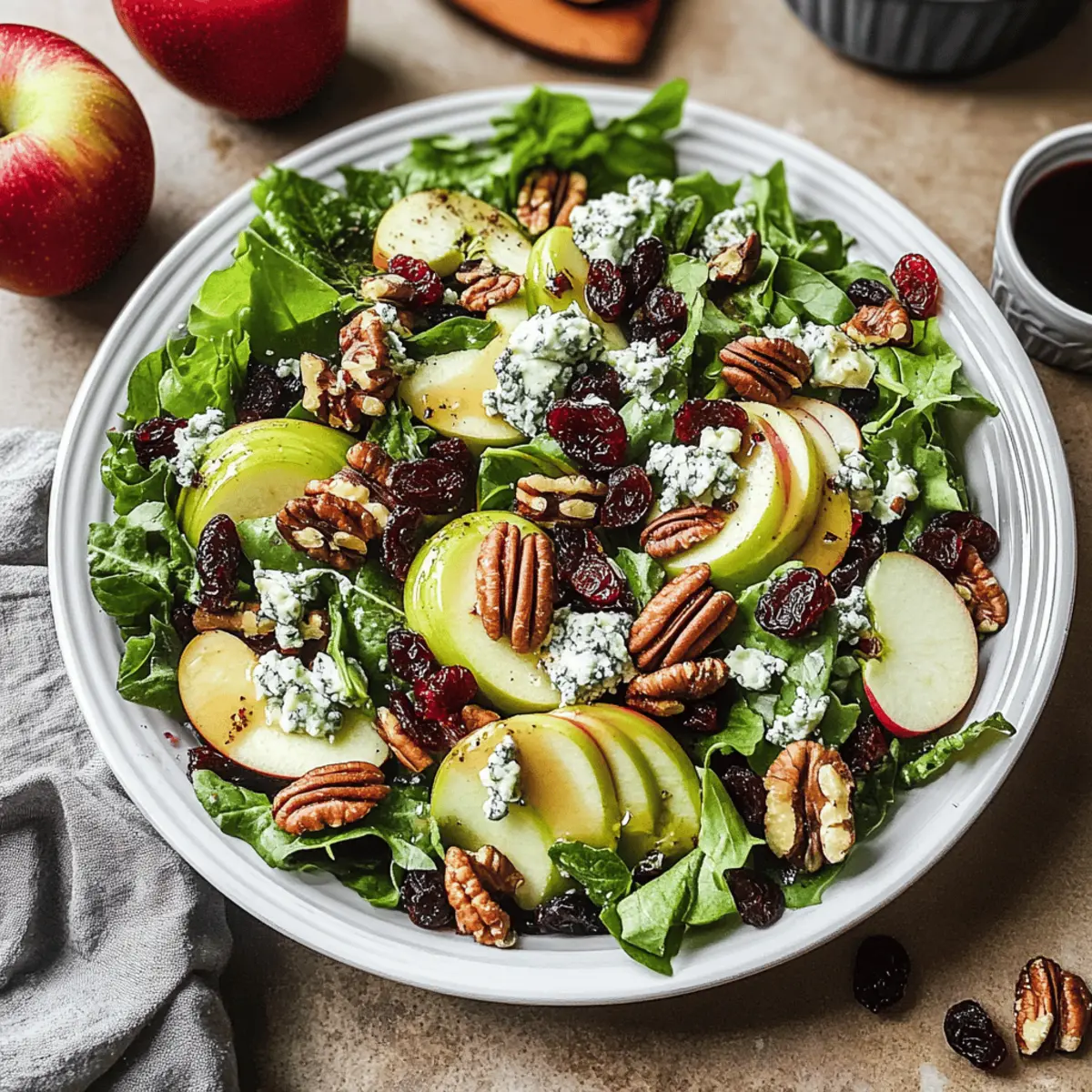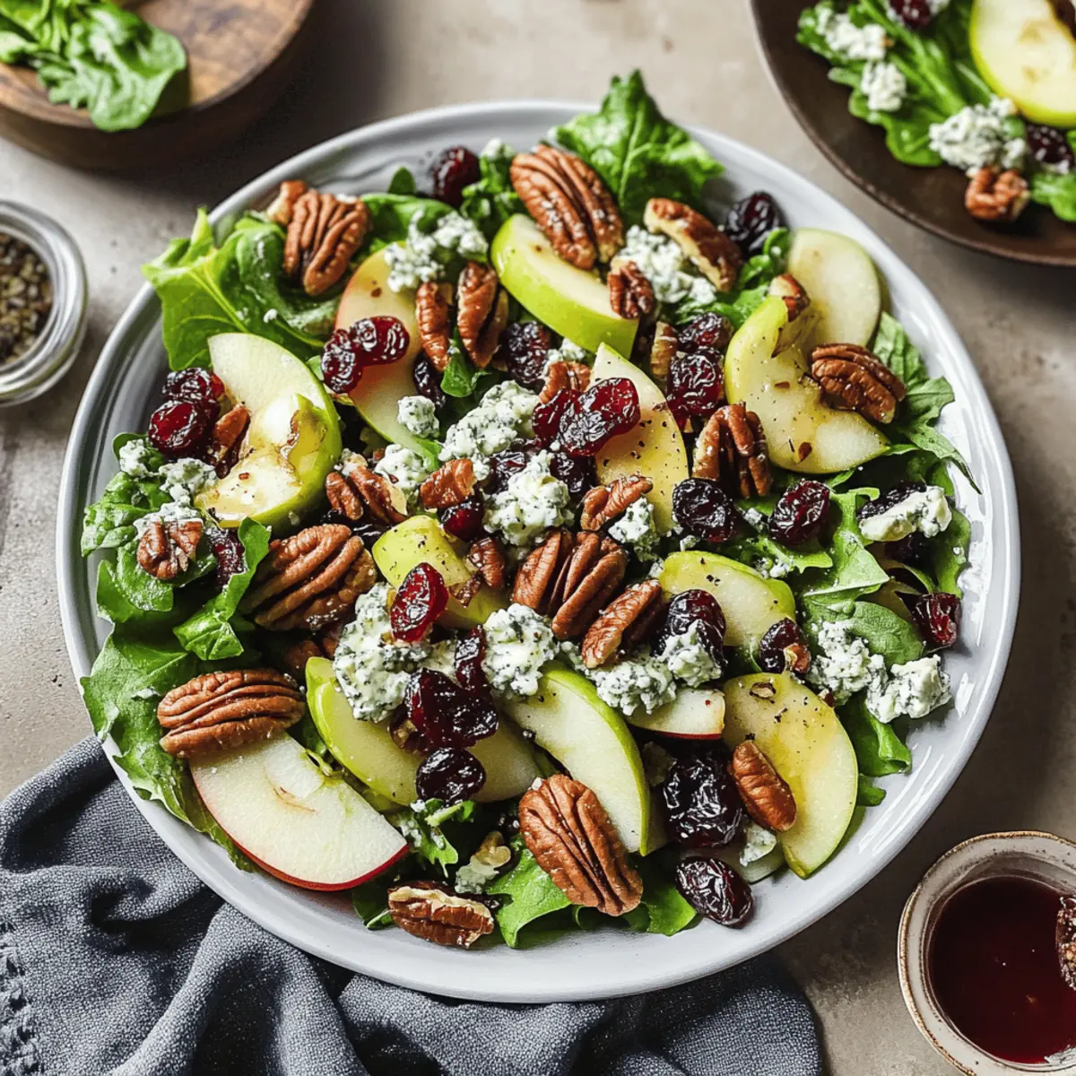 Jump to Recipe Print RecipeAs the crisp autumn air settles in, my kitchen transforms into a haven of earthy scents and vibrant colors. One of my favorite ways to celebrate the season is with this Easy Apple Cranberry Salad, bursting with the freshness of honeycrisp apples, mixed greens, and a scrumptious maple dijon dressing. Not only is it a quick prep that can be ready in just 20 minutes, but it’s also a healthy crowd-pleaser that brightens up any holiday gathering. Whether you’re serving it as a light lunch or a stunning side dish for roast meats, this salad offers a delightful crunch and a pop of sweetness that will have everyone reaching for more. Curious about how to mix it up? Let’s dive in! Why is this Apple-Cranberry Salad special? Vibrant, this salad delights with its colorful mix of fresh ingredients that tantalize your taste buds. Quick to prepare, you can whip it up in just 20 minutes, making it a perfect choice for busy weeknights. Healthy and satisfying, this Apple-Cranberry Salad is gluten-free and vegetarian, ensuring everyone can enjoy it. Versatile, feel free to customize it with grilled chicken or a sprinkle of pumpkin seeds. Plus, the homemade maple dijon dressing ties everything together, offering a sweet and tangy kick that impresses at holiday gatherings or as a light lunch. Apple-Cranberry Salad Ingredients For the Salad • Mixed Baby Greens – A fresh base for the salad; swap with arugula or spinach for variety. • Honeycrisp Apples – Adds sweetness and crunch; feel free to use any apple variety you love. • Dried Cranberries – Introduces a tart and chewy element; raisins work well as a substitute. • Raw Pecans (or Walnuts) – Provides a delightful crunch and healthy fats; use pumpkin seeds for a nut-free version. • Gorgonzola (or Feta/Goat Cheese) – Adds creaminess and tang; opt for dairy-free cheese for a lactose-free option. For the Maple Dijon Dressing • Olive Oil – The rich base of the dressing that brings everything together. • Maple Syrup – Offers natural sweetness that complements the salad beautifully. • White Wine Vinegar (or Apple Cider Vinegar) – Balances flavors with its acidity; each option has unique notes. • Dijon Mustard – Delivers depth and flavor; choose a mild one if preferred. • Garlic Powder – Enhances the overall flavor profile of the dressing. • Salt + Pepper – Essential for seasoning; adjust to taste for the perfect blend. Enjoy crafting this Apple-Cranberry Salad recipe that brings a taste of autumn right to your table! Step‑by‑Step Instructions for Apple-Cranberry Salad Step 1: Make the Dressing In a jar, combine 1/4 cup olive oil, 2 tablespoons maple syrup, 2 tablespoons white wine vinegar, 1 tablespoon Dijon mustard, 1/2 teaspoon garlic powder, and a pinch of salt and pepper. Seal the jar tightly and shake vigorously for about 30 seconds until the dressing is well-blended and emulsified. This Maple Dijon dressing will serve as a perfect complement to your vibrant Apple-Cranberry Salad. Step 2: Prepare the Salad Ingredients While the dressing is mingling, wash and dry 6 cups of mixed baby greens. Core and thinly slice 2 Honeycrisp apples, ensuring they maintain their crispness. Measure out 1/2 cup of dried cranberries, and chop 1/2 cup of raw pecans. Lastly, crumble 1/2 cup of gorgonzola cheese for that creamy tang. Arrange all these colorful ingredients on your countertop, ready to come together. Step 3: Assemble the Salad In a large salad bowl, first place the mixed greens as the foundation. Next, add the sliced apples, dried cranberries, chopped pecans, and crumbled gorgonzola. Gently toss the ingredients together with your hands or tongs until well-combined, ensuring the salad is both visually appealing and ready for dressing. Your Apple-Cranberry Salad is beginning to take shape! Step 4: Dress the Salad Give the jar of dressing one last vigorous shake to recombine any settled ingredients. Drizzle the Maple Dijon dressing over the assembled salad. Using tongs or a large spoon, carefully toss the salad again, ensuring every bite is coated in that sweet and tangy dressing. Aim for an even distribution, as this is what elevates your Apple-Cranberry Salad. Step 5: Serve and Adjust Seasoning Before serving, taste your beautiful Apple-Cranberry Salad and adjust the seasoning if necessary, adding a little more salt or pepper to your liking. Serve the salad immediately on chilled plates or in bowls to keep everything fresh and crisp. Remember, it’s best enjoyed right away, highlighting the delightful crunch and vibrant flavors of autumn. How to Store and Freeze Apple-Cranberry Salad Fridge: Store leftover Apple-Cranberry Salad in an airtight container in the refrigerator for up to 2 days. Keep the dressing separate to maintain crispness. Dressing Storage: The Maple Dijon dressing can be made ahead and stored in the fridge for up to 1 week in a sealed jar. Shake well before use. Prepping Ahead: For a make-ahead option, prepare all salad components but keep them separate until ready to serve. This prevents sogginess and ensures freshness. Freezer: We recommend against freezing the assembled salad, as the textures of the greens and apples may become mushy. Only freeze the dressing if necessary. Make Ahead Options These Easy Apple Cranberry Salad components are perfect for meal prep, saving you time during busy weekdays! You can make the Maple Dijon dressing up to a week in advance and store it in the refrigerator; just shake well before using. Additionally, wash and dry the mixed greens and store them in an airtight container for up to 3 days to maintain freshness. Slice the apples (remember, they can brown quickly, so do this just before serving) and store them in a little lemon water to keep them crisp. When you’re ready to enjoy your Apple Cranberry Salad, simply toss the prepped ingredients together, drizzle with the dressing, and enjoy a quick, delicious meal that’s just as delightf