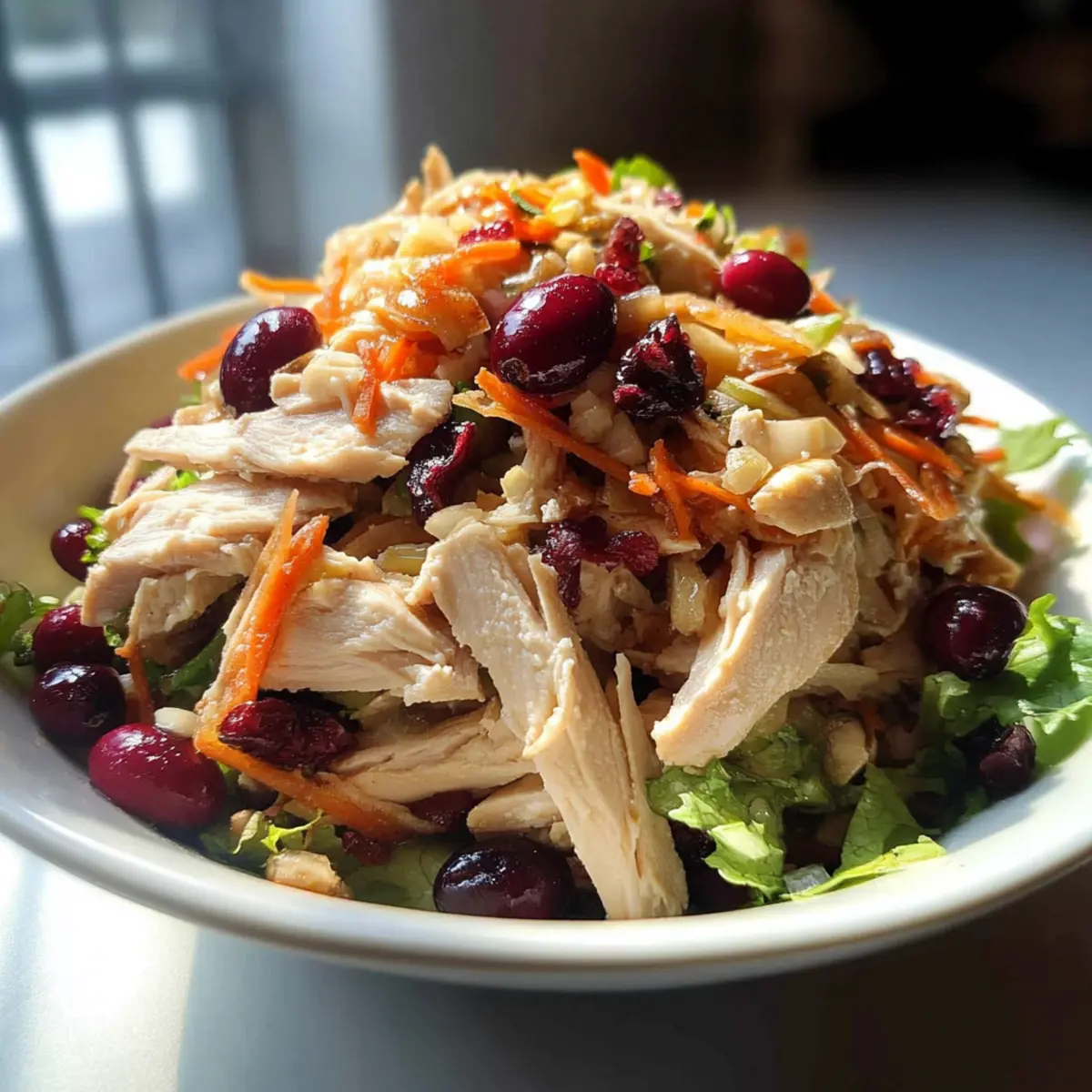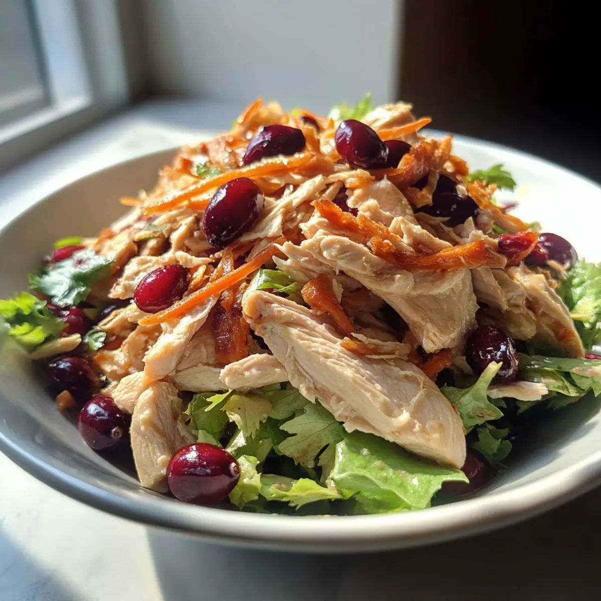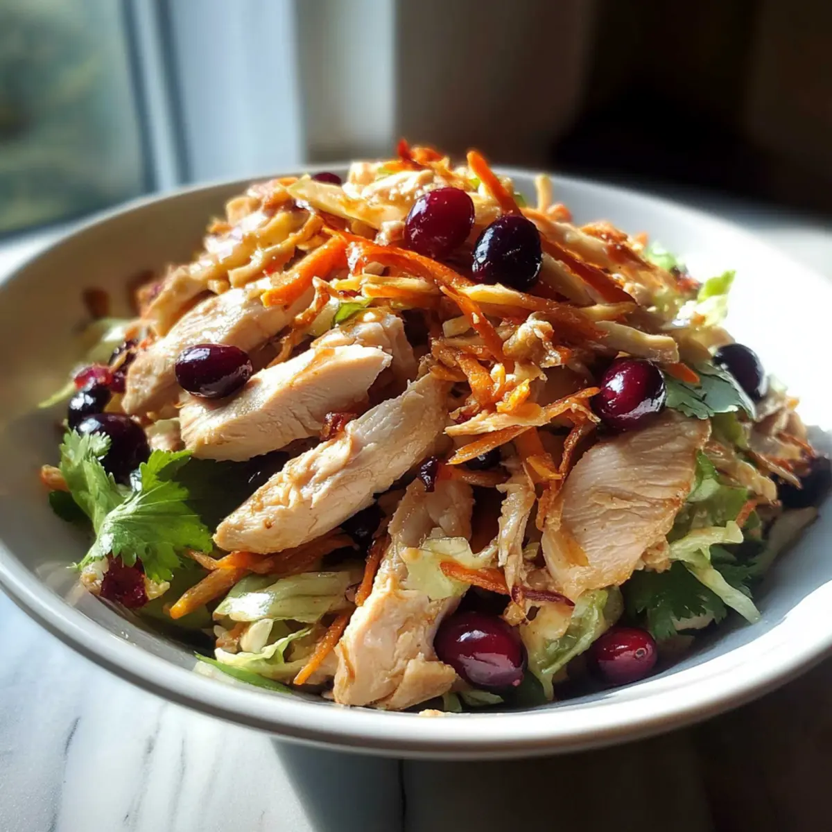 Jump to Recipe Print Recipe“Have you ever found yourself in a no-cook dilemma, staring blankly into your fridge? That’s when the idea for my Quick Asian Chicken Cranberry Salad struck me, and trust me, it’s a game changer! This vibrant, no-cook marvel brings together tender chicken and sweet cranberries, all enveloped in a zesty dressing that you can whip up in just 15 minutes. Not only is this salad a breeze to prepare, but it’s also meal prep friendly, making it ideal for those bustling weekdays. With simple substitutions available for gluten-free eaters, you can easily customize it to fit your needs. Are you ready to transform your lunch experience into something colorful and energizing?” Why is This Salad a Must-Try? Quick and Easy: This recipe comes together in just 15 minutes, making it perfect for those busy days when time is tight. Customizable Ingredients: Feel free to swap the chicken for grilled shrimp or tofu, and use any greens you love! You can even add in some crunchy apples for an extra twist. Meal Prep Friendly: Perfect for a quick lunch, this salad stays fresh when stored properly, allowing you to enjoy it over a couple of days. Nutrition Packed: With about 280 calories per serving, this salad combines protein and healthy fats, ensuring you stay satisfied and energized. Gluten-Free Options: Need a gluten-free dish? Simply substitute traditional soy sauce with tamari, and delight in a salad that caters to your dietary needs. Don’t miss out on the opportunity to elevate your weekday meals with this Asian Chicken Cranberry Salad. It’s not just a dish; it’s a delightful experience waiting for you! Asian Chicken Cranberry Salad Ingredients For the Salad • Cooked Chicken – Use rotisserie or leftover chicken for meal prep ease and added protein. • Cranberries – Dried cranberries are best for sweetness, but feel free to use fresh for a tart kick. • Mixed Greens – Choose your favorite leafy greens for a crunchy, vitamin-packed base. For the Dressing • Soy Sauce – This creates a savory depth; for gluten-free, opt for tamari instead. • Olive Oil – Adds richness and balances the flavors in the dressing. • Vinegar – A splash of rice vinegar or apple cider adds a delightful tang. For the Crunch • Nuts (Pecans or Cashews) – Toasted nuts offer a satisfying crunch and healthy fats; sunflower seeds are a great nut-free alternative. Step‑by‑Step Instructions for Asian Chicken Cranberry Salad Step 1: Prepare the Salad Base In a large mixing bowl, add approximately 4 cups of mixed greens, ensuring they are clean and dry. Next, shred about 2 cups of cooked chicken, whether from a rotisserie or leftover from a previous meal, and combine it with the greens. Toss this mixture gently, letting the vibrant colors come together, setting a delightful base for your Asian Chicken Cranberry Salad. Step 2: Incorporate Sweetness Add about ½ cup of dried cranberries to the salad base, sprinkling them evenly across the greens and chicken. The cranberries will not only add a burst of sweetness but also a lovely pop of color that brightens your dish. Gently fold the mixture to ensure the cranberries are well-distributed without crushing them, maintaining their chewy texture. Step 3: Whisk the Dressing In a small bowl, whisk together 3 tablespoons of soy sauce (or tamari for a gluten-free option), 2 tablespoons of olive oil, and 1 tablespoon of rice vinegar until well combined. Look for a smooth, slightly thick consistency that showcases a balanced syrupy texture. This dressing will enhance the flavors of your Asian Chicken Cranberry Salad, so make sure everything is well mixed. Step 4: Dress the Salad Once the dressing is ready, drizzle it over the chicken, greens, and cranberries in the large bowl. Use a large spoon to gently toss the salad, ensuring every ingredient is coated evenly in the zesty dressing. This step is crucial to allow the flavors to meld beautifully and gives the salad a tantalizing aroma. Step 5: Add the Crunch Finally, top your salad with about ½ cup of toasted nuts, such as pecans or cashews, for a satisfying crunch. If you prefer a nut-free option, sunflower seeds work wonderfully. Gently fold in the nuts, making sure they are evenly distributed throughout the salad, as this adds texture and enhances the overall experience of the Asian Chicken Cranberry Salad. Step 6: Serve and Store Serve your freshly made Asian Chicken Cranberry Salad immediately for the best flavor and texture. If you are meal prepping, store the dressing separately in an airtight container to keep the greens crisp until you’re ready to enjoy. This salad can be refrigerated for up to 2 days, ensuring that you have a delightful, healthy meal ready to go during your busy week. What to Serve with Asian Chicken Cranberry Salad This vibrant salad is the perfect base for creating a delightful, well-rounded meal that tantalizes the taste buds. Creamy Avocado Toast: The rich, creamy texture of avocado pairs wonderfully with the salad’s crisp greens, adding healthy fats and extra flavor. Coconut Rice: This subtly sweet and fragrant side dish complements the salad’s zesty dressing, making each bite a tropical delight. Grilled Vegetable Skewers: Charred veggies bring a smoky, savory element that balances the sweetness of the cranberries perfectly, elevating your meal experience. Crispy Spring Rolls: These light, fresh rolls add a delightful crunch and refreshing bite, enhancing the Asian flavors of the salad. Fruit Salad: A medley of fresh fruits adds a refreshing, juicy contrast that complements the savory and sweet elements in the salad. Iced Green Tea: This refreshing drink offers a light, herbal note that perfectly balances the flavors of the salad, making it an ideal complement. Dive into a full meal experience, where flavors and textures intertwine, promising satisfaction and joy with each bite! Make Ahead Options These Asian Chicken Cranberry Salads are a wonderful