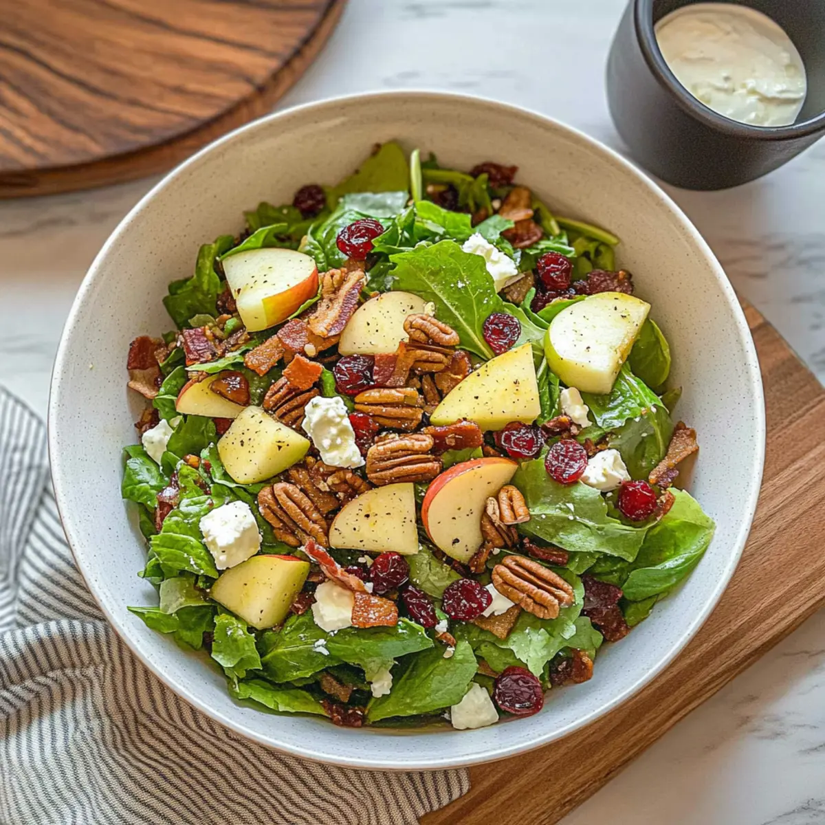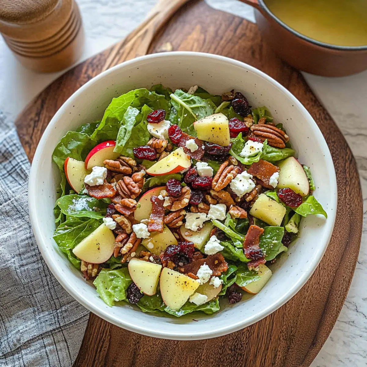 Jump to Recipe Print RecipeAs the leaves turn brilliant shades and the air develops a crispness that signals fall, my kitchen transforms into a haven filled with the aromas of the season. That’s when I whip up this Autumn Chopped Salad with Apple Cider Vinaigrette, a delightful mix of sweet apples, tangy cranberries, and savory bacon that exemplifies cozy comfort with every bite. The best part? It comes together in just 15 minutes, making it a quick prep option for those busy weeknights and an effortlessly crowd-pleasing choice for potlucks. With its vibrant colors and textures, this salad is just waiting to brighten your table and warm your heart. Curious about how to elevate your fall meals? Let’s dive into the simple steps for this nourishing salad! Why is this salad a must-try? Quick Preparation: You’ll love how this Autumn Chopped Salad comes together in just 15 minutes—perfect for those busy nights! Fresh Fall Flavors: The sweet and tart apples meld beautifully with the tangy vinaigrette, creating a delightful burst of seasonal taste in every bite. Effortless Crowd-Pleaser: Ideal for potlucks or family gatherings, this colorful salad is sure to impress your guests and keep everyone coming back for more. Nutrient-Rich Ingredients: Packed with fiber, healthy fats, and proteins, this salad isn’t just delicious; it’s a wholesome choice, too! Versatile & Customizable: Want to mix things up? Try swapping pecans for walnuts or pears for a unique twist. If fresh herbs entice you, consider adding some chopped parsley or thyme for an extra layer of flavor! This salad looks stunning on any table, especially alongside dishes like Chickpea Salad Grilled or Roasted Turkey Breast, making it a perfect seasonal star! Autumn Chopped Salad Ingredients • You’ll need these to create your Autumn Chopped Salad with Apple Cider Vinaigrette! For the Dressing Extra Virgin Olive Oil – Provides richness and serves as the base for the vinaigrette. Apple Cider Vinegar – Introduces acidity and brightness, enhancing the overall flavor. Maple Syrup – Adds natural sweetness; honey can be used as a great alternative. Dijon Mustard – Offers a tangy depth to your dressing for a delightful kick. Kosher Salt – Enhances all the flavors and balances the sweetness. Ground Black Pepper – Adds a hint of spice for flavor balance. For the Salad Romaine or Green Leaf Lettuce – The crunchy foundation of the salad for texture. Tart Red Apples (e.g., Fuji or Honeycrisp) – Adds sweetness and texture; be sure to core and dice them. Dried Cranberries – Introduces a chewy, sweet-tart element; can substitute with fresh pomegranate seeds for variety. Chopped Pecans – Provides crunch; roasting them enhances their flavor even further. Bacon – Adds a savory, crunchy element; consider baking ahead for convenience. Crumbled Feta Cheese – Infuses creaminess with a tangy bite; Gorgonzola is a delicious swap if you prefer. Step‑by‑Step Instructions for Autumn Chopped Salad with Apple Cider Vinaigrette Step 1: Prepare the Dressing In a jar, combine 1/4 cup of extra virgin olive oil, 2 tablespoons of apple cider vinegar, 1 tablespoon of maple syrup, 1 teaspoon of Dijon mustard, and a pinch of kosher salt with ground black pepper to taste. Seal the jar tightly and shake vigorously for about 30 seconds until all ingredients are well blended and emulsified. This dressing will elevate your Autumn Chopped Salad with Apple Cider Vinaigrette with its rich and tangy flavor profile. Step 2: Chop the Salad Ingredients While the dressing is resting, prepare your salad ingredients. In a large bowl, chop about 4 cups of romaine or green leaf lettuce into bite-sized pieces. Core and dice 1-2 tart red apples, such as Fuji or Honeycrisp, and add them to the bowl along with 1/2 cup of dried cranberries. Make sure all the salad ingredients are vibrant and fresh, adding a colorful touch to your salad. Step 3: Add Crunchy Elements Next, to enhance the texture of your Autumn Chopped Salad, add 1/2 cup of chopped pecans and 4-6 slices of crispy bacon, crumbled or chopped into bite-sized pieces. If desired, toast the pecans in a 350°F oven for 5-10 minutes until fragrant for an extra layer of flavor. Finally, fold in 1/2 cup of crumbled feta cheese to introduce a creamy, tangy element that complements the other ingredients beautifully. Step 4: Dress the Salad Drizzle about 2/3rds of the prepared dressing over the salad mixture. Gently toss all the ingredients together until the lettuce, apples, and other components are evenly coated with the dressing. This step brings all the flavors together and creates that delightful taste experience synonymous with the Autumn Chopped Salad with Apple Cider Vinaigrette. Serve the remaining dressing on the side for those who desire a bit more. Step 5: Serve and Enjoy Finally, transfer your beautifully mixed salad into a serving bowl and garnish it with some extra diced apples or a sprinkle of toasted pecans for presentation. The salad can be served immediately, allowing everyone to enjoy the fresh crunch and vibrant flavors of the season. This Autumn Chopped Salad is perfect for potlucks or family gatherings, bringing a taste of fall to your table! Make Ahead Options These Autumn Chopped Salad with Apple Cider Vinaigrette components are perfect for meal prep, helping you save precious time during busy weeknights! You can wash and chop the lettuce, prepare the dressing, and bake the bacon up to 24 hours in advance, keeping them separately stored in the refrigerator. To maintain freshness, only add the diced apples and cranberries right before serving to prevent browning. When you’re ready to enjoy your salad, simply toss all the ingredients together with the saved dressing, ensuring every bite is just as delicious as when first made. This means you can have a vibrant, wholesome meal with minimal effort! Expert Tips for Autumn Chopped Salad Bacon Perfection: Bake bacon at 400°F for 15-20 