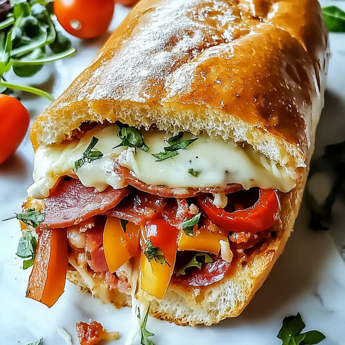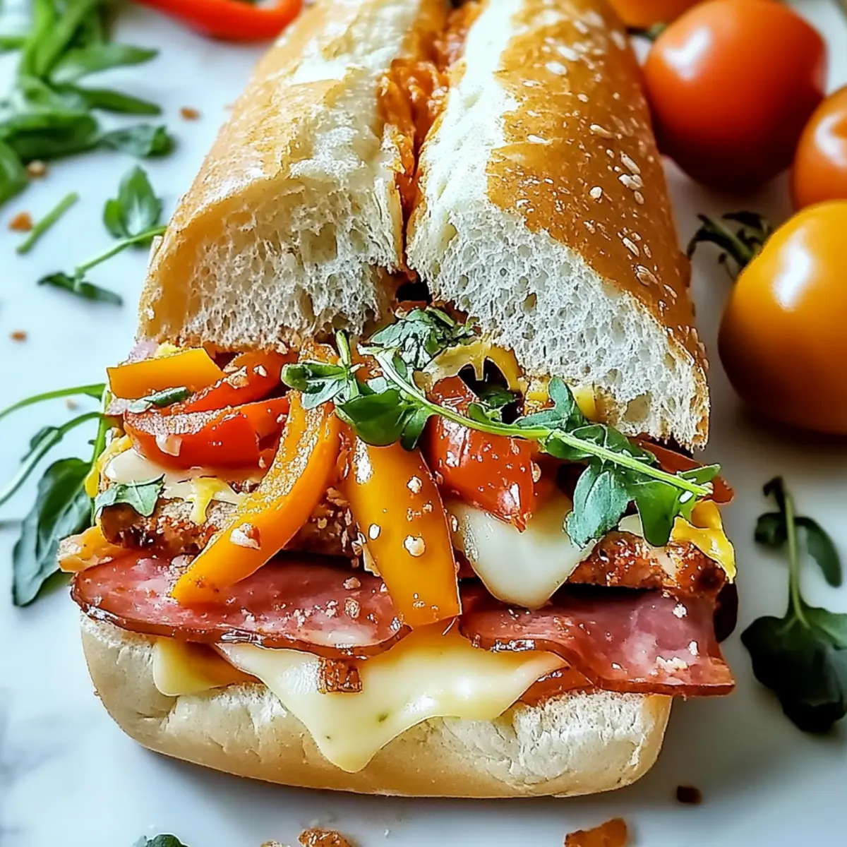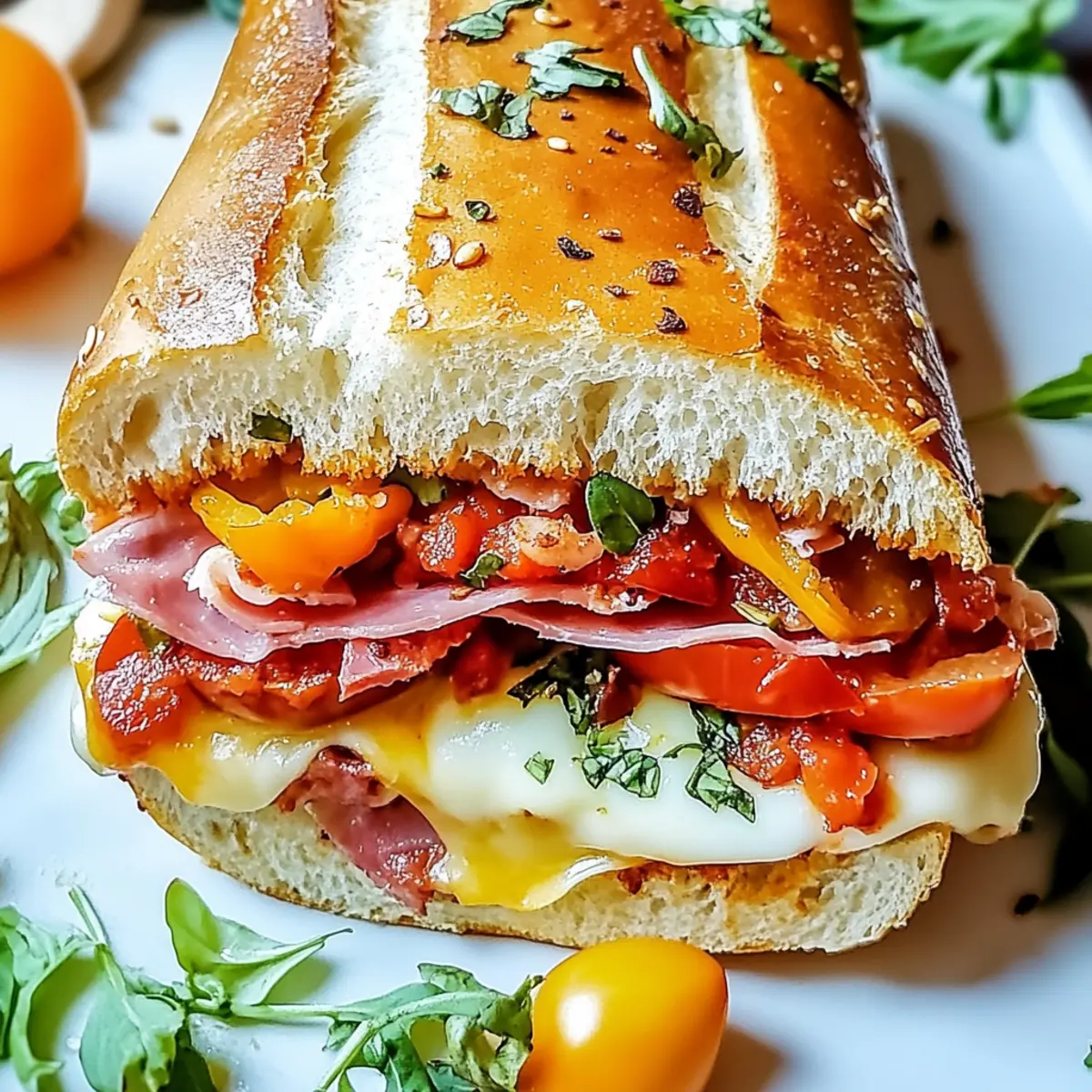 Jump to Recipe Print Recipe“Can you believe dinner is ready already?” my friend exclaimed, staring wide-eyed at the steaming tray of Baked Italian Grinder Sandwiches emerging from the oven. There’s something undeniably magical about the aroma of toasty bread mingling with garlic and herbs; it wraps you in a warm embrace that feels like home. These sandwiches are my go-to comfort food, perfect for hectic weeknights or those irresistible game-day gatherings. With layers of savory Italian meats and melty cheeses, each bite is a cozy celebration that will have your loved ones asking for seconds. Plus, you can customize the ingredients to fit everyone’s taste—whether you prefer turkey, veggies, or a little extra spice. Ready to dive into this tasty world of home-cooked bliss? Let’s get started! Why are Baked Italian Grinder Sandwiches a must-try? Irresistible Comfort: These sandwiches deliver the ultimate comfort food experience, combining rich, savory flavors that will warm your heart. Melt-in-Your-Mouth Texture: With gooey melted cheeses and crispy bread, every bite offers an exciting contrast that satisfies cravings. Customizable Ingredients: Flexibility is key! Swap in your favorite deli meats or even choose a vegetarian twist with grilled veggies, making it perfect for everyone. Quick and Simple: With just a few steps, you can have a delicious dinner on the table in no time, letting you spend more moments with loved ones. Crowd Pleaser: Perfect for game days or family gatherings, these Baked Italian Grinder Sandwiches are sure to impress and keep everyone coming back for more! Pair them with a fresh garden salad or some crispy fries for that extra crunch, and you’ve got a balanced meal for any occasion! Baked Italian Grinder Sandwiches Ingredients For the Bread • Italian Sub Rolls – These rolls provide a perfect soft interior and crisp crust once baked. Substitution: Hoagie rolls or ciabatta rolls work well too. • Unsalted Butter, melted – Melting this butter enhances flavors and helps achieve that golden brown crust. Substitution: Use olive oil for a lighter option. For the Flavor • Garlic Powder – A staple for adding depth; its savory aroma fills your kitchen! Note: Fresh minced garlic can be used for a more intense flavor. • Onion Powder – This mild sweetness complements meats beautifully, enhancing the overall taste. • Dried Oregano – A classic Italian herb that balances the richness of the ingredients. • Dried Basil – This herb brings a sweet, peppery note, essential for that Italian flavor. • Red Pepper Flakes – They introduce a subtle spicy kick; adjust to your liking! Substitution: Fresh jalapeños for an extra heat boost. • Salt – Enhances all the flavors in this mouthwatering sandwich. • Black Pepper – Adds a hint of heat, completing the savory profile. For the Meats and Cheese • Deli-sliced Salami – Offers a rich, slightly spicy foundation for your sandwich. • Deli-sliced Ham – Sweet and smoky, creating balance with robust flavors. • Deli-sliced Pepperoni – Brings bold tanginess and chewy texture. • Deli-sliced Mozzarella Cheese – Melts beautifully, infusing the sandwich with creaminess. • Deli-sliced Provolone Cheese – This cheese adds a touch of sharpness and depth to the flavor. • Grated Parmesan Cheese – Creates a crispy topping and nutty flavor when baked. For the Toppings • Roasted Red Peppers, sliced – Adds a sweet and smoky taste along with vibrant color. • Sliced Black Olives – Provides a briny contrast that complements the rich flavors. • Banana Peppers, sliced – These tangy and crunchy slices add a zesty flair. • Fresh Basil Leaves – Brightens the dish and adds a hint of freshness. Ready to create these Baked Italian Grinder Sandwiches? Gather your ingredients and let’s whip up this comforting dish together! Step‑by‑Step Instructions for Baked Italian Grinder Sandwiches Step 1: Preheat the Oven Begin by preheating your oven to 375°F (190°C). This temperature will create the perfect environment for your Baked Italian Grinder Sandwiches, allowing the cheeses to melt beautifully while the bread crisps to a golden perfection. Ensure your oven rack is in the middle position to encourage even cooking. Step 2: Prepare the Rolls Carefully slice the Italian sub rolls in half lengthwise, keeping them hinged to hold the filling. Arrange the rolls cut side up on a baking sheet, ready to absorb all the delicious flavors about to come their way. This setup will provide a sturdy base for layers of savory goodness! Step 3: Create the Flavor Mixture In a medium bowl, melt unsalted butter in the microwave or on the stovetop. Once melted, mix in garlic powder, onion powder, dried oregano, dried basil, red pepper flakes, salt, and black pepper. Combining these spices with the melted butter enhances the sandwich’s flavor, adding that wonderful Italian essence. Step 4: Brush the Rolls Generously brush the herb-infused melted butter mixture over the cut sides of the Italian rolls. Make sure to cover each roll evenly, allowing the buttery goodness to soak in for extra flavor. The garlic and herbs will permeate the bread as it bakes, ensuring every bite bursts with taste. Step 5: Layer the Meats and Cheeses Now it’s time to create your delicious layers! Start with the deli-sliced salami on the bottom half of the rolls, followed by the sweetness of ham and then the boldness of pepperoni. Next, pile on the slices of mozzarella and provolone cheese, ensuring an irresistible melty center that makes these Baked Italian Grinder Sandwiches to die for. Step 6: Add Topping Goodness Sprinkle grated Parmesan cheese generously over the provolone, creating a delightful topping that will crisp up in the oven. Then, evenly distribute roasted red peppers, sliced black olives, and banana peppers atop the cheese layer. Finish with fresh basil leaves for a vibrant touch, adding a lovely aroma to the dish. Ste