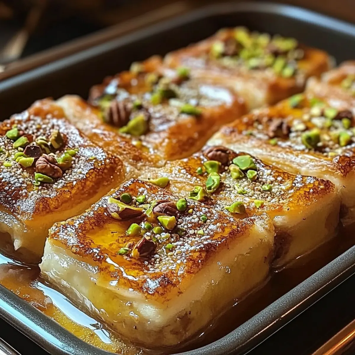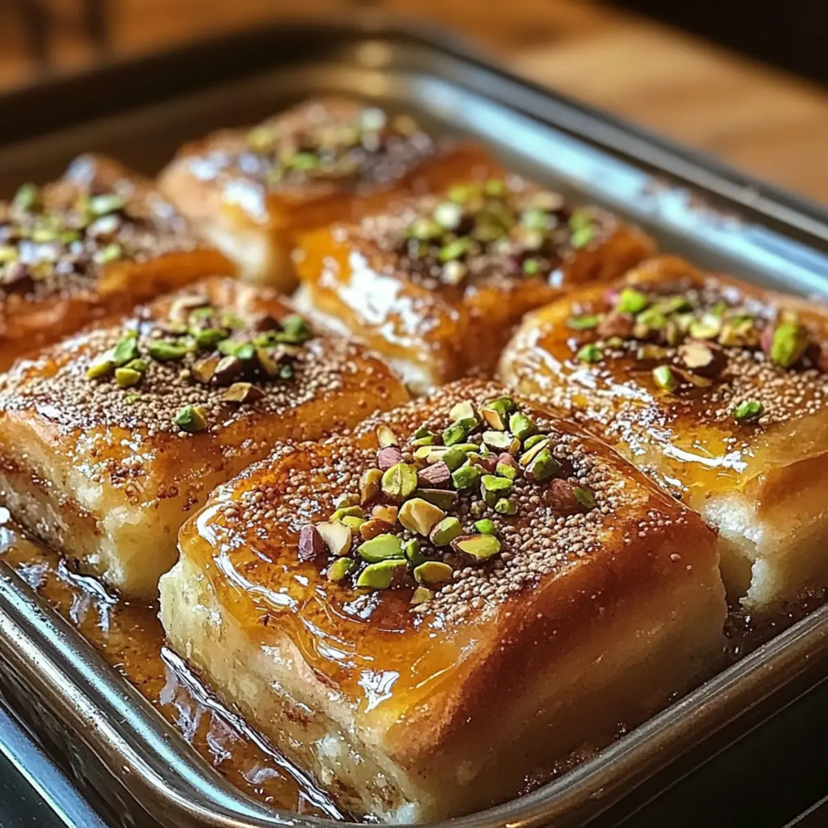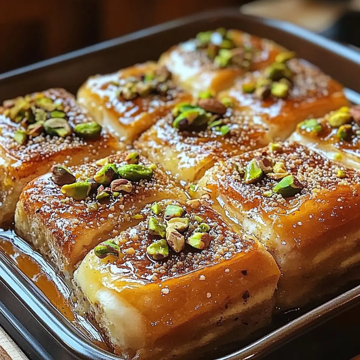 Jump to Recipe Print RecipeAs the sun rises on a lazy Sunday morning, I find myself yearning for something beyond the usual breakfast fare. Enter the Baklava French Toast Bake—a delightful twist on brunch that combines the flaky indulgence of baklava with the comforting warmth of custardy French toast. This easy brunch recipe is designed for those cozy gatherings, bringing together friends and family around the table with minimal effort on your part. Its crunchy phyllo layers and aromatic honey-orange glaze create an exquisite brunch experience that feels both familiar and utterly luxurious. Why settle for ordinary? Dive in and let the enchanting aroma transport you to a café in the heart of Istanbul. Are you ready to give your mornings a delicious upgrade? Why is Baklava French Toast Bake special? Uniquely Flavorful: This recipe perfectly marries the sweetness of baklava with traditional French toast, resulting in a breakfast dish that’s both familiar and exotic. Easy Preparation: With minimal effort required, you can whip up this indulgent dish, making it a go-to for brunch or special occasions. Crowd-Pleasing Delight: Whether you’re hosting a gathering or just treating your family, the delightful flavors are sure to impress everyone around the table. Make-Ahead Convenience: Prepare it the night before and simply pop it in the oven the next morning—ideal for busy mornings! Rich, Aromatic Experience: The honey-orange glaze adds a vibrant touch, elevating your brunch spread and transporting you to a café atmosphere. Why not explore other easy brunch recipes to complement this dish? Baklava French Toast Bake Ingredients For the Base • Brioche or Challah (8 thick slices) – Base structure; use slightly stale bread for better custard absorption. For the Custard • Whole Milk (2 cups) – Moisture; substitute with almond or oat milk for a dairy-free version. • Eggs (4 large) – Binder for custard; can use flax-egg mixture for a vegan option. • Granulated Sugar (1/4 cup) – Sweetness; adjust to taste or substitute with a sugar alternative. • Vanilla Extract (1 teaspoon) – Flavor enhancer; use pure extract for best results. For the Toppings • Walnuts (1 cup, coarsely chopped) – Crunch and richness; substitute with almonds or pecans. • Pistachios (1/2 cup, shelled and chopped) – Added texture and flavor; omit or replace if allergies are present. • Phyllo Pastry (6 sheets, torn into pieces) – Crisp texture; can replace with similar dough, though phyllo provides a unique flakiness. • Unsalted Butter (3 tablespoons, melted) – Fats for flavor; use plant-based butter for a dairy-free option. For the Glaze • Honey (1/2 cup) – Sweet glaze; use maple syrup as a substitute for a different flavor profile. • Freshly Squeezed Orange Juice (1/4 cup) – Bright acidity; fresh juice enhances the dish; bottled can be substituted. • Orange Zest (1 tablespoon) – Aromatic element; use zest from an organic orange for better flavor. • Ground Cinnamon (1/2 teaspoon) – Warm spice note; adjust for personal taste. • Ground Cardamom (1/2 teaspoon) – Unique spice depth; can be substituted with nutmeg or omitted. • Ground Cloves (1/4 teaspoon) – Warmth and earthiness; omit if not available or desired. • Sea Salt (pinch) – Balances sweetness. Now you have everything you need for this delicious Baklava French Toast Bake, ensuring a delightful brunch experience that will impress your friends and family. Enjoy your cooking adventure! Step‑by‑Step Instructions for Baklava French Toast Bake Step 1: Preheat Your Oven Begin by preheating your oven to 350°F (175°C). While it heats, grease a 9×13-inch baking dish with cooking spray or butter to ensure your Baklava French Toast Bake doesn’t stick. The warm air will create the perfect environment for a deliciously golden top as it bakes. Step 2: Prepare the Bread and Phyllo Layer the thick slices of brioche or challah evenly across the bottom of the greased baking dish. Tear the phyllo pastry sheets into pieces and scatter them generously over the brioche, drizzling melted butter on top to provide a lovely crispy texture that mimics the indulgence of baklava. Step 3: Make the Custard Mixture In a large mixing bowl, whisk together the whole milk, eggs, granulated sugar, vanilla extract, cinnamon, cardamom, cloves, and a pinch of sea salt. Vigorously mix until the ingredients are well combined and frothy, creating a smooth custard that will soak into the bread for rich flavor. Step 4: Combine Nuts and Pour Custard Sprinkle the chopped walnuts and pistachios evenly over the phyllo and brioche layer. Next, pour the custard mixture over the assembled ingredients, ensuring an even distribution while allowing the brioche to soak up all the flavorful liquid. Let it absorb for about 5 minutes. Step 5: Prepare the Honey-Orange Glaze Combine honey, freshly squeezed orange juice, orange zest, and ground cinnamon in a small saucepan over medium heat. Allow the mixture to simmer gently for about 5-7 minutes, or until it thickens slightly and becomes syrupy, adding a luscious glaze to complement your Baklava French Toast Bake. Step 6: Bake the Dish Carefully transfer the baking dish to the preheated oven and bake for 30-35 minutes or until the top is golden brown and crispy. Halfway through baking, drizzle half of the honey-orange glaze over the top to infuse even more flavor and achieve that delightful, glazed finish. Step 7: Cool and Serve Once baked to perfection, remove the dish from the oven and allow it to cool for about 10 minutes. This resting time helps the custard set for cleaner slices. Cut the Baklava French Toast Bake into squares and serve warm, drizzling with the remaining glaze and topping as desired. Make Ahead Options These Baklava French Toast Bake preparations are perfect for busy home cooks looking to save time! You can assemble the entire dish and refrigerate it for up to 24 hours before baking. Simply 