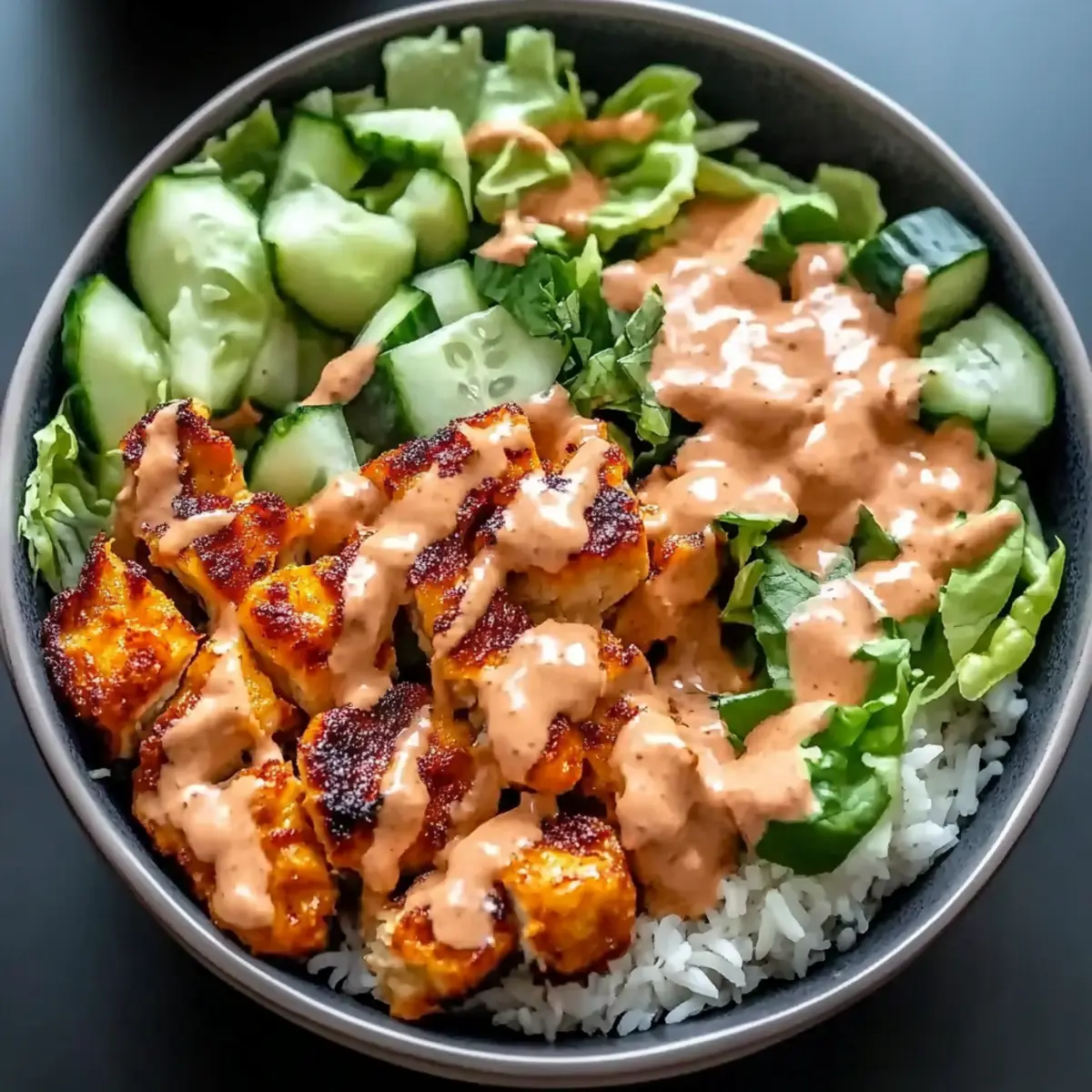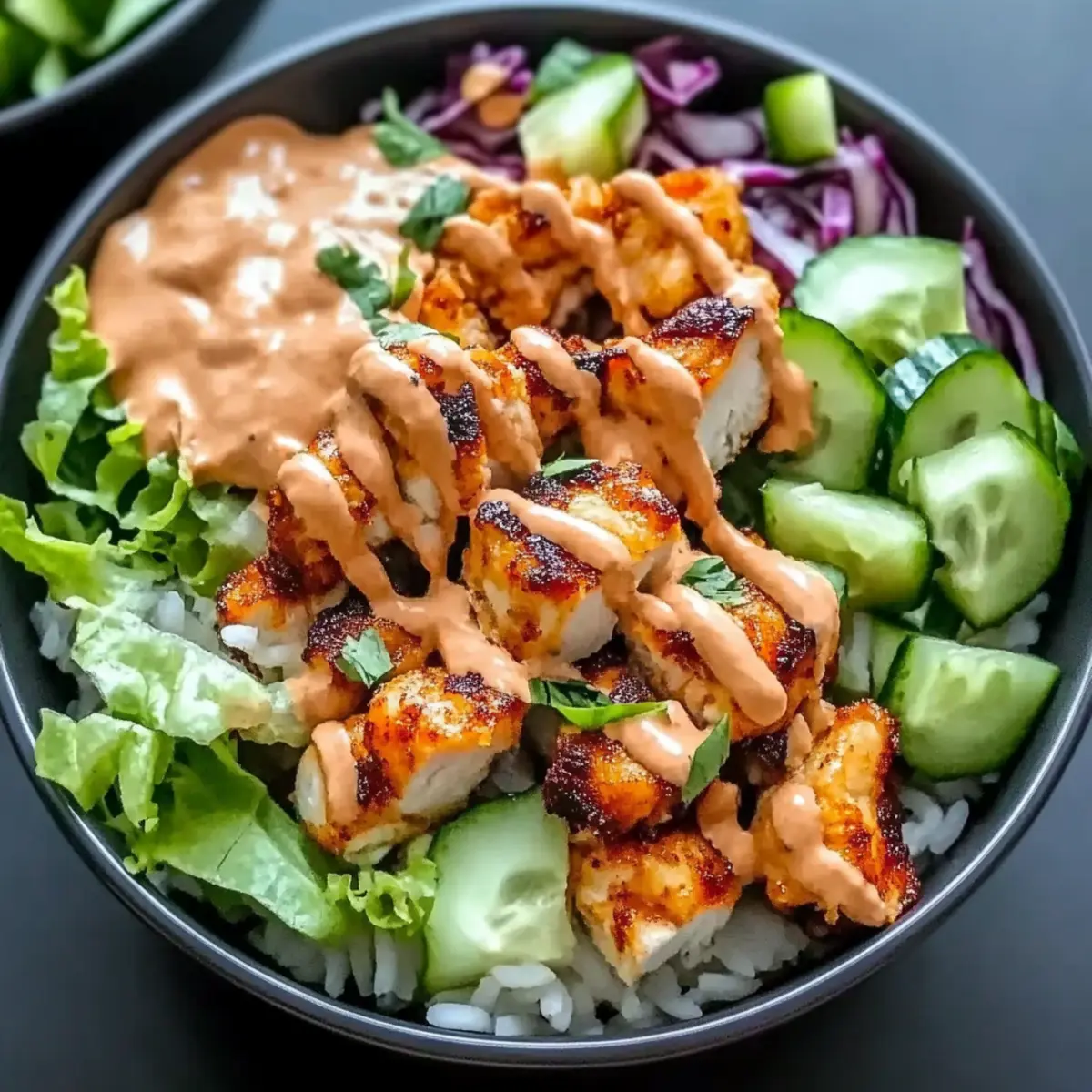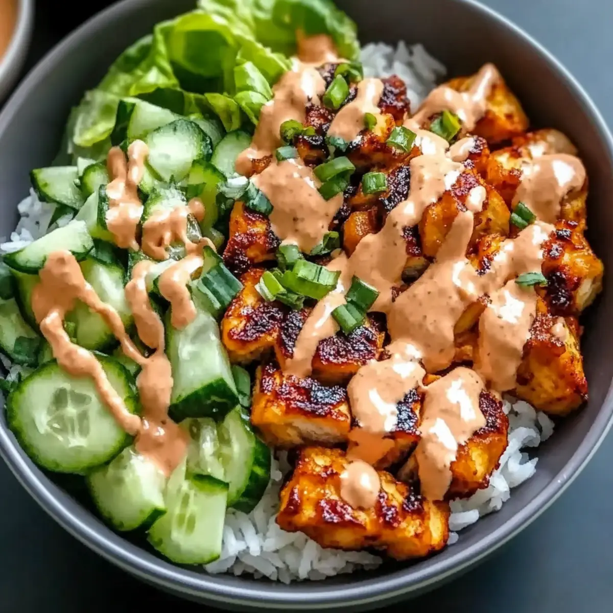 Jump to Recipe Print RecipeAs the sun dips below the horizon and hurried weeknight dinners loom, I often find myself craving something satisfying yet simple. Enter the Bang Bang Chicken Bowl—a delightful fusion of crunchy chicken, fresh veggies, and a creamy, spicy sauce resting atop fluffy jasmine rice. This recipe shines, taking less than 30 minutes to whip up, making it a true lifesaver on those busy nights. Plus, its customizable nature lets you adjust the protein, spice levels, and veggies to match your tastes and dietary preferences. Whether you’re in the mood for crispy chicken, tofu, or even chickpeas, this bowl has got your back—delivering a nutritious and delicious meal that feels both indulgent and wholesome. Ready to create a comforting yet lively dish that will transform your dinner routine? Let’s dive in! Why is Bang Bang Chicken Bowl a Must-Try? Simplicity: This dish comes together in under 30 minutes, perfect for busy evenings. Customizable: Tailor your meal with options like chicken, tofu, or chickpeas to fit everyone’s preferences. Flavor Explosion: Enjoy a delightful combination of crispy textures and a creamy, spicy sauce that tantalizes your taste buds. Nutritious and Balanced: Each serving provides a wholesome mix of protein, veggies, and carbs without sacrificing flavor. Meal Prep Hero: Make-ahead friendly, these bowls are ideal for quick lunches or dinners. Check out more meal prep ideas to enhance your cooking routine! Bang Bang Chicken Bowl Ingredients For the Rice • Cooked Jasmine Rice – Perfectly fluffy base for the bowl; substitute with brown rice for added fiber. For the Protein • Boneless Skinless Chicken Breasts – Ideal choice for a juicy protein boost; replace with crispy tofu or chickpeas for a vegetarian option. For the Crispy Coating • Cornstarch – Gives chicken an irresistible crunch; can be omitted for a healthier version. For Seasoning • Salt – Elevates flavors beautifully; feel free to use sea salt or kosher salt for a nice touch. • Black Pepper – Adds a mild kick; omit if you prefer a milder dish. • Garlic Powder – Provides savory depth; fresh minced garlic is a great substitute if available. • Paprika – Offers subtle smokiness and color; optional for personal customization. For Frying • Vegetable Oil – Essential for that crispy texture when frying; you can use avocado oil as a lighter alternative. For the Sauce • Mayonnaise – Binds the sauce, creating creaminess; swap with Greek yogurt for a lighter option. • Sweet Chili Sauce – Adds the perfect balance of sweetness and tang; consider honey or agave syrup as a substitute if needed. • Sriracha – Introduces heat; adjust to your taste or omit for a milder sauce. For the Toppings • Shredded Lettuce – Adds refreshing crunch to the bowl; feel free to use your favorite greens! • Diced Cucumber – Offers a cool contrast in texture; replace with other crisp veggies if desired. • Shredded Carrots – Brings both sweetness and color; customize with bell peppers or avocado for additional nutrients. • Chopped Green Onions – Gives a nice burst of flavor; optional, but recommended for freshness. • Sesame Seeds – Perfect for garnish, adding a delightful crunch and visual appeal; entirely optional but greatly enhances the dish. This Bang Bang Chicken Bowl is as flexible as it is delicious, allowing you to mix and match ingredients to create a meal that caters to your taste buds! Step‑by‑Step Instructions for Bang Bang Chicken Bowl Step 1: Prepare the Seasoning Mixture In a large mixing bowl, combine cornstarch, salt, black pepper, garlic powder, and paprika. Whisk these dry ingredients together until well blended, ensuring an even distribution of flavors. This seasoning mix will create a flavorful crispy coating for the chicken, enhancing your Bang Bang Chicken Bowl with delicious depth. Step 2: Coat the Chicken Take the bite-sized pieces of boneless skinless chicken breasts and toss them in the seasoning mixture until fully coated. Make sure every piece gets an even layer for ultimate crispiness. This step is crucial for achieving that golden-brown, satisfying texture that makes your Bang Bang Chicken Bowl irresistible. Step 3: Heat the Oil In a large skillet, heat vegetable oil over medium-high heat until it shimmers, indicating it’s hot enough for frying. This should take about 2–3 minutes. A properly heated oil ensures that the chicken sizzles upon contact and helps create that perfect crispy texture for your dish. Step 4: Fry the Chicken Carefully add the coated chicken pieces to the hot oil in a single layer. Fry them for 5–7 minutes, turning occasionally, until they are golden brown and reach an internal temperature of 165°F (74°C). Keep an eye on the pieces to prevent burning and ensure even cooking, which is key for elevating your Bang Bang Chicken Bowl. Step 5: Make the Spicy Mayo Sauce While the chicken fries, take a small bowl and mix together mayonnaise, sweet chili sauce, and sriracha until smooth. Use a whisk or fork to combine thoroughly. Taste the sauce and adjust the sriracha to match your preferred spice level, ensuring your Bang Bang Chicken Bowl has just the right kick. Step 6: Assemble the Bowl Begin assembling your Bang Bang Chicken Bowl by placing a generous scoop of cooked jasmine rice at the bottom. Layer the crispy chicken pieces on top, followed by an array of fresh veggies like shredded lettuce, diced cucumber, and shredded carrots. This build-up of flavors and textures makes each bite heavenly. Step 7: Drizzle and Garnish Finish off your Bang Bang Chicken Bowl by drizzling the creamy spicy mayo sauce generously over the top. For an added touch, sprinkle sesame seeds for texture and visual appeal. Serve immediately to enjoy the contrast of warm, crispy chicken and cool, fresh veggies that come together in this delightful dish. Make Ahead Options These Bang Bang Chicken Bowls are a lifesaver for busy wee