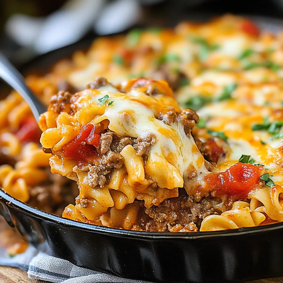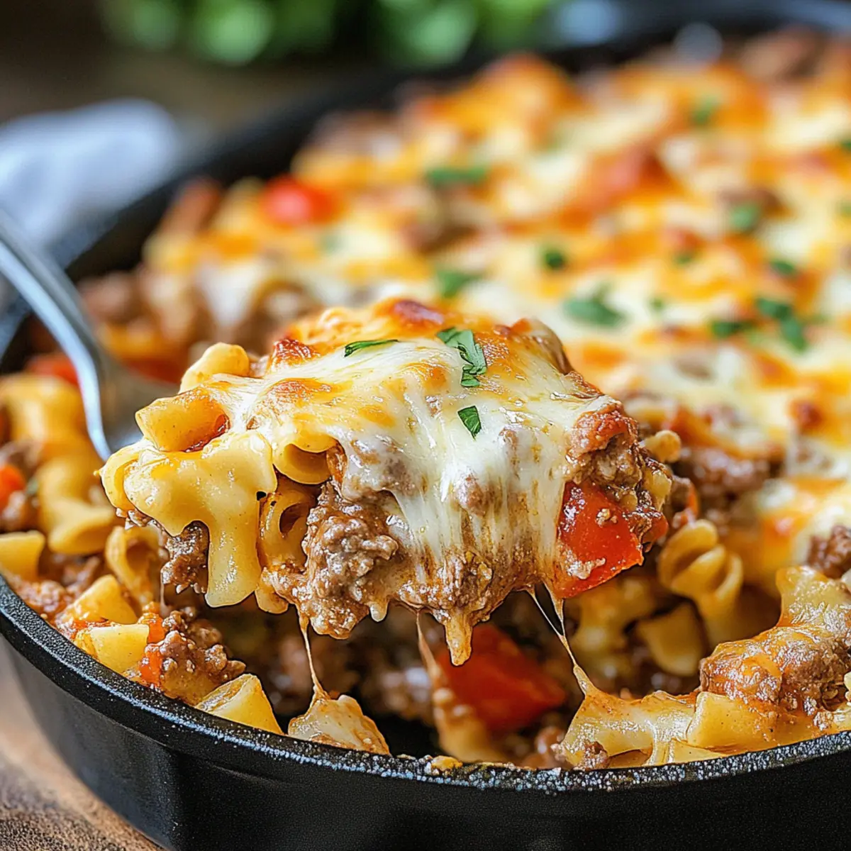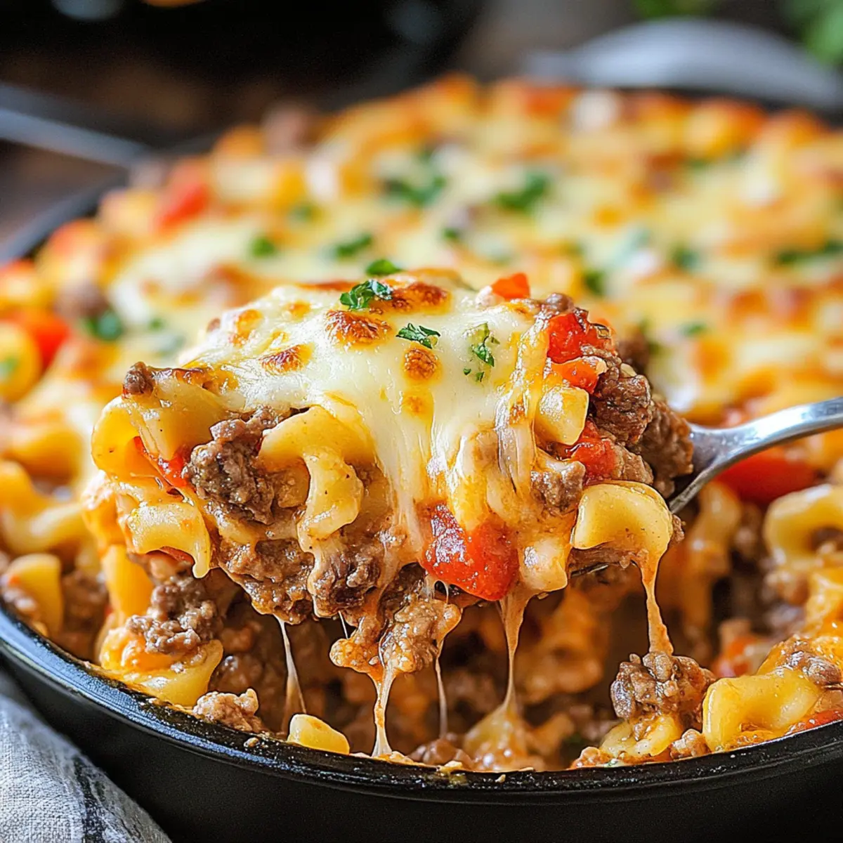 Jump to Recipe Print RecipeThe aroma of a bubbling casserole wafting from the oven can transport you back to simpler times and cherished family gatherings. That’s exactly what you’ll find with my Beef Lombardi Casserole—a dish that captures the essence of comfort food with a delightful Southwestern twist. This hearty recipe not only combines tender beef, creamy noodles, and zesty tomatoes, but it also offers the irresistible perk of being a quick, family-friendly meal you can whip up any night of the week. Perfect for those busy evenings when takeout just won’t cut it, each mouthful feels like a warm hug on a plate. Ready to dive into this comforting delight? Let’s get cooking! Why Is This Casserole So Special? Comforting and satisfying: The Beef Lombardi Casserole wraps you in a warm embrace with its rich flavors and cheesy goodness. Customizable for everyone: Whether you opt for beef, turkey, or a plant-based alternative, this dish caters to various dietary preferences. Quick and easy to prepare: Designed for busy lifestyles, it comes together in under an hour, making mealtime a breeze. Family-friendly flair: This casserole is perfect for pleasing even the pickiest eaters, ensuring a delightful dinner experience for all. Make-ahead convenience: Prepare it a day in advance or freeze portions, offering you flexibility during the week. Dive into a hearty dish with this simple recipe that stands apart from takeout options! Beef Lombardi Casserole Ingredients For the Casserole • Lean ground beef or turkey/chicken – This is the main protein source; use plant-based ground meat for a vegetarian option. • Diced tomatoes (14.5 oz can) – Adds moisture and a fresh, tangy tomato flavor; fire-roasted tomatoes lend a smoky touch. • Diced tomatoes with green chiles (10 oz can) – Offers a zesty kick; opt for mild varieties if you prefer less spice. • Tomato paste (6 oz can) – Intensifies the tomato flavor and thickens the sauce, giving depth to your Beef Lombardi Casserole. • Garlic powder (1 tsp) – Enhances flavor depth; feel free to use fresh garlic for a bolder taste. • Onion powder (1 tsp) – Adds a lovely aromatic flavor; sautéing fresh onions can provide added texture. • Salt (1 tsp) – Essential for flavor balance; always taste and adjust to your preference. • Black pepper (1/2 tsp) – Offers seasoning to elevate the dish. • Egg noodles (12 oz package) – Serves as the base carbohydrate; gluten-free pasta works great for a gluten-free version. • Sour cream or plain Greek yogurt (1 cup) – Provides a creamy texture; swap for a dairy-free alternative as needed. • Shredded cheddar cheese (2 cups) – Adds richness and depth; consider vegan cheese for a dairy-free option. • Grated parmesan cheese (1 cup) – Introduces a savory, nutty note to the casserole. • Shredded mozzarella cheese (1 cup) – Contributes a deliciously melty texture; substitute with your favorite melting cheese if desired. For Garnishing • Avocado slices – Adds creaminess and a fresh layer of flavor. • Fresh cilantro – Provides a burst of freshness that complements the zesty flavors. • Jalapeño slices – For those who enjoy an extra heat kick, making the dish even more exciting. Step‑by‑Step Instructions for Beef Lombardi Casserole Step 1: Prepare Oven & Baking Dish Preheat your oven to 350°F (175°C) and grab a 9×13 baking dish. To prevent sticking, generously grease the baking dish with cooking spray or a thin layer of olive oil. This step ensures that your Beef Lombardi Casserole will come out easily and stay beautifully intact. Step 2: Cook Beef In a large skillet, heat a bit of oil over medium-high heat and add your lean ground beef or turkey. Cook it, breaking it apart with a spatula, for about 5-7 minutes until browned and no longer pink. Drain any excess fat, keeping the beef moist and flavorful for the casserole. Step 3: Make Sauce To the skillet with the cooked beef, stir in the diced tomatoes, tomatoes with green chiles, and tomato paste. Sprinkle garlic powder, onion powder, salt, and black pepper into the mixture. Let it simmer for 15-20 minutes over medium-low heat, stirring occasionally until the sauce thickens and melds together, releasing irresistible aromas. Step 4: Cook Noodles Bring a large pot of salted water to a boil and add the egg noodles. Cook them according to package instructions until al dente, typically about 7-9 minutes. Once done, drain the noodles and immediately mix them with the sour cream in a large bowl until evenly coated for a creamy texture. Step 5: Layer Ingredients Spread the creamy noodles evenly in your prepared baking dish. On top of the noodles, dollop the savory beef mixture, evenly distributing it across the surface. Finally, sprinkle the shredded cheddar, grated parmesan, and mozzarella cheeses generously over the top, creating layers of cheesy goodness in your Beef Lombardi Casserole. Step 6: Bake Place the layered casserole in the preheated oven and bake for 20-25 minutes. Keep an eye on it; you’re looking for a bubbling casserole with melted cheese that turns lightly golden on top. This will create a mouthwatering crust that invites everyone to dig in! Step 7: Serve Once your Beef Lombardi Casserole is bubbly and beautifully browned, remove it from the oven and let it rest for about 5 minutes. This waiting time allows the flavors to settle together beautifully, ensuring perfect servings. Then, scoop out generous portions and enjoy this delightful comfort food with your loved ones! How to Store and Freeze Beef Lombardi Casserole Fridge: Store any leftovers of your Beef Lombardi Casserole in an airtight container in the refrigerator for up to 3 days. Reheat in the oven or microwave until heated through. Freezer: If you want to prep ahead, let the casserole cool completely, then wrap tightly in plastic wrap and foil. It can be frozen for up to 3 months. Thaw overnight in the fridge before reheating. Reheating: