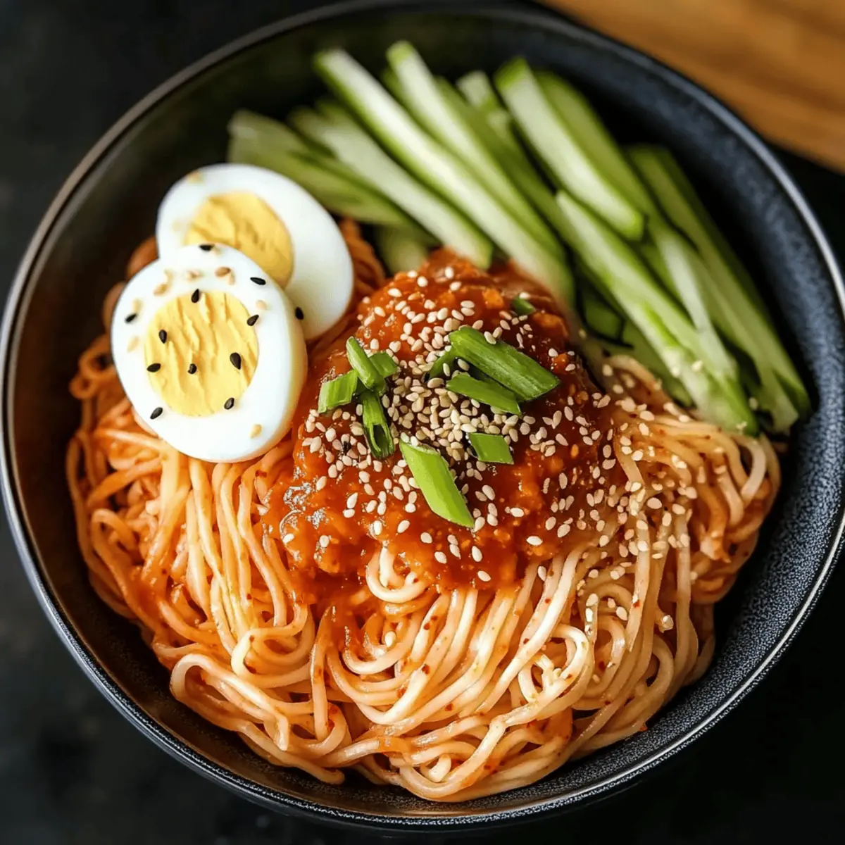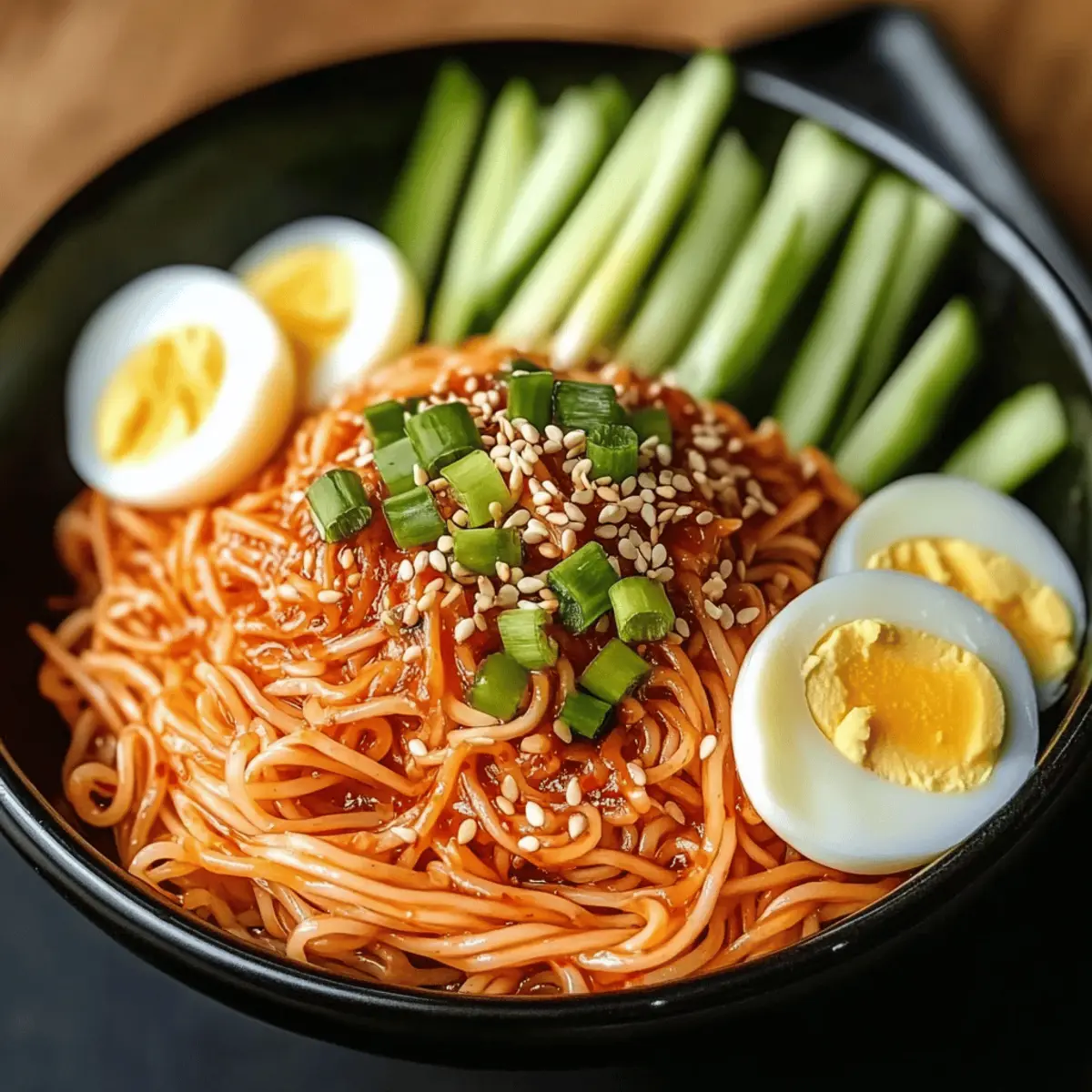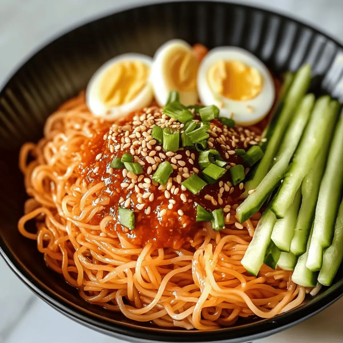 Jump to Recipe Print RecipeAs I was savoring a bowl of spicy cold noodles, I realized how this simple dish, Bibimmyeon, encapsulates the vibrant spirit of Korean cuisine. With its chewy texture and zesty, tangy sauce, Bibimmyeon offers a delightful escape from mundane meals. Whipping up this quick recipe—perfect for those scorching summer days—takes only 25 minutes, making it an unbeatable option for anyone tired of fast food. Imagine digging into a colorful bowl brimming with fresh vegetables and rich flavors that satisfy both your hunger and taste buds. Whether you’re a seasoned home-chef or just looking to shake up your weeknight routine, this dish is a crowd-pleaser that never disappoints. Ready to make your kitchen the hub of flavor and joy? Let’s dive into the delicious world of Bibimmyeon together! Why is Bibimmyeon a must-try? Quick and Easy: In just 25 minutes, you can whip up a bowl of deliciousness that rivals any takeout! This recipe is perfect for those on the go. Vibrant Flavors: With a perfect blend of spicy, sweet, and tangy, each bite bursts with authentic Korean flavor that will transport you to the streets of Seoul. Customizable: Whether adding grilled chicken or tofu for protein, or substituting veggies to suit your taste, this dish caters to everyone. Refreshing Summer Meal: Ideal for hot days, Bibimmyeon makes a cool and satisfying dish that won’t weigh you down. Crowd-Pleaser: Impress family and friends with a dish that offers both visual appeal and great taste, making it a hit at gatherings! Now, are you ready to elevate your dinner game? Bibimmyeon Ingredients For the Noodles • Wheat Noodles (200g) – Provides the base structure for the dish; substitute with somyeon for a more traditional texture. For the Sauce • Gochujang (2 tablespoons) – Adds spiciness and depth of flavor; can replace with red pepper paste if necessary. • Gochugaru (1 tablespoon) – Offers additional heat and smokiness; adjust quantity to taste or use a milder chili powder. • Sugar (1 tablespoon) – Balances the spiciness and acidity of the sauce; brown sugar can be used for a richer flavor. • Soy Sauce (1 tablespoon) – Enhances umami; tamari can be used for a gluten-free option. • Vinegar (1 tablespoon) – Adds acidity to balance the richness; rice vinegar is preferred but can substitute with white vinegar. • Sesame Oil (1 tablespoon) – Provides a nutty aroma and flavor; avocado or olive oil may substitute if sesame is unavailable. For the Toppings • Cucumber (1, julienned) – Adds crunch and freshness; any crisp vegetable, such as zucchini, can be an alternative. • Carrot (1 medium, julienned) – Contributes color and sweetness; other root vegetables like radish can be used. • Hard-Boiled Eggs (2, halved) – Offers protein and richness; omit for a vegan version or replace with tofu. • Sesame Seeds (1 tablespoon) – For garnish and a nutty crunch; crushed nuts can be a substitute. • Chopped Green Onions – Provides fresh flavor to top the dish; other herbs like cilantro may be used for variation. Extras • Ice Cubes (optional) – Keeps the dish refreshingly cold. Experience the vibrant flavors of Bibimmyeon with these essential ingredients! Step‑by‑Step Instructions for Bibimmyeon Step 1: Cook Noodles Bring a large pot of salted water to a boil over high heat. Add 200g of wheat noodles and cook for 3 to 5 minutes until al dente, stirring occasionally. The noodles should be tender yet firm to the bite. Once done, remove them from heat immediately to prevent overcooking. Step 2: Prepare Sauce In a mixing bowl, combine 2 tablespoons of gochujang, 1 tablespoon of gochugaru, 1 tablespoon of sugar, 1 tablespoon of soy sauce, 1 tablespoon of vinegar, and 1 tablespoon of sesame oil. Use a whisk or fork to blend until the mixture forms a smooth, vibrant red sauce, reflecting the signature flavors of Bibimmyeon. Step 3: Drain Noodles Carefully drain the cooked noodles in a colander and rinse them under cold running water. This step is crucial, as it stops the cooking process and cools the noodles, enhancing their chewy texture. For extra chill, you may add some ice cubes in the colander for a moment, then let them drain completely. Step 4: Combine Noodles and Sauce In a large mixing bowl, transfer the cooled noodles and pour the prepared sauce over them. Using your hands or tongs, toss the noodles gently until they are evenly coated with the sauce, ensuring every strand is rich in flavor. The vibrant color should be evenly distributed. Step 5: Add Vegetables Next, fold in the julienned cucumber and carrot into the noodle-sauce mixture. These fresh vegetables will add a delightful crunch and refreshing taste. Toss gently until the vegetables are integrated, maintaining the bright colors and textures of the Bibimmyeon. Step 6: Plate the Dish Divide the noodle and vegetable mixture into individual serving bowls. Use a pair of tongs or a fork to create a nest of noodles in each bowl. The colors should pop, inviting everyone to dig into their refreshing portions of Bibimmyeon. Step 7: Garnish Top each bowl with halved hard-boiled eggs for added richness, and sprinkle 1 tablespoon of sesame seeds over the dish for a nutty touch. Lastly, add chopped green onions as a fresh finishing layer, enhancing both flavor and presentation. Step 8: Serve Cold For an even more refreshing experience, place a few ice cubes in each bowl right before serving. This optional step keeps your Bibimmyeon beautifully chilled, perfect for those warm summer days when you crave cool, invigorating flavors. Expert Tips for Bibimmyeon • Proper Rinsing: Rinse noodles thoroughly under cold water to stop cooking and achieve the perfect chewy texture. • Adjust Heat Level: Start with a smaller amount of gochugaru in your sauce; you can always add more later for an extra kick. • Veggie Customization: Feel free to experiment with different fresh vegetables, like radish or bell peppers