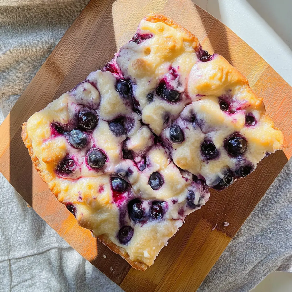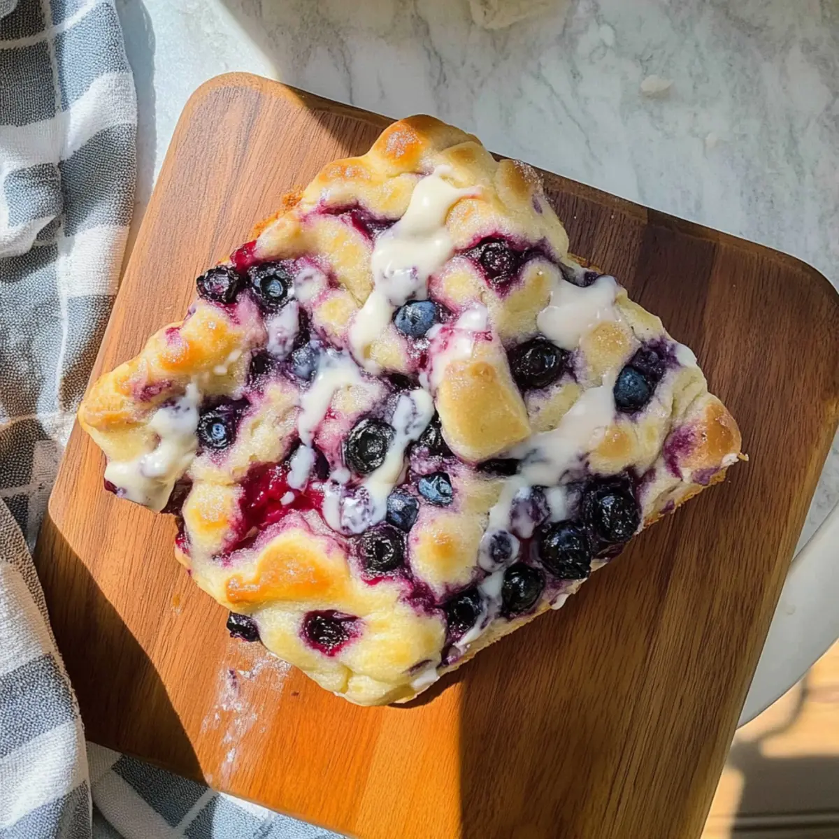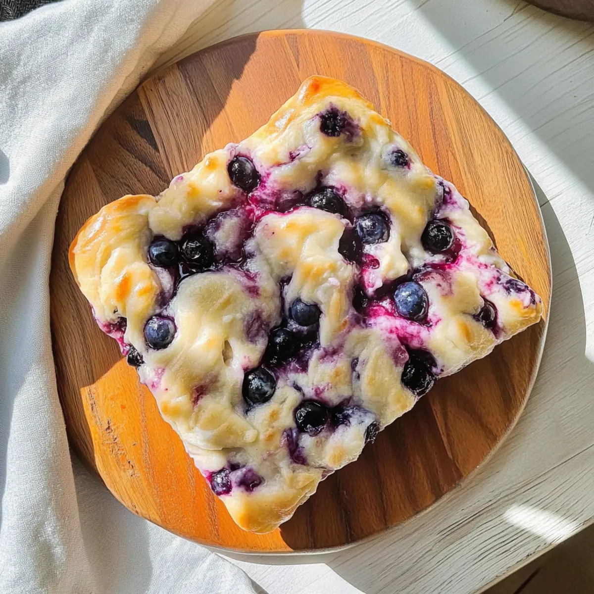 Jump to Recipe Print RecipeAs I stood in my kitchen, the warm aroma of freshly baked bread enveloped me like a comforting hug. There’s something magical about creating your own Easy Blueberry Focaccia Bread, turning simple ingredients into a delightful centerpiece that’s perfect for any occasion. With no kneading required, this beginner-friendly recipe comes together effortlessly, making it an easy choice for both experienced home chefs and those just starting their culinary journey. Imagine serving this fluffy, golden loaf at brunch or as a sweet dessert, drizzled with cream cheese that melts into every crevice. Not only is it quick to prepare, but it’s also versatile enough to impress your family and friends! So, are you ready to fill your home with the scent of baked goodness and share a slice of happiness? Let’s dive in! Why is This Recipe a Must-Try? Irresistible Flavor: The blend of juicy blueberries and creamy drizzle makes every bite an explosion of taste. Beginner-Friendly: No kneading is required, ensuring that anyone can whip this up without stress. Versatile Uses: Perfect for brunch, dessert, or a cozy evening snack, this focaccia fits any occasion. Quick Prep Time: Spend less time in the kitchen; this delightful bread can be ready in under 1.5 hours! Once you take a bite, you’ll want to serve it alongside other favorites like our delicious Blueberry Croissant French toast or enjoy it as a sweet complement to a cup of coffee with a slice of Blueberry Cream Cake. Blueberry Focaccia Bread Ingredients • This section contains everything you need for your easy blueberry focaccia bread! For the Dough Warm Water – Activates yeast; crucial for dough hydration. Olive Oil – Adds flavor and tenderness; can substitute with any neutral oil. Active Dry Yeast – Leavens the dough; ensure it’s fresh for best results. Regular All-Purpose Flour – Provides structure; for gluten-free option, use a suitable blend. Fresh or Frozen Blueberries – Sweetness and moisture; no need to thaw if frozen. For the Cream Cheese Drizzle Powdered Sugar – Sweetens cream cheese frosting; can be omitted for a less sweet option. Soft Butter (regular or vegan) – Adds richness to frosting; use vegan butter for plant-based version. Cream Cheese (regular or vegan) – Base for frosting; ensures creamy texture. For the Optional Blueberry Syrup Agave – Sweetener for blueberry syrup; can substitute with honey or maple syrup. Step‑by‑Step Instructions for Blueberry Focaccia Bread Step 1: Prepare Dough In a large mixing bowl, combine 1 cup of warm water, 2 tablespoons of olive oil, and 2 teaspoons of active dry yeast. Gently stir to combine and let this mixture sit for about 5 minutes until it becomes foamy, indicating that the yeast is activated. This step is crucial for achieving a light and airy texture in your blueberry focaccia bread. Step 2: Form Dough Once the yeast mixture is foamy, add 3 cups of all-purpose flour to the bowl. Mix it until you achieve a thick consistency that forms a sticky dough. Cover the bowl with a kitchen towel and place it in a warm area of your kitchen for about 1 hour, allowing the dough to rise and double in size. Keep an eye on it for a fluffy and voluminous rise. Step 3: Shape & Rest After the dough has risen, gently transfer it to a greased 9×9 inch baking pan. Use your fingers to press the dough evenly into the corners and edges of the pan. Make deep dimples all over the surface of the dough with your fingertips, then fold in about 1 cup of fresh or frozen blueberries, distributing them evenly. Let the dough rest for an additional 15 to 30 minutes before baking. Step 4: Preheat Oven As the dough is resting, preheat your oven to 350°F (175°C). This step ensures that the oven is hot enough to create a beautiful golden crust on your blueberry focaccia bread. You want it to be ready when your dough has completed its final rest. Step 5: Bake Once the oven is preheated and your dough has rested, place the baking pan in the oven. Bake for approximately 30 minutes, or until the top is golden brown and the edges are slightly crisp. Keep an eye on it to prevent overbaking; the focaccia should spring back when lightly touched. Step 6: Make Frosting While the blueberry focaccia bread is baking, prepare the cream cheese drizzle. In a medium bowl, mix together 4 ounces of softened cream cheese, 2 tablespoons of soft butter, and 1 cup of powdered sugar until smooth and creamy. This velvety frosting will complement the warm focaccia deliciously. Step 7: Prepare Syrup (optional) For an added touch of sweetness, prepare the optional blueberry syrup. In a small saucepan, combine 1 cup of blueberries and 2 tablespoons of agave. Cook over low heat for about 5 minutes, stirring gently until the blueberries break down. Strain the mixture to extract a luscious syrup that you can drizzle over the baked focaccia. Step 8: Finish & Serve Once the blueberry focaccia bread has finished baking, allow it to cool slightly in the pan. Generously drizzle the prepared cream cheese over the top, and if you made the syrup, drizzle that as well for an extra burst of flavor. Slice your focaccia while it’s still warm, and serve it up for a delightful treat. Make Ahead Options These Easy Blueberry Focaccia Bread are perfect for busy home cooks looking to save time during the week! You can prepare the dough and let it rise, then store it in the refrigerator for up to 24 hours. Simply cover the bowl with plastic wrap to prevent drying out. The blueberries can also be folded into the dough ahead of time. When you’re ready to bake, take the dough out of the fridge, let it sit at room temperature for about 30 minutes, preheat your oven, and then proceed with baking as usual. This way, you’ll have a fresh, warm focaccia bread without the last-minute rush! Blueberry Focaccia Bread Variations Feel free to add your own twist and make this recipe uniquely yours! Vegan Option: Substitute cream chee