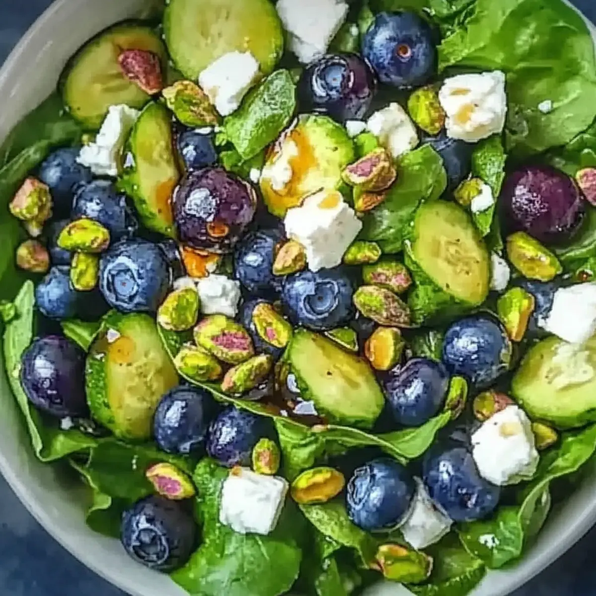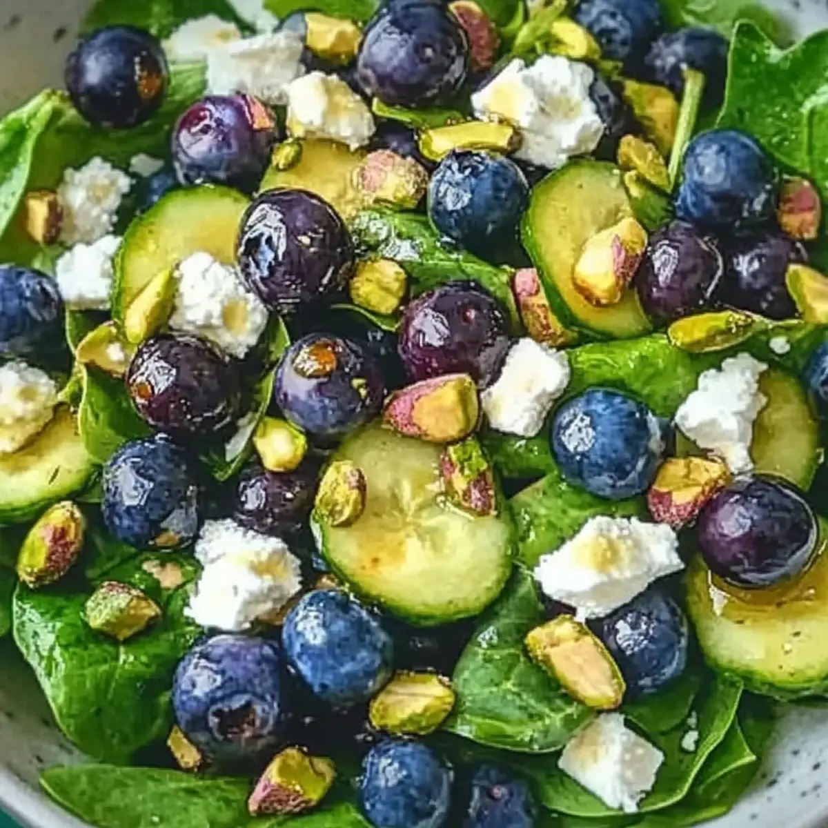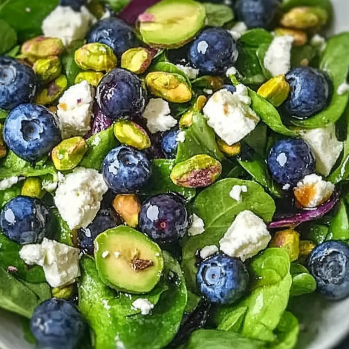 Jump to Recipe Print RecipeAs I walked through the bustling farmers market, the bright blue of ripe blueberries caught my eye, whispering promises of spring and freshness. That moment inspired me to create a dish that sings with seasonal vibrancy: the Blueberry Pistachio Spring Salad. This healthy recipe not only brightens up your plate but can also be whipped up in no time, making it perfect for busy weeknights or elegant gatherings. The combination of juicy blueberries, crunchy pistachios, and creamy feta elevates the ordinary into something extraordinary. Wondering how to capture that essence of spring in a bowl? Let’s dive into this delightful recipe that’s sure to impress! Why is this salad a must-try? Fresh Ingredients: This Blueberry Pistachio Spring Salad bursts with seasonal flavors, featuring juicy blueberries and crunchy pistachios that create a delightful medley on your plate. Quick to Prepare: With simple ingredients and easy steps, you can whip up this salad in no time—perfect for busy weeknights or impromptu picnics. Colorful Presentation: Its vibrant mix of colors makes this salad not just delicious but also stunning, bringing a festive atmosphere to any meal. Versatile Pairing: Whether served alongside grilled chicken or as a refreshing standalone dish, it complements various meals delightfully. Explore other refreshing recipes like Chickpea Salad Grilled or a delicious Waldorf Salad Greek to continue delighting your taste buds! Blueberry Pistachio Spring Salad Ingredients • Get ready to gather everything you need to create this vibrant and healthy dish! For the Salad • Mixed Salad Greens – A blend of tender greens creates a soft, appealing base for the salad. • Fresh Blueberries – Sweet, ripe blueberries add bright, juicy notes to every bite. • Shelled Pistachios – These nuts introduce a delightful crunch and texture; feel free to swap with toasted almonds or walnuts. • Crumbled Feta Cheese – This creamy cheese adds a savory touch; goat cheese is a fantastic alternative if you prefer something softer. • Red Onion (thinly sliced) – Provides a mild, sweet flavor that enhances the overall taste; opt for a milder variety to keep it light. For the Dressing • Extra Virgin Olive Oil – This flavorful oil forms the base of your dressing, enhancing richness; go for a high-quality brand. • Honey – Balances the acidity of balsamic vinegar with natural sweetness; adjust to your taste preference. • Balsamic Vinegar – Adds tang and depth; if you want a fruity twist, try substituting it with apple cider vinegar. • Dijon Mustard – Acts as an emulsifier, helping to combine the oil and vinegar smoothly. • Salt – Enhances overall flavors; don’t forget to adjust it according to your palate. • Black Pepper – Freshly cracked offers the best flavor, adding a mild kick to the dressing. Now that you have everything gathered, you’re ready to make this delightful Blueberry Pistachio Spring Salad that celebrates fresh ingredients and vibrant tastes! Step‑by‑Step Instructions for Blueberry Pistachio Spring Salad Step 1: Prepare the Salad Greens Begin by washing and drying your mixed salad greens thoroughly to prevent any sogginess. Use a salad spinner to remove excess water, ensuring the leaves are crisp and vibrant. Once dried, place them in a large salad bowl, creating a beautiful base for your Blueberry Pistachio Spring Salad. Step 2: Rinse the Blueberries Next, gently rinse your fresh blueberries under cool water and pat them dry with a clean kitchen towel. Handle them with care to keep them whole and bursting with flavor. Once dried, scatter the blueberries over the salad greens, allowing their bright color to shine against the greens. Step 3: Chop the Pistachios Take the shelled pistachios and chop them into smaller pieces using a sharp knife on a cutting board. This enhances their crunchiness and makes them easier to distribute. Sprinkle the chopped pistachios over the salad, adding a delightful contrasting texture to the blueberries and greens. Step 4: Crumble the Feta Cheese Crumble the feta cheese into small chunks using your fingers or a fork, then add it to the mixing bowl. The creamy, salty feta will beautifully complement the sweetness of the blueberries and the crunch of the pistachios in this delicious Blueberry Pistachio Spring Salad. Step 5: Slice the Red Onion Thinly slice the red onion with a sharp knife, aiming for delicate, paper-thin pieces that will infuse the salad with a mild sweetness. Gently incorporate the onion into the salad mixture, ensuring it blends well without overpowering the other flavors. Step 6: Make the Dressing In a small bowl, whisk together extra virgin olive oil, honey, balsamic vinegar, Dijon mustard, salt, and freshly cracked black pepper. Mix until the dressing is emulsified and has a smooth consistency. This honey-balsamic dressing will enhance the vibrant flavors of your Blueberry Pistachio Spring Salad. Step 7: Toss the Salad Drizzle the homemade dressing over the salad components, using tongs for gentle mixing. Toss until everything is evenly coated without smashing the blueberries. The warmth of the fresh ingredients will allow the dressing to lightly soak in, making for a deliciously cohesive salad. Step 8: Adjust Seasoning and Serve Taste your Blueberry Pistachio Spring Salad and adjust the seasoning if necessary, adding more salt or pepper to suit your palate. Serve immediately for the freshest flavor, or chill it in the fridge for a brief period to enhance its refreshing qualities. Make Ahead Options Preparing the Blueberry Pistachio Spring Salad in advance can save you precious time during the week! You can wash and dry the mixed salad greens, and store them in an airtight container in the refrigerator for up to 3 days. Additionally, rinse the blueberries and pat them dry, keeping them in a separate container to maintain their freshness. The chopped pistachios and crumbled feta can a