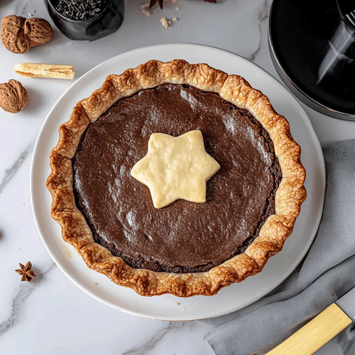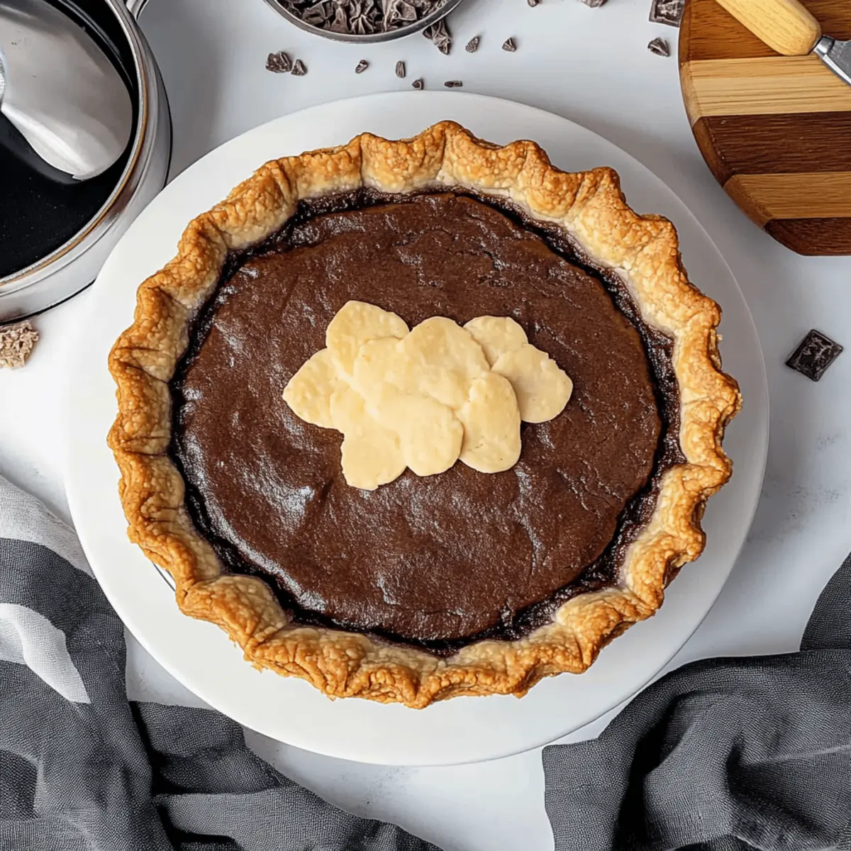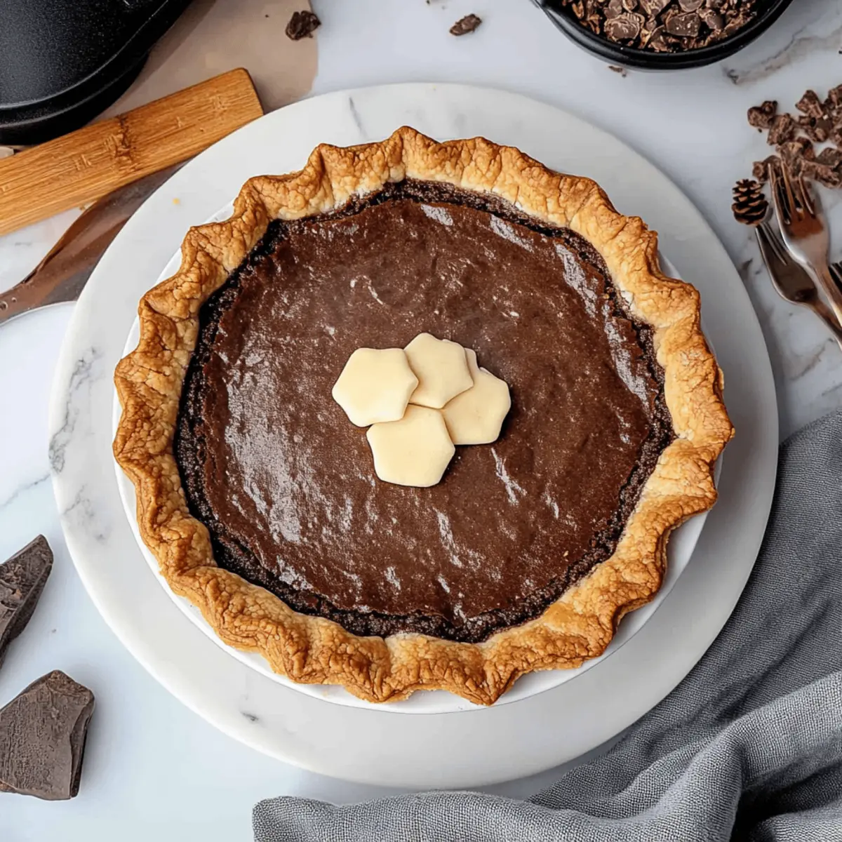 Jump to Recipe Print RecipeJust the other day, I found myself in a sweet dilemma: how could I elevate my usual brownie recipe into something truly special? Enter the Fudgy Brownie Pie with Flaky Crust, a delightful twist that combines the best of both worlds. This homemade pie isn’t just a treat for the taste buds; it’s an explosion of textures, with a gooey, rich brownie nestled in a buttery crust. It’s perfect for gatherings, simple to whip up from scratch, and easily customizable for anyone following a gluten-free or vegan lifestyle. Whether it’s an indulgent evening dessert or a warm treat to impress friends, this brownie pie is sure to win hearts—and maybe even conversations! Curious about how to make it? Let’s dive into the delicious details! Why Choose This Brownie Pie? Homemade Goodness: This Fudgy Brownie Pie is a from-scratch masterpiece that’s surprisingly easy to make, offering a delightful departure from store-bought desserts. Irresistibly Rich Flavor: With its fudgy chocolate filling and flaky crust, every bite is an explosion of taste and texture that chocolate lovers will adore. Customizable Treat: Easily adjust the recipe to cater to gluten-free or vegan diets without sacrificing flavor. Try adding nuts or chocolate chips for an extra crunch! Perfect for Any Occasion: Whether it’s a cozy night in or a special celebration, this pie is guaranteed to impress—all while being simple enough for novice bakers. Family-Friendly Fun: Get the kids involved in the fun of baking! This pie is a hit with all ages and serves beautifully with a scoop of ice cream or a dollop of whipped cream. Why not try it alongside our delectable Coffee Pie Indulge for a dessert spread that will wow your guests? Brownie Pie Ingredients • Dive into the rich flavors of this Brownie Pie with these key ingredients, ensuring a delicious crust and fudgy filling. For the Crust All-Purpose Flour – Provides structure for the pie dough; swap with gluten-free flour if needed. Granulated Sugar – Adds sweetness; be cautious with substitutions as they might affect texture. Salt – Essential for taste balance; never omit for optimal flavor. Unsalted Butter (very cold) – Ensures richness and flakiness in the crust; keep it cold for best results. Water (very cold) – Hydrates the dough; using cold water helps achieve that flaky texture. Apple Cider Vinegar – Boosts crust flakiness; white vinegar serves as a good substitute. For the Brownie Filling Eggs (at room temperature) – Adds richness; use flax eggs for a vegan option. Dark Chocolate (semi-sweet) – Core flavoring of the brownie; feel free to substitute with milk or bittersweet chocolate for a twist. Brown Sugar – Provides additional moisture and sweetness; interchangeably use light or dark brown sugar. Cocoa Powder (unsweetened) – Intensifies chocolate flavor; always opt for unsweetened for balance. For Whipped Cream Topping Heavy Cream (very cold) – Adds a creamy finish to your pie; avoid low-fat cream as it won’t whip well. Powdered Sugar – Sweetens the whipped cream; optional but recommended for a more flavorful topping. With these ingredients at hand, you’re ready to create a heartfelt dessert that will leave everyone longing for a second slice! Step‑by‑Step Instructions for Fudgy Homemade Brownie Pie with Flaky Crust Step 1: Prepare the Crust In a large mixing bowl, whisk together the all-purpose flour, granulated sugar, and salt until well combined. Next, cut very cold unsalted butter into the dry mixture using a pastry cutter or your fingers until it resembles coarse sand. Chill this mixture along with the water and apple cider vinegar in the refrigerator for about 15 minutes to help maintain that flaky texture. Step 2: Form and Chill Dough Gradually add ice-cold water and apple cider vinegar to the chilled mixture, gently mixing until just combined. Form the dough into a disk, being careful not to overwork it. Wrap the disk tightly in plastic wrap and refrigerate for at least 2 hours. This step is crucial for creating that perfect flaky crust for your brownie pie. Step 3: Blind Baking Preheat your oven to 375°F (190°C). Roll out the chilled dough on a lightly floured surface until it’s large enough to fit your pie dish. Transfer the dough to the dish, trimming any excess. Chill the crust again for about 15 minutes, then line it with parchment paper and fill with pie weights. Blind bake for 15-20 minutes, or until it’s golden brown. Brush with an egg wash if desired for a shiny finish. Step 4: Make Brownie Filling While the crust bakes, melt the dark chocolate and unsalted butter together in a heatproof bowl over simmering water, stirring until smooth. In a separate bowl, whisk the eggs and both sugars until pale and fluffy. Gradually mix the melted chocolate into the egg mixture, followed by sifting in the cocoa powder and any remaining dry ingredients until just combined, ensuring a fudgy consistency in your brownie filling. Step 5: Bake Once the crust is ready, pour the brownie batter into the pre-baked crust, spreading it evenly. Bake in the preheated oven for 25-30 minutes, or until the edges are set and the center is slightly wobbly. Allow the brownie pie to cool at room temperature for 1-2 hours, which will ensure a beautifully fudgy texture without compromising the form. Step 6: Decorate and Serve For the whipped cream topping, beat the very cold heavy cream with powdered sugar in a mixing bowl until soft peaks form. Serve generous dollops atop each slice of your fudgy brownie pie. Store any leftovers covered at room temperature for up to 2-3 days, and watch as this irresistible dessert brings joy to everyone! What to Serve with Fudgy Brownie Pie Indulge in an irresistible dessert experience as you create a beautiful meal around this decadent dish that everyone will adore. Vanilla Ice Cream: A classic pairing, its creamy sweetness contrasts beautifully with the rich, gooey brownie filling, enha
