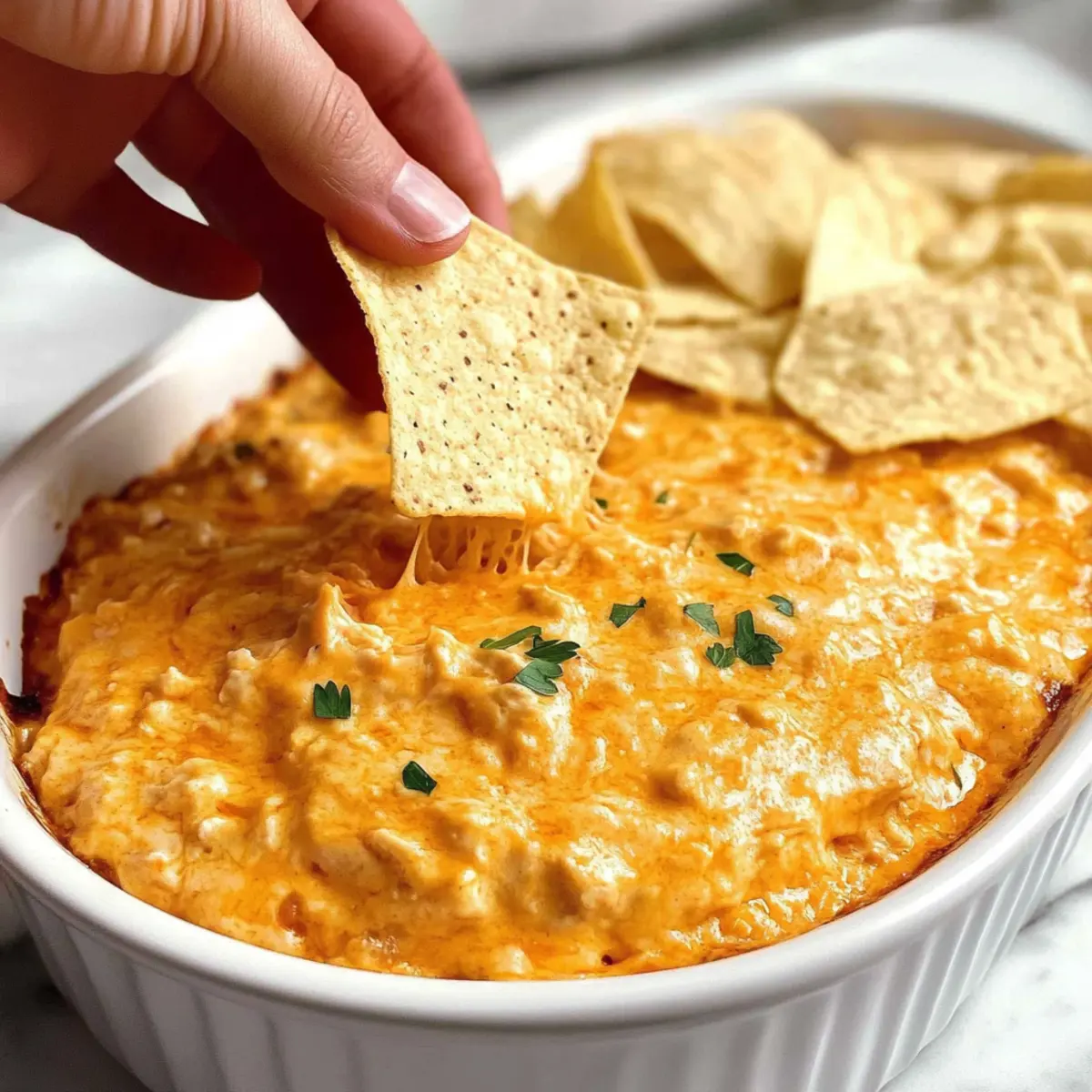 Once baked to perfection, remove your Buffalo Chicken Dip from the oven and let it cool for a minute. Serve it warm with tortilla chips, carrot sticks, or celery sticks for a delightful appetizer. The aroma will draw everyone to the table, ready to dig into this creamy, spicy dip!