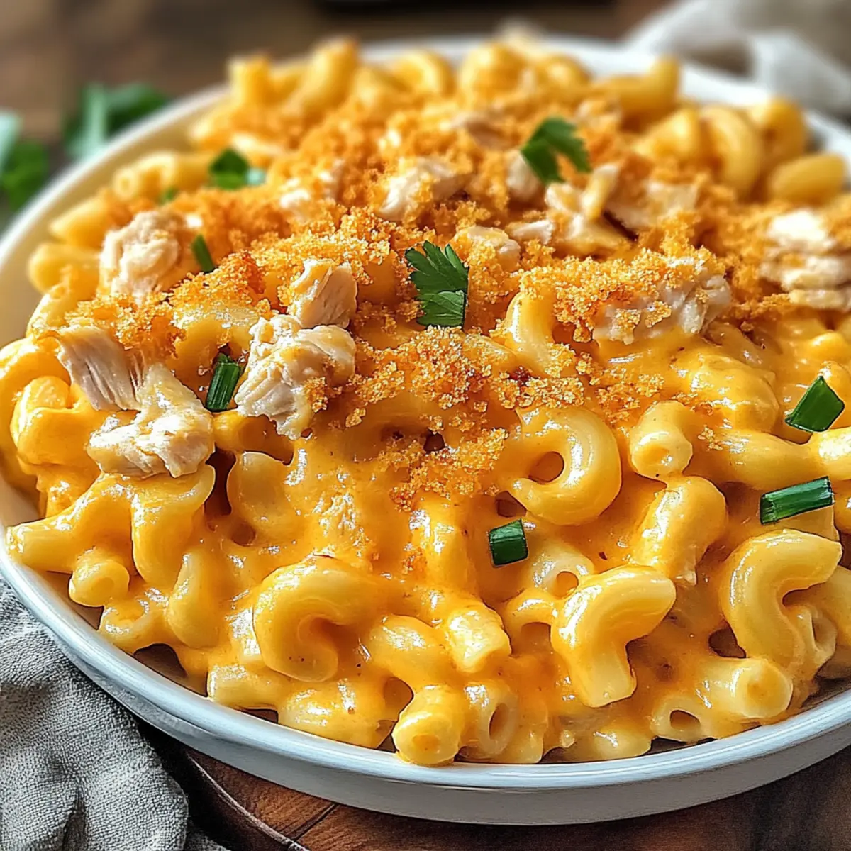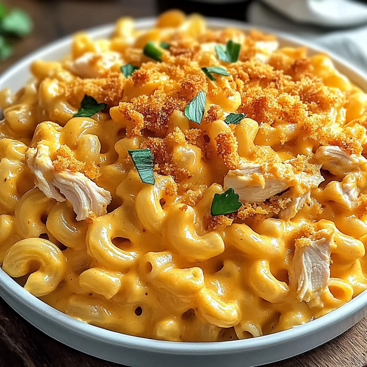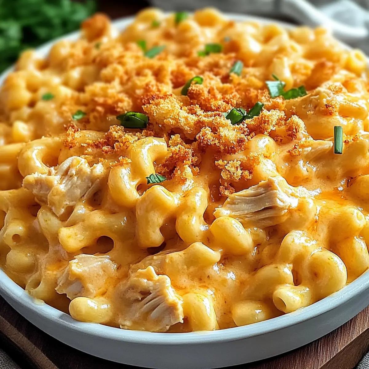 Jump to Recipe Print RecipeThe aroma of melted cheese and spicy buffalo sauce filled my kitchen, urging me to dive into a plate of comfort like no other: Buffalo Chicken Mac and Cheese. This dish marries the rich, creamy goodness of traditional mac and cheese with the exciting kick of buffalo flavor, making it an instant crowd-pleaser. What I love most about this recipe is its quick prep time and incredible versatility; you can easily adapt it to suit your taste or dietary needs. Whether you’re whipping it up for a cozy movie night or bringing it to a potluck, each bite is a delightful journey of cheesy delight and zesty spice. Ready to experience the ultimate fusion of flavors? Let’s get cooking! Why is This Recipe a Must-Try? Comforting and hearty, Buffalo Chicken Mac and Cheese is the perfect dish for satisfying cravings. Quick and easy, this recipe comes together in no time, making it ideal for busy weeknights. Customizable, you can switch out proteins or cheeses to fit anyone’s taste—vegan or gluten-free options are easily made! Crowd-pleaser, whether it’s a family dinner or a game night, everyone will want a second helping. Plus, meal prep-friendly, it stores well, allowing you to enjoy delicious leftovers throughout the week. Ready to create a dish that enchants? Make it yours today! Buffalo Chicken Mac and Cheese Ingredients Get ready to create a deliciously creamy and spicy dish! For the Pasta Elbow Macaroni – Serves as the classic base; feel free to swap for rotini or penne for a fun twist. For the Protein Cooked Shredded Chicken – Adds heartiness; substitute with shredded beef, tofu, or hearty vegetables for a vegetarian version. For the Sauce Buffalo Sauce – Infuses zesty flavor; adjust the heat level by choosing mild or hot based on your spice preference. Cream Cheese – Brings creaminess and richness; for a lighter alternative, sour cream works well. Cheddar Cheese – Offers a flavorful kick; you can also mix in Monterey Jack or Pepper Jack for extra zest. Mozzarella Cheese – Adds gooey meltiness; omit if you prefer a lighter dish. Milk – Creates a smooth, creamy sauce; whole milk is best, or try almond or oat milk for a dairy-free option. Garlic Powder and Onion Powder – Enhance flavor nicely; consider using fresh garlic and onions for more depth. For Topping Panko Breadcrumbs – Provides a delightful crunch on top; regular breadcrumbs or crushed crackers can also work in a pinch. Seasonings Salt and Pepper – Essential for balancing flavors; season to taste for a tailored touch. Step‑by‑Step Instructions for Buffalo Chicken Mac and Cheese Step 1: Cook Pasta Begin by bringing a large pot of salted water to a boil. Once boiling, add 12 oz of elbow macaroni and cook for about 8-10 minutes until al dente. Once cooked, drain the pasta in a colander and set it aside, allowing it to steam off while you prepare the rest of the Buffalo Chicken Mac and Cheese. Step 2: Prepare Chicken In a medium skillet over medium heat, add a splash of oil and sauté your diced cooked chicken for 5-7 minutes. Season it with salt and pepper, stirring occasionally until the chicken is heated through and golden brown. This step enhances the flavor, making your Buffalo Chicken Mac and Cheese even more satisfying. Step 3: Make Cheese Sauce In a saucepan, melt 4 tablespoons of butter over medium heat. Once melted, whisk in 1/4 cup of flour and cook for 1-2 minutes until it forms a thick paste. Gradually whisk in 2 cups of milk, ensuring there are no lumps, and cook until the mixture thickens, about 3-5 minutes. Stir in 8 oz of cream cheese, 2 cups of shredded cheddar cheese, and 1/2 cup of buffalo sauce until smooth and creamy. Step 4: Combine Ingredients With the cheese sauce ready, add the cooked pasta and the sautéed chicken into the saucepan. Stir well to ensure every piece of pasta and chicken is coated in that delicious, creamy buffalo cheese sauce. This is where the flavors meld beautifully together, bringing your Buffalo Chicken Mac and Cheese to life. Step 5: Top and Bake Preheat your oven to 350°F (175°C). Transfer the pasta mixture into a greased 9×13 inch baking dish. Sprinkle a generous layer of panko breadcrumbs on top for that delightful crunch. Bake in the preheated oven for 20-25 minutes until the top is golden brown and bubbly, creating a perfect crust on your Buffalo Chicken Mac and Cheese. Step 6: Serve Once baked, remove the dish from the oven and let it cool slightly for about 5 minutes. Drizzle some extra buffalo sauce over the top for an added kick, and garnish with chopped green onions if desired. Serve warm, and get ready to enjoy every gooey and spicy bite of your Buffalo Chicken Mac and Cheese! How to Store and Freeze Buffalo Chicken Mac and Cheese Fridge: Store leftovers in an airtight container for up to 3 days. Reheat in the microwave for 1-2 minutes, adding a splash of milk to restore creaminess. Freezer: For longer storage, freeze portions in a freezer-safe container for up to 2 months. Thaw in the refrigerator overnight before reheating. Reheating: When you’re ready to enjoy the Buffalo Chicken Mac and Cheese again, reheat in the oven at 350°F (175°C) for about 15-20 minutes, or until heated through. Make-Ahead: You can assemble the dish without baking and refrigerate it for up to 24 hours. Just pop it in the oven when ready to serve! What to Serve with Buffalo Chicken Mac and Cheese? Elevate your meal experience with perfect side dishes that harmonize with creamy comfort food. Crispy Garlic Bread: A crunchy, buttery companion that’s perfect for soaking up the delicious cheese sauce. Its warm, toasty crust adds texture and a hint of garlic that complements the bold flavors of the dish. Simple Side Salad: A light, refreshing mix of greens with a tangy vinaigrette adds a crisp contrast. This salad balances the rich, creamy mac and cheese, keeping your meal wholesome and vibrant. Steamed Broccoli: Tender, vibrant green broccoli offer