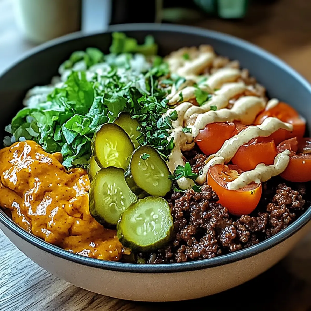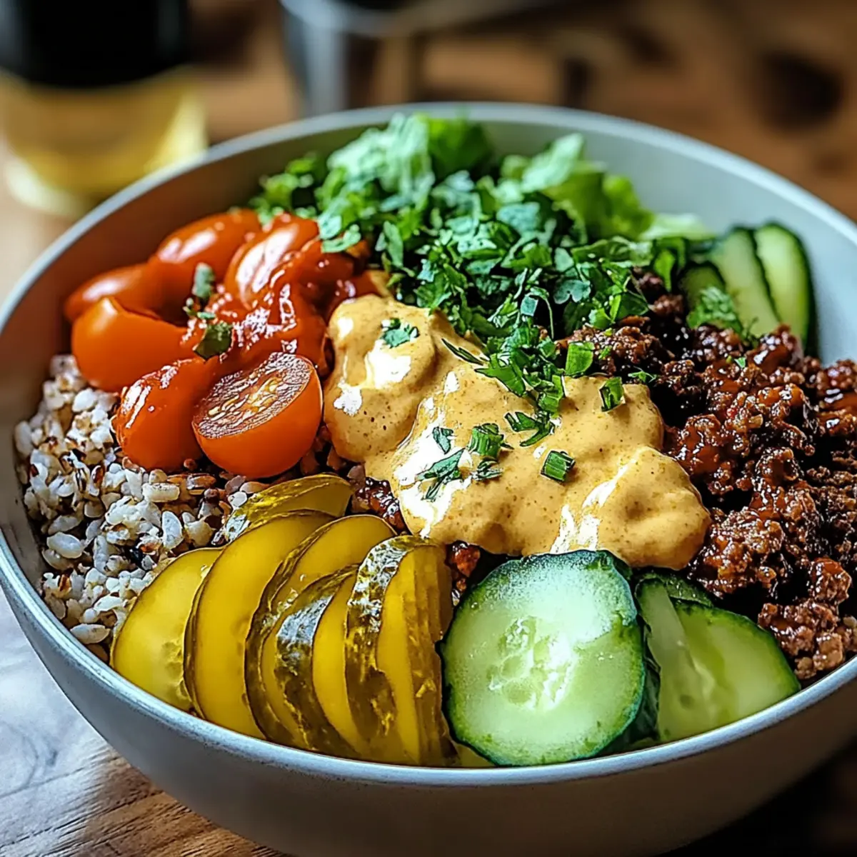 Jump to Recipe Print RecipeThere’s something so comforting about the smell of searing beef that wafts through your kitchen, reminding you of backyard barbecues and summer nights with friends. But what if I told you that you can capture those classic burger flavors without the heaviness of a bun? Enter my delightful Burger Bowls, a light and flavorful twist on your favorite comfort food. Not only are these bowls customizable to fit your dietary needs—think low-carb options and healthy modifications—but they also come together in a snap, making them perfect for busy weeknights or casual gatherings. Each bowl offers the freedom to mix and match toppings, so feel free to get creative! Curious how to turn this simple idea into a satisfying and colorful meal? Let’s dive in! Why Are Burger Bowls a Game Changer? Customization, the heart of these Burger Bowls, lets you tailor each bowl to your liking, whether you prefer lean ground beef or plant-based proteins. Quick to prepare, these bowls come together in less than 30 minutes, making them ideal for hectic nights. Fresh ingredients like vibrant cherry tomatoes and crisp lettuce enhance both flavor and nutrition. Plus, the low-carb option offers a guilt-free indulgence! As a bonus, you can pair them with delicious sides like a fresh salad or even some of our Sriracha Salmon Bowls for a wholesome meal experience. Burger Bowls Ingredients Here’s everything you need to create your own delightful Burger Bowls, perfect for a customizable and healthy meal! For the Base Ground Beef – Choose lean ground beef for a flavorful protein base that keeps your bowls satisfying. Brown Rice – Acts as the hearty foundation; consider using jasmine or cauliflower rice for a low-carb option. For the Toppings Cherry Tomatoes – Adds a burst of sweetness and color; opt for organic for richer flavor. Shredded Lettuce – Provides a refreshing crunch that lightens up the dish. Sliced Pickles – Introduces tanginess to enhance the burger experience; dill pickles work wonderfully. Cheddar Cheese – Melts beautifully over warm ingredients for that classic burger taste; use shredded for easier melting. For the Sauce Ketchup – A staple condiment that brings familiarity; opt for no-sugar versions if you’re watching carbs. Mustard – Offers a zesty kick; both yellow and Dijon mustard add their unique flair. Embrace the essence of your favorite burger in a fresh, customizable way with these Burger Bowls! Step‑by‑Step Instructions for Burger Bowls Step 1: Cook the Rice Begin by preparing the brown rice according to the package instructions, which typically takes around 30 minutes. Rinse the rice under cold water to remove excess starch, then add it to a pot with twice the water and a pinch of salt. Bring it to a boil, then reduce to a simmer, cover, and let it cook gently until fluffy. Step 2: Brown the Beef While the rice is cooking, heat a large skillet over medium-high heat. Add the ground beef and season with salt and pepper to taste. Cook for about 8 minutes, stirring occasionally, until the beef is browned and crumbly. Make sure there’s no pink remaining; drain off any excess fat for healthier Burger Bowls. Step 3: Prepare Toppings As the beef cooks, wash and slice the cherry tomatoes in half, ensuring they are vibrant and juicy. Shred the lettuce into thin strips for a fresh, crispy bite. Take the sliced pickles, using either dill or sweet, based on your preference. Arrange these toppings on a cutting board, ready for assembly. Step 4: Assemble the Bowl Once the rice is cooked and the beef is browned, it’s time to layer your Burger Bowls. Start with a base of warm brown rice in each bowl. Next, generously add the cooked ground beef on top. Follow it with a colorful sprinkle of shredded lettuce, halved cherry tomatoes, and sliced pickles for that classic burger flair. Step 5: Drizzle with Sauce In a small bowl, mix together the ketchup and mustard. This duo will bring a familiar taste to your Burger Bowls. Drizzle this zesty sauce over the assembled ingredients in each bowl, adding as much or as little as you like. Watch as the colors come alive with each flavorful addition. Step 6: Serve & Enjoy Once your Burger Bowls are beautifully assembled, gather around the table to serve and enjoy. Each bowl can be eaten with a fork or you can even use your hands for a casual touch. Feel free to customize further with additional toppings or sauces, making it a delightfully personal meal experience! Tips for the Best Burger Bowls Choose Quality Meat: Lean ground beef offers great flavor while keeping your meal healthier; look for grass-fed options for optimal taste. Unified Texture: Don’t skip the seasoning on the beef; it enhances flavors and connects all elements of your Burger Bowls together. Topping Variety: Mix and match fresh veggies according to your preference; add avocado, grilled onions, or jalapeños for extra flavor and nutrients. Rice Alternatives: If you’re going low-carb, try cauliflower rice or zucchini noodles instead of brown rice for a lighter base. Avoid Overcooking: Keep your veggies crisp; add them on top just before serving to maintain freshness and texture in your Burger Bowls. Burger Bowls: Exciting Variations Await! Feel free to experiment with these Burger Bowls to make a delicious meal that suits your taste buds perfectly! Turkey Swap: Replace ground beef with ground turkey for a lighter, leaner option that’s just as delicious. Cauliflower Rice: Switch out the brown rice for cauliflower rice to create a low-carb version brimming with flavor. Extra Crunch: Add crispy bacon bits or fried onions for texture, giving your burger bowls an exciting twist. Veggie Boost: Toss in sautéed bell peppers or zucchini for more color and nutrition; they blend beautifully with the other flavors. Spicy Kick: Introduce jalapeños or your favorite hot sauce to spice things up, adding heat for those who crave it. Cheese Alternatives: Use vegan