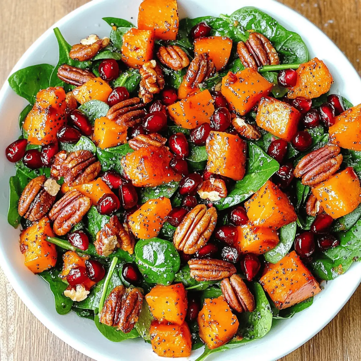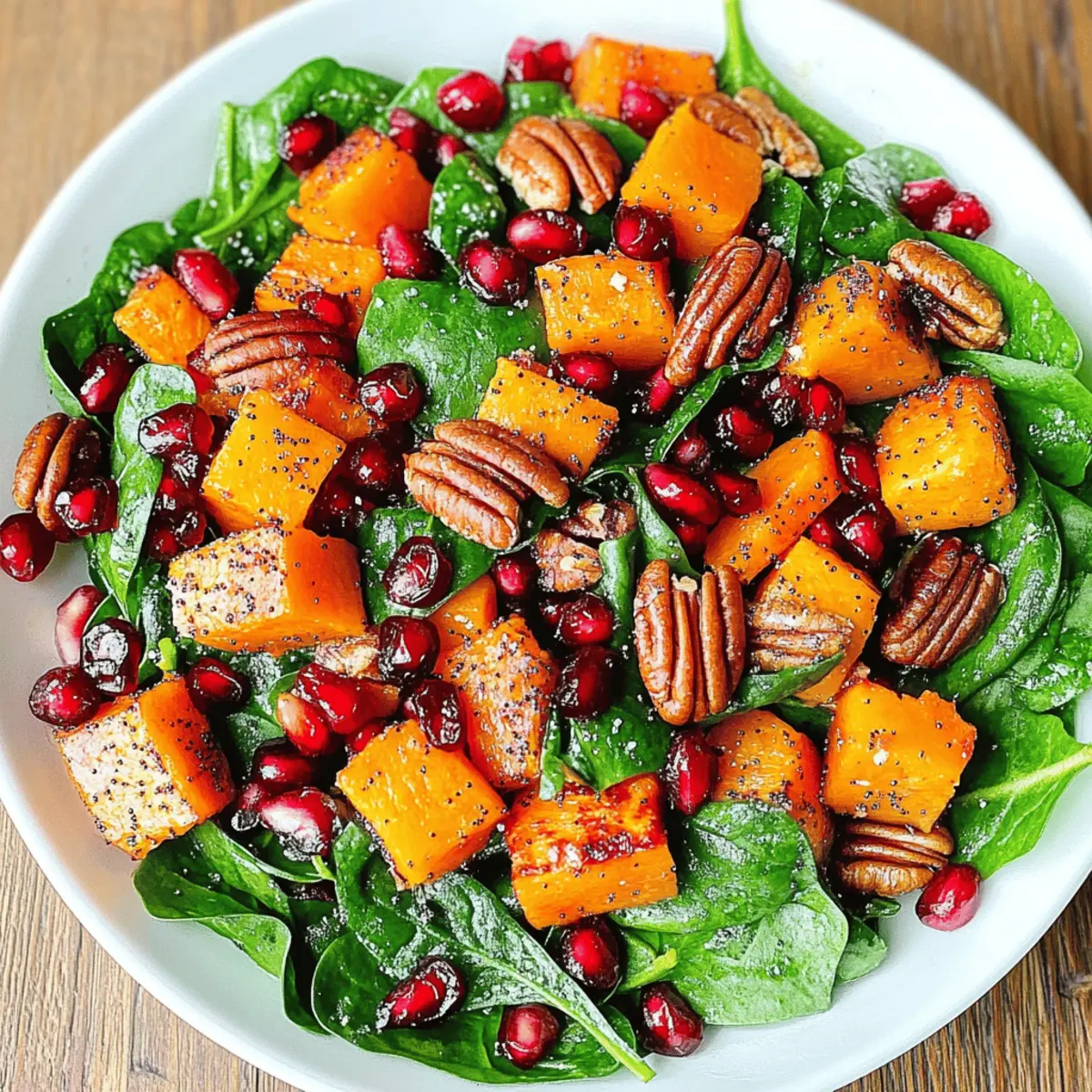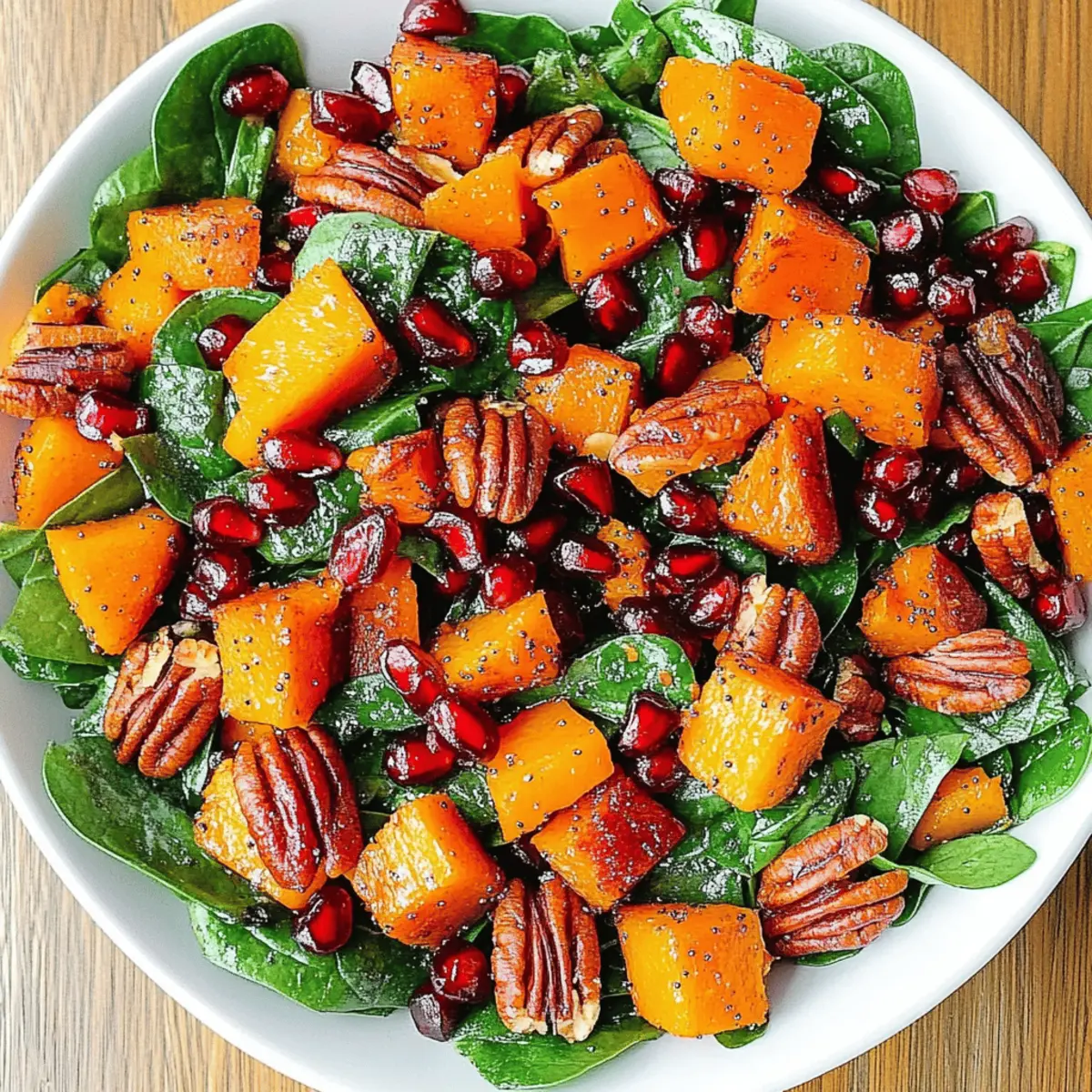 Jump to Recipe Print RecipeAs the crisp air of fall settles in, I can’t help but crave a vibrant salad that celebrates the season’s bounty. This Butternut Squash and Spinach Salad with Poppy Seed Honey-Lime Dressing not only bursts with colorful ingredients but is also a gluten-free dish that’s perfect for your holiday gatherings. Combining the earthy sweetness of roasted butternut squash, fresh baby spinach, crunchy pecans, and tart cranberries, this salad offers a delightful medley of flavors and textures. It’s a refreshing, healthy alternative to heavier fare and can easily impress guests at Thanksgiving or Christmas. Plus, the poppy seed dressing adds a unique twist that takes this salad to a whole new level. Are you ready to elevate your salad game and embrace the festive spirit? Why is this salad a must-try? Freshness abounds in this salad, showcasing seasonal ingredients that highlight autumn’s harvest. Nutritious and gluten-free, it’s packed with vitamins, making it as wholesome as it is delicious. Unique flavors come together with the earthy squash, crunchy pecans, and pop of pomegranate. Perfect for gatherings, this Butternut Squash and Spinach Salad will surely impress at any holiday table! If you’re looking for more crowd-pleasing options, check out my Chickpea Salad Grilled or Waldorf Salad Greek. Butternut Squash and Spinach Salad Ingredients Gather these ingredients for a delightful salad experience! For the Salad Butternut Squash – Adds sweetness and creaminess; use 1 pound, peeled, seeded, and cubed. Substitute with sweet potatoes if preferred. Baby Spinach – The base of the salad that provides freshness; use 10 oz. Replace with arugula or kale for a different texture. Pecan Halves – Offers crunch and nuttiness; use 1 cup. Substitute with walnuts or pumpkin seeds if desired. Dried Cranberries – Introduces a tart sweetness; use ½ cup. Diced apples can be an alternative for crunch. Pomegranate Seeds – Adds festive color and juiciness; use ½ cup. Can omit if unavailable. For the Dressing Olive Oil – Provides moisture and richness; you’ll need ¼ cup total, including 2 tablespoons for the squash. Lime Juice – Adds acidity for balance; use 2 tablespoons. Can swap for lemon juice for a different flavor profile. Honey – Adds natural sweetness; use 3 tablespoons, can substitute with maple syrup for a vegan option. Poppy Seeds – Adds crunch and a slight nutty flavor; use 1 tablespoon. Dijon Mustard – Contributes depth and tang; use 1 tablespoon. Can replace with yellow mustard if needed. Salt – Enhances flavor; use to taste. This vibrant Butternut Squash and Spinach Salad is rich in nutrients and bursting with flavor, making it the ideal holiday side dish! Step‑by‑Step Instructions for Butternut Squash and Spinach Salad Step 1: Preheat the Oven Begin by preheating your oven to 400°F (200°C). This will ensure the perfect roasting temperature for your butternut squash. While the oven heats up, gather your ingredients and prepare your baking sheet by lining it with foil for easy clean-up later. Step 2: Prepare the Squash In a medium-sized bowl, toss your cubed butternut squash with two tablespoons of olive oil and a pinch of salt. Ensure each piece is well-coated, as this will enhance the squash’s natural sweetness. Aim for a homogenous mixture, which helps achieve the best flavor and texture when roasting. Step 3: Roast the Squash Spread the seasoned butternut squash evenly on the prepared baking sheet. Place the sheet in the preheated oven and roast for 20-25 minutes. Halfway through, give the squash a gentle toss to allow even browning. You’ll know it’s done when the squash is tender and lightly caramelized. Step 4: Assemble the Salad In a large bowl, combine the roasted butternut squash, torn baby spinach leaves, ⅔ cup of pecans, dried cranberries, and pomegranate seeds. Gently fold the ingredients together to ensure an even distribution and maintain the freshness of the spinach as you create your vibrant Butternut Squash and Spinach Salad. Step 5: Whisk the Dressing In a small bowl, prepare the dressing by whisking together the remaining olive oil, lime juice, honey, poppy seeds, Dijon mustard, and a little salt and pepper to taste. Continue whisking until the mixture is well-emulsified and smooth, bringing a tangy and sweet flavor that wonderfully complements the salad. Step 6: Dress the Salad Drizzle the freshly whisked dressing over the assembled salad. Using a large spoon, gently toss everything together until the dressing beautifully coats all the ingredients. This will ensure each bite of your Butternut Squash and Spinach Salad is bursting with flavor. Step 7: Garnish and Serve Finally, top the salad with the remaining pecans and a sprinkle of pomegranate seeds for a festive presentation. This adds a delightful crunch and visual appeal. Serve the salad chilled or at room temperature, and watch as it becomes the star of your holiday gatherings! Make Ahead Options These delightful Butternut Squash and Spinach Salad components are perfect for meal prep! You can roast the butternut squash up to 24 hours in advance, letting it cool completely before storing it in an airtight container in the refrigerator to maintain its texture. Prepare the dressing the same way, keeping it sealed for up to 3 days for optimal freshness. When you’re ready to serve, simply mix the roasted squash with the fresh spinach, pecans, cranberries, and pomegranate seeds, then drizzle on the dressing and toss gently. This way, you’ll achieve a fresh and vibrant salad with minimal effort, allowing you to enjoy quality time with family and friends during the busy holidays! Expert Tips for Butternut Squash and Spinach Salad Even Size Squash: Ensure your butternut squash is cut into uniform cubes for consistent roasting, creating a pleasing texture in your salad. Cool Before Mixing: Allow the roasted squash to cool slightly to prevent wilting your fres