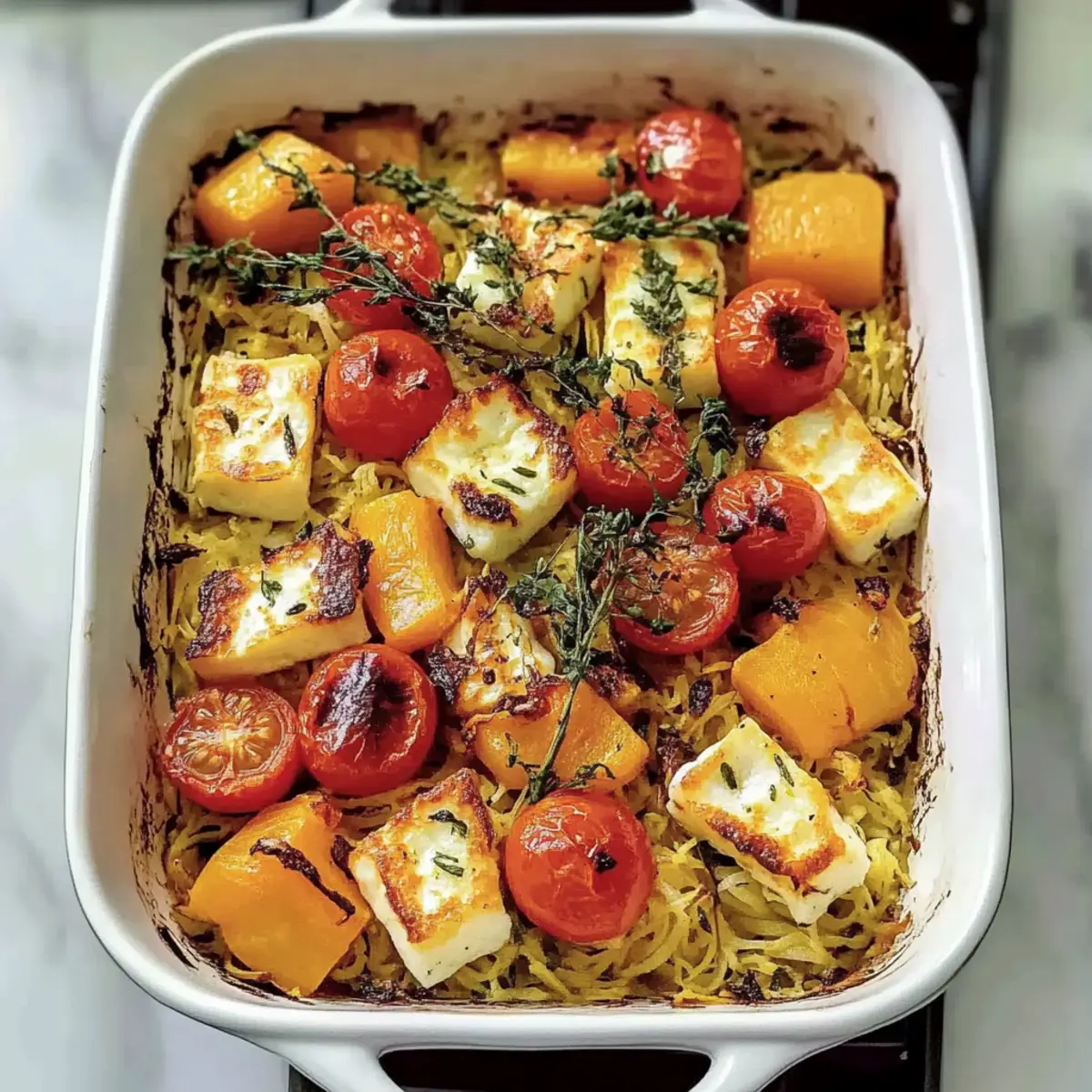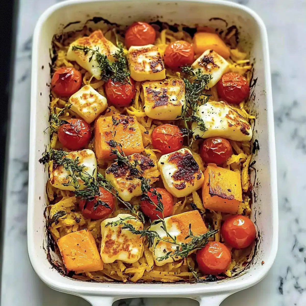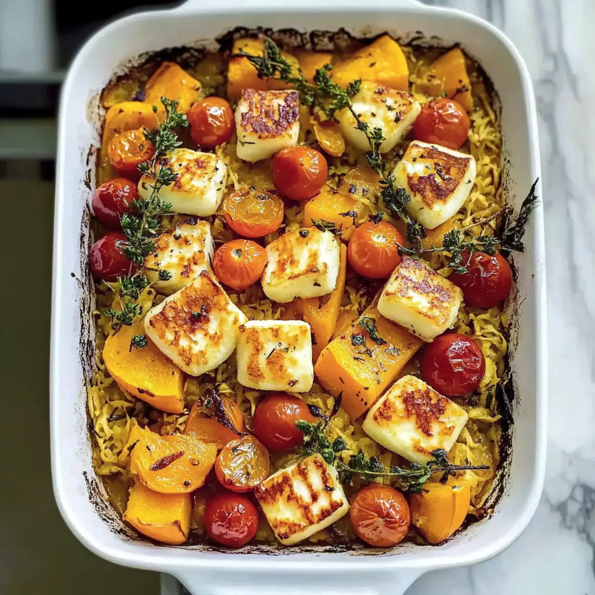 Jump to Recipe Print RecipeAs the leaves turn gold and the air becomes crisp, I find myself craving comforting meals that wrap me in warmth. That’s exactly what this One-Pan Homemade Butternut Squash Bake delivers—an inviting medley of tender roasted squash, al dente orzo, and crispy halloumi that pretty much defines cozy cooking. What I love most about this dish is its effortless preparation, making weeknight dinners a breeze while packing a nutritious punch. Whether you’re a busy parent or a passionate home chef, this vegetarian bake is a crowd-pleaser that satisfies both indulgence and health. Are you ready to fill your kitchen with beautiful aromas and colors? Let’s dive into the delightful world of butternut squash bake! Why is Butternut Squash Bake Special? Comforting and filling, this recipe brings a warm hug to your dinner table. One-Pan magic means less cleanup for you after a long day! Versatile enough to allow for added veggies or proteins, you can personalize it to your taste. Vibrant flavors from garlic, paprika, and pesto work harmoniously, promising each bite to be as satisfying as the last. Enjoy it warm, paired with a fresh salad for a refreshing twist, or explore our Serving Suggestions for ideas on delightful sides. This dish not only tastes great but elevates your meal prep game effortlessly! Butternut Squash Bake Ingredients • Get ready to create magic with these essential ingredients that make your Butternut Squash Bake a must-try! For the Bake Red onion – Adds sweetness and flavor depth; substitute with shallots or yellow onion if needed. Butternut squash – Provides a creamy, sweet base; fresh or frozen cubes work perfectly. Garlic cloves – Enhance the flavor; garlic powder can be used if fresh isn’t available. Olive oil – Ideal for roasting and flavor; avocado oil or melted butter makes a great substitute. Paprika – Adds warmth and color; opt for smoked paprika for a deeper flavor. For the Pasta & Broth Dry orzo pasta – Forms the hearty base of the dish; use other small pasta shapes if you prefer. Vegetable broth – Delivers moisture and flavor; chicken broth or seasoned water are good alternatives. Cherry tomatoes – Contributes freshness and acidity; diced regular tomatoes work well too or can be omitted. For Seasoning & Finish Sea salt and ground black pepper – Enhance the overall flavor; adjust to taste for best results. Pesto – Adds a herby richness; use homemade or store-bought for convenience. Halloumi cheese – Provides richness and unique texture; substitute with feta for a different flavor experience, though it won’t bake the same. Prepare for a delicious experience as you gather these ingredients and transform your kitchen into a comforting haven with this delightful Butternut Squash Bake! Step‑by‑Step Instructions for Butternut Squash Bake Step 1: Preheat the Oven Begin by preheating your oven to 200℃/400°F (fan) or 220℃/425°F (Gas Mark 7). This step is crucial for ensuring your butternut squash bake gets that perfect golden exterior. While the oven heats, gather your ingredients, making sure you have everything ready to create this comforting dish. Step 2: Prepare the Vegetables In a large roasting dish, combine the chopped red onion, cubed butternut squash, and crushed garlic. Drizzle a generous amount of olive oil over the mixture, sprinkle with paprika, and season well with sea salt and ground black pepper. Use your hands or a spoon to toss everything together, ensuring all the vegetables are evenly coated in oil and spices. Step 3: Roast the Vegetables Place the roasting dish in the preheated oven and roast uncovered for about 30 minutes. The veggies should become tender and develop a slight caramelization on the edges. You’ll know it’s time to move on when the butternut squash is fork-tender and has taken on a lovely golden color. Step 4: Add Orzo and Broth After the veggies are perfectly roasted, add the dry orzo pasta directly to the dish, followed by the vegetable broth, cherry tomatoes, and basil pesto. Stir gently to ensure the orzo is submerged in the liquid, as this is essential for it to cook properly in the butternut squash bake. Step 5: Top with Halloumi Next, cube the halloumi cheese and distribute it evenly on top of the mixture in the roasting dish. This layer will create a delicious, crispy topping that complements the dish’s creamy undertones. Return the dish to the oven and get ready for the final bake! Step 6: Bake Until Golden Bake the butternut squash mixture uncovered for another 15-25 minutes, keeping an eye on it to avoid burning. You’ll know it’s ready when the halloumi turns a beautiful golden brown and the orzo is cooked through. It’s best to check for doneness at the 15-minute mark to achieve your desired texture. Step 7: Stir and Serve Once baked, carefully stir the dish to mix the flavors and allow it to cool slightly before serving. This ensures that each bite of your butternut squash bake is bursting with the rich, harmonious flavors you’ve created. Serve warm and delight in the cozy comfort this recipe brings! Make Ahead Options These Butternut Squash Bake preparations make weeknight meal prep a breeze! You can chop the red onion, butternut squash, and garlic up to 24 hours in advance. Simply store them in an airtight container in the refrigerator to maintain freshness. Additionally, you can mix the dry orzo with the vegetable broth and seasonings ahead of time and refrigerate for up to 3 days. When you’re ready to enjoy your cozy dish, just roast the veggies, combine all components, and bake as directed. This prep ensures that your Butternut Squash Bake will still be just as delicious, saving you precious time without sacrificing flavor! How to Store and Freeze Butternut Squash Bake Fridge: Keeps well for up to 4 days in an airtight container. Flavors actually improve after a day, making it perfect for meal prep. Freezer: Portion leftovers into freezer-safe