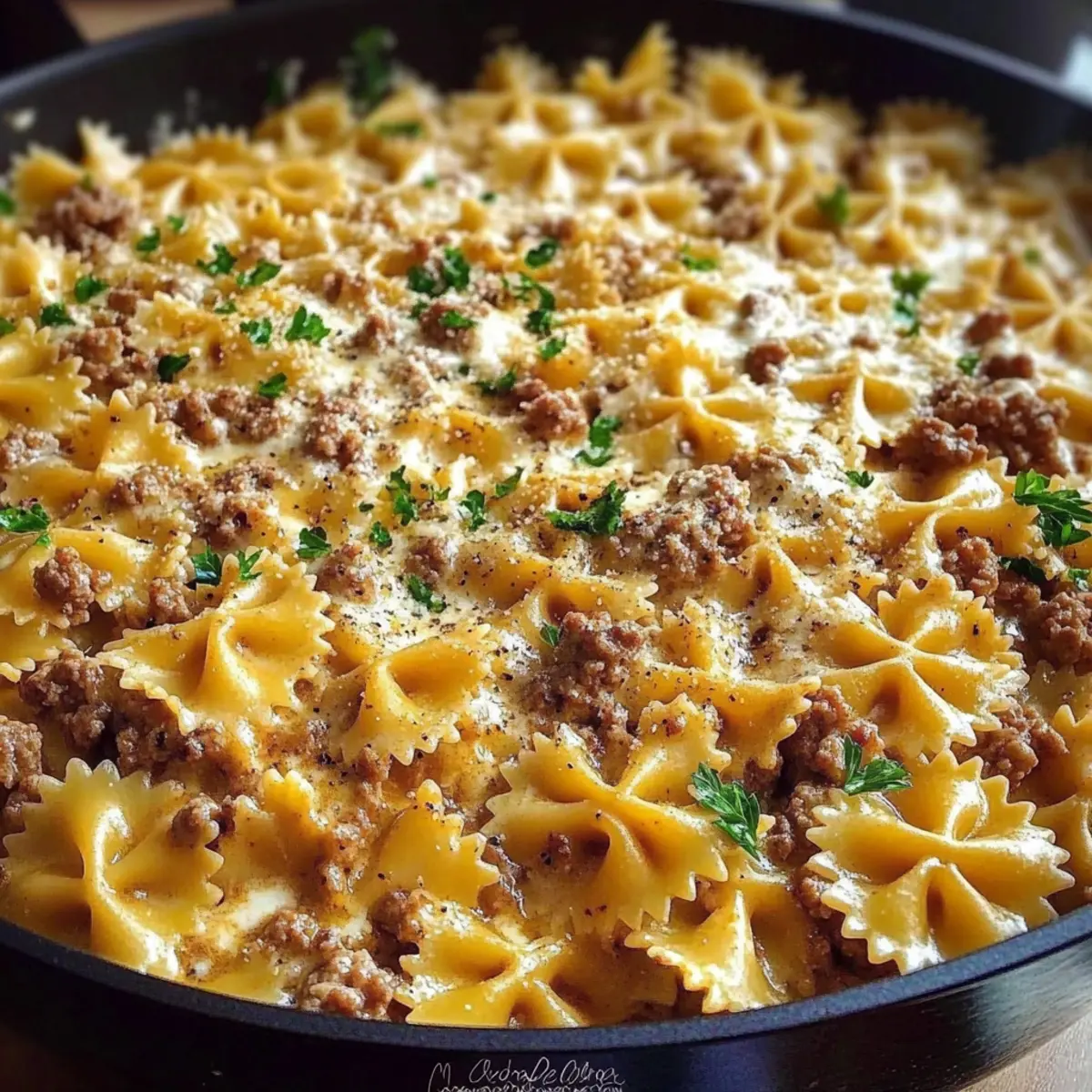 6. Return ground beef to the skillet with the drained pasta. Toss gently until bowties are coated. Add reserved pasta water as needed for consistency.