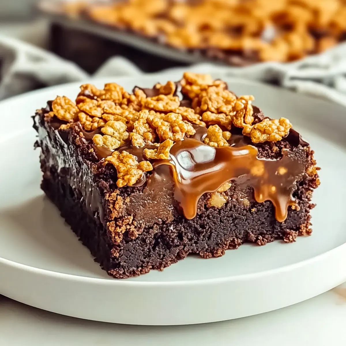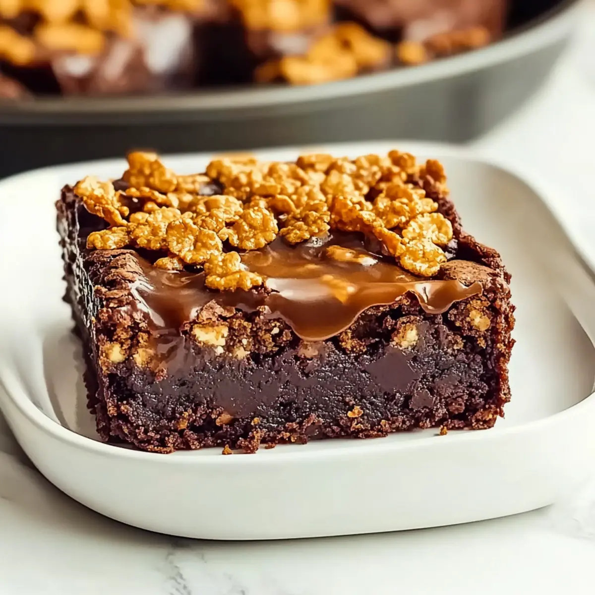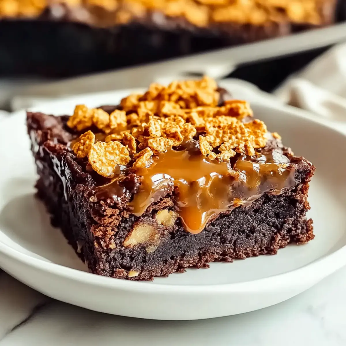 Jump to Recipe Print Recipe“Did you hear that crunch?” That’s the sweet sound of pure bliss in your kitchen as you whip up these Quick Caramel Cornflake Brownies. The crispy cornflakes add an unexpected twist to the rich chocolate base, resulting in a treat that’s as texturally satisfying as it is delicious. Not only are these brownies a fantastic way to impress friends and family, but they also come together in a snap—perfect for those moments when you need a treat but don’t want to spend hours in the kitchen. With a luscious homemade caramel drizzle on top, these brownies offer the perfect balance of sweet and crispy. Who can resist? Ready to dive into this delightful dessert experience? Why Are These Brownies So Irresistible? Simplicity: These Quick Caramel Cornflake Brownies come together effortlessly, with minimal fuss and maximum flavor. Rich Chocolate: The deep, indulgent chocolate base pairs beautifully with the caramel, ensuring each bite is packed with satisfaction. Crunchy Surprise: The crispy cornflakes add an unexpectedly delightful texture, elevating these brownies from ordinary to extraordinary. Whether you need a last-minute dessert or a kid-friendly treat, you can throw these together in no time! If you’re eager for more sweet delights, check out our Caramel Peach Dump or a savory spin with Vegan Caramelized Onion dip for that perfect snack pairing. Crowd-Pleaser: These brownies are sure to impress and will quickly disappear at any gathering! Caramel Cornflake Brownie Ingredients Get ready to create magic with these Caramel Cornflake Brownies! For the Brownie Base Cornflakes – Choose plain, unfrosted cornflakes for that perfect crispy topping. Butter – A key ingredient that adds richness; feel free to use margarine if needed. Chocolate – Opt for high-quality dark chocolate for a richer flavor that truly shines. Sugar – Sweeten the brownie batter; swapping in brown sugar will give a softer texture. Flour – Provides the structure you crave in brownies; gluten-free flour works too! Eggs – Essential for binding; try flax eggs for an egg-free option. Salt – Adds balance to the sweetness; consider reducing it for low-sodium versions. For the Caramel Heavy Cream – A must-have for a luscious caramel; coconut cream is a great dairy-free substitute. Vanilla Extract – Enhances all flavors in the caramel; almond extract can be a lovely twist. For the Topping Caramel Cornflake Mixture – Mix cornflakes into your warm caramel; wait until slightly cooled to prevent sogginess. These Caramel Cornflake Brownies will take your dessert game to the next level! Step‑by‑Step Instructions for Caramel Cornflake Brownies Step 1: Prepare the Pan Begin by greasing an 8×8 inch square baking tin with butter or non-stick spray. Line the bottom and sides with parchment paper, allowing a little overhang for easy removal later. This preparation ensures that your Caramel Cornflake Brownies will come out effortlessly, maintaining their beautiful shape without sticking. Step 2: Preheat Oven Preheat your oven to 200°C (or 180°C for fan ovens) or Gas Mark 6. This step is crucial as it allows your brownies to bake evenly, creating that perfect fudgy texture. When you’re ready to bake, the oven should be hot enough to ensure that the brownies rise just right. Step 3: Melt Ingredients Finely chop the high-quality dark chocolate and set aside. In a saucepan over low heat, melt the butter, stirring gently to avoid burning. Once the butter is fully melted and bubbling, pour it over the chopped chocolate in a mixing bowl, letting it sit for a minute. Stir until the mixture is smooth, creating a luxurious chocolate base for your brownies. Step 4: Combine Ingredients In the same bowl, add the sugar to the melted chocolate and butter mixture, stirring until well combined. Gradually sift in the flour and salt, mixing until smooth. Finally, crack in the eggs, mixing until the batter is glossy and fully blended, ensuring no dry patches remain to make your Caramel Cornflake Brownies rich and decadent. Step 5: Bake Brownies Pour the luscious brownie batter into the prepared pan, using a spatula to spread it evenly into the corners. Bake in your preheated oven for 35 minutes. Check for doneness by inserting a toothpick in the center; you want it to come out slightly gooey, indicating that the brownies will firm up as they cool. Step 6: Cool Brownies Once baked, remove the pan from the oven and allow the brownies to cool completely in the pan on a wire rack. This cooling process is essential as it allows the texture to set and ensures they won’t crumble when you cut them. Patience here will lead to perfectly chewy Caramel Cornflake Brownies. Step 7: Make Caramel In a heavy-bottomed saucepan, add granulated sugar and heat on medium without stirring until it melts and turns golden-amber, about 8-10 minutes. Once it reaches the desired color, slowly pour in the heavy cream, followed by butter, salt, and vanilla extract, stirring constantly until the mixture thickens and reaches 118°C on a candy thermometer. Step 8: Combine Cornflakes Remove the caramel from heat and let it cool slightly for about 5 minutes. Stir in the cornflakes, ensuring they become evenly coated with the luscious caramel. This step is key, as well-coated cornflakes will ensure a perfect crispy topping without becoming too soggy when mixed with the warm caramel. Step 9: Top Brownies Once the brownies are completely cool, pour the caramel-coated cornflakes over the top, spreading it evenly with a spatula. The caramel will glaze beautifully over the surface, giving your Caramel Cornflake Brownies a delightful texture and a sweet finish that contrasts perfectly with the rich chocolate base. Step 10: Cool Completely Allow the Caramel Cornflake Brownies to cool completely at room temperature, which should take about 30 minutes. This is an important step to let the caramel and cornflakes set properly. Once fully cooled, y