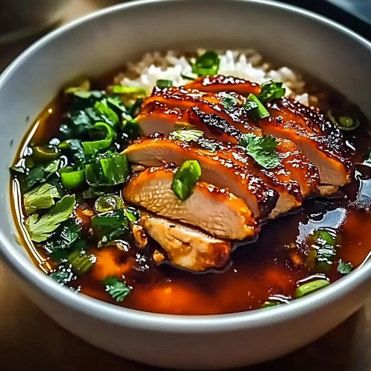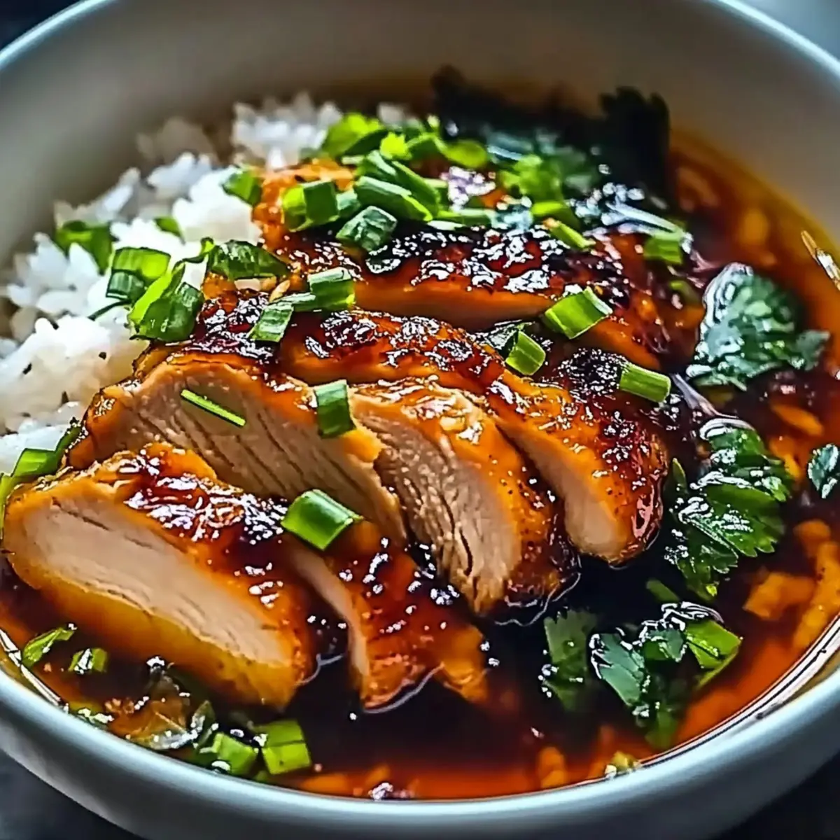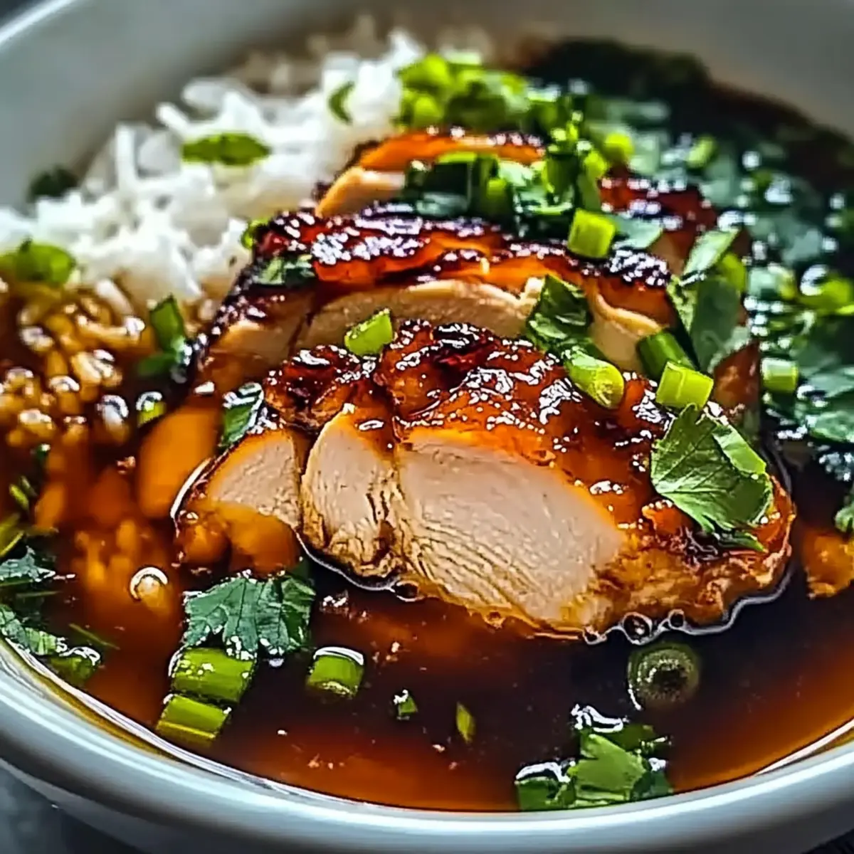 In serving bowls, spoon a hearty portion of jasmine rice. Top with the caramelised soy chicken and ladle the aromatic garlic ginger broth over it. Finish with a sprinkle of sliced green onions and chopped cilantro for a fresh finishing touch, and enjoy this comforting meal!