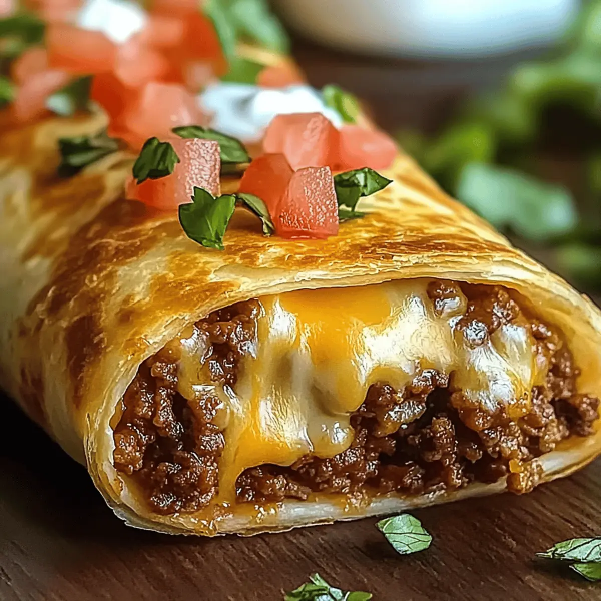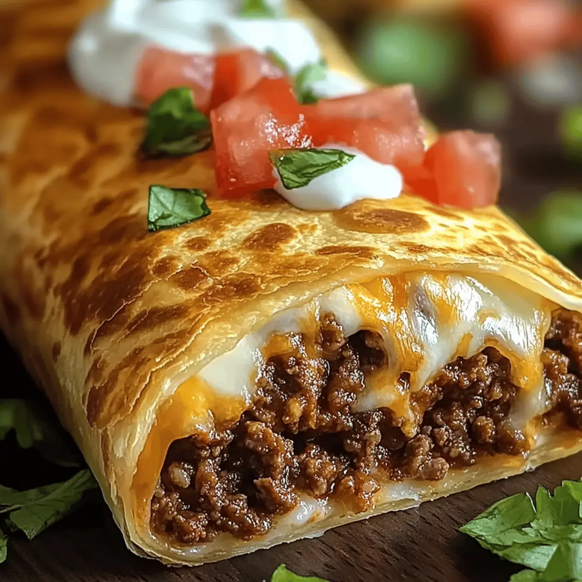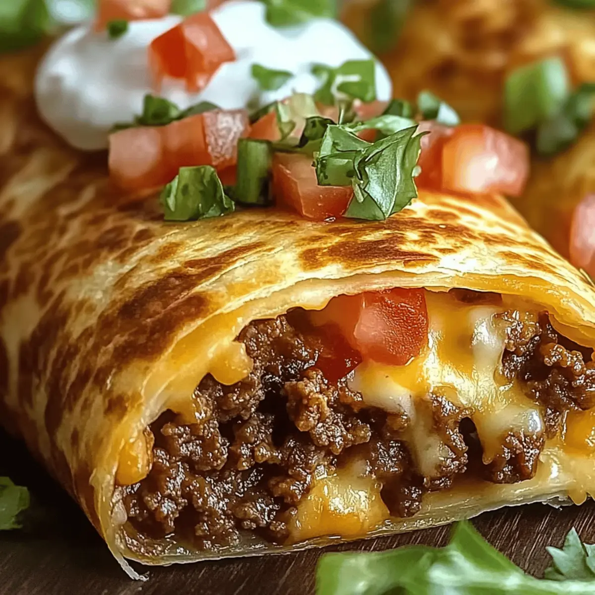 Jump to Recipe Print RecipeAs I stood in my kitchen, the enticing aroma of sizzling ground beef filled the air, instantly transporting me south of the border. There’s something truly special about serving up a plate of Cheesy Beef Chimichangas that’s crispy on the outside and bursting with rich flavor inside. This recipe is not only a winner on busy weeknights—it’s customizable too! Whether you choose to swap the ground beef for savory chicken, turkey, or even a vibrant medley of vegetables, you’ll find that this dish fits any taste or dietary preference. Plus, they’re perfect for family gatherings or casual get-togethers, guaranteeing satisfied smiles all around. Are you ready to indulge in this Tex-Mex delight and explore all the delicious possibilities? Why Are Chimichangas So Irresistible? Crispy exterior: Each bite delivers a satisfying crunch that contrasts beautifully with a gooey, cheesy filling. Customizable deliciousness: Swap beef for chicken, turkey, or even a veggie medley to match your cravings. Perfect for gatherings: These chimichangas are crowd-pleasers, ensuring everyone leaves happy. Easy weeknight meal: Quick preparation makes this recipe a go-to for busy nights—just like my Beef Stew Hearty recipe! Flavor-packed goodness: Bursting with spices and melted cheese, every chimichanga is a flavor fiesta—pair with Cheesy Root Vegetable for extra satisfaction! Cheesy Beef Chimichangas Ingredients For the Filling • Ground Beef – Provides the primary protein; use 80/20 for optimal flavor and juiciness. • Onion – Adds sweetness and depth; can substitute with shallots for a milder flavor. • Garlic – Enhances flavor and aroma; fresh garlic is recommended for the best taste. • Ground Cumin – Adds warmth and earthiness; can substitute with coriander for a different flavor profile. • Chili Powder – Introduces heat and depth; adjust the amount based on your spice preference. • Smoked Paprika – Provides a subtle smokiness; use regular paprika if you prefer a milder flavor. • Salt – Enhances flavor; kosher salt is great for a finer texture. • Black Pepper – Adds bite; freshly ground for the best flavor. • Tomato Sauce – Moisten the filling and provides acidity; substitute with salsa for more flavor. For the Cheeses • Cheddar Cheese – Offers rich flavor and excellent melt; swap for pepper jack for extra heat. • Monterey Jack Cheese – Provides a creamy texture and melts well; can be replaced with mozzarella. For Wrapping & Cooking • Flour Tortillas – Essential for wrapping; larger burrito-sized tortillas are easier to handle. • Vegetable Oil – Necessary for deep frying; can substitute with canola or peanut oil. For Toppings • Shredded Lettuce – Adds freshness; provides a nice crunch against the warm chimichangas. • Diced Tomatoes – Brightens up the dish and adds color; fresh is best for optimal taste. • Sour Cream – Offers a creamy contrast; can use Greek yogurt for a healthier option. • Guacamole – Adds a rich, creamy element; homemade or store-bought both work well. • Salsa or Pico de Gallo – Gives an extra burst of flavor; choose your favorite variety for serving. This Cheesy Beef Chimichangas recipe is designed to be as mouthwatering as it is easy to make—perfect for those weeknight dinners or delightful gatherings! Step‑by‑Step Instructions for Cheesy Beef Chimichangas Step 1: Prepare Filling Heat a large skillet over medium heat and brown 1 pound of ground beef, stirring until fully cooked, about 5 minutes. Add 1 diced onion and 2 minced garlic cloves, cooking until softened, another 5 minutes. Sprinkle in 1 teaspoon each of ground cumin, chili powder, and smoked paprika, along with salt and pepper to taste. Pour in 1 cup of tomato sauce, stirring well, and let simmer for an additional 5 minutes until the mixture thickens. Step 2: Incorporate Cheese Remove the skillet from heat and mix in 1 cup each of shredded cheddar and Monterey Jack cheese. Stir until the cheeses are melted and well combined with the beef mixture. This cheesy concoction is the heart of your Cheesy Beef Chimichangas; set it aside to cool slightly while you prepare the tortillas. Step 3: Assemble Chimichangas Warm four large flour tortillas in the microwave for 30 seconds to make them pliable. Take a tortilla, spoon 1/3 cup of the beef filling into the center, fold in the sides, and roll from the bottom up to secure the filling. Repeat this process with all tortillas, ensuring they are tightly wrapped to avoid any spillage during frying. Step 4: Fry Chimichangas In a deep skillet, heat vegetable oil to 350°F (175°C). Carefully place the chimichangas seam-side down into the hot oil, frying in batches to avoid overcrowding. Cook for 3-4 minutes on each side until they are golden brown and crispy, turning only once. Use tongs to transfer them to a paper towel-lined plate to drain excess oil. Step 5: Serve Plate your crispy Cheesy Beef Chimichangas and serve them warm with shredded lettuce, diced tomatoes, sour cream, and guacamole. Add a side of rice or beans for a complete Tex-Mex meal. Dive into the delicious, cheesy goodness, and enjoy each flavorful bite! Expert Tips for Cheesy Beef Chimichangas Choose Quality Tortillas: Using high-quality, larger tortillas helps to prevent tearing and makes rolling easier. Look for fresh, durable options. Monitor Oil Temperature: Keep the frying oil at a steady 350°F (175°C). If it’s too hot, the chimichangas can burn; if too cool, they may turn greasy. Avoid Overfilling: To prevent your chimichangas from bursting while frying, stick to about 1/3 cup of filling per tortilla. Healthier Cooking Option: For a lighter version, you can brush the chimichangas with oil and air fry them at 375°F (190°C) for 8-10 minutes until crispy. Customize Your Filling: Feel free to swap ground beef for chicken, turkey, or even a hearty mixture of beans and veggies for versatile, delicious Cheesy B