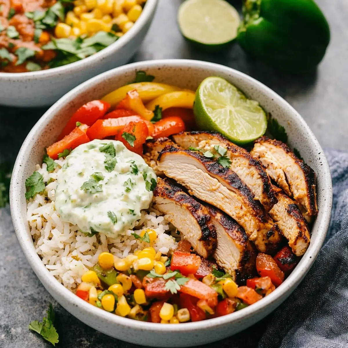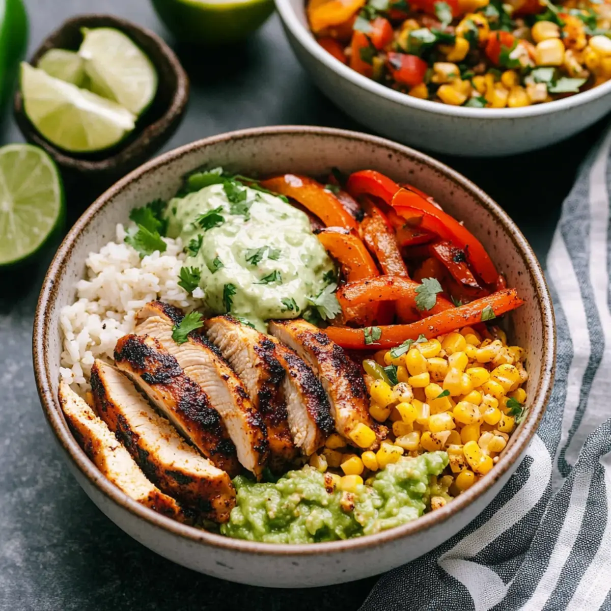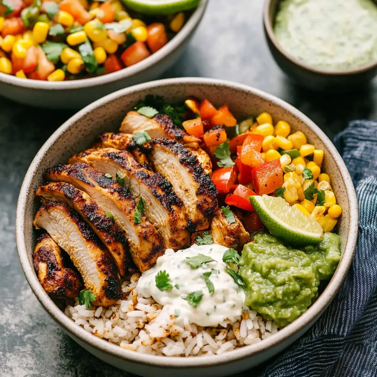 Jump to Recipe Print RecipeThere’s something magical about strolling into the kitchen, surrounded by the tantalizing aroma of spices sizzling in the pan. My Chicken Fajita Bowls are the perfect solution for anyone seeking a vibrant meal that’s as delightful to eat as it is to prepare. With a medley of seasoned chicken, colorful veggies, and tangy cilantro lime rice, this recipe isn’t just another meal; it’s a culinary adventure waiting to happen. The beauty of these bowls lies in their flexibility—ideal for busy weeknights or meal prep, they can be tailored to fit any palate with your favorite toppings. Plus, these bowls ensure you’ll be savoring every last bite, whether you’re enjoying them fresh or discovering their deliciousness days later. Curious about how you can build your own flavor fiesta? Keep reading! Why Are Chicken Fajita Bowls So Irresistible? Bold, Flavorful spices elevate chicken to a new level, making every bite a delight. Versatile and Customizable, you can mix and match your favorite toppings, ensuring everyone leaves the table happy. Easy Meal Prep means you can whip up a batch on the weekend, enjoying fresh flavors all week long. Plus, these bowls are a fantastic crowd-pleaser, perfect for family dinners or entertaining friends. Balanced Nutrition ensures you’re fueling your body with wholesome ingredients without sacrificing taste. Dive into a bowl today and experience why they’re destined to become a staple in your kitchen! Chicken Fajita Bowls Ingredients For the Rice • Olive Oil – Adds moisture and richness; substitute with avocado oil for a different taste. • Long Grain White Rice – The sturdy base of this dish; feel free to swap with quinoa or brown rice for a healthier option. • Water or Chicken Broth – Enhances flavor during cooking; use vegetable broth for a vegetarian alternative. • Kosher Salt – Elevates all flavors in the dish; sea salt can be used as a substitute. • Cumin – Infuses warmth and spice into the rice; ground coriander works well if you’re out of cumin. For the Filling • Boneless Skinless Chicken Thighs – Heartiness that brings this bowl to life; chicken breast or diced tofu can be a great vegetarian option. • Fajita Seasoning – A custom spice blend that beckons flavors of Mexico; store-bought fajita or taco seasoning will do, too. • Minced White Onion – Adds sweetness and depth; substitute red onion for a milder flavor. • Bell Peppers – Crisp and sweet, use one of each color for visual appeal; any color can work. For the Toppings • Chopped Cilantro – Freshness to elevate your dish; swap with parsley if cilantro isn’t your favorite. • Roma Tomatoes – Provides a fresh, tangy bite; cherry tomatoes halved also work beautifully. • Fresh Lime Juice – Adds a zesty brightness; lemon juice can be an alternative for a twist of flavor. • Black Beans – Packs protein and fiber; can be replaced with pinto beans or chickpeas as a variation. • Frozen Corn – Brings sweetness and texture; fresh corn kernels or diced bell peppers are great substitutes. • Unsalted Butter – Assists in charring corn for added flavor; olive oil can be used for a dairy-free alternative. For Serving • Optional Toppings – Elevate your bowl with guacamole, tortilla strips, shredded cheese, and sour cream for a delightful finish. Embrace the beauty of Chicken Fajita Bowls as you explore your culinary creativity with these comforting, hearty ingredients! Step‑by‑Step Instructions for Chicken Fajita Bowls Step 1: Prep All Ingredients Begin by prepping your ingredients to ensure a seamless cooking experience. Chop one red, yellow, and green bell pepper into thin strips, mince half a cup of cilantro, juice one lime, and trim one pound of boneless skinless chicken thighs. Arrange everything neatly on your countertop to make the assembly of your Chicken Fajita Bowls a breeze. Step 2: Cook Rice In a medium saucepan, heat two tablespoons of olive oil over medium heat for about 1 minute. Add one cup of long grain white rice, toasting it lightly for 2-3 minutes until golden and fragrant. Pour in 1.5 cups of water or chicken broth, stir in ½ teaspoon of kosher salt and ½ teaspoon of cumin, bring to a boil, then cover and simmer for 12-15 minutes. Once done, fluff the rice with a fork and stir in black beans, cilantro, and lime juice. Step 3: Make Salsa While the rice cooks, prepare the corn salsa. In a skillet, melt one tablespoon of unsalted butter or heat up olive oil over medium-high heat. Add two cups of frozen corn and sauté for about 8 minutes until charred. Remove from heat and combine with three seeded and chopped Roma tomatoes and half a cup of minced white onion. Set aside, allowing the flavors to meld together. Step 4: Cook Chicken Season the trimmed chicken thighs generously with your homemade fajita seasoning. In the same skillet used for the corn, heat a drizzle of olive oil over medium-high heat. Sear the chicken for about 6-7 minutes on each side until golden brown and cooked through, reaching an internal temperature of 165°F. Let the chicken rest for 5 minutes before slicing it into strips. Step 5: Sauté Veggies Using the skillet, add a bit more olive oil if necessary, then toss in the minced onion and bell peppers. Sauté for around 9-12 minutes, stirring occasionally, until the veggies are tender and slightly caramelized. Keep an eye on them for that perfect, vibrant color, as we’re aiming for flavorful crunch in your Chicken Fajita Bowls. Step 6: Assemble Bowls With everything beautifully prepared, it’s time to assemble your Chicken Fajita Bowls. Start by layering a generous serving of the cilantro lime rice at the base, followed by spoonfuls of the black beans, sliced chicken, sautéed veggies, and finished with the charred corn salsa. Add your chosen toppings like guacamole, tortilla strips, shredded cheese, or sour cream for a delightful finishing touch. What to Serve with Chic