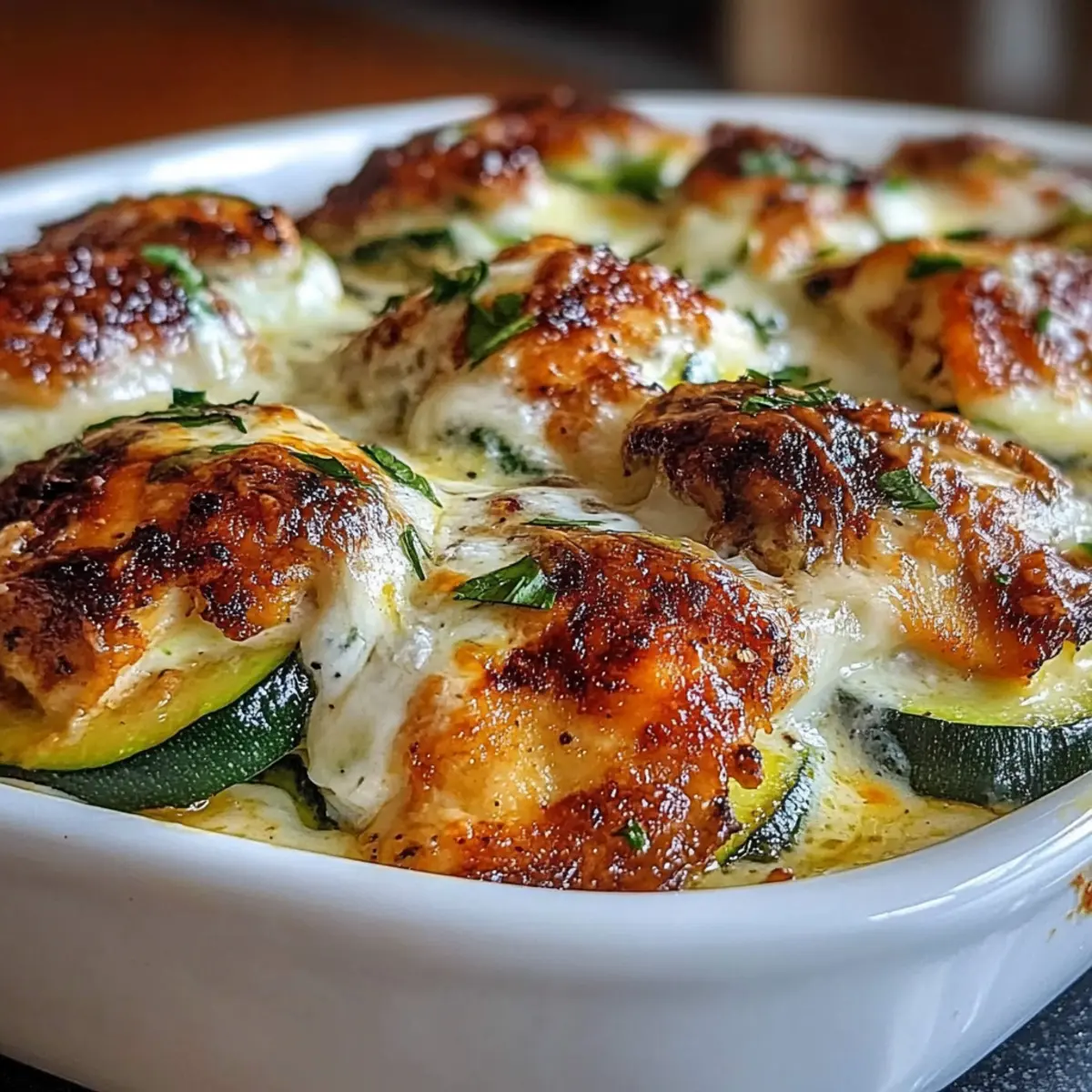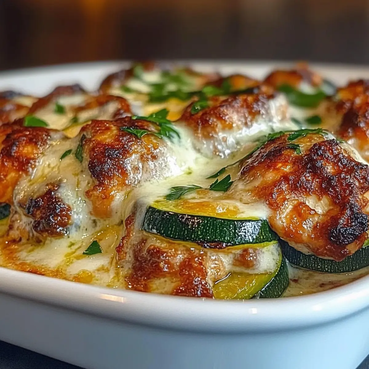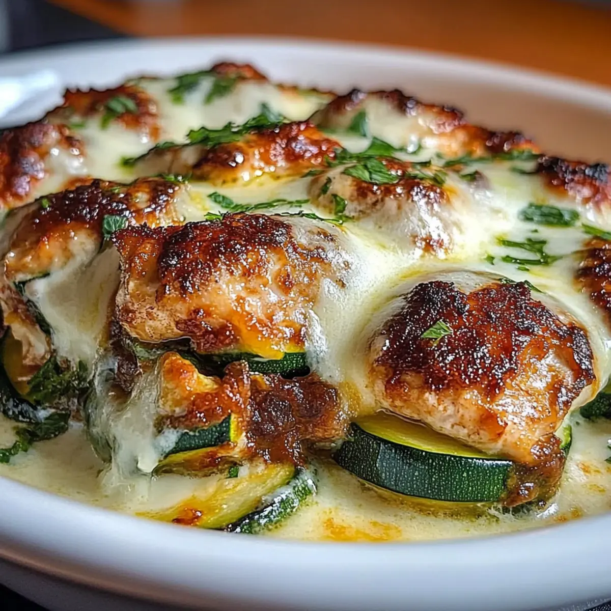 Jump to Recipe Print RecipeAs I stood in my kitchen, a pile of fresh zucchinis beckoned me to create something nourishing yet effortless. The result? A delightful High Protein Chicken Zucchini Bake that has transformed my weeknight dinners! This recipe marries golden-seared chicken with tender zucchini, enveloped in a creamy harmony of Greek yogurt and eggs. Rich in protein and low in carbs, it’s not just a healthful dinner option; it’s a perfect make-ahead meal for busy days. Imagine pulling a warm, cheesy casserole from the oven, the aromas filling your home like a warm embrace. What’s even better? You can easily customize this dish by swapping chicken thighs for an extra flavor kick or making it dairy-free for your dietary needs. Ready to dig into a dish that meets comfort and nutrition? Let’s get cooking! Why Is This Chicken Zucchini Bake Incredible? Versatile Base: This recipe is incredibly adaptable—feel free to swap in chicken thighs for a richer taste or incorporate your favorite seasonal veggies! Nutritious Delight: Packed with high-quality protein and low in carbs, it fits perfectly into health-conscious meal plans, making it suitable for those on gluten-free or low-carb diets. Easy Prep: With straightforward steps, it’s suitable for both seasoned chefs and beginners looking to enjoy homemade food without the hassle of complex cooking techniques. Meal Prep Friendly: Prepare it ahead of time and pop it into the oven when you’re ready, just like in my Chicken Zucchini Bake! Crowd Pleaser: Whether you’re serving it at a dinner party or a weeknight family meal, the cheesy, comforting layers are sure to impress everyone at the table. Simple Ingredients: With basic pantry staples, you can whip this dish up without extra trips to the grocery store. With delicious servings guaranteed, why not indulge? Chicken Zucchini Bake Ingredients • For the Bake Boneless, Skinless Chicken Breast – A lean protein that provides satisfying texture; feel free to swap in chicken thighs for richer flavor. Zucchini – Adds bulk and moisture; consider yellow squash or eggplant for a delightful twist. Yellow Onion – Contributes sweetness; shallots or leeks can be used as alternatives. Eggs – Acts as a binder, giving structure; while substitutes may work, they won’t achieve the same fluffy texture. Plain Greek Yogurt – Forms a creamy, tangy base; use dairy-free yogurt for a dairy-free version. Olive Oil – Essential for greasing and sautéing; vegetable oil works in a pinch. Salt – A must for enhancing flavor; adjust to your personal taste preference. Freshly Ground Black Pepper – Offers a hint of heat; no substitutes necessary here. • For the Seasoning Dried Oregano – Infuses aromatic goodness; no substitute needed for that herbal touch. Smoked Paprika – Adds smoky depth; regular paprika will work if you’re in a bind. Garlic Powder – Boosts the overall flavor; fresh garlic can be used but may require adjusting the amount. Garlic (minced) – Freshens up the mixture; utilize garlic powder if you’re out of fresh. • For the Topping Low-Fat Mozzarella Cheese – Delivers creaminess; dairy-free alternatives are available for those avoiding dairy. Parmesan Cheese (grated) – Adds savory depth; nutritional yeast makes for a great vegan substitute. Fresh Parsley or Basil – Provides a pop of freshness; optional yet delightful to include. Step‑by‑Step Instructions for Chicken Zucchini Bake Step 1: Preheat the Oven Begin by preheating your oven to 375°F. While the oven warms up, grab a 9×9-inch baking dish and grease it generously with olive oil to ensure easy removal of the Chicken Zucchini Bake once it’s cooked. This preparation sets the stage for a delicious melding of flavors. Step 2: Season the Chicken In a mixing bowl, combine dried oregano, smoked paprika, garlic powder, salt, and freshly ground black pepper. Toss your boneless, skinless chicken breast pieces in this fragrant seasoning mix until well coated. The vibrant aroma will fill your kitchen, promising a flavorful dish ahead. Step 3: Sear the Chicken Heat a drizzle of olive oil in a skillet over medium-high heat. Once shimmering, add the seasoned chicken pieces and sear them for 3-4 minutes on each side until they achieve a beautiful golden-brown color. This step locks in moisture and flavor, giving the Chicken Zucchini Bake a satisfying texture. Step 4: Sauté Aromatics In the same skillet, without wiping it clean, add chopped yellow onion and sauté for about 3 minutes until they soften and become translucent. Toss in minced garlic and continue to cook for an additional 30 seconds, just until fragrant. This creates a delicious aromatic base that complements the chicken perfectly. Step 5: Prepare the Egg Mixture In a medium bowl, whisk together the eggs and plain Greek yogurt until smooth and creamy. Season the mixture with a pinch of salt and freshly ground black pepper to taste. This blend will unify all the wonderful ingredients of your Chicken Zucchini Bake, adding a delightful richness. Step 6: Combine the Ingredients Mix the seared chicken with the sautéed onion and garlic in the skillet, ensuring everything is well combined. This step allows the flavors to meld beautifully, with the warm chicken absorbing the aromatic goodness from the onions and garlic, enhancing the Chicken Zucchini Bake’s flavor profile. Step 7: Layer the Bake In your prepared baking dish, layer half of the zucchini slices evenly at the bottom. Spoon in the chicken mixture, followed by half of the yogurt-egg mixture, and sprinkle with half of the low-fat mozzarella and Parmesan cheese. Repeat the layers with the remaining zucchini, chicken mix, yogurt-egg blend, and cheeses for a hearty finish. Step 8: Bake Covered Cover the baking dish tightly with foil and place it in the preheated oven. Bake for 20 minutes to allow the ingredients to meld together and the zucchini to soften, creating a comforting and cohesive Chi