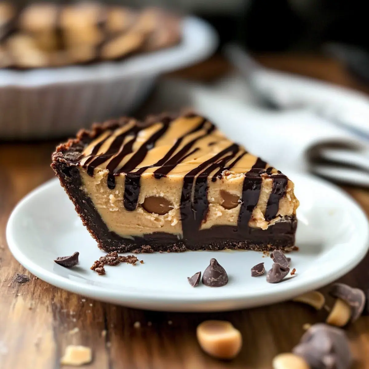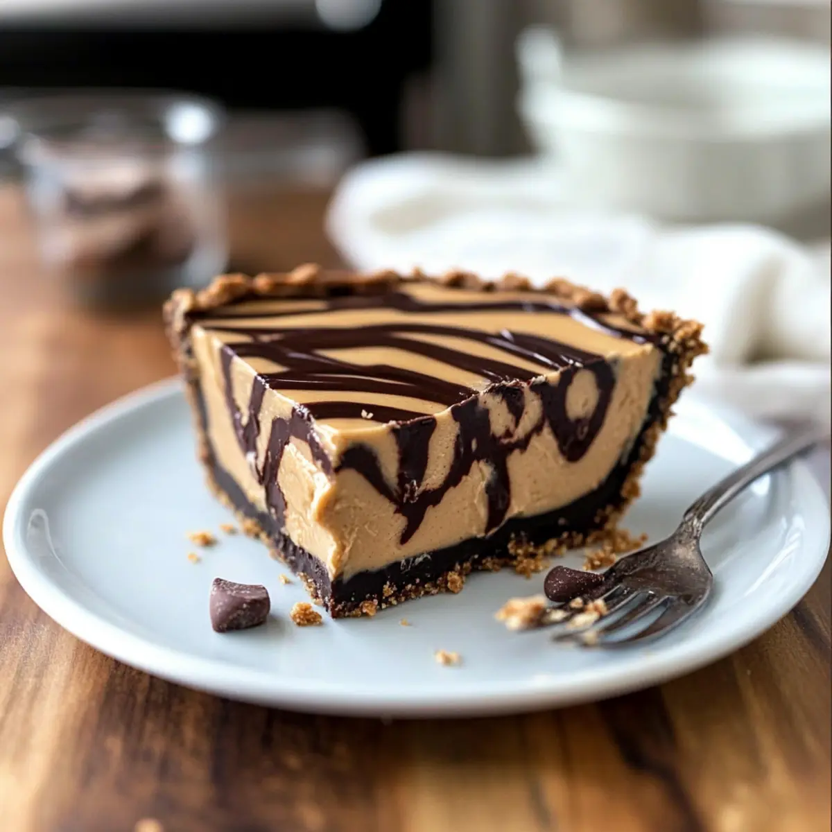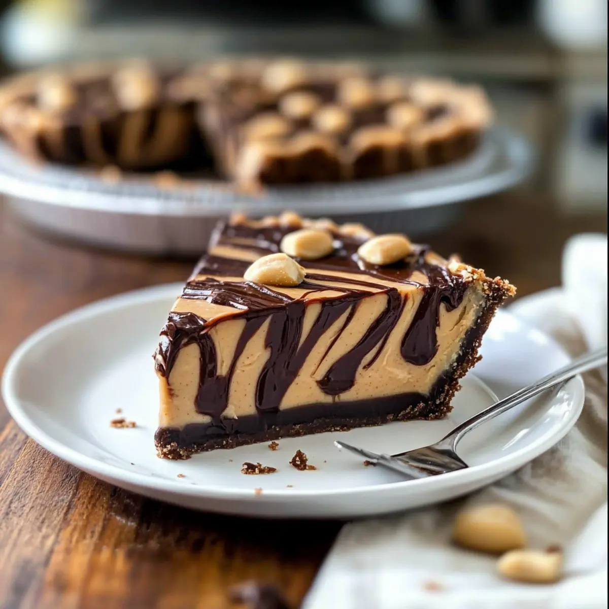A decadent Chocolate Peanut Butter Swirl Pie with a rich chocolate cookie crust and creamy peanut butter filling.