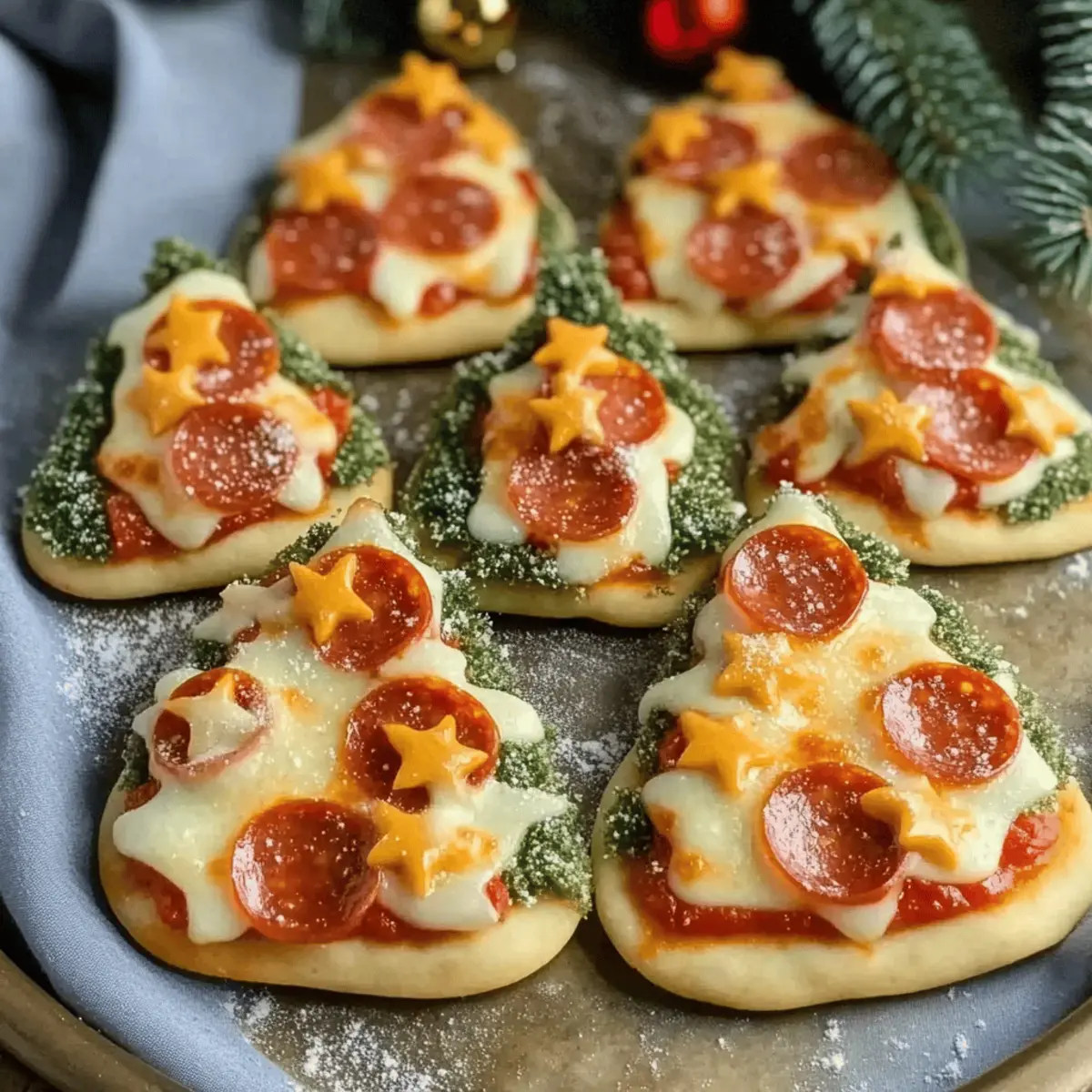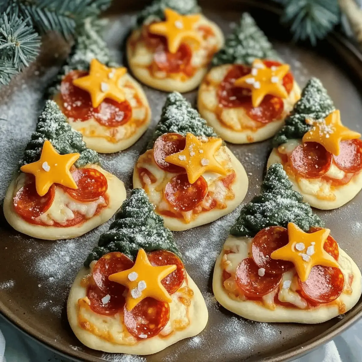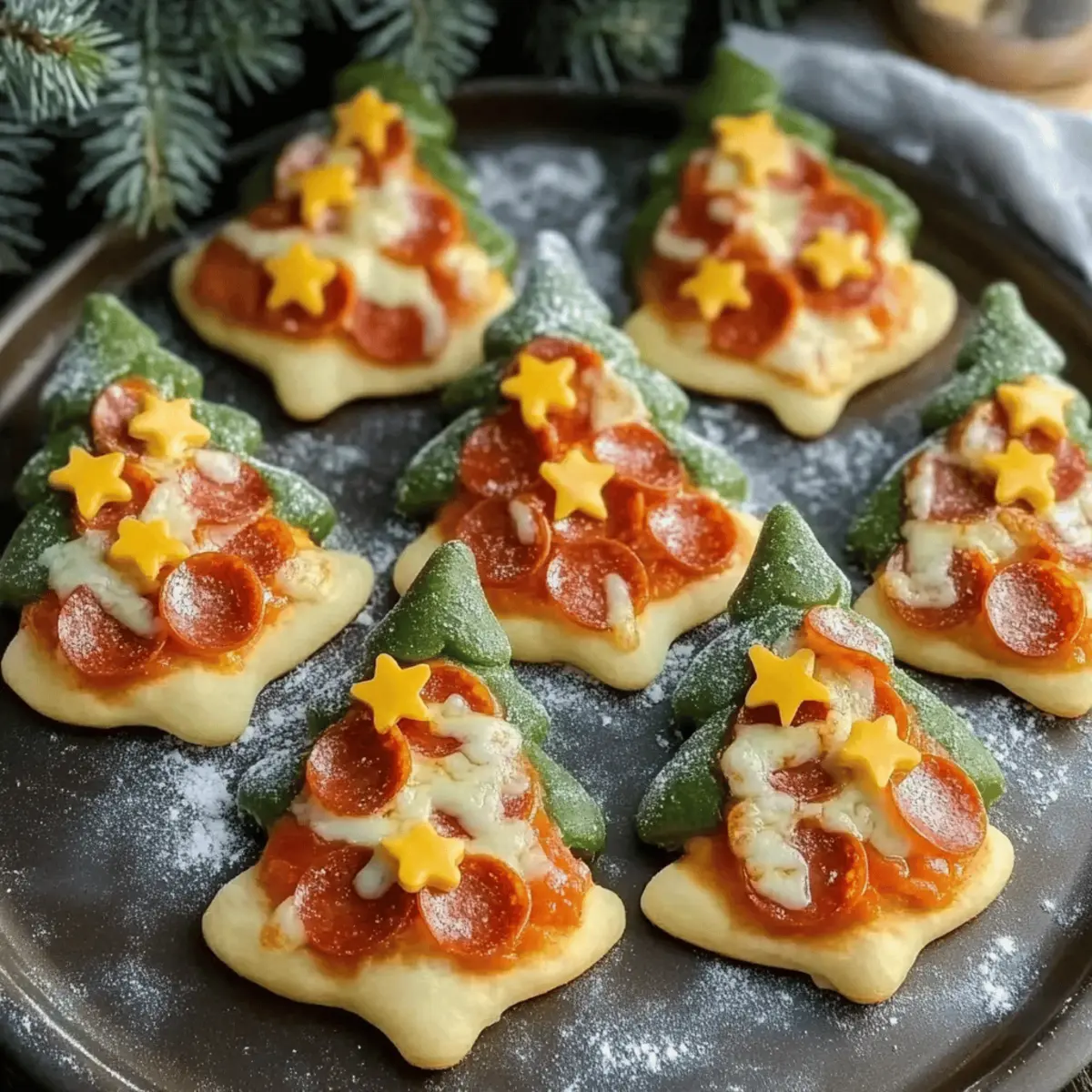 Jump to Recipe Print RecipeAs the holidays roll in, there’s something magical about transforming everyday meals into festive delights. These Christmas Tree Mini Pizzas are not just adorable; they’re a wonderful way to blend creativity with culinary joy in your kitchen. Ready in no time, this kid-friendly appetizer offers endless possibilities for customization, making it a cheerful activity for families to bond over. Imagine rolling out dough, shaping these delightful trees, and adding your favorite toppings, all while the aroma of melting mozzarella fills your home. Perfect for holiday gatherings or a cozy family dinner, these mini pizzas will surely spread warmth and smiles at your table. Curious about how to assemble your own little Christmas tree edible masterpiece? Let’s dive in! Why You’ll Love Christmas Tree Mini Pizzas Festive Fun: These whimsical mini pizzas bring the holiday spirit to life, making cooking a joyful, interactive experience for the whole family. Kid-Friendly: Perfectly shaped like Christmas trees, they’re a fantastic way to get kids excited about helping in the kitchen. Endless Customization: Explore endless topping possibilities, from colorful bell peppers to spicy jalapeños—everyone can create their dream pizza! Quick Preparation: Ready in just 20 minutes, these appetizers save time—ideal for busy holiday festivities or sudden cravings! Audience Pleaser: A delightful treat that appeals to both children and adults, ensuring smiles all around your holiday table. For another festive idea, check out our Street Corn Pasta! Christmas Tree Mini Pizza Ingredients • Get ready to create the most adorable holiday treats! For the Pizza Base Pizza Dough – The essential foundation of your mini pizzas; store-bought dough offers a quick and easy option. Tree-shaped Cookie Cutter – Helps in cutting the dough into festive tree shapes; using different shapes can add extra fun. For the Topping Pizza Sauce – The flavorful spread that keeps everything juicy and delicious; homemade or any marinara sauce works great. Shredded Mozzarella Cheese – This gooey goodness melts beautifully on top; vegan cheese is a great alternative for a dairy-free twist. Mini Pepperoni – Adds a savory element reminiscent of ornaments; feel free to swap in colorful veggies for extra holiday cheer. Step‑by‑Step Instructions for Christmas Tree Mini Pizzas Step 1: Preheat the Oven Begin by preheating your oven to 400°F (or according to the pizza dough package instructions). This is crucial for achieving that perfect golden crust on your Christmas Tree Mini Pizzas. As the oven warms up, it will create a lovely environment for melting cheese and cooking the dough to crispy perfection. Step 2: Roll Out the Dough On a lightly floured surface, roll out the pizza dough to a thickness of about 1/4 inch. Use a rolling pin to create an even layer that will easily cut into festive shapes. Make sure your workspace remains floured to prevent any sticking, ensuring that cutting out those mini trees will be a breeze! Step 3: Cut Tree Shapes Using a tree-shaped cookie cutter, carefully cut out the shapes from the rolled dough. Press firmly to ensure you have clean edges that resemble Christmas trees. Arrange these tree-shaped crusts on a parchment-lined baking sheet, leaving some space between each one to allow for rising during baking. Step 4: Spread the Sauce Once your crusts are placed on the baking sheet, grab your favorite pizza sauce. Spread a generous layer of sauce over each Christmas tree-shaped crust, covering the surface while leaving a small border for the crust. This sauce will enhance the flavor of your mini pizzas and keep them moist while baking. Step 5: Add Cheese and Toppings Sprinkle a hearty amount of shredded mozzarella cheese over the sauced crusts, allowing it to melt beautifully in the oven. Next, decorate each mini pizza with mini pepperoni pieces, placing them whimsically to resemble ornaments. Feel free to get creative with toppings, making each tree unique in your Christmas Tree Mini Pizzas lineup. Step 6: Bake to Perfection Slide the baking sheet into your preheated oven and bake the mini pizzas for 10-12 minutes. Keep an eye on them! You’ll know they’re done when the cheese is bubbling, and the crust has turned a lovely golden brown. This step is where your kitchen fills with the wonderful aroma of holiday flavors! Step 7: Cool and Serve Once baked, remove the Christmas Tree Mini Pizzas from the oven and allow them to cool slightly on the baking sheet. This brief cooling period makes handling them easier. For an extra festive touch, consider adding bell pepper stars or sliced olives on top before serving. These delightful treats are ready to be enjoyed by all! Make Ahead Options These Christmas Tree Mini Pizzas are perfect for busy home cooks looking to save time during the holiday rush! You can assemble the mini pizzas by cutting out the tree shapes, adding sauce, cheese, and toppings, then wrapping them tightly in plastic wrap and refrigerating for up to 24 hours before baking. This prep allows the flavors to meld while preventing the crust from becoming soggy. When you’re ready to serve, simply pop them in the preheated oven and bake as instructed. By preparing these festive treats in advance, you can effortlessly impress your guests with delicious, whimsical appetizers that are just as delightful as if they were made fresh! What to Serve with Christmas Tree Mini Pizzas As the holiday spirit fills the air, complement your delightful Christmas Tree Mini Pizzas with a selection of festive sides and drinks to create a memorable meal. Crispy Green Salad: A fresh, crunchy salad with mixed greens adds a vibrant contrast and balances the richness of the mini pizzas. Garlic Bread: Warm, buttery garlic bread offers a comforting, cheesy addition that pairs perfectly with the flavors of pizza sauce and melted cheese. Roasted Vegetables: Bright and colorful roasted ve