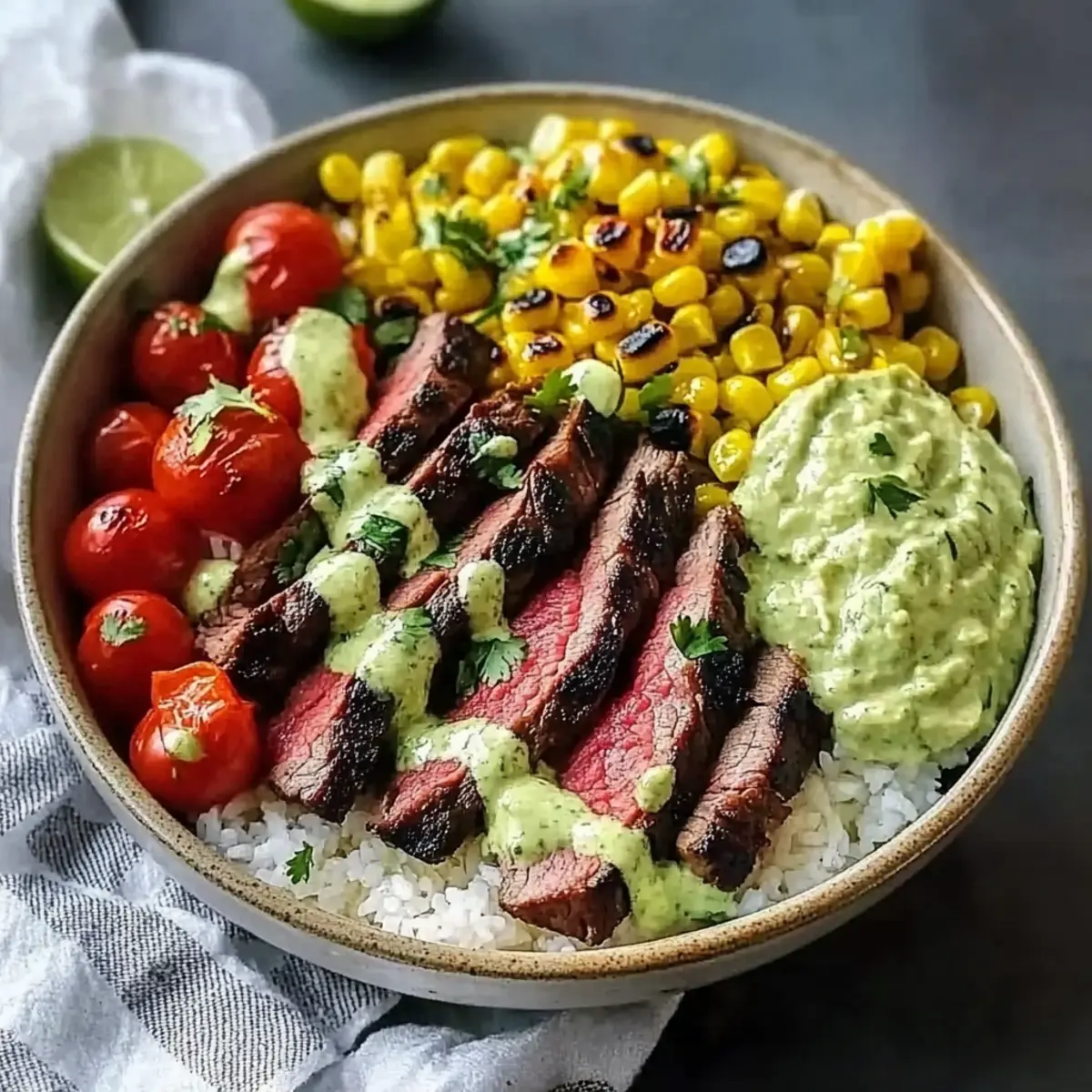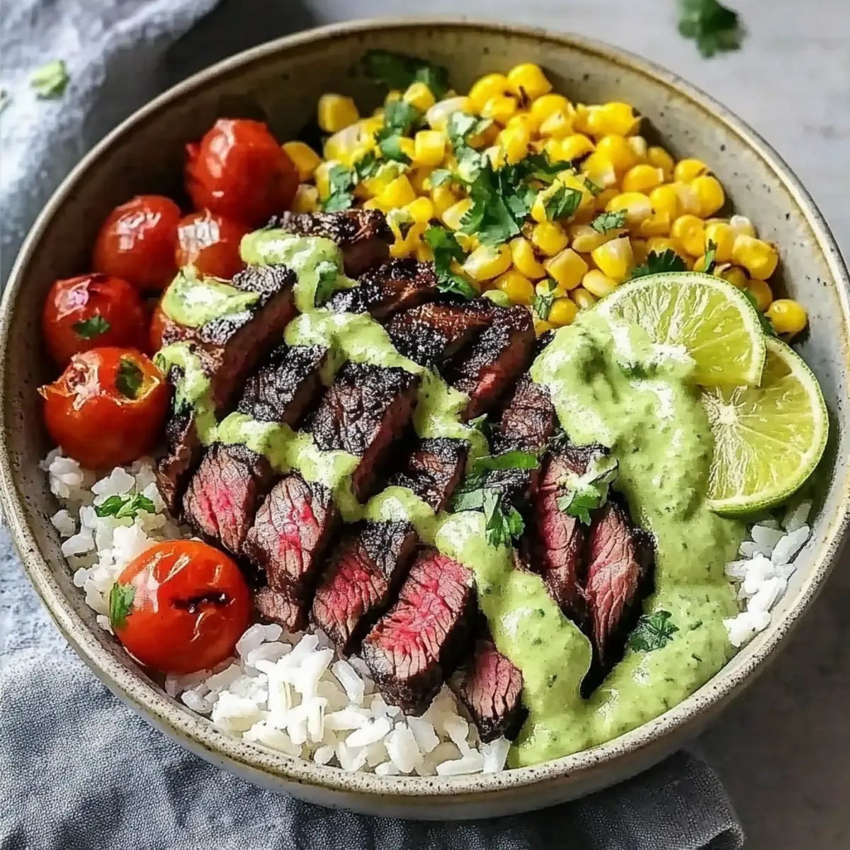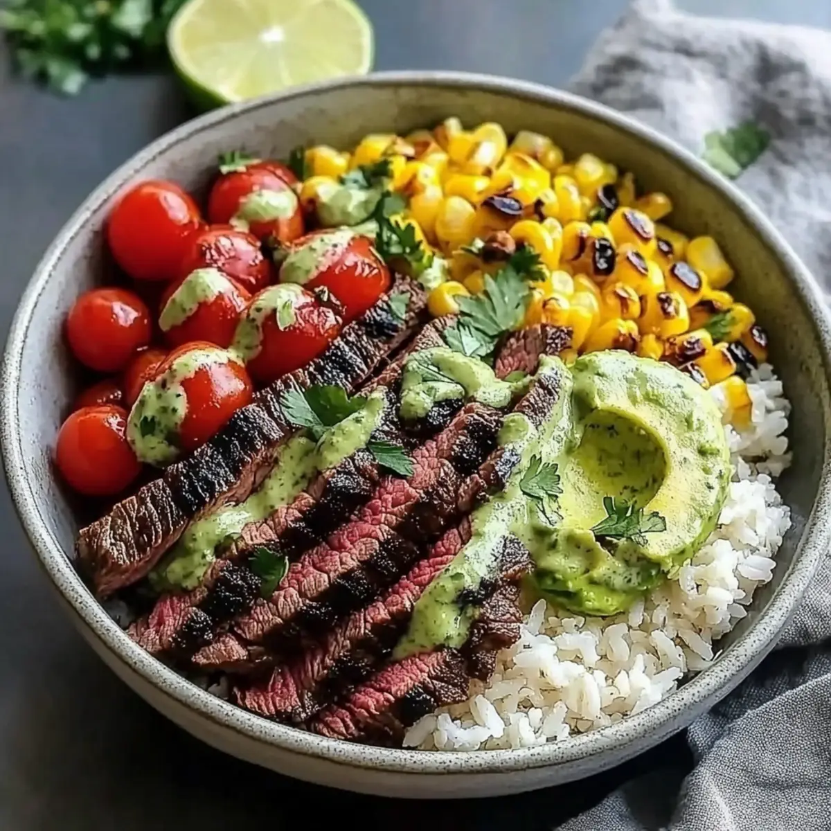 Jump to Recipe Print Recipe“Cilantro Lime Steak Bowls” make my cooking heart flutter! The vibrant colors and fresh aromas that fill my kitchen when I whip up this meal are simply irresistible. Using juicy steak marinated in a zesty cilantro and lime blend, these bowls are not only a quick dinner option but also perfect for meal prep. They’re customizable too, allowing you to adapt the ingredients to fit any dietary needs, whether you want a gluten-free or low-carb twist. Picture yourself delighting in each bite—tender steak layered over fluffy rice and nutritious beans, topped with colorful veggies. If that doesn’t tickle your taste buds, I don’t know what will! Ready to dive into this delicious adventure? Why Are Cilantro Lime Steak Bowls So Great? Bright Flavors: Each bite explodes with zesty lime and aromatic cilantro, creating a refreshing taste that’s hard to resist. Quick & Easy: With minimal prep time, you can whip up this meal in under 30 minutes—a perfect solution for busy weeknights. Customizable: Swap steak for chicken or tofu, and switch up the toppings to suit your preferences—this dish adapts beautifully to any diet! Meal Prep Friendly: Prepare ingredients ahead of time and store them separately, making week-long healthy meals a breeze. Crowd-Pleaser: Whether it’s a weekday dinner or a gathering with friends, these bowls cater to everyone’s tastes, making meal times fun and vibrant! For a taste of something equally flavorful, try my Sriracha Salmon Bowls or delve into a classic Salisbury Steak for a comforting twist! Cilantro Lime Steak Bowls Ingredients For the Steak Marinade Flank Steak – the star protein of this dish, marinated to enhance flavor; feel free to substitute with skirt or sirloin. Fresh Lime Juice – this brightens the marinade and infuses a zesty kick; fresh is best, but bottled works in a pinch. Olive Oil – crucial for emulsifying the marinade and keeping the steak moist; no substitutes needed for flavor. Fresh Cilantro – the key herb providing a fresh aromatic finish; omit if you’re not a fan of its flavor. Garlic – adds aromatic depth; minced garlic delivers the best results. Ground Cumin – this spice adds warmth and richness; adjust to taste for preferred earthiness. Chili Powder – a gentle kick of spice that enhances the overall dish; feel free to tweak the amount for personal preference. Salt – balancing flavor enhances the overall taste; season according to your taste buds. Black Pepper – freshly ground is ideal for a flavor boost; adjust for spiciness. For the Bowl Base Cooked Rice (White or Brown) – the hearty base for the bowl; cook as per package instructions or substitute with quinoa or cauliflower rice for a low-carb option. Black Beans – packed with protein and fiber; rinse and drain well before adding. Corn (Fresh, Frozen, or Canned) – adds sweetness and texture; use what’s most convenient—fresh should be briefly cooked. For the Fresh Toppings Cherry Tomatoes – these provide a burst of sweetness; swap for regular diced tomatoes if needed. Avocado – offers a creamy texture; guacamole is a great substitute if you want something different. Red Onion – adds a sharp crunch; green onions can be used for a milder option. Feta Cheese (optional) – salty creaminess is a delicious addition; goat cheese works too or omit for dairy-free bowls. Extra Cilantro and Lime Wedges – for garnish and that pop of flavor at serving. Every ingredient brings a distinct flavor to your Cilantro Lime Steak Bowls, allowing you to create a meal that’s not only delicious but also tailored to your preferences! Step‑by‑Step Instructions for Cilantro Lime Steak Bowls Step 1: Marinate the Steak In a medium bowl, combine fresh lime juice, olive oil, chopped cilantro, minced garlic, ground cumin, chili powder, salt, and black pepper. Add the flank steak, ensuring it is fully coated with the marinade. Cover the bowl with plastic wrap and refrigerate for at least 30 minutes, allowing the flavors to meld for an even juicier Cilantro Lime Steak Bowl. Step 2: Prepare Rice and Beans While the steak marinates, cook the rice according to package instructions, using either white or brown rice for the base. In a small saucepan, heat the black beans over medium heat for about 5 minutes until warmed through, stirring occasionally. Set both the rice and beans aside until you’re ready to assemble your bowls. Step 3: Cook the Corn Next, prepare the corn by bringing a pot of water to a boil if using fresh corn; cook the corn cobs for about 3–4 minutes until tender. If using frozen corn, heat it according to package instructions until warm. Drain any excess water, and then set the corn aside. The bright sweetness of the corn will complement the fresh flavors of your Cilantro Lime Steak Bowls beautifully. Step 4: Cook the Steak Preheat a grill or grill pan to medium-high heat. Remove the steak from the marinade and discard the excess liquid. Grill the steak for approximately 4-5 minutes per side for medium-rare, aiming for an internal temperature of 130°F. Once cooked, let the steak rest for 5–10 minutes; this helps retain the juices. Slice against the grain for maximum tenderness before placing it atop your bowls. Step 5: Assemble the Bowls To create your Cilantro Lime Steak Bowls, divide the cooked rice evenly among serving bowls. Top each bowl with a generous scoop of black beans, cooked corn, halved cherry tomatoes, and sliced avocado. Add in the sliced steak, sprinkle with red onion, and crumble feta cheese if using. Garnish with extra cilantro and lime wedges for that finishing touch, making each bowl a vibrant feast! What to Serve with Cilantro Lime Steak Bowls Imagine a table brimming with vibrant flavors and textures, perfectly complementing your zesty steak bowls. Crispy Tortilla Chips: Their crunch adds an enjoyable texture contrast, perfect for scooping up any leftover toppings. Fresh Green Salad: A light salad wi
