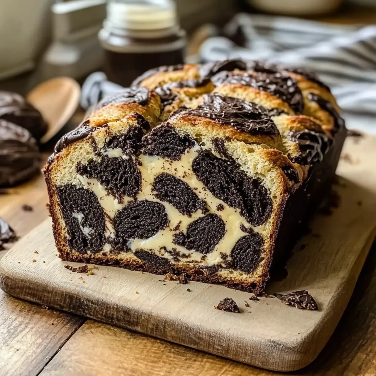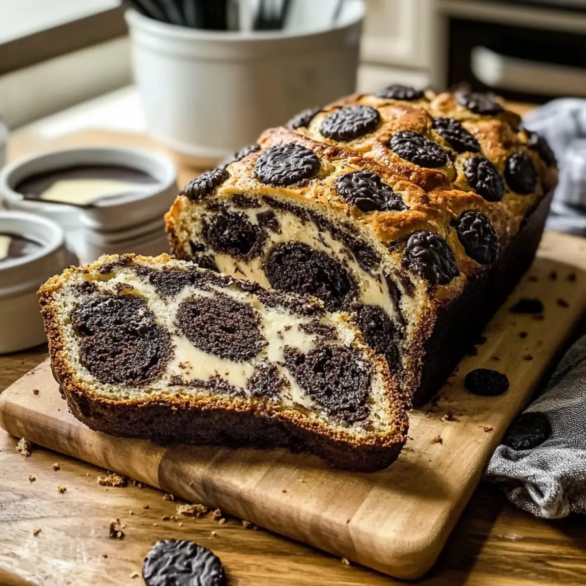 Jump to Recipe Print RecipeIn a cozy corner of my kitchen, the aroma of baking bread dances through the air, stirring memories of childhood delights. Today, I’m thrilled to share my take on a beloved comfort food: Cookies and Cream Sourdough Bread. This artisan loaf combines the tangy essence of traditional sourdough with the nostalgic flavors of cherished cookies. Not only does this recipe serve as a clever way to utilize leftover sourdough discard, it also offers a quick prep time that allows for indulgence without the wait. With rich chocolate swirls and melty cream cheese pockets, each slice is a delightful treat that will have your family and friends asking for more. Curious about how to create this dreamy, sweet loaf that effortlessly merges two classic treats? Let’s dive into the delicious details! Why is this Sourdough Bread a Must-Try? Deliciously Unique: This Cookies and Cream Sourdough Bread offers a delightful twist on a traditional favorite, combining artisan craftsmanship with iconic cookie flavors. Quick and Easy: With a streamlined prep process, you can whip up this indulgent loaf without the usual long rise times! Crowd-Pleasing Appeal: Its rich chocolate swirls and creamy pockets make it an irresistible treat for all ages, perfect for family dinners or casual get-togethers. Perfect for Leftovers: Utilizing sourdough discard not only minimizes waste but elevates your baking game. Versatile Uses: Savor it on its own, with a smear of butter, or as part of a dessert spread alongside recipes like Blueberry Cream Cake and Blackberry Cream Cheese for a truly decadent experience! Cookies and Cream Sourdough Bread Ingredients For the Dough Bread Flour – Provides structure and chewiness; use high-protein bread flour for best results. Water – Hydrates flour, aiding gluten formation; ensure it’s at room temperature. Active Sourdough Starter – Introduces natural yeast and flavor; essential for fermentation. Salt – Enhances flavor and strengthens gluten; do not omit to maintain dough integrity. For the Filler Oreo Cookies – Adds sweetness and chocolatey bursts; can substitute with any chocolate sandwich cookie. Cream Cheese – Contributes creaminess and richness; ensure it’s softened for easy incorporation into the dough. Enjoy baking this delightful Cookies and Cream Sourdough Bread that’s sure to charm your taste buds! Step‑by‑Step Instructions for Cookies and Cream Sourdough Bread Step 1: Mix Dough In a large mixing bowl, combine the bread flour and water, stirring until fully combined. Allow the mixture to rest for 30-45 minutes; this autolyse phase helps develop the gluten. The dough should feel slightly sticky and elastic as you mix, setting the stage for a beautiful Cookies and Cream Sourdough Bread. Step 2: Add Starter and Salt After the resting period, incorporate the active sourdough starter and salt into the dough, mixing thoroughly until they are well distributed. Cover the bowl and let the dough rest for another 30 minutes. The dough will begin to rise slightly and become more cohesive, showcasing your effort in preparing this delightful loaf. Step 3: Stretch and Fold Perform a series of stretch and folds every 30 minutes for 2 hours. Gently grab one side of the dough, stretch it upwards, and fold it over itself. Turn the bowl a quarter turn and repeat until you’ve stretched and folded all sides. This technique builds gluten strength, which is crucial for the structure of your Cookies and Cream Sourdough Bread. Step 4: Laminate with Cookies and Cream Cheese After your second round of folds, it’s time to laminate! Gently stretch the dough into a large rectangle on a lightly floured surface. Evenly sprinkle crushed Oreo cookies and dollops of softened cream cheese across the surface, then fold the dough as if enveloping a letter. This creates tempting pockets of flavor throughout the loaf. Step 5: Bulk Ferment Transfer the dough back to the bowl and let it bulk ferment at room temperature for 4-5 hours. It should become noticeably puffy and increase in volume, indicating that fermentation is happening. Keep an eye on it; the dough should roughly double in size, showcasing the power of your active sourdough starter. Step 6: Shape and Refrigerate Once bulk fermentation is complete, gently shape the dough into a tight boule on a lightly floured surface. Place the seam-side up in a floured banneton, ensuring a good coat of flour to prevent sticking. Refrigerate it for 8-12 hours for a cold fermentation, which deepens the flavor and enhances the texture of your Cookies and Cream Sourdough Bread. Step 7: Preheat Oven About 30 minutes before baking, preheat your Dutch oven to 250°C (480°F). This high temperature is essential for achieving that gorgeous crust and ideal oven spring during the initial baking phase. Ensure your oven is well heated to maximize the rise of your artisan loaf. Step 8: Bake Once preheated, carefully transfer your dough onto a piece of parchment paper. Score the top with a sharp knife to allow for expansion. Place the dough into the Dutch oven, cover it, and bake for 20 minutes. Uncover the pot and bake for an additional 20-25 minutes until the crust turns a deep golden brown, and the loaf sounds hollow when tapped. Step 9: Cool Allow your Cookies and Cream Sourdough Bread to cool completely on a wire rack before slicing. This step is crucial, as it helps set the crumb and prevents the bread from becoming gummy. Once cool, marvel at the beautiful swirls and enjoy every slice of your delicious creation! Expert Tips for Cookies and Cream Sourdough Bread Even Distribution: Always sprinkle cookies evenly throughout the dough. This prevents clumping and ensures beautiful marbling in every slice of your cookies and cream sourdough bread. Gentle Handling: When folding dough, be gentle; rough handling can cause the cookie structure to break down. Aim for a soft touch to maintain those tasty pockets of flavor. Time Management: Don’t