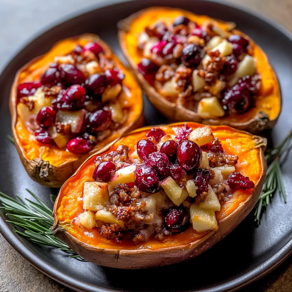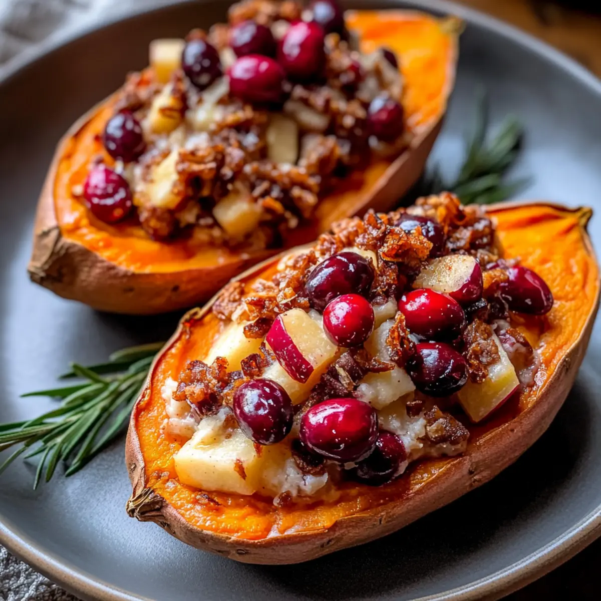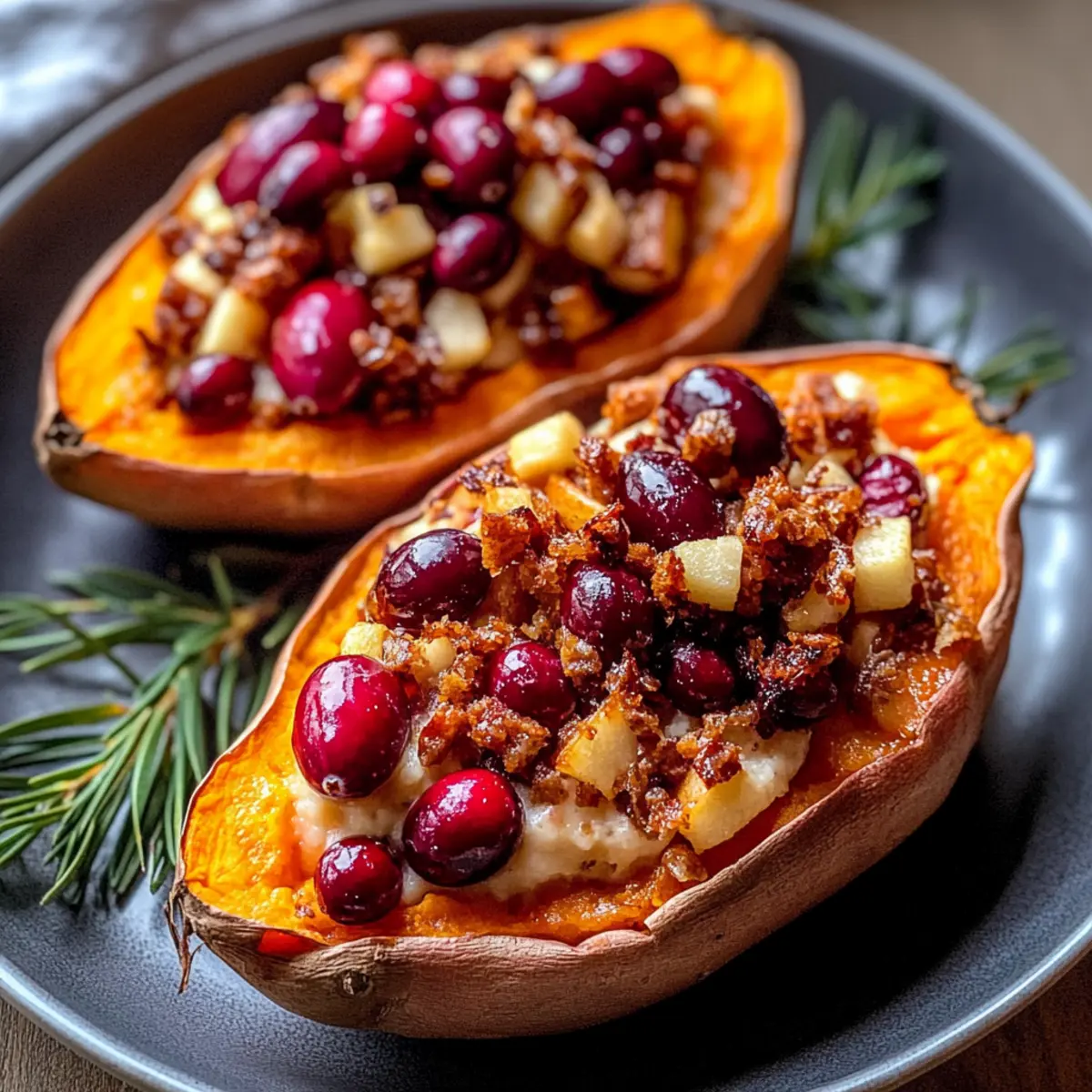 Jump to Recipe Print RecipeAs I pulled the sweet potatoes from the oven, the smell was nothing short of magical. The combination of warmly roasted sweet potatoes mingling with the tart cranberries and sweet apples created an inviting aroma that beckoned everyone to the kitchen. My Cranberry Apple Twice-Baked Sweet Potatoes not only bring a festive flair to the table but are also incredibly satisfying—making them a versatile side dish perfect for any holiday feast. They are not only gluten-free but also easy to adapt for vegan diets, ensuring everyone at your gathering can enjoy them. With their creamy, rich filling and crisp skins, these sweet potatoes are a warm embrace on chilly nights. How could anyone resist taking a forkful of this comforting delight? Let’s dive in and create this unforgettable dish together! Why Are These Sweet Potatoes Irresistible? Comforting Warmth: These Cranberry Apple Twice-Baked Sweet Potatoes are more than just a side dish; they are a hug on a plate! The balance of flavors between the sweet potatoes, tart cranberries, and crunchy apples creates an unforgettable taste experience that’ll have your guests coming back for seconds. Crowd-Pleasing: Perfect for Thanksgiving and other festive gatherings, this dish enchants everyone—vegetarians and meat-eaters alike. Easy to Customize: Enjoy experimenting with nut alternatives or making this dish vegan-friendly by swapping in coconut oil and plant-based milk. Unique Presentation: The twice-baked method gives a delightful crispness to the skin while the creamy filling bursts with flavor. Quick Prep Time: Despite its impressive appearance, making these sweet potatoes is simple and efficient, allowing you more time to enjoy with loved ones. With this delicious recipe, you won’t just serve a dish; you’ll create cherished memories! Cranberry Apple Twice-Baked Sweet Potatoes Ingredients For the Sweet Potatoes • Sweet Potatoes – The soul of this dish, providing creamy sweetness when baked. • Brown Sugar – Enhances natural sweetness and caramelizes the filling beautifully. • Butter – Adds richness; replace with coconut oil for a vegan option. • Milk – Lightens the mash; swap for any non-dairy milk for a vegan twist. • Salt – Balances the sweetness and elevates the overall flavor. For the Fruit Compote • Cranberries – Fresh cranberries provide a delightful tartness; canned versions may require less sugar. • Apple – Finely chopped for texture; Granny Smith is great for balancing sweetness. • Cinnamon & Nutmeg – These warm spices amplify the autumn flavors without being overpowering. • Vanilla Extract – Introduces depth to the sweet potato filling; perfectly complements the fruits. For the Topping • Pecans – Add a crunchy texture; walnuts work as a great substitute or omit for nut allergies. • Honey/Maple Syrup (optional) – Drizzle on top before serving for an extra touch of gloss and sweetness. Get ready to experience the irresistible taste of these Cranberry Apple Twice-Baked Sweet Potatoes; they’ll surely be a crowd-pleaser at your next festive gathering! Step‑by‑Step Instructions for Cranberry Apple Twice-Baked Sweet Potatoes Step 1: Preheat and Prepare Begin by preheating your oven to 400°F (200°C). While the oven heats, wash three medium sweet potatoes thoroughly under running water. Pierce each sweet potato multiple times with a fork to allow steam to escape during baking. Place them on a foil-lined baking sheet to catch any drips and ensure easy cleanup. Step 2: Bake Sweet Potatoes Bake the sweet potatoes in the preheated oven for 45-60 minutes, until they are tender and easily pierced with a fork. You’ll know they’re ready when the skin is slightly wrinkled and the flesh feels soft. Once baked, remove them from the oven and allow them to cool for about 10 minutes before handling. Step 3: Make the Fruit Compote While the sweet potatoes cool, prepare the cranberry-apple compote. In a medium saucepan over medium heat, combine 1 cup of fresh cranberries, 1 finely chopped apple, 1/4 cup of brown sugar, and 1/2 cup of water. Cook for approximately 10 minutes, stirring occasionally until the cranberries burst and the mixture becomes syrupy. Once done, set it aside to cool. Step 4: Hollow the Sweet Potatoes Reduce the oven temperature to 350°F (175°C). Carefully slice each sweet potato in half lengthwise. Using a spoon, scoop out most of the sweet potato flesh into a mixing bowl, leaving a thin layer inside each skin to maintain its shape. Try to avoid tearing the skin, as it will hold the filling. Step 5: Mash the Filling To the bowl with the sweet potato flesh, add the remaining 1/4 cup of brown sugar, 2 tablespoons of melted butter, 1/4 cup of milk, 1/2 teaspoon of cinnamon, 1/4 teaspoon of nutmeg, and a pinch of salt. Mash the mixture until it’s smooth and creamy, ensuring all ingredients are well combined for a delightful filling for your Cranberry Apple Twice-Baked Sweet Potatoes. Step 6: Combine and Fill Gently fold the cooled cranberry-apple compote and 1/4 cup of chopped pecans into the sweet potato mixture. This will add delightful flavor and texture to your filling. Spoon the filling back into each sweet potato skin, mounding it slightly for an appealing presentation. Step 7: Bake Again Place the filled sweet potatoes back onto the baking sheet. Bake in the oven at 350°F (175°C) for an additional 20-25 minutes. You want the tops to become golden brown and the filling to heat through. Keep an eye on them to ensure they don’t overcook, and enjoy the wonderful aromas filling your kitchen. Step 8: Serve and Enjoy Once baked, remove the Cranberry Apple Twice-Baked Sweet Potatoes from the oven and let them cool for a few minutes. If desired, drizzle with honey or maple syrup for a touch of sweetness before serving. These delightful sweet potatoes are now ready to grace your holiday table! What to Serve with Cranberry Apple Twice-Baked Sweet Potat