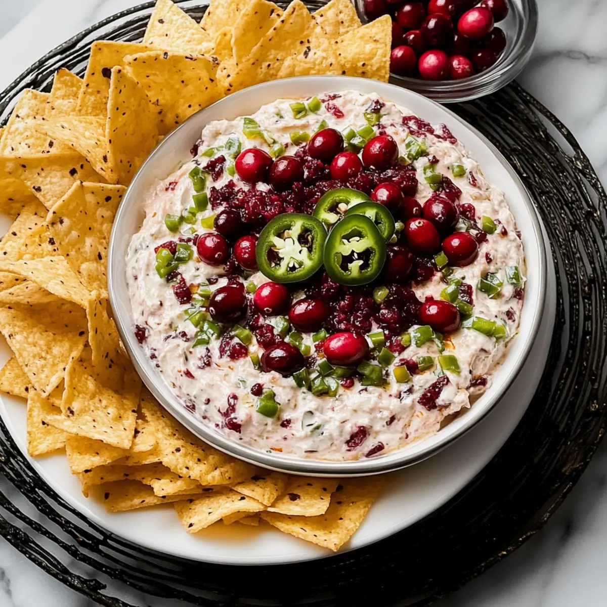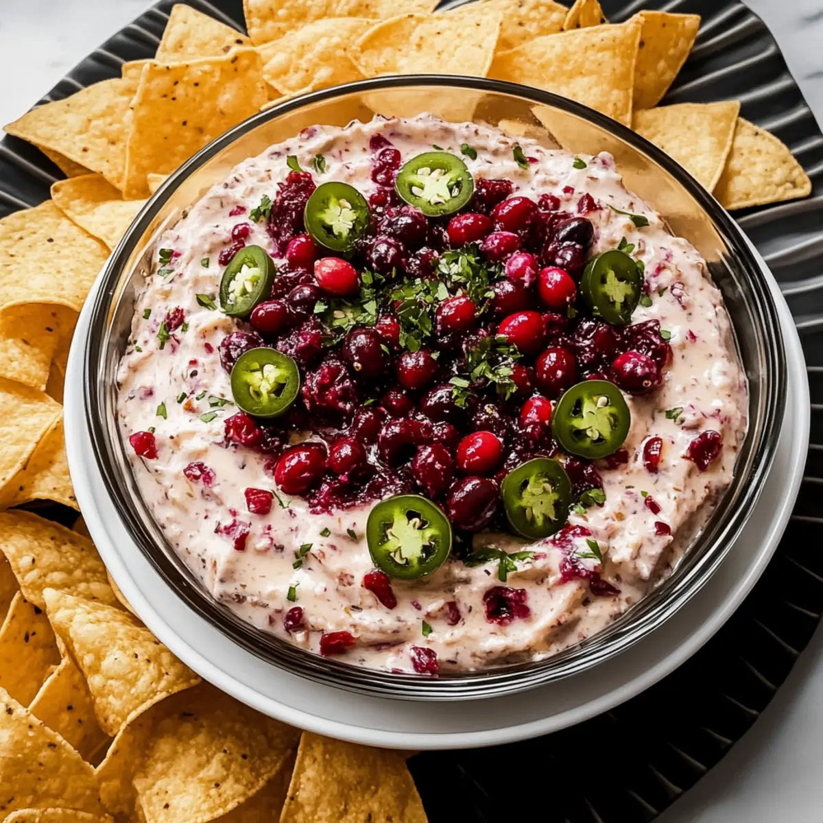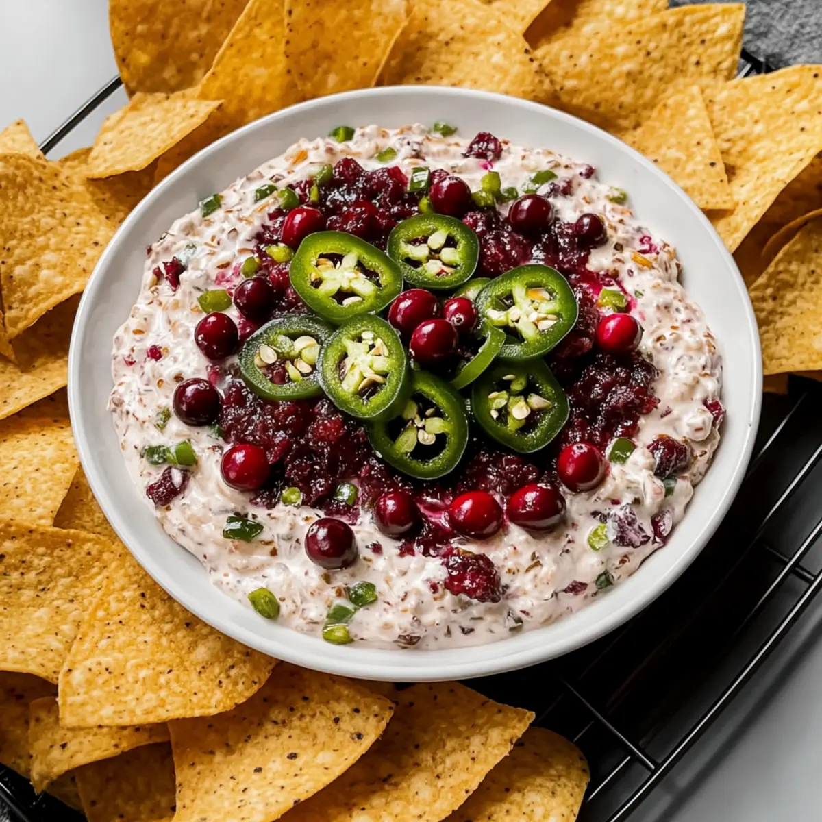 Jump to Recipe Print RecipeThe other day, at a small gathering, I overheard someone exclaim, “Who brought this dip? It’s incredible!” That’s the magic of the Cranberry Jalapeño Dip—it’s a showstopper that transforms any occasion. With its vibrant colors and a delicious blend of sweet and spicy flavors, this creamy dip is not just an appetizer; it’s a conversation starter that keeps everyone coming back for more. What I love most is how quick and easy it is to whip up—just 10 minutes of prep! Plus, it’s make-ahead friendly, so you can enjoy your time with friends instead of being tied to the kitchen. Whether you’re hosting a holiday feast or just craving a tasty snack, this dip is sure to brighten your table. Ready to impress your guests with a fun twist? Let’s dive into this delightful recipe! Why is Cranberry Jalapeño Dip a Must-Try? Vibrant Colors: The stunning contrast of bright reds and greens makes this dip a feast for the eyes, perfect for festive gatherings. Quick & Easy: With just 10 minutes of prep, you can impress your guests without spending hours in the kitchen. Customizable: Adjust the sweetness or heat to suit every palate—whether you prefer it mild or fiery, you can create a version that delights you. Crowd-Pleaser: Its unique flavor profile is sure to spark conversation, making it a hit at any gathering. Make-Ahead Friendly: Prepare this delicious dip a day in advance, so you can enjoy more time with loved ones. This Cranberry Jalapeño Dip is not just an appetizer; it’s an experience that will leave everyone asking for the recipe! Cranberry Jalapeño Dip Ingredients For the Dip • Fresh Cranberries – Adds a tartness and vibrant color; substitute with thawed frozen cranberries if needed. • Jalapeños – Provides moderate heat and brightness; swap with serrano peppers for extra spice or bell peppers for a milder taste. • Granulated Sugar – Balances the tartness of cranberries; honey or agave syrup work as alternative sweeteners. • Cream Cheese – Creates a creamy base; for a lighter option, feel free to use Neufchâtel cheese. • Green Onions – Adds a mild onion flavor; can be substituted with chopped red onion or shallots for a different twist. • Cilantro – Offers fresh herbal notes; replace with flat-leaf parsley for a subtler taste. • Lime Juice – Enhances flavor with acidity; lemon juice is a great alternative in a pinch. Step‑by‑Step Instructions for Cranberry Jalapeño Dip Step 1: Prepare the Cranberries Begin by placing fresh cranberries into a food processor. Pulse them until they are coarsely chopped, resembling a chunky mixture. This should take about 20–30 seconds. You want to see colorful bits, not a puree. Scrape down the sides as needed, ensuring even chopping for your vibrant Cranberry Jalapeño Dip. Step 2: Add the Peppers and Onions Next, add diced jalapeños, chopped green onions, cilantro, and lime juice into the food processor with the cranberries. Pulse again until everything is well combined, but still chunky. This blending will take about 15–20 seconds, and you should see scattered flecks of green among the red cranberries, bringing that sweet and spicy flavor profile to life. Step 3: Mix the Cream Cheese and Sugar In a separate mixing bowl, take softened cream cheese and granulated sugar. Using a hand mixer or spatula, combine them until the mixture is smooth and creamy, about 2 minutes. Make sure there are no lumps for a luscious texture in your Cranberry Jalapeño Dip. This will form the rich base of your dip. Step 4: Combine the Mixtures Gently fold the cranberry mixture into the cream cheese blend using a spatula. Stir until just combined, being careful not to overmix, as you still want some texture from the cranberries and jalapeños. This should take 1–2 minutes; aim for a marbled effect that maintains the visible ingredients for an appealing dish. Step 5: Chill and Serve Transfer your completed dip into a serving bowl. Cover it tightly with plastic wrap and refrigerate for at least 1 hour to let the flavors meld beautifully. Once chilled, the dip will thicken slightly and be ready to serve. Enjoy it with your favorite crackers or chips for a delightful snack. How to Store and Freeze Cranberry Jalapeño Dip Fridge: Store in an airtight container for up to 3 days. Make sure it’s fully chilled before sealing to retain freshness. Freezer: You can freeze the dip for up to 1 month. Just ensure it’s in a freezer-safe container. Thaw in the fridge overnight before serving. Reheating: If desired, gently microwave for a few seconds to soften before serving, but enjoy it cold for the best texture and flavor. Make-Ahead: This Cranberry Jalapeño Dip can be prepared a day in advance, making it a convenient option for gatherings! Make Ahead Options These Cranberry Jalapeño Dip ingredients are perfect for meal prep enthusiasts! You can chop the cranberries, jalapeños, green onions, cilantro, and mix them with lime juice up to 24 hours in advance, allowing the flavors to meld beautifully without losing their vibrant taste or texture. Just refrigerate the chopped mixture in an airtight container until you’re ready to finish the dip. When you’re set to serve, simply combine the prepped mix with softened cream cheese and sugar, fold until just blended, and chill for at least 1 hour before serving. This way, you can enjoy a quick and delightful appetizer while saving valuable time on busy weeknights! What to Serve with Cranberry Jalapeño Dip Pair this vibrant dip with an array of delicious options that will elevate your meal and create a memorable experience. Crunchy Tortilla Chips: Their sturdiness holds up well against the creamy dip, adding a satisfying crunch to each bite. Fresh Veggie Sticks: Carrot, celery, and cucumber sticks provide a refreshing contrast, introducing crisp textures alongside creamy richness. Assorted Crackers: A variety of flavors and textures enhance the enjoyment,