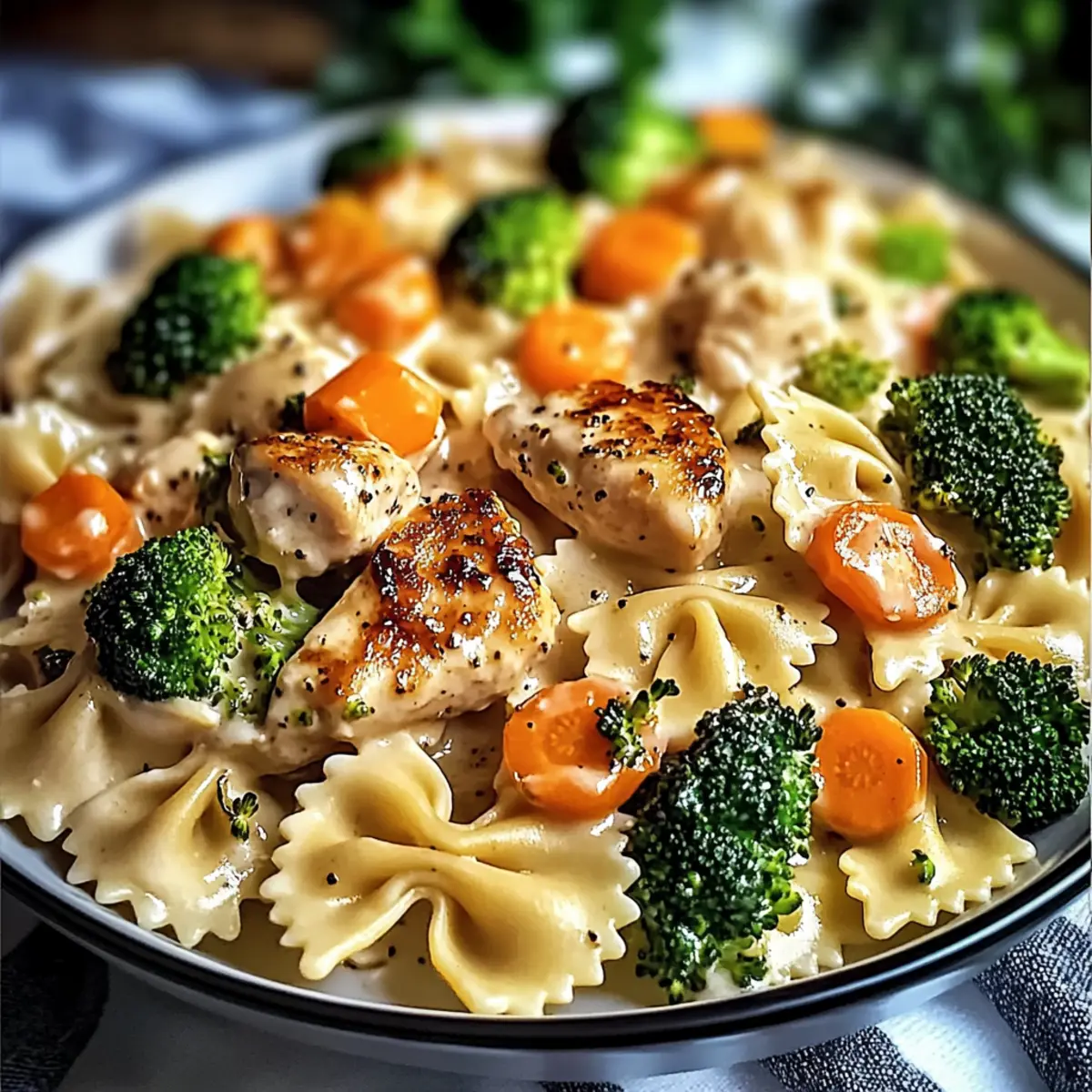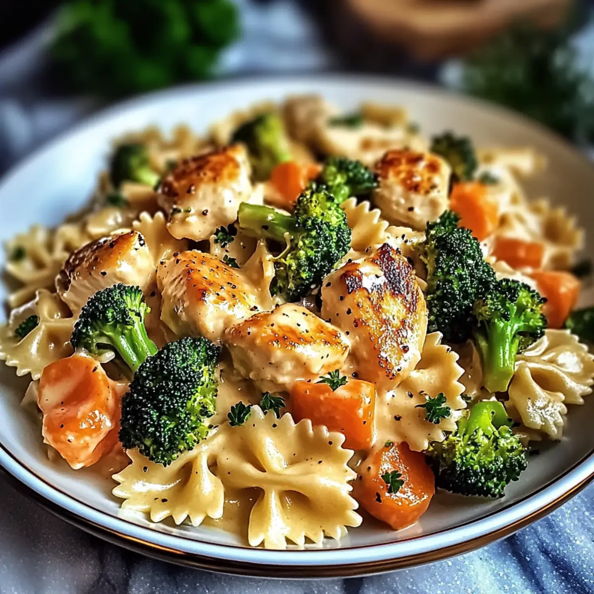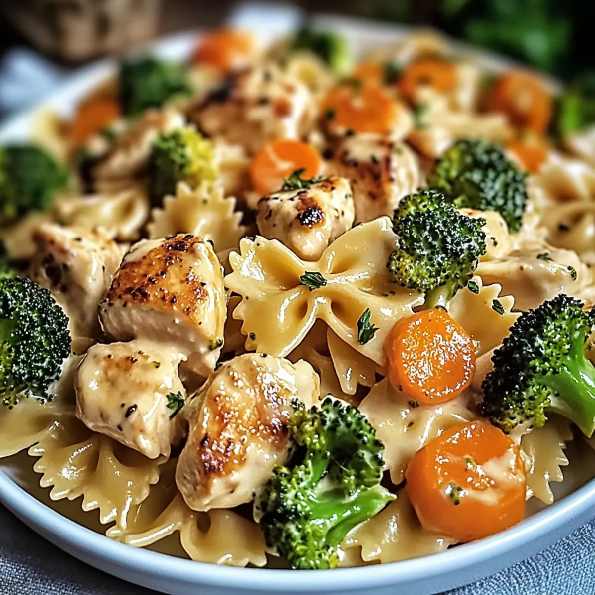 Jump to Recipe Print RecipeThe aroma of roasted veggies wafting from the oven instantly transports me to cozy family dinners, where laughter and warmth abound. Today, I’m excited to share my Creamy Cheddar & Havarti Chicken Bowtie Pasta with Roasted Veggies, a dish that melds a creamy, cheesy sauce with the vibrant flavors of perfectly roasted broccoli and carrots. This recipe is not only quick to whip up—taking less than 30 minutes—but it’s also a crowd-pleaser that will leave your loved ones begging for seconds. Plus, with its easy-to-customize options, you can tailor it to fit any dietary preference, including a delicious vegetarian version with tofu or chickpeas. So, are you ready to transform your weeknight dinners into something truly special? Let’s dive in! Why is This Pasta Recipe a Winner? Quick Preparation: This creamy dish comes together in under 30 minutes, perfect for busy weeknights. Crowd-Pleasing: Family-friendly flavors will have everyone asking for seconds, making it ideal for gatherings. Versatile Options: Easily swap chicken for tofu or chickpeas for a vegetarian-friendly meal. Cheesy Goodness: With Cheddar and Havarti, every bite is a delightful blend of richness and creaminess. Packed with Veggies: Roasted broccoli and carrots not only brighten up the plate but also add nutrition to each serving. Elevate your dinner game with this recipe while contemplating sides like Street Corn Pasta or a simple green salad for a complete meal. Creamy Cheddar & Havarti Chicken Bowtie Pasta Ingredients For the Pasta Bowtie Pasta – Holds the creamy sauce well; substitute with penne or rotini if desired. For the Protein Boneless, Skinless Chicken Breasts – The main protein source, tenderizes beautifully; swap with tofu or chickpeas for a vegetarian option. For the Flavor Base Chicken Broth – Adds rich flavor to the pasta; replace with vegetable broth for a vegetarian version. Italian Seasoning – Provides aromatic herby depth. For the Veggies Broccoli Florets – Brightens the dish with color and nutrition; fresh is best for texture. Carrots – Adds natural sweetness; thinly sliced for even roasting. Garlic – Elevates flavor; using fresh is recommended for best results. For the Sauce Heavy Cream – Creates a luscious, creamy sauce; substitute with half-and-half or a mix of Greek yogurt and milk for a lighter version. Shredded Sharp Cheddar Cheese – Rich flavor that melts well; freshly shredded is preferred for optimal texture. Shredded Havarti Cheese – Adds smooth creaminess; feel free to experiment with Gouda or Fontina for a twist. For Cooking Olive Oil – Essential for roasting and sautéing, enhancing flavors; vegetable oil can be used as a substitute. Salt & Freshly Ground Black Pepper – Essential seasonings to bring the dish together. For Garnish Fresh Parsley – A vibrant garnish adding color and a hint of freshness. Every element of this Creamy Cheddar & Havarti Chicken Bowtie Pasta speaks to home-cooked goodness, and your family will love the comforting taste and delightful textures! Step‑by‑Step Instructions for Creamy Cheddar & Havarti Chicken Bowtie Pasta with Roasted Veggies Step 1: Preheat the Oven Begin by preheating your oven to 425°F (220°C). This temperature is perfect for roasting the veggies, ensuring they turn tender and caramelized. While the oven heats up, prepare your baking sheet by lining it with parchment paper for easy cleanup later. Step 2: Roast Vegetables In a mixing bowl, toss your fresh broccoli florets and thinly sliced carrots with olive oil, salt, and pepper. Spread the seasoned vegetables evenly onto the prepared baking sheet. Roast the veggies for 15-20 minutes, or until they are golden and tender, stirring halfway through to ensure even cooking. Step 3: Cook the Pasta In a large pot, bring chicken broth to a rolling boil over medium-high heat. Add in your bowtie pasta and cook for 10-12 minutes, stirring occasionally, until it reaches al dente perfection. Remember to reserve 1 cup of the pasta water, as it will help adjust the sauce later on. Step 4: Cook the Chicken While the pasta cooks, heat a large skillet over medium-high heat and add a splash of olive oil. Season your boneless, skinless chicken breasts with salt and pepper, then add them to the skillet. Cook for 6-7 minutes on each side until they are golden brown and cooked through. Afterward, remove the chicken from the skillet and let it rest. Step 5: Build the Sauce In the same skillet used for the chicken, lower the heat to medium and add minced garlic. Sauté for about 1 minute until fragrant, then pour in the heavy cream. Gradually whisk in the shredded Cheddar and Havarti cheese, mixing until melted and smooth. If the sauce seems too thick, stir in some reserved pasta water until you achieve your desired consistency. Step 6: Combine Ingredients Once the cheese sauce is velvety, it’s time to bring everything together. Add the cooked pasta, roasted vegetables, and sliced chicken into the skillet. Toss gently until every ingredient is beautifully coated in that creamy sauce, ensuring all the flavors meld together. Taste and adjust seasoning as needed. Step 7: Serve and Garnish Spoon the Creamy Cheddar & Havarti Chicken Bowtie Pasta onto serving plates while it’s warm. Finish with a sprinkle of freshly chopped parsley for a pop of color and freshness. For an extra cheesy treat, add a little more shredded cheddar on top. Enjoy the delightful blend of creamy, cheesy goodness! What to Serve with Creamy Cheddar & Havarti Chicken Bowtie Pasta with Roasted Veggies Unlock the full potential of your family dinner with these delightful side offerings that complement every bite of creamy goodness. Garlic Bread: Perfect for sopping up every last bit of that cheesy sauce, adding a crunchy texture to your meal. It’s a classic for a reason! Simple Green Salad: A fresh mix of greens, cucumber, and a light vinaigrette provides a refreshing contrast to the cream
