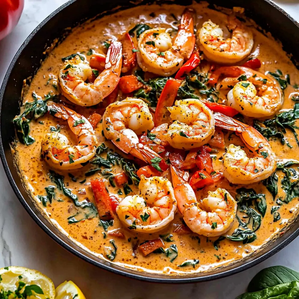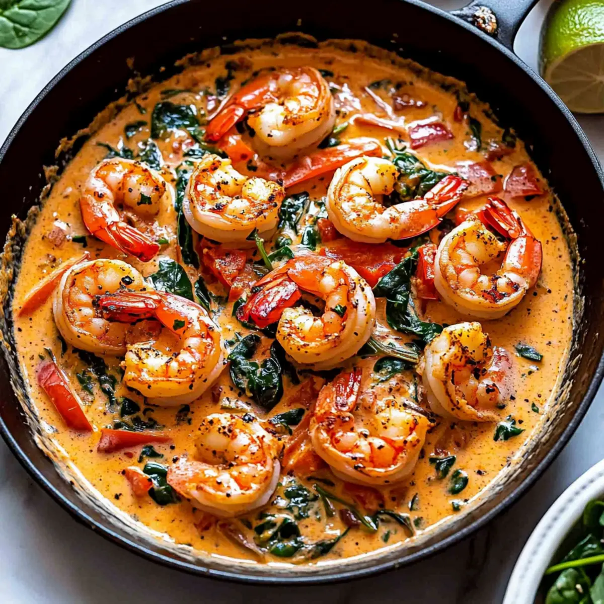 Jump to Recipe Print RecipeAs the golden sun begins to set, there’s something magical about the kitchen filled with the warm aroma of sizzling garlic and smoky paprika. That’s exactly what I experienced while whipping up this Creamy Garlic-Paprika Shrimp Skillet—a quick and nutritious weeknight meal that dances between simplicity and vibrant flavor. In just 30 minutes, you’ll have a satisfying dinner ready to bring to the table, with variations to suit your mood—feel free to swap shrimp for chicken or salmon. Plus, this dish is gluten-free and bursting with the goodness of fresh veggies, making it perfect for anyone craving comfort without the guilt. Curious how such a delightful dish comes together so swiftly? Let’s dive into the recipe! Why is this recipe a must-try? Simplicity at its Finest: This Creamy Garlic-Paprika Shrimp Skillet requires minimal prep and cooking time, making it ideal for busy weeknights. Nutrient-Packed Goodness: Loaded with vibrant veggies like spinach and red bell peppers, it’s not just delicious but also nutritious. Flavor Explosion: The rich, creamy garlic sauce paired with earthy paprika tantalizes your taste buds in every bite. Versatile Makeover: Easily swap out shrimp for chicken or salmon—there’s a version for every palate! Crowd-Pleasing Appeal: Perfect for family dinners or gatherings; it’s a dish everyone will love, just like the delightful Breakfast Skillet Savor you can whip up next. Quick Cleanup: Using just one skillet means less mess and more time to enjoy your delicious meal! Creamy Garlic-Paprika Shrimp Skillet Ingredients For the Skillet • 1 lb. peeled and deveined raw shrimp – Main protein source; substitute with chicken or salmon if desired. • 1 tsp. sea salt (divided) – Enhances flavor; if using fine table salt, reduce to 3/4 tsp. • 3/4 tsp. cracked black pepper (divided) – Adds warmth and depth. • 3 Tbsp. extra-virgin olive oil – Cooking fat that adds flavor. • 1 large shallot (finely chopped) – Aromatic base; use onion if unavailable. • 1/2 cup finely chopped red bell pepper – Adds sweetness and crunch; substitute with other sweet peppers if necessary. • 4 garlic cloves (minced) – Key flavor component; can increase for more garlic intensity. • 2 Tbsp. tomato paste – Contributes richness and umami flavor. • 1/2 tsp. crushed red pepper flakes – Adds heat; optional depending on spice preference. • 3/4 cup lower-sodium vegetable or chicken broth – Liquid for sauce; adjust for preferred sodium level. • 2 tsp. paprika – Adds smokiness and color; smoked paprika is a great alternative for deeper flavor. • 2 handfuls fresh baby spinach – Provides nutrition and color; kale can be substituted if desired. • 1/2 cup heavy cream – Creates the creamy sauce; substitute with coconut cream for a dairy-free version. • 1-2 Tbsp. fresh lemon juice (from 1 lemon) – Brightens the dish. • 2 Tbsp. chopped fresh parsley leaves – Garnish with freshness and color. Step‑by‑Step Instructions for Creamy Garlic-Paprika Shrimp Skillet Step 1: Prepare the Shrimp Start by patting the shrimp dry with paper towels to remove excess moisture, which ensures a nice sear. Season the shrimp with 1/2 teaspoon of sea salt and 3/8 teaspoon of cracked black pepper. This simple seasoning helps enhance the flavor of the shrimp in your Creamy Garlic-Paprika Shrimp Skillet. Step 2: Cook the Shrimp In a large skillet, heat 2 tablespoons of extra-virgin olive oil over medium-high heat. Once hot, carefully add the shrimp in a single layer, ensuring they do not overlap. Cook for 3 minutes until they turn pink and opaque on one side, then gently flip and cook for an additional minute until fully cooked. Transfer the shrimp to a plate and set aside. Step 3: Sauté the Vegetables Lower the heat to medium and pour in the remaining 1 tablespoon of olive oil. Add the finely chopped shallot and red bell pepper to the skillet, cooking for 3-4 minutes until softened and fragrant. Stir occasionally, bringing out the sweetness of the vegetables, as they will provide a lovely base for your Creamy Garlic-Paprika Shrimp Skillet. Step 4: Add Garlic and Tomato Paste Next, stir in the minced garlic, tomato paste, and optional crushed red pepper flakes. Continue to cook for 2-3 minutes, allowing the garlic to become aromatic and the tomato paste to caramelize slightly. This step builds layers of flavor that enhance the overall taste of the dish. Step 5: Deglaze the Pan Pour in the lower-sodium vegetable or chicken broth to deglaze the pan, scraping up any flavorful bits stuck to the bottom. Bring it to a simmer and let it cook for about 5 minutes until the liquid is reduced by half. This concentrated broth will form a rich base for the sauce in your Creamy Garlic-Paprika Shrimp Skillet. Step 6: Add Paprika and Spinach Stir in the paprika and fresh baby spinach, cooking for 1-2 minutes or just until the spinach wilts. The vibrant color of the spinach adds nutrition and visual appeal to your dish as it melds perfectly with the other ingredients. Step 7: Create the Creamy Sauce Reduce the heat to low and add the heavy cream and fresh lemon juice to the skillet. Mix well and adjust the seasoning with the remaining salt and black pepper to your taste. Let it simmer gently for a couple of minutes – this creamy sauce is what makes your Creamy Garlic-Paprika Shrimp Skillet irresistibly delicious. Step 8: Combine Shrimp and Garnish Finally, nestle the cooked shrimp back into the skillet, allowing them to soak in the sauce. Garnish with chopped fresh parsley for a pop of color and freshness. Serve your Creamy Garlic-Paprika Shrimp Skillet over rice, orzo, or with crusty bread for a truly delightful weeknight meal. What to Serve with Creamy Garlic-Paprika Shrimp Skillet As you prepare to delight your senses with this creamy, flavor-packed dish, consider pairing it with complementary sides that fill your table with warmth and comfort. Flu