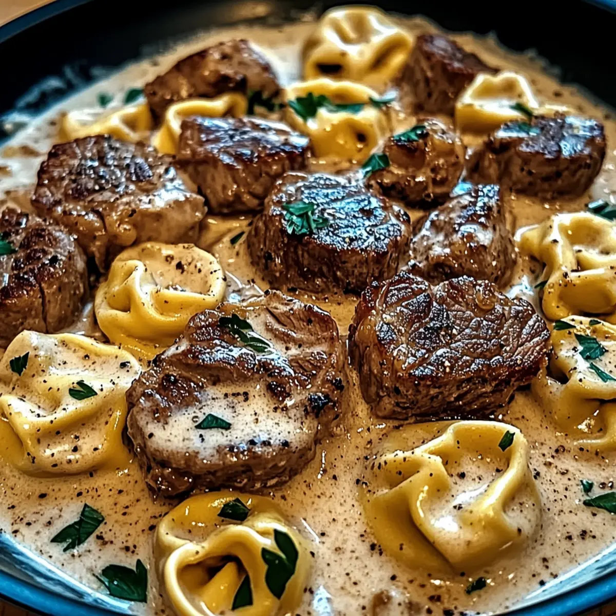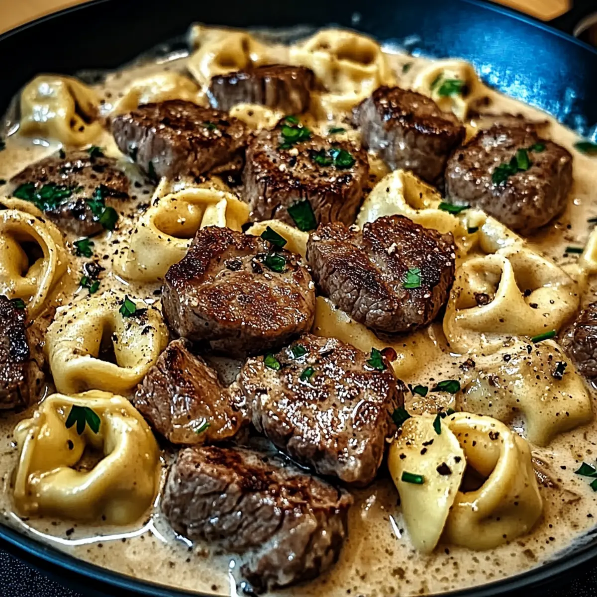 Jump to Recipe Print RecipeAs I hurriedly tossed ingredients into the skillet, I could almost hear the comforting sounds of a bustling steakhouse kitchen. This Creamy Garlic Steak Tortellini Skillet Dinner is my go-to for those crazy weeknights when time is short, yet I crave something hearty and satisfying. In just 30 minutes, you can whip up a delightful medley of tender steak, cheesy tortellini, and a rich garlic cream sauce that feels as indulgent as it does comforting. With variations like chicken or shrimp and a gluten-free option available, this dish easily adapts to your preferences, making it perfect for the whole family. Are you ready to bring some culinary magic to your table? Why Is This Recipe a Must-Try? Simplicity at Its Best: You’ll be thrilled to know this dish comes together in just 30 minutes, making weeknight cooking a breeze! Rich, Comforting Flavor: The combination of garlic, creamy sauce, and tender steak creates an indulgent dish that feels gourmet yet approachable. Versatile Options: Substitute chicken or shrimp based on your preference, and don’t shy away from using gluten-free tortellini if needed. Crowd-Pleasing Appeal: This recipe is sure to impress family and friends, just like our Garlic Butter Salmon or Shrimp Steak Alfredo. Perfect for Any Occasion: Whether it’s a busy weeknight or a cozy dinner party, this dish shines brightly at any table. Get ready to elevate your dinner game with this scrumptious dish! Cracked Garlic Steak Tortellini Ingredients • This creamy dish is packed with flavor! For the Tortellini Cheese Tortellini – Fresh or refrigerated varieties yield the best texture and taste; consider gluten-free tortellini for a gluten-free option. For the Steak Steak (Sirloin or Ribeye) – 1 lb for tender, seared bites; sirloin is leaner while ribeye offers melt-in-your-mouth richness. For the Sauce Butter – 4 tbsp creates a creamy base; vegan butter can be used for a plant-based variation. Olive Oil – 2 tbsp is essential for searing the steak; other cooking oils can also work if preferred. Garlic – 5 cloves, minced for aromatic richness; feel free to add more for a stronger garlic flavor. Heavy Cream – 1 cup gives the sauce a velvety smoothness; coconut cream serves as a dairy-free alternative. Whole Milk – 3/4 cup balances creaminess; almond milk can lighten the dish. Parmesan Cheese – 1 1/4 cups, shredded or freshly grated for a savory flavor; Pecorino Romano offers a sharper taste. For Seasoning Salt, Black Pepper, Garlic Powder, Smoked Paprika – Enhances the flavors; adjust seasoning to taste for a personalized kick. Red Pepper Flakes (optional) – A spicy kick to the dish; omit if you prefer a milder flavor. For Garnishing Fresh Parsley (optional) – Chopped for a fresh touch; swap with other herbs like basil or thyme for different highlights. Prepare your ingredients, and get ready to savor the deliciousness of this Cracked Garlic Steak Tortellini in Creamhouse Sauce! Step‑by‑Step Instructions for Cracked Garlic Steak Tortellini in Creamhouse Sauce Step 1: Cook Tortellini Begin by bringing a large pot of salted water to a boil. Once boiling, add 20 oz of cheese tortellini and cook for 3-5 minutes until they are al dente. Drain the tortellini thoroughly and set aside, allowing them to rest while you prepare the rest of the Cracked Garlic Steak Tortellini in Creamhouse Sauce. Step 2: Sear Steak In a large skillet, heat 2 tablespoons of olive oil over medium-high heat. Season 1 lb of sirloin or ribeye steak with salt, black pepper, garlic powder, and smoked paprika for flavor. Sear the steak for 3-5 minutes on each side until it reaches a beautifully browned crust. Remove the steak from the skillet and let it rest on a cutting board while you work on the sauce. Step 3: Prepare Sauce Using the same skillet, melt 4 tablespoons of butter over medium heat. Once melted, add 5 minced garlic cloves and sauté for about 1 minute until fragrant, taking care not to burn the garlic. The aroma will be heavenly, and this step sets a flavorful base for the creamy sauce to come in your Cracked Garlic Steak Tortellini in Creamhouse Sauce. Step 4: Make Cream Sauce Pour in 1 cup of heavy cream and 3/4 cup of whole milk into the skillet, stirring to combine with the garlic. Allow the mixture to come to a gentle simmer and cook for 3-4 minutes, until it slightly thickens. Remember to stir frequently to avoid any sticking or burning at the bottom of the pan, creating a luscious cream sauce. Step 5: Incorporate Cheese Gradually stir in 1 1/4 cups of shredded or freshly grated Parmesan cheese into the cream sauce. Continue to mix until the cheese has melted smoothly and the sauce is well combined. Taste the sauce and adjust the seasoning with more salt, pepper, or garlic powder to achieve the perfect balance in your Cracked Garlic Steak Tortellini in Creamhouse Sauce. Step 6: Combine Ingredients Return the seared steak, now sliced into bite-sized pieces, along with the cooked tortellini to the skillet. Gently toss everything together for about 2 minutes, ensuring the pasta and steak are thoroughly coated in the creamy garlic sauce. The goal is to have everything well-integrated for a comforting and hearty dish. Step 7: Garnish and Serve Once combined, serve your Cracked Garlic Steak Tortellini in Creamhouse Sauce immediately. Garnish with freshly chopped parsley, cracked black pepper, and a sprinkle of red pepper flakes for an optional spicy kick. Enjoy the warmth and richness of this delightful dish bursting with flavor! Variations & Substitutions for Creamy Garlic Steak Tortellini Invite your culinary creativity to dance, as there are endless ways to twist this scrumptious meal to suit your taste! Chicken Swap: Replace steak with cubed chicken breast for a lighter, yet equally flavorful version. Chicken brings a mild richness, allowing the garlic cream sauce to shine even brighter. Shrimp Twist: Use succulent shrimp in place of steak to c