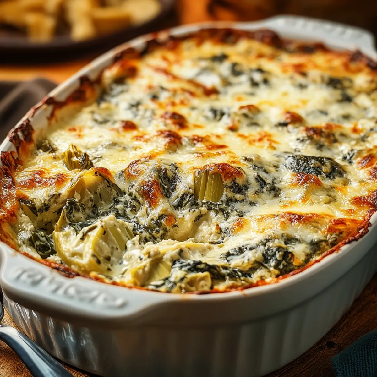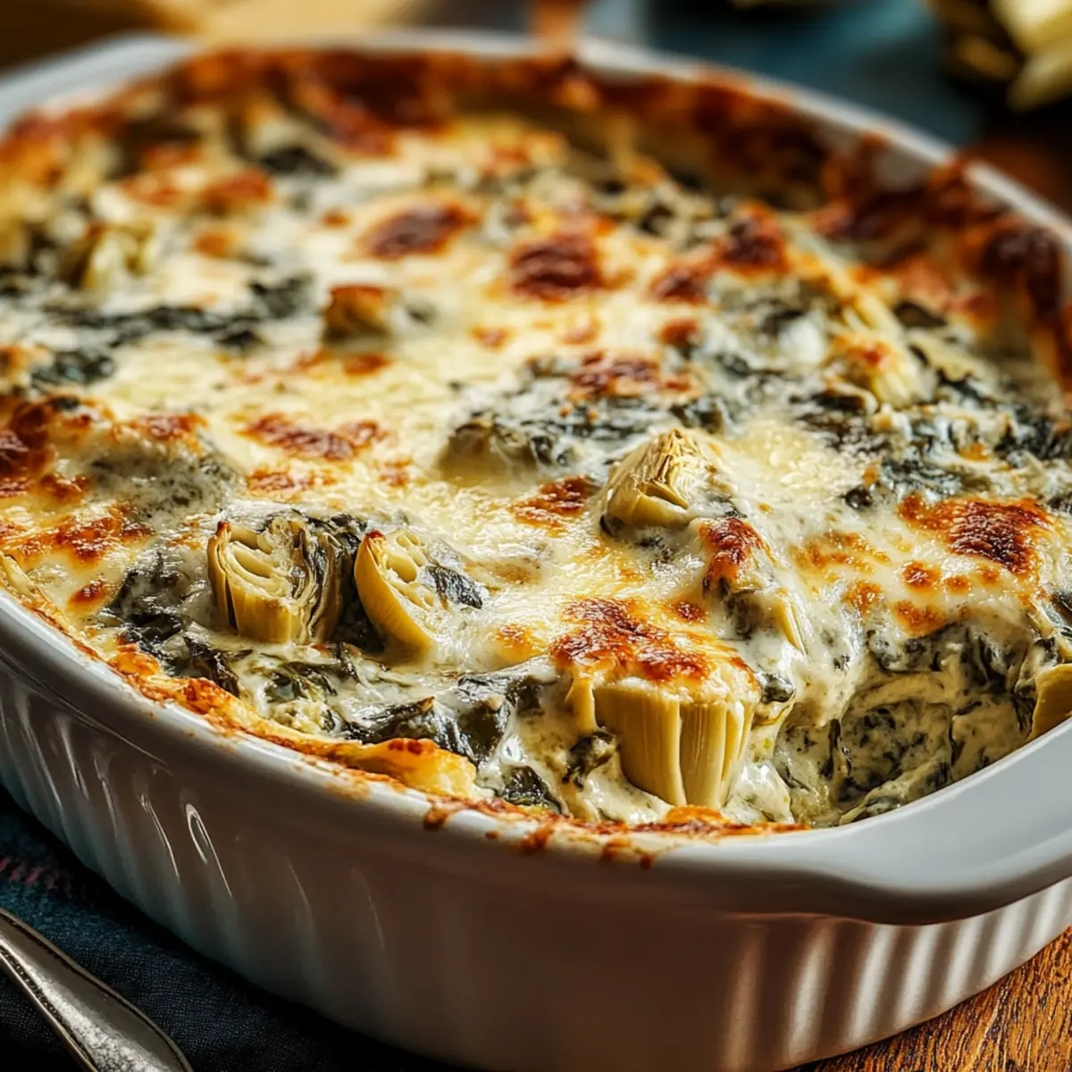 Jump to Recipe Print RecipeAs I stirred the ingredients in my mixing bowl, the aroma of garlic and melted cheese wafted through the kitchen, igniting a sense of excitement that had me daydreaming of cozy gatherings with friends. That’s the magic of this Ultra Creamy Hot Spinach Artichoke Dip—a decadent party appetizer that’s not only cheesy and comforting but also surprisingly easy to whip up. With minimal prep time, you can enjoy a dish that will leave everyone asking for the recipe! Plus, it’s naturally gluten-free, making it perfect for accommodating every guest around your table. Trust me, this dip is a total game-changer when it comes to satisfying those cravings for homemade comfort food. What clever twist will you add to make it uniquely yours? Why is This Dip a Must-Try? Irresistible Flavor: The blend of creamy cheeses and vibrant artichokes creates a taste sensation that’s hard to resist. Quick to Prepare: With just a few simple steps and minimal prep time, you can have this dip ready to impress your guests in no time. Perfect for Any Occasion: Whether it’s a casual night in or a festive gathering, this dip fits right in, pairing beautifully with pita chips or fresh veggies. Adaptable Options: Want to switch things up? Try adding a kick of spice with jalapeños or make it dairy-free with vegan cheese! Don’t forget to check out our Caramelized Onion Dip for another crowd-pleaser that’s a breeze to make. Creamy Hot Spinach Artichoke Dip Ingredients For the Dip Cream Cheese – Adds richness and creaminess; soften before mixing for easier blending. Mayonnaise – Enhances creaminess and flavor depth; substitute with Greek yogurt for a lighter option. Shredded Mozzarella – Provides stretchiness and melt factor; use low-moisture mozzarella for optimal melting. Grated Parmesan – Adds sharpness and umami flavor; Pecorino Romano can be used as a substitute. Canned Artichoke Hearts – Key ingredient for texture and tang; ensure they are thoroughly drained and chopped. Fresh Spinach (or frozen) – Contributes volume and nutrition; if using frozen, thaw completely and squeeze out moisture. Garlic (minced) – Infuses the dip with savory notes; fresh or powdered garlic can be used. Salt and Pepper – Essential for taste enhancement; adjust according to preference. This Creamy Hot Spinach Artichoke Dip will undoubtedly become your go-to appetizer! Step‑by‑Step Instructions for Creamy Hot Spinach Artichoke Dip Step 1: Preheat The Oven Begin by preheating your oven to 350°F (175°C). This ensures that your Creamy Hot Spinach Artichoke Dip will bake evenly and come out perfectly bubbly and golden on top. While the oven warms up, gather your mixing bowl and baking dish, ready for the delectable mixture to come. Step 2: Mix The Creamy Base In a large mixing bowl, soften the cream cheese for about 10 minutes at room temperature, making it easy to blend. Add in the mayonnaise, shredded mozzarella, and grated Parmesan cheese, stirring them together until the mixture is smooth and creamy. You’ll create a rich base that sets the stage for the delicious flavors to come. Step 3: Incorporate The Veggies Now, fold in the chopped fresh spinach and drained artichoke hearts into the creamy mixture. Add the minced garlic, salt, and pepper, stirring gently until everything is evenly coated. The vibrant greens will add a pop of color and nutrition, making your Creamy Hot Spinach Artichoke Dip not only delectable but also visually appealing. Step 4: Prepare For Baking Transfer the combined mixture into your prepared baking dish. Use a spatula to spread it out evenly, smoothing the top for an inviting presentation. This ensures that every bit of your dip cooks uniformly, providing a delightful consistency throughout every scoop. Step 5: Bake To Perfection Place the baking dish in your preheated oven and bake for 20 to 25 minutes. Watch as the dip begins to bubble, and the top develops a light golden hue. Once it’s beautifully melted and bubbly, it’s ready to be taken out and served hot—an irresistible treat that everyone will love. Step 6: Optional Garnish For an extra touch, you can sprinkle some chopped parsley or additional grated Parmesan cheese on top just before serving. This not only enhances the flavor but also adds a visually appealing finish to your Creamy Hot Spinach Artichoke Dip, ensuring it’s a feast for the eyes as well as the palate. Step 7: Serve And Enjoy Finally, serve your delicious dip hot alongside pita chips, toasted bread, or fresh vegetable sticks. As you share this delightful appetizer with your friends and family, watch them delight in the creamy goodness you’ve created, making every gathering memorable with this crowd-pleasing dish. What to Serve with Ultra Creamy Hot Spinach Artichoke Dip Transform your cozy gathering with delectable sides that perfectly accompany this rich, cheesy delight. Crunchy Pita Chips: A classic choice, their savory crunch enhances the creaminess of the dip, balancing textures beautifully. These chips are sturdy enough to scoop up every last bit while providing that satisfying crunch. Toasted Baguette Slices: Warm, crispy slices of baguette create a delightful contrast with the hot, creamy dip. The bread’s flavor adds depth and richness, making every bite an elegant experience. Veggie Sticks: Fresh carrots, celery, and bell peppers not only add vibrant color to your spread but also provide a refreshing bite. Their crispness makes for a perfect palate cleanser between dips. Garlic Bread: Buttery, soft, and infused with garlic goodness, this makes for an irresistible pairing. The flavors meld wonderfully with the dip, offering a heartwarming experience that’s hard to resist. Cheese Platter: Complement the dip with a variety of cheeses, like sharp cheddar and creamy brie, for a luxurious touch. This adds sophistication and encourages tasting, inviting your guests to enjoy a culinary adventure. Red Wine: A glass of mello