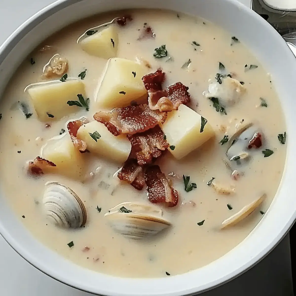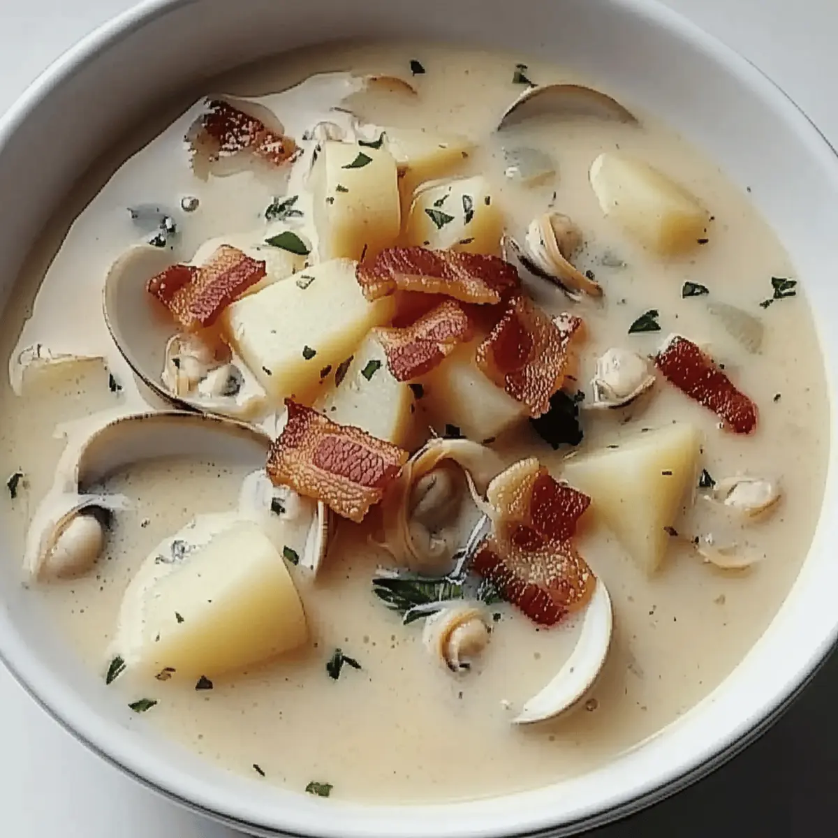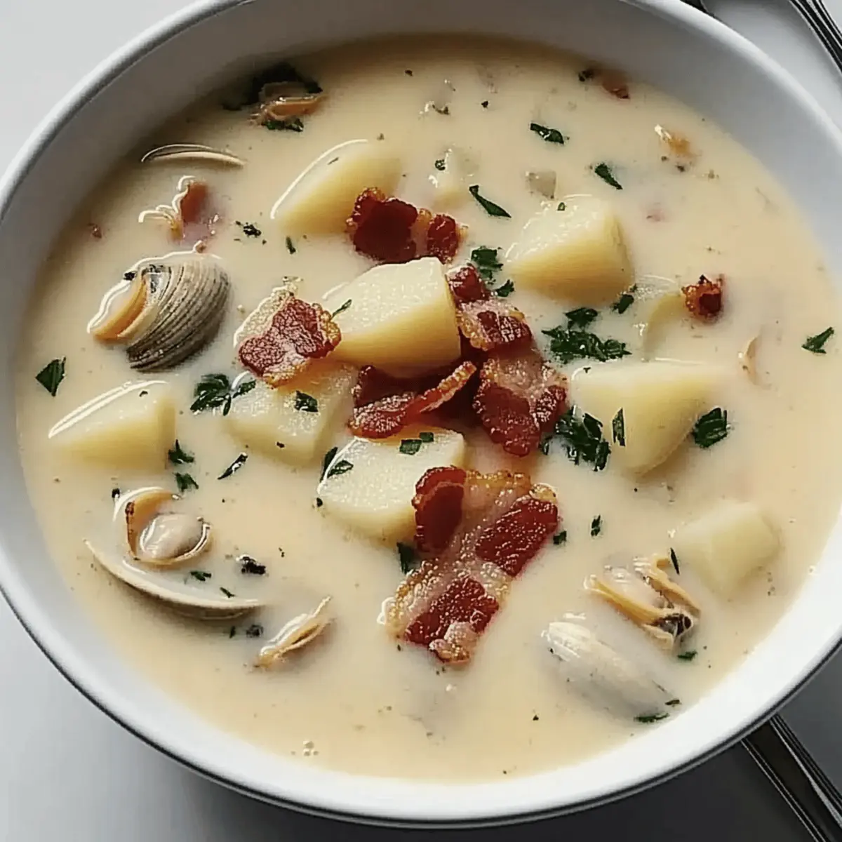 Jump to Recipe Print RecipeAs I stirred the pot, the rich aroma of bacon sizzling started to weave through my kitchen, instantly transporting me to the cozy shores of New England. That’s the magic of homemade Creamy New England Clam Chowder—it’s a heartwarming dish that transforms chilly evenings into delightful gatherings. Not only is this chowder luxuriously creamy and satisfying, but it’s also surprisingly simple to whip up right at home. With gluten-free and keto-friendly variations, it caters to everyone at the table, ensuring all can join in the cozy embrace of this classic comfort food. Ready to dive into a bowl of deliciousness? Let’s get cooking! Why is this chowder so irresistible? Comforting warmth: Each bowl of this creamy New England clam chowder wraps you in a velvety embrace that feels like a warm hug on a chilly day. Effortlessly easy: This recipe uses straightforward cooking techniques, making it accessible even for novice chefs. Customizable delights: Whether you’re gluten-free or keto, you can still savor the same rich flavors with simple substitutions. Crowd-pleasing flavors: Perfect for gatherings, this chowder shines as a comforting dish that everyone will love, similar to my White Chicken Chowder. Versatile pairings: Serve it with a toasted bread bowl or alongside oyster crackers for that extra crunch. You might also enjoy my Sheet Pan Clambake for a delightful seafood feast! Creamy New England Clam Chowder Ingredients For the Chowder Base Bacon – Adds savory flavor and a crispy texture. Substitution: Use turkey bacon for a lighter option. Butter – Provides richness and depth to the chowder base. No direct substitutions; can use olive oil for a dairy-free version. Onion – Delivers a sweet and aromatic base flavor. Substitution: Shallots can be used for a milder taste. Celery – Contributes a subtle crunch and freshness. Omit for a simpler flavor, though it enhances texture. Garlic – Adds a fragrant component. Can use garlic powder in a pinch; approximately 1/8 teaspoon equals 1 clove. All-Purpose Flour – Thickens the chowder. Substitution: For gluten-free, use cornstarch mixed with water or almond flour. Chicken Broth or Clam Juice – Forms the soup base, infusing it with flavor. Use vegetable broth as a vegan alternative. Russet Potatoes – Provides heartiness and texture. Substitution: Yukon gold potatoes for a creamier texture. Salt – Enhances overall flavor of the dish. Adjust based on broth saltiness. Black Pepper – Adds heat and spice. Can substitute with white pepper for a milder taste. Dried Thyme – Infuses an earthy aroma. Fresh thyme can be used; increase quantity slightly. Chopped Clams – Main protein; adds umami richness. Using fresh clams provides a deeper flavor; adjust cooking time accordingly. Heavy Cream – Creates a rich, velvety finish. For a lighter option, use half-and-half or coconut cream. Ready to bring this creamy delight to your kitchen? Gather your ingredients and let’s make some soul-warming clam chowder that will impress everyone at the table! Step‑by‑Step Instructions for Creamy New England Clam Chowder Step 1: Cook the Bacon Begin by heating a large pot over medium heat and adding the chopped bacon. Sauté until the bacon turns crispy and golden brown, about 5 minutes. Once done, use a slotted spoon to remove the bacon and set it aside, leaving the rendered fat in the pot to infuse the chowder with flavor. Step 2: Sauté Aromatics In the same pot with the bacon grease, melt the butter over medium heat. Add the finely chopped onion and celery, stirring occasionally, and sauté until they become tender and translucent, around 3–4 minutes. Then, add the minced garlic and cook for an additional 30 seconds until fragrant, allowing the scents to mingle beautifully. Step 3: Make Roux Next, sprinkle the all-purpose flour over the softened aromatics and stir vigorously for about 1 minute. This will create a roux that acts as a thickening agent for your creamy New England clam chowder. Ensure the flour is well incorporated and cooked before proceeding to the next step for a smooth texture. Step 4: Add Liquids Gradually pour in the chicken broth or clam juice while continuously stirring to prevent any lumps from forming. Keep the heat medium-high to bring the mixture to a gentle simmer. As it heats, the base will thicken and develop that rich flavor synonymous with a hearty clam chowder. Step 5: Incorporate Vegetables Once the broth is simmering, add the diced russet potatoes along with the salt, black pepper, and dried thyme. Stir well, and allow the pot to simmer uncovered for about 15 minutes or until the potatoes are fork-tender. This cooking process will soften the potatoes and enhance the chowder’s heartiness. Step 6: Combine Clams and Cream Now it’s time to add the chopped clams and heavy cream to the pot. Stir gently and allow the chowder to warm through for about 5 minutes. Be careful not to let it boil, as this could cause the cream to curdle. Taste your chowder and adjust the seasonings if necessary for that perfect flavor balance. Step 7: Serve Ladle the creamy New England clam chowder into individual bowls and garnish generously with the crispy bacon reserved from earlier. The enticing aroma and luscious texture will beckon everyone to the table. Serve warm, paired with toasted bread or oyster crackers for a delightful crunch alongside your chowder. Expert Tips for Creamy New England Clam Chowder Smooth Roux Technique: Always ensure your roux is cooked fully before adding broth. This prevents lumps and keeps your creamy New England clam chowder silky. Broth Choice Matters: The flavor of your chowder is heavily influenced by the broth you use. Opt for high-quality chicken broth or clam juice for the best results. Potato Selection: Choose russet potatoes for heartiness, or Yukon gold for creaminess. They both enhance the soup’s texture beautifully. Seasoning Adjustments: Taste before ser
