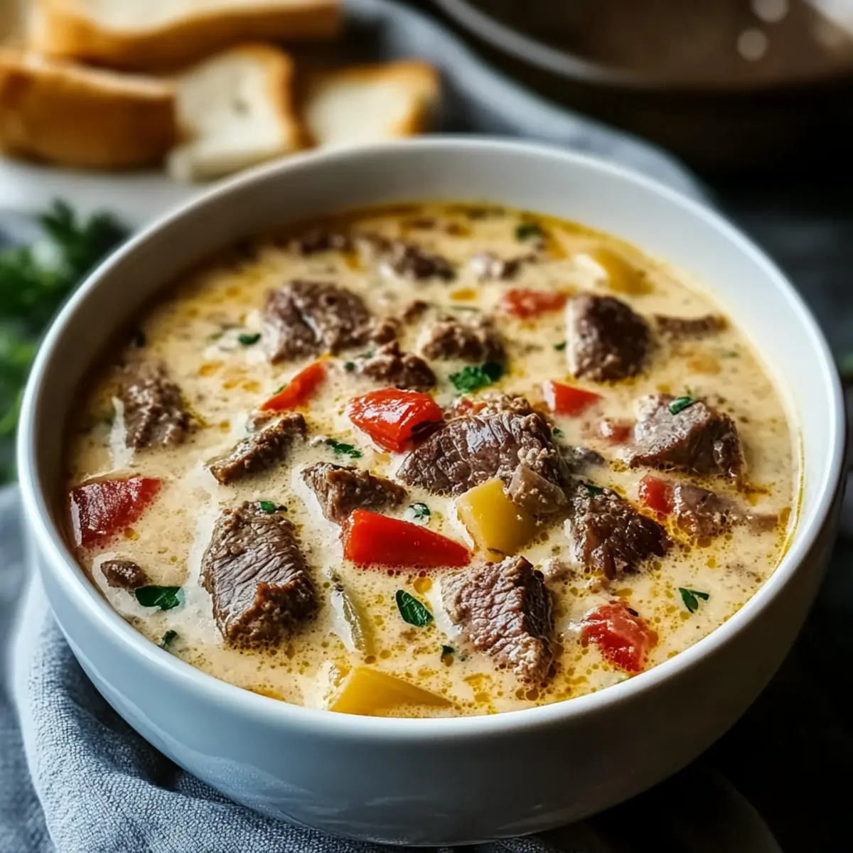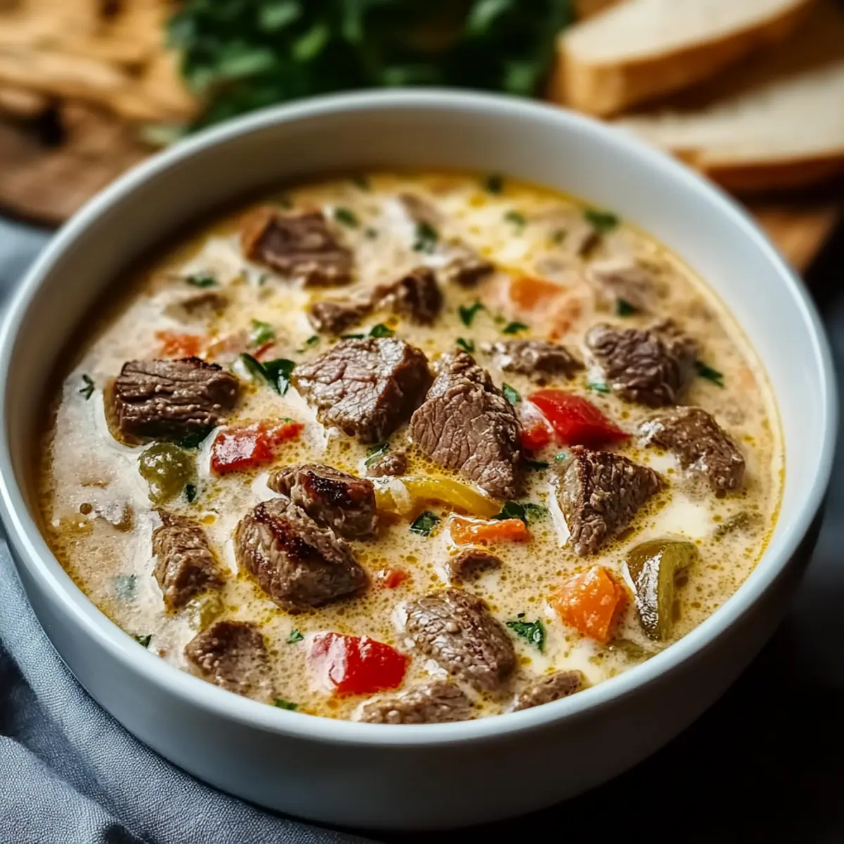 Enjoy a comforting bowl of Creamy Philly Cheese Steak Soup with rich flavors and creamy texture, perfect for chilly evenings.