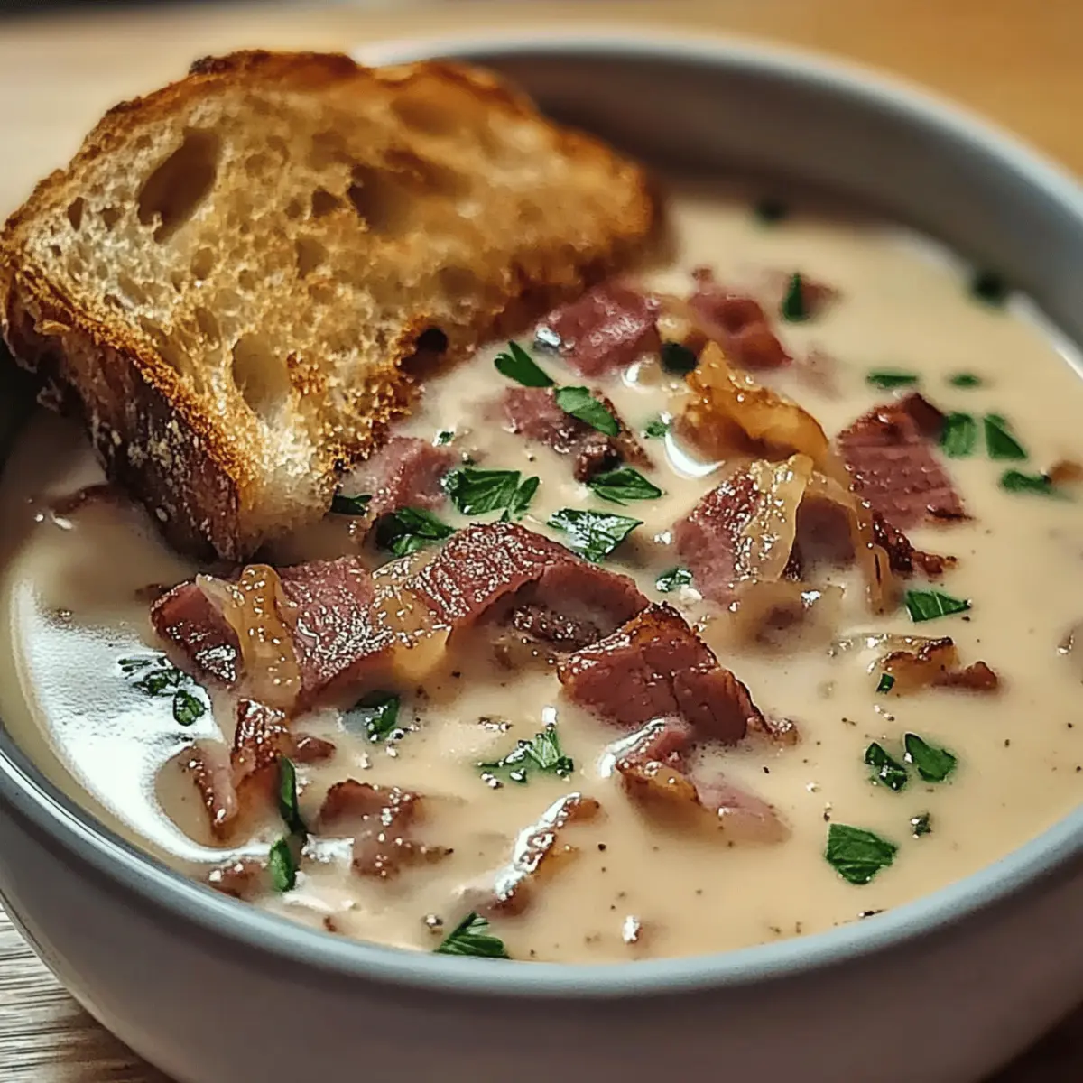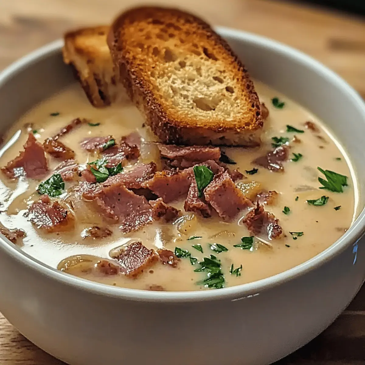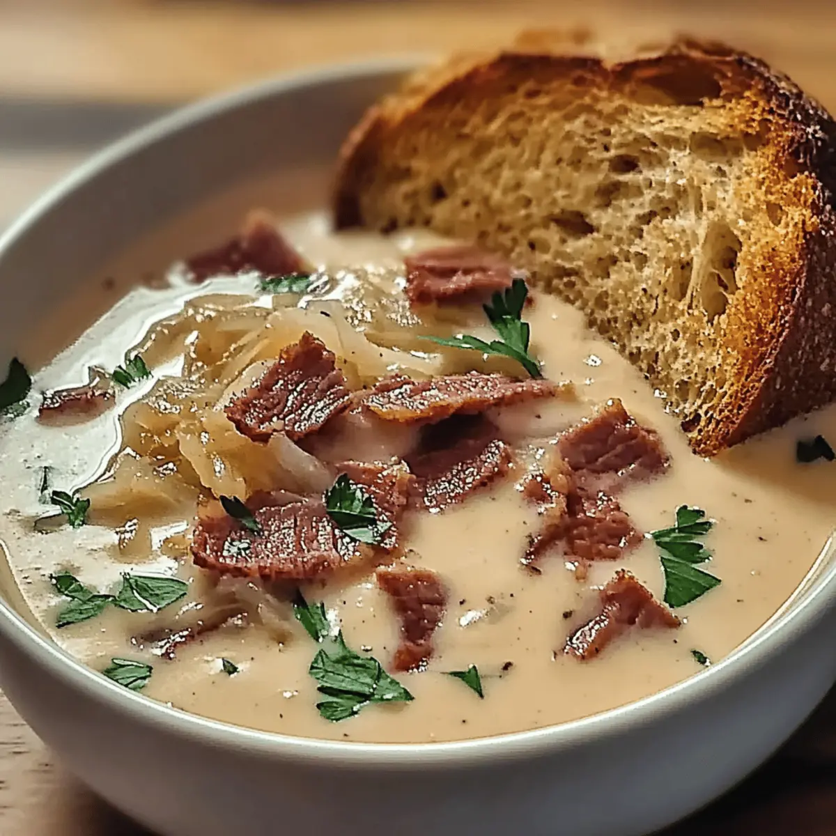 Jump to Recipe Print RecipeAs I curled up with a blanket on a chilly evening, the thought of a warm, satisfying meal became irresistible. Enter the Creamy Reuben Soup, where the beloved flavors of the classic Reuben sandwich melt together in a cozy bowl. This delightful twist on comfort food combines protein-rich corned beef, zesty sauerkraut, and creamy Swiss cheese, offering a heartwarming experience that warms both body and soul. Not only is it quick to prepare, but it also easily adapts to fit your personal taste—whether you’re craving a spicier kick or a lighter version. Who wouldn’t want to enjoy their favorite sandwich in a soup? Let’s dive into this creamy delight that promises to become a cherished recipe for chilly days! Why is Creamy Reuben Soup a must-try? Comforting, Warmth: This dish transforms the classic Reuben sandwich into a cozy bowl of creamy goodness. Flavorful Fusion: Rich corned beef, tangy sauerkraut, and melted Swiss cheese mingle beautifully, providing a burst of flavors in every spoonful. Easy to Make: With just a few ingredients, this soup comes together quickly, perfect for weeknight dinners or unexpected guests. Customizable: Want to lighten it up? Try chicken or switch to cheddar for a twist. The variations are endless! Nostalgic Delight: This soup captures the essence of a beloved sandwich, bringing fond memories to the table. Serve it alongside a light salad or pickles for the complete experience! If you’re in the mood for more comforting soups, don’t miss my Sweet Potato Soup or Roasted Cauliflower Soup. Creamy Reuben Soup Ingredients For the Soup Base Unsalted Butter – Adds richness and flavor. Substitution: Margarine or olive oil can be used for a dairy-free version. Onion (1 medium, chopped) – Provides aromatic flavor. Garlic (2 cloves, minced) – Enhances savory notes. All-Purpose Flour (1/4 cup) – Used to create a roux for thickness. Substitution: Gluten-free flour for a gluten-free version. Chicken Broth (4 cups) – Base of the soup, adds depth. Note: Use low-sodium broth to manage sodium levels. Heavy Cream (1 cup) – Adds creaminess and richness. Substitution: Half-and-half for a lighter option. For the Mix-Ins Corned Beef (1/2 pound, chopped) – Provides protein and classic Reuben flavor. Tip: Use quality deli meat or homemade for best taste. Sauerkraut (1 cup, drained) – Adds tanginess and texture. Swiss Cheese (1 cup, shredded) – Melts into the soup for creaminess. Russian or Thousand Island Dressing (1/4 cup) – Adds a signature flavor that mirrors the sandwich. Salt and Pepper – To taste. For Garnishes Rye Bread Croutons – Provide a classic crunchy texture. Chopped Parsley – Adds freshness and color. Embrace the comforting warmth of creamy Reuben soup, packed with rich flavors and customizable to your liking! Step‑by‑Step Instructions for Creamy Reuben Soup Step 1: Sauté Aromatics Melt 1 tablespoon of unsalted butter in a large pot over medium heat. Add the chopped onion and minced garlic, cooking for about 5 minutes until the onion becomes translucent and fragrant, stirring occasionally. This forms a flavorful base for your Creamy Reuben Soup. Step 2: Create the Roux Stir in 1/4 cup of all-purpose flour with the onion and garlic mixture, allowing it to cook for an additional 2 minutes. This will create a roux that thickens the soup. Keep stirring continuously to avoid lumps and ensure the flour doesn’t burn, leading to a rich, creamy texture. Step 3: Add Broth Gradually whisk in 4 cups of chicken broth, mixing until the roux is fully incorporated and there are no lumps remaining. Bring the mixture to a simmer over medium heat, allowing it to bubble gently for about 5 minutes. The broth will thicken slightly, creating a base for the Creamy Reuben Soup. Step 4: Incorporate Cream Lower the heat to medium-low and slowly stir in 1 cup of heavy cream. Keep stirring until the cream is fully blended, and the soup looks smooth and creamy. Allow it to heat through for about 2 minutes, but avoid boiling to maintain the creamy consistency. Step 5: Mix in Key Ingredients Add 1/2 pound of chopped corned beef and 1 cup of drained sauerkraut to the pot. Stir well to ensure all the ingredients are evenly distributed throughout the Creamy Reuben Soup. Cook for an additional 3–4 minutes until the meat is heated through and flavors meld beautifully. Step 6: Melt the Cheese Introduce 1 cup of shredded Swiss cheese and 1/4 cup of Russian or Thousand Island dressing to the soup. Stir gently until the cheese is completely melted and the soup becomes creamy and cohesive. This is where the magic happens, transforming your soup into a delicious homage to the classic sandwich. Step 7: Season to Taste Taste the Creamy Reuben Soup and season with salt and pepper as desired. Add a pinch of seasoning at a time, stirring well and tasting between each addition. This step ensures the flavors are balanced and to your liking before serving. Step 8: Simmer and Serve Allow the soup to simmer on low heat for an additional 10 minutes, stirring occasionally to prevent sticking. This final simmer melds all the flavors together beautifully. Serve the soup hot, garnishing with crispy rye bread croutons and chopped parsley on top for added texture and a touch of freshness. Creamy Reuben Soup Variations & Substitutions Feel free to let your culinary creativity shine by customizing this recipe to suit your taste and dietary needs! Turkey Swap: Substitute corned beef with cooked turkey or chicken for a lighter version that’s just as hearty. Cheese Switch: Replace Swiss cheese with sharp cheddar for a more robust flavor. The depth of cheddar adds a delightful twist! Vegan Delight: Use plant-based butter, cashew cream, and vegan cheese for a completely dairy-free experience. It’s a cozy, creamy hug in a bowl! Gluten-Free: Swap all-purpose flour with your favorite gluten-free flour, maintaining the smooth texture without sacrificing flavor. Perfe
