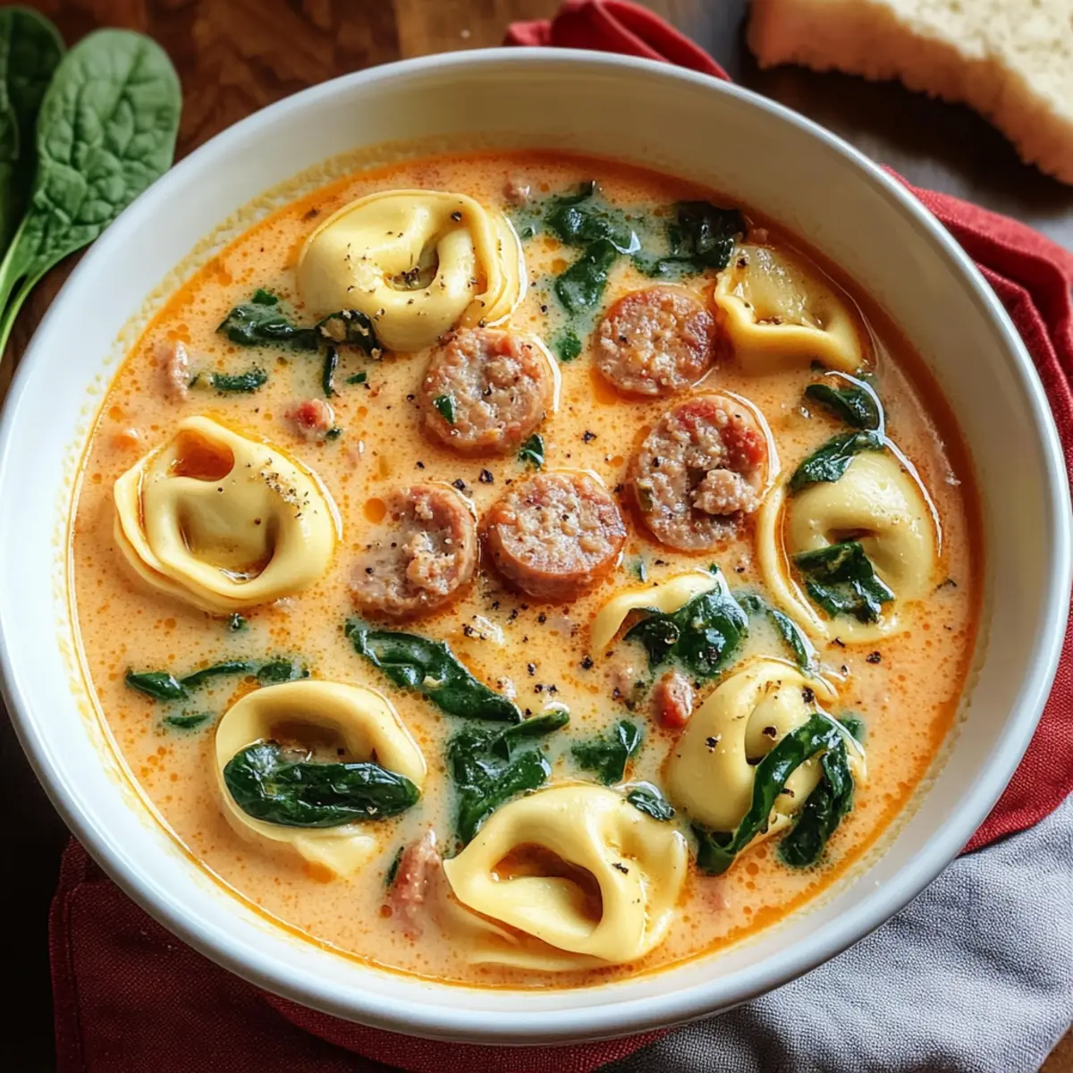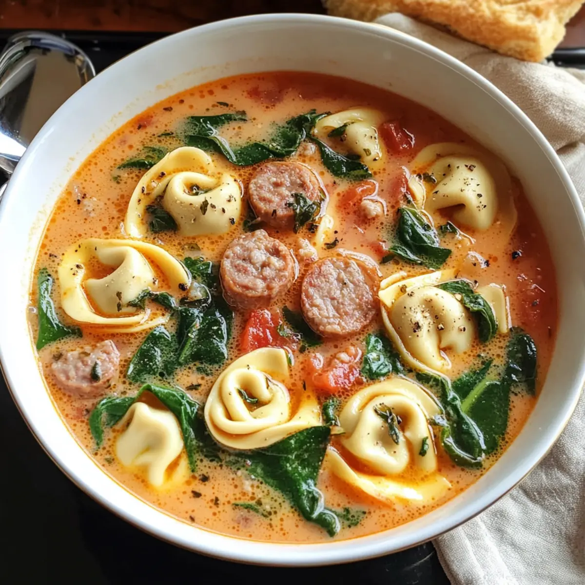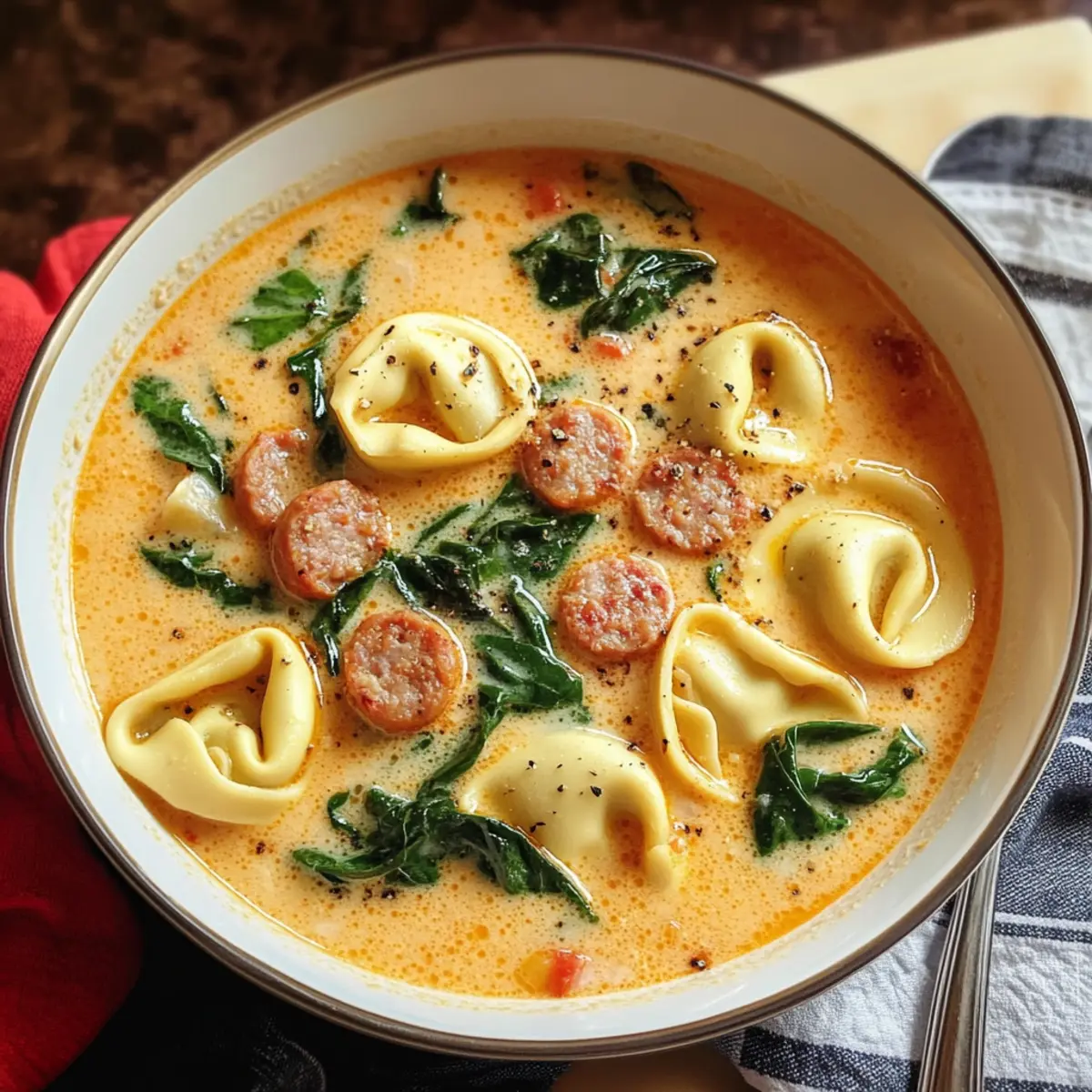 Jump to Recipe Print RecipeThe aroma of a bubbling pot can transform your kitchen into a cozy haven, and today, I’m excited to share my favorite Creamy Tortellini Soup recipe! This hearty dish, filled with cheesy tortellini nestled in a velvety tomato broth, is perfect for those evenings when you crave something comforting yet satisfying. Thanks to its quick preparation time of just 30 minutes, it fits seamlessly into any busy weeknight. Plus, with a few simple ingredient swaps, like using ground turkey or plant-based sausage, you can easily create a lighter version that still packs a flavorful punch. So grab your spoon and get ready for a deliciously heartwarming experience—are you ready to bring some Italian comfort into your kitchen? Why is Tortellini Soup So Comforting? Heartwarming and inviting, this Creamy Tortellini Soup will embrace you with its rich flavors. Quick to make, you can whip up this comforting dish in just 30 minutes, perfect for hectic weeknights. Versatile by nature, swap in ground turkey or plant-based options without sacrificing taste. Crowd-pleasing, it’s a great choice for family gatherings, bringing everyone together around a warm pot. Finally, deliciously creamy, each bowl is a delightful hug in soup form. Don’t forget to pair it with some crusty bread for that ultimate cozy experience! Creamy Tortellini Soup Ingredients • A delightful blend of flavors awaits! For the Soup Base Italian Sausage – Adds savory flavor and spice; substitute with ground turkey or plant-based sausage for a lighter dish. Cheese Tortellini – The star ingredient, providing creaminess and texture; both fresh and frozen work great, or opt for mini shells as an alternative. Spinach – Contributes color and nutrition; baby spinach wilts quickly, while kale can be used if cooked a bit longer. Canned Diced Tomatoes – Form the base of the soup’s rich flavor; choose fire-roasted varieties for an extra depth of taste. Chicken Broth – Enhances the overall richness; feel free to substitute with vegetable broth for a plant-based version. For Creaminess Heavy Cream – Enriches the broth and ensures a luscious texture; swap with half-and-half or plant-based cream for lighter options. Parmesan Cheese – Adds additional richness; stir gently to avoid curdling when incorporating into the hot soup. For Seasoning Salt and Black Pepper – Essential for balancing flavors; season to taste for the perfect enhancement. Red Pepper Flakes – Optional, for a touch of heat; adjust according to preference. With these simple ingredients, your Creamy Tortellini Soup will come to life, bringing comfort and warmth to your dinner table! Step‑by‑Step Instructions for Creamy Tortellini Soup Step 1: Sauté Sausage In a large pot, heat a drizzle of olive oil over medium heat. Once hot, add the Italian sausage, breaking it apart with a wooden spoon as it cooks. Sauté for 5–7 minutes until the sausage is browned and cooked through, releasing savory aromas that fill your kitchen. Step 2: Cook Aromatics Add the chopped onions to the pot and sauté for 3–4 minutes until they become translucent and tender. Stir in the minced garlic, cooking for an additional minute, allowing its fragrant flavor to develop. This mixture creates a savory base for your creamy tortellini soup. Step 3: Combine Base Pour in the canned diced tomatoes along with their juices and the chicken broth, stirring to combine all the ingredients. Bring the mixture to a gentle simmer over medium-high heat, letting the flavors meld beautifully for about 5 minutes while the soup thickens slightly. Step 4: Add Pasta Carefully introduce the cheese tortellini into the simmering broth and cook according to the package instructions, typically about 5 minutes. You’ll know they’re done when they float to the top and become tender, providing that delightful, creamy texture in your soup. Step 5: Finish with Greens and Cream Stir in the fresh spinach, allowing it to wilt into the soup for 1–2 minutes. Once wilted, reduce the heat to low to keep the mixture warm, and gently mix in the heavy cream and grated Parmesan cheese. Heat for an additional 2-3 minutes, being careful not to let the soup boil. Step 6: Season and Serve Taste your creamy tortellini soup and season with salt, black pepper, and red pepper flakes as desired. Once perfectly seasoned, ladle the soup into bowls, topping with extra Parmesan if you like, and serve alongside crusty bread for dipping into the comforting broth. Make Ahead Options These Creamy Tortellini Soup preparations are perfect for busy cooks looking to save time during hectic weeknights! You can prepare the soup base—sautéed sausage, onions, garlic, tomatoes, and broth—up to 24 hours in advance, storing it in an airtight container in the refrigerator to maintain freshness. Additionally, you can cook the tortellini and spinach ahead of time, adding them just before serving. When you’re ready to enjoy, simply reheat the soup over low heat, then stir in the precooked tortellini and spinach, adding heavy cream just before serving for that delightful creaminess. This way, you’ll achieve delicious, restaurant-quality results with minimal effort! How to Store and Freeze Creamy Tortellini Soup Fridge: Store leftover creamy tortellini soup in an airtight container for up to 3 days. Reheat gently on the stove over low heat, adding a splash of broth or cream if it thickens. Freezer: For longer storage, freeze the soup in freezer-safe containers for up to 3 months. When ready to enjoy, thaw overnight in the fridge and reheat on the stovetop. Reheating: Always reheat soup slowly on low heat to maintain its creamy texture. Avoid boiling after adding any cream or cheese, which can cause curdling. Storage Tip: If you anticipate having leftovers, consider freezing the soup without the tortellini, as pasta can become mushy upon reheating. Add freshly cooked tortellini when serving. What to Serve with Creamy Tortell