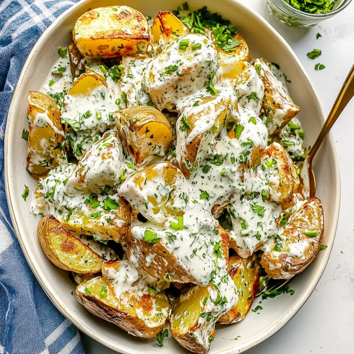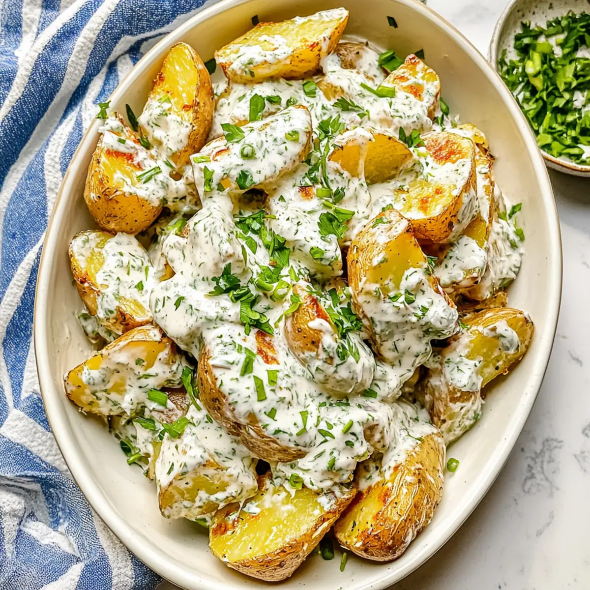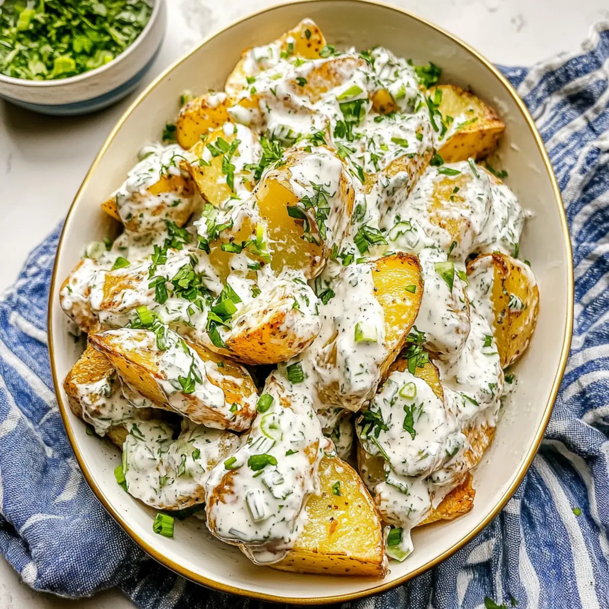 Jump to Recipe Print RecipeAs the sun sets on another busy day, I find myself longing for a comforting side dish that doesn’t skimp on flavor—and that’s where my Crispy Potato Salad comes into play. Perfectly roasted Yukon Gold potatoes create a golden crunch that contrasts beautifully with a creamy dressing, making this dish a true standout alongside any BBQ or potluck spread. Not only is this potato salad a crowd-pleaser, but it’s also surprisingly easy to whip up, elevating the classic potato salad into something everyone will love. With every bite, you’ll experience that satisfying mix of textures that will have friends and family reaching for more. What’s your favorite way to enjoy potato salad? Let’s dive into this delightful recipe together! Why is Crispy Potato Salad the Best? Irresistible Crunch: The combination of golden, roasted Yukon Gold potatoes and a creamy dressing delivers a delightful crunch and flavor explosion that will keep you coming back for more. Super Simple: With just a few straightforward steps, preparing this dish is a breeze, even for those new to cooking! Versatile & Adaptable: Feel free to toss in some crispy bacon or fresh herbs for added taste! Perfect for Gatherings: Whether it’s a summer BBQ or a cozy potluck, this salad shines as the star side dish that pairs beautifully with grilled meats or even alongside options like Thai Chicken Salad. Make-Ahead Wonder: This salad stores well, making it ideal for meal prep or last-minute gatherings. You can even enjoy it as a refreshing snack throughout the week! Healthy Delight: Packed with nutritious ingredients, this crispy potato salad delivers a satisfying treat without the guilt. Crispy Potato Salad Ingredients For the Salad • Yukon Gold Potatoes – Provides a creamy texture and buttery flavor; Russet potatoes can be used for a fluffier texture. • Olive Oil – Adds richness and assists in crisping during roasting. • Garlic Powder – Enhances flavor depth; fresh garlic can also be substituted for a stronger taste. • Kosher Salt and Black Pepper – Essential for seasoning; adjust to taste. For the Dressing • Sour Cream – Contributes creaminess and tang; Greek yogurt can be used for a lighter option. • Mayonnaise – Adds richness and helps bind the salad; vegan mayo can replace it for a dairy-free version. • Scallions – Offers a mild onion flavor; use red onions for a sharper taste. • Fresh Dill – Provides a fresh, herby flavor; fresh tarragon or parsley can be substitutes. • Fresh Parsley – Adds brightness and color; can be replaced with cilantro for a different herb profile. • Dijon Mustard – Adds a slight tanginess; yellow mustard can be a milder alternative. • Lemon Juice – Brightens flavor; lime juice can also be used as a substitute. Enjoy crafting your Crispy Potato Salad with these delightful ingredients that come together to create a dish everyone will crave! Step‑by‑Step Instructions for Crispy Potato Salad Step 1: Boil the Potatoes Begin by washing and cubing your Yukon Gold potatoes into bite-sized pieces. In a large pot, bring salted water to a rolling boil and carefully add the potatoes. Cook for 12–16 minutes, or until they are fork-tender but not falling apart. Once cooked, drain the potatoes in a colander and let them cool slightly while you prepare for roasting. Step 2: Preheat the Oven Preheat your oven to 400°F (200°C) to ensure it’s hot and ready for roasting. Line a baking sheet with aluminum foil for easy cleanup and to help keep the potatoes from sticking. This will be where you achieve the crispy goodness of your Crispy Potato Salad. Step 3: Season the Potatoes In a large mixing bowl, toss the boiled potatoes with a generous drizzle of olive oil, garlic powder, kosher salt, and freshly cracked black pepper. Make sure each piece is well-coated for maximum flavor. Once seasoned, carefully spread the potatoes in a single layer on the prepared baking sheet, ensuring they are not overcrowded for even crisping. Step 4: Roast for Crispiness Place the baking sheet in the preheated oven and roast the potatoes for about 30 minutes. Stir the potatoes halfway through to achieve an even golden-brown crispiness. They should be golden and crispy on the outside while remaining fluffy on the inside when done. Step 5: Prepare the Dressing While the potatoes are roasting, prepare the creamy dressing for your Crispy Potato Salad. In a mixing bowl, combine sour cream, mayonnaise, chopped scallions, fresh dill, parsley, Dijon mustard, and lemon juice. Season the mixture with salt and pepper to taste, creating a balanced and flavorful dressing. Step 6: Combine the Ingredients Once the potatoes are perfectly roasted, remove them from the oven and let them cool for a few minutes. In a serving bowl, gently fold the warm roasted potatoes into the dressing, making sure they are well-coated but still retain their shape. This step is crucial for marrying the flavors together in your Crispy Potato Salad. Step 7: Garnish and Serve Transfer the dressed potato salad to a beautiful serving platter or bowl. Garnish with additional reserved herbs, such as dill and parsley, for a pop of color and freshness. Your Crispy Potato Salad is now ready to be served at any gathering, sure to delight everyone with its vibrant flavors and textures. Storage Tips for Crispy Potato Salad Fridge: Store leftover crispy potato salad in an airtight container for up to 3 days. Ensure it’s tightly sealed to prevent moisture loss. Freezer: Although not ideal, you can freeze the salad for up to 1 month. Just know that the potatoes may lose their crispness after thawing. Reheating: If serving leftovers, reheat in an oven at 350°F (175°C) for about 10 minutes to regain some crispiness. Add a little olive oil if needed for moisture. Serving Cold: This dish can be enjoyed cold straight from the fridge, making it excellent for summer potlucks and BBQs. Just give it a gentle stir bef