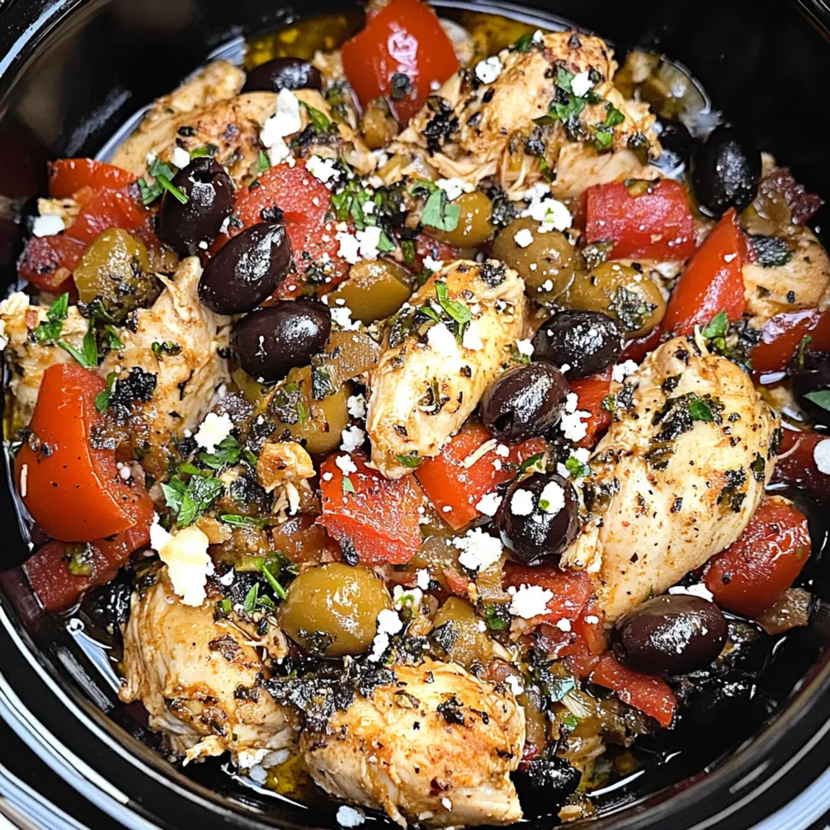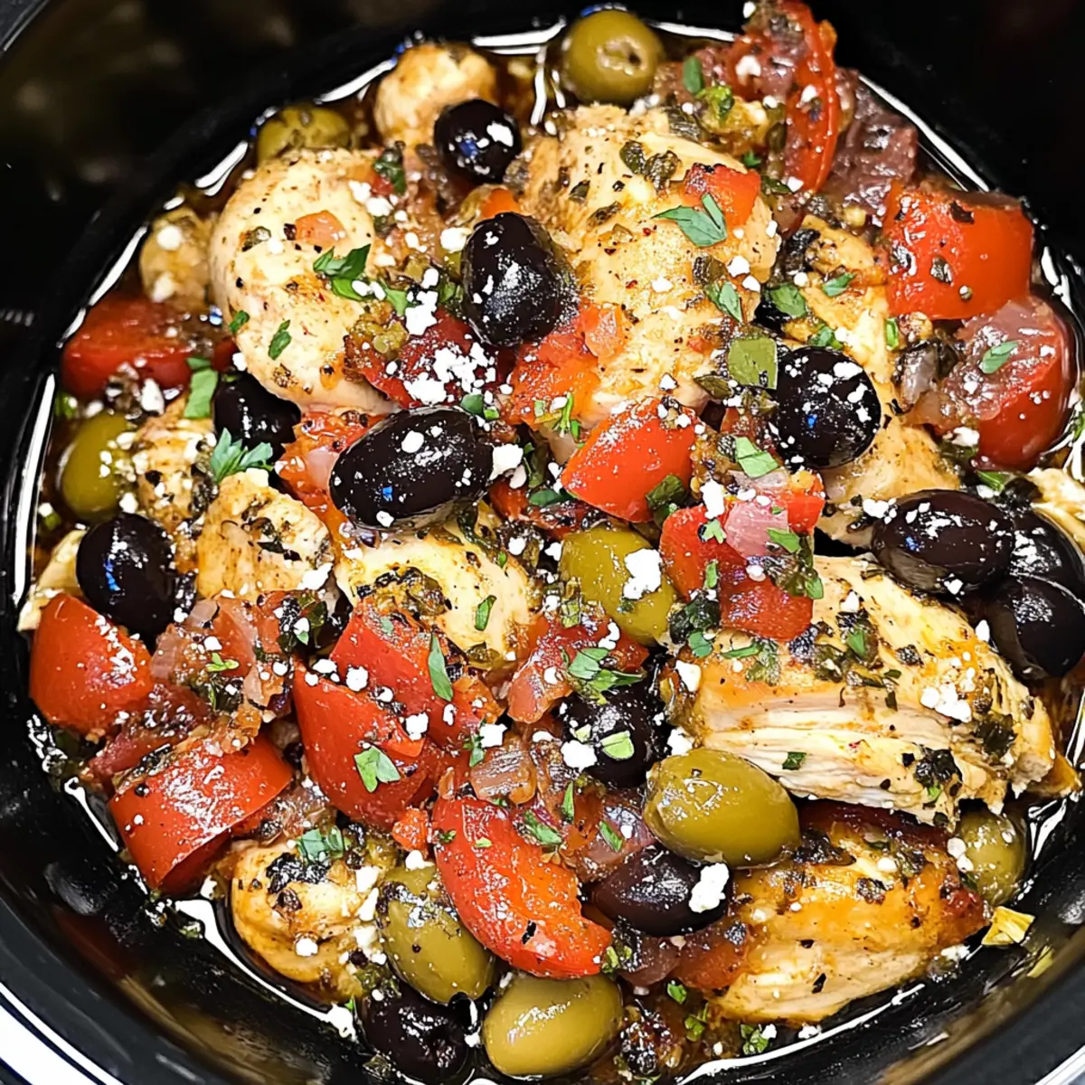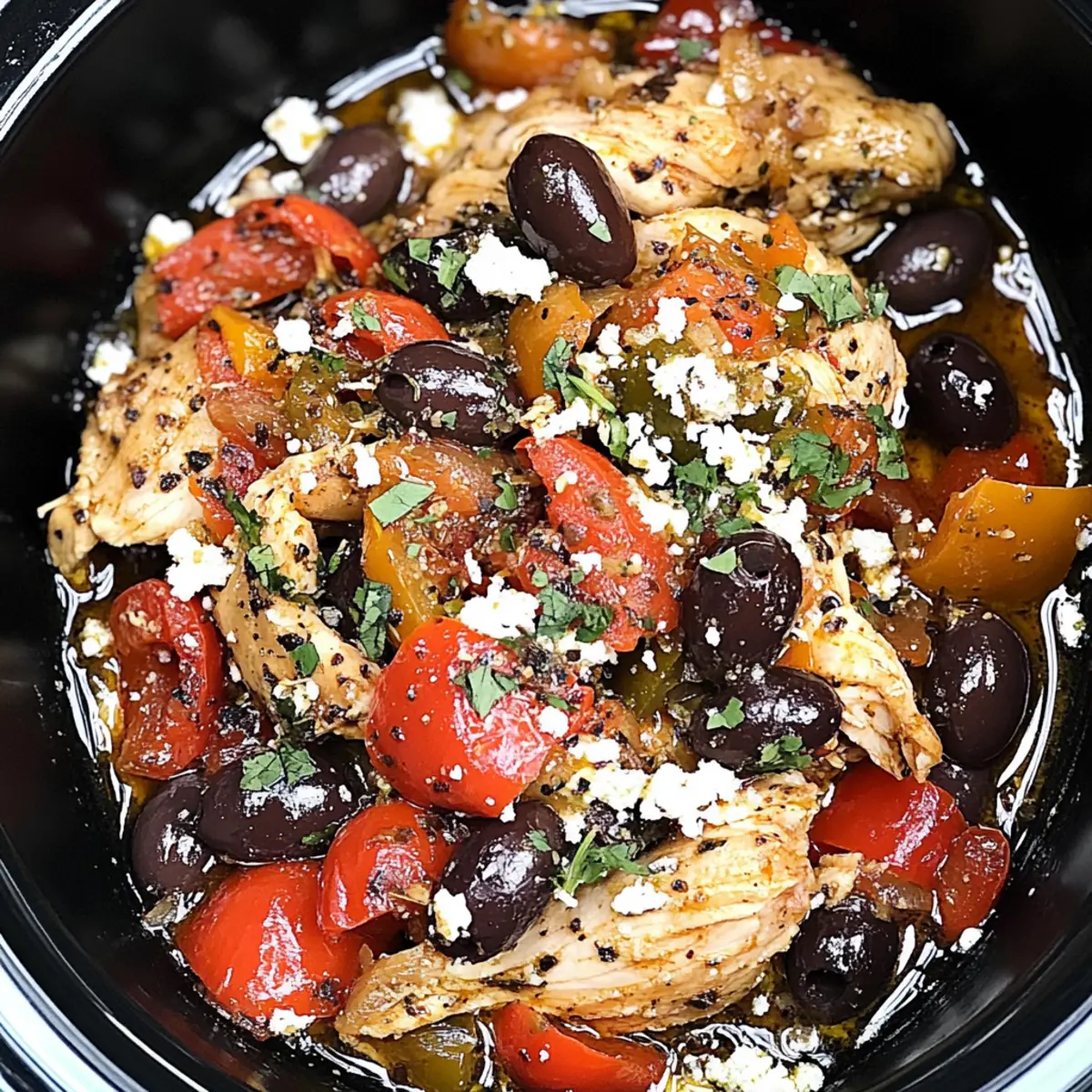 Jump to Recipe Print RecipeAs I stood in my kitchen, a warm aroma enveloped me, transporting me straight to the sun-soaked shores of Greece. This is the incredible magic of my Crockpot Greek Chicken, a dish that seamlessly blends convenience with mouthwatering Mediterranean flavors. Perfect for those busy weeknights, this recipe requires just 15 minutes of hands-on time, allowing you to savor a hearty and soothing meal without the fuss. The chicken thighs transform into tender, juicy bites, creating a comforting dining experience that’s as ideal for family gatherings as it is for impressing friends during casual get-togethers. Not only is it a versatile option for meal prep, but its enticing flavors make every bite a delightful escape. What will you pair with it—a zesty Lemon Rice or some fresh pita? Let’s dive into this culinary adventure together! Why is this recipe a must-try? Simplicity: With just 15 minutes of prep time, this Crockpot Greek Chicken is the ultimate solution for busy weeknights. Versatile: Enjoy it in a variety of ways—consider pairing it with zesty Lemon Rice, fresh pita, or even a vibrant Greek salad! Flavor Explosion: The combination of juicy chicken, savory olives, and aromatic herbs creates a delightful Mediterranean experience. Meal Prep-Friendly: Make a big batch to enjoy throughout the week or freeze for quick, satisfying meals on demand. Crowd-Pleaser: This dish will impress your guests with its rich flavors while being easy enough for everyday enjoyment! Crockpot Greek Chicken Ingredients For the Chicken Chicken Thighs – The main protein source, yielding tender, juicy meat when slow-cooked. Substitute with boneless chicken breasts but adjust cooking time. For the Vegetables Red Bell Pepper – Adds both sweetness and vibrant color, enhancing the dish visually and flavor-wise. Any color of bell pepper can be used. Olives – Brings a briny, savory note; ideal for amplifying the Greek flavor profile. Kalamata olives are preferred for authenticity. Onion – Contributes depth and aroma to the dish. Shallots can be substituted for a milder flavor. For Cooking Olive Oil – Essential for searing the chicken, enhancing its flavor. Can replace with vegetable oil if desired. Garlic – The cornerstone of flavor in this recipe, adding rich, aromatic undertones. Fresh garlic is best, but powdered can be used in a pinch. Dried Oregano – Infuses the dish with classic Mediterranean essence. Fresh oregano can be substituted (use 1 tablespoon). Embrace the magic of Crockpot Greek Chicken tonight, and enjoy the delightful flavors that will sweep you off your feet! Step‑by‑Step Instructions for Crockpot Greek Chicken Step 1: Sear the Chicken Begin by heating a tablespoon of olive oil in a skillet over medium-high heat. Once the oil shimmers, add the chicken thighs and sear them for about 5 minutes on each side until they develop a golden-brown crust. This optional step adds depth of flavor to your Crockpot Greek Chicken, ensuring every bite is rich and delicious. Step 2: Prepare the Vegetables In your crockpot, arrange the chopped red bell pepper, pitted olives, and diced onion around the seared chicken thighs. This colorful mix not only enhances the dish visually but also creates a fragrant base full of Mediterranean goodness. Make sure the vegetables are evenly distributed for optimal cooking. Step 3: Mix the Flavorful Sauce In a small bowl, whisk together minced garlic, dried oregano, and any additional seasonings you desire. Once blended, pour this aromatic mixture evenly over the chicken and vegetables in the crockpot. This marinade infuses the Crockpot Greek Chicken with mouthwatering flavors as it cooks gently for hours. Step 4: Slow Cook the Chicken Cover the crockpot with its lid and set it to cook on high for 3 to 4 hours or low for 6 to 8 hours. The slow cooking process will allow the chicken thighs to become incredibly tender and juicy, reaching an internal temperature of about 185°F for that perfect texture. Make sure to resist the temptation to constantly peek, as the steam is crucial for flavor development! Step 5: Serve and Enjoy Once your Crockpot Greek Chicken is cooked to perfection, carefully shred the chicken if you prefer smaller, bite-sized pieces. Serve it warm alongside zesty lemon rice, fresh pita, or vibrant salads. The enticing aroma and flavors will make this dish a favorite at your table, bringing everyone together for a delightful meal! Crockpot Greek Chicken Variations Feel free to get creative with your Crockpot Greek Chicken, making adjustments that suit your taste buds—imagine the delightful aromas wafting through your kitchen! Dairy-Free: Omit any added yogurt or cheese; enjoy the rich flavors without dairy guilt. Extra Veggies: Toss in sliced zucchini or cherry tomatoes for an added burst of color and nutrition. They’ll become wonderfully tender as they soak up the flavors! Spicy Kick: Add some red pepper flakes or diced jalapeños for a delightful heat boost. This twist will elevate your dish and please those who love a little zing! Citrusy Brightness: Squeeze fresh lemon juice over the chicken before serving for a zesty finish. The citrus notes will brighten every bite! Flavor Infusion: Use smoked paprika for a subtle smokiness that complements the Mediterranean profile wonderfully. It offers a unique depth that’s simply irresistible! Herb Variations: Experiment with fresh herbs like thyme or mint for a refreshing twist. They’ll transform the dish into a vibrant herbaceous experience. Serving Options: Enjoy it in pitas or atop a bed of quinoa for different textures. Dressed with a tangy sauce, each meal becomes a flavorful adventure! Grain Swap: Replace traditional sides with couscous or bulgur for a nutty addition that pairs beautifully with the chicken’s flavors, creating a satisfying, wholesome meal. Explore these variations and let your taste buds embark on a delightful Mediterranean journey! If you want t