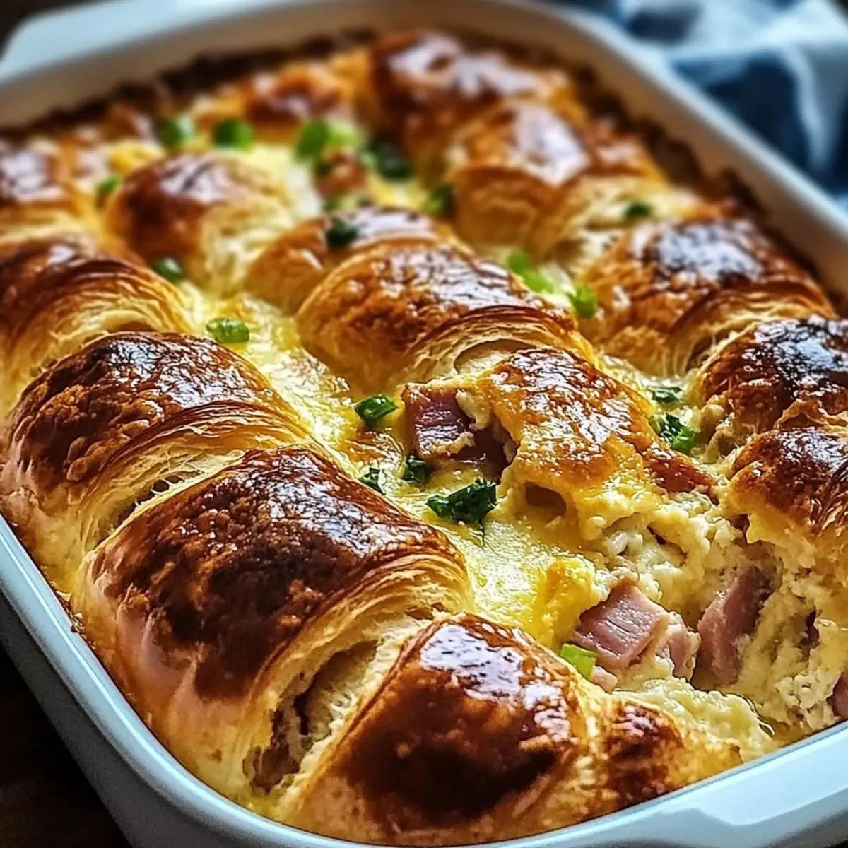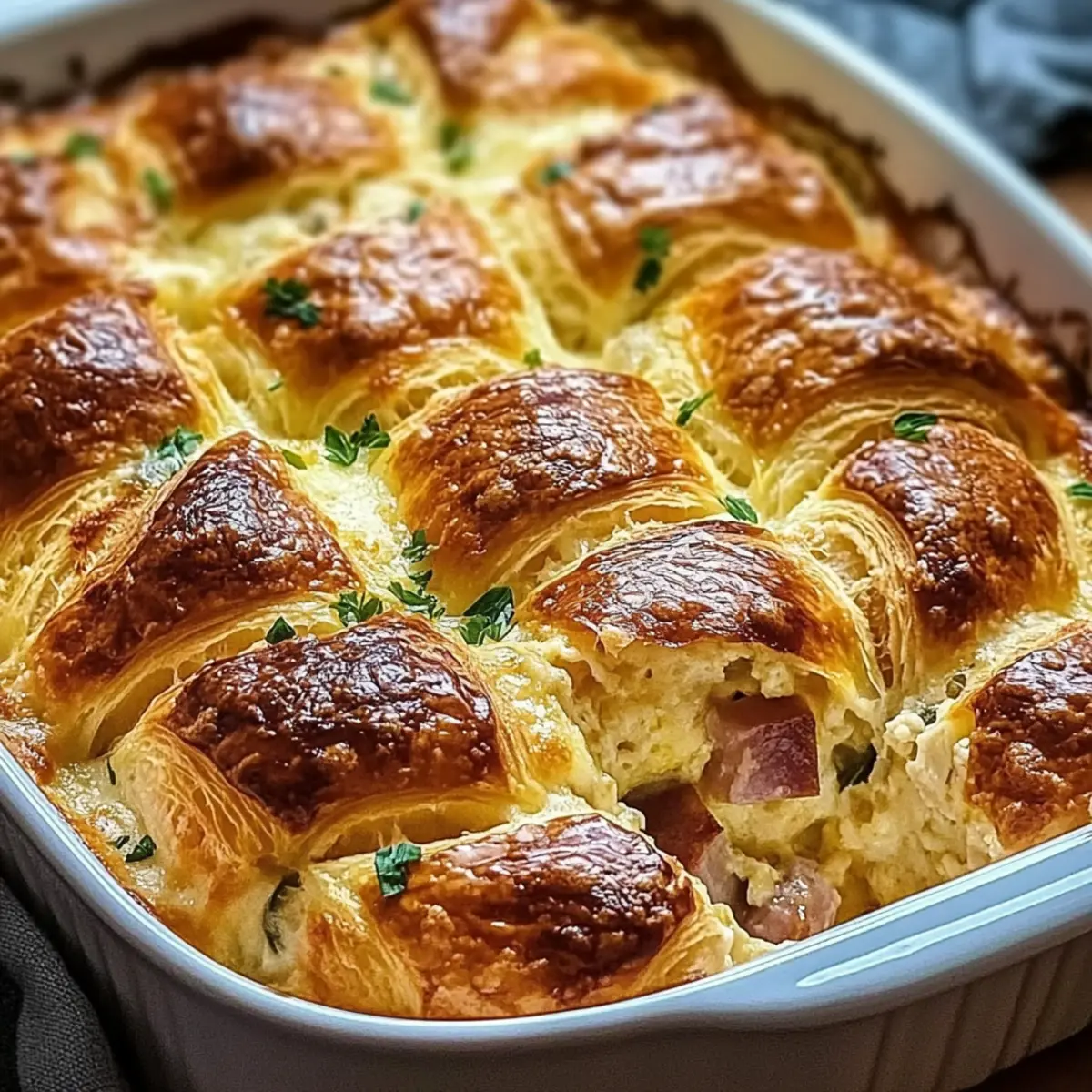 Jump to Recipe Print RecipeThe first light of dawn creeps in, greeted by the tantalizing scent of warm bread inviting you to rise and shine. If you’re on the lookout for a crowd-pleasing dish that effortlessly transforms breakfast or brunch, let me introduce you to the delightful Croissant Breakfast Casserole. This delectable bake combines the flaky layers of buttery croissants with creamy, fluffy eggs and savory ham, making it a hearty way to start your day. The best part? You can whip it up the night before, giving you the freedom to enjoy your morning coffee while your casserole bakes to perfection. Whether you’re feeding a hungry crowd or treating yourself to a cozy meal, this recipe is bound to impress. What special twist will you add to make it your own? Why is this casserole a breakfast dream? Easy Prep: This Croissant Breakfast Casserole can be made ahead of time, freeing you to relax and enjoy your morning. Crowd-Pleasing: Perfect for brunch gatherings, it’s sure to impress family and friends alike. Flavorful Layers: The buttery croissants soaked in egg mixture create a rich, comforting texture. Versatile Ingredients: Feel free to substitute vegetables for a delightful vegetarian option—perhaps Breakfast Granola Cups on the side? Perfect for Leftovers: Enjoy it for days as this casserole stays fresh in the fridge. Indulge in this delicious make-ahead dish for cozy mornings! Croissant Breakfast Casserole Ingredients For the Casserole • Croissants – Provide a flaky base; substitute with any flaky pastry or day-old bread for texture variation. • Eggs – Create the custardy structure; no direct substitutes recommended unless using egg replacements for allergies. • Whole Milk – Adds creaminess; use half-and-half for a richer flavor or dairy-free milk for a lighter option. • Shredded Cheddar Cheese – For a gooey texture; substitute with any melty cheese, like Monterey Jack, for a different twist. • Diced Cooked Ham – Introduces savory protein; can be omitted or replaced with sautéed spinach or mushrooms for a vegetarian Croissant Breakfast Casserole. • Diced Bell Peppers – Adds color and sweetness; substitute with any color bell pepper or other vegetables, such as zucchini. • Garlic Powder – Enhances flavor; fresh minced garlic can be used for a more robust taste. • Onion Powder – Complements the dish; fresh minced onion is a great alternative. • Salt & Pepper – For seasoning; adjust to taste based on preference. • Fresh Parsley – Adds freshness; no substitute needed, but can be omitted for simplicity. For Serving • Fresh Fruit – Pairs beautifully with the casserole for a balanced breakfast experience; consider berries or citrus for a refreshing touch. • Light Salad – A crisp salad can complement the rich casserole; use greens like arugula or spinach for a vibrant mix. • Crispy Bacon – Optional, but a delicious addition; opt for turkey bacon for a lighter option. Step‑by‑Step Instructions for Croissant Breakfast Casserole Step 1: Preheat the Oven Begin by preheating your oven to 350°F (175°C). While it heats, grease a 9×13-inch baking dish with cooking spray or butter to prevent sticking. A well-greased dish will help give your Croissant Breakfast Casserole a beautiful, golden-brown exterior, ensuring a delightful texture when baked. Step 2: Whisk the Egg Mixture In a large mixing bowl, whisk together the eggs, whole milk, garlic powder, onion powder, salt, and pepper until you achieve a light, fluffy consistency. This should take about 1-2 minutes. The goal is to combine all ingredients smoothly and create a rich custard base that will soak into the croissant pieces beautifully. Step 3: Prepare the Croissants Tear the croissants into bite-sized pieces and gently fold them into the egg mixture. Ensure each piece is abundantly coated; this will allow the croissants to absorb the custard, resulting in a moist and flavorful Croissant Breakfast Casserole. Let this mixture sit for a few minutes while you prepare the additional ingredients. Step 4: Add the Savory Ingredients Once the croissants are well-coated, mix in the diced cooked ham, bell peppers, and half of the shredded cheddar cheese. The savory ham and colorful bell peppers add flavor and texture, making this casserole not only delicious but visually appealing as well. Stir gently to combine without breaking the croissant pieces. Step 5: Transfer to Baking Dish Carefully pour the croissant mixture into the prepared baking dish, spreading it evenly with a spatula. Make sure all the ingredients are distributed well, as this will ensure each bite of your Croissant Breakfast Casserole is packed with flavor. The mixture should fill the dish to about ¾ full, leaving space for expansion as it bakes. Step 6: Add Cheese Topping Sprinkle the remaining shredded cheddar cheese evenly over the top of the casserole. This will create a wonderfully cheesy crust. As it bakes, the cheese will melt and turn a lovely golden brown, contrasting perfectly with the soft croissant base underneath. Step 7: Bake to Perfection Place the baking dish in the preheated oven and bake for 30-35 minutes. You’ll know it’s ready when the center sets and the top is a beautiful golden brown. Keeping an eye on it in the last few minutes will prevent overbaking, ensuring the casserole remains soft and flavorful. Step 8: Cool and Serve Once baked, remove the casserole from the oven and let it cool for 5-10 minutes. This cooling time allows it to firm up slightly, making slicing easier. Garnish with freshly chopped parsley for a touch of color and serve warm. Your Croissant Breakfast Casserole is now ready to impress family and friends! Storage Tips for Croissant Breakfast Casserole Fridge: Store any leftovers in an airtight container for up to 3 days to keep your delicious Croissant Breakfast Casserole fresh and tasty. Freezer: If you want to enjoy it later, wrap the casserole tightly in plastic wrap 