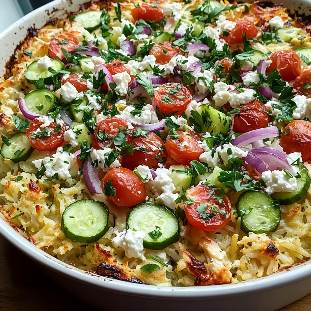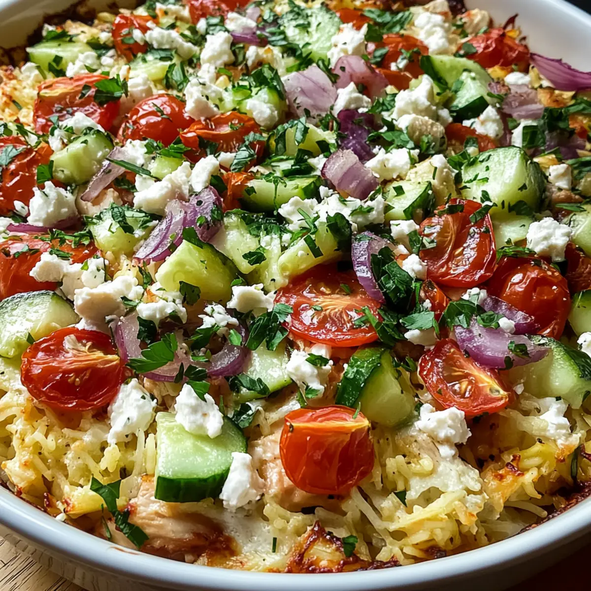 Jump to Recipe Print RecipeThe aroma of Mediterranean spices wafting through the kitchen can transport you to sun-drenched shores in an instant. That’s how I felt when I first created this Dump-and-Bake Chicken Tzatziki Casserole. It’s a breeze to make and embodies the vibrant flavors of the Mediterranean, combining tender chicken, fluffy rice, and crisp vegetables—everything coated in a luscious tzatziki sauce. This easy dinner is perfect for busy weeknights and ensures you spend less time in the kitchen and more time enjoying delicious homemade food with your loved ones. Plus, it’s a family-friendly dish that delights even the pickiest eaters! Are you ready to dive into the world of comforting Mediterranean flavors with me? Why is this Casserole a Must-Try? Simplicity at its finest: With just a few steps, you’ll have a scrumptious meal ready to go, no complicated techniques required! Vibrant flavors abound: The creamy tzatziki beautifully complements the savory chicken, bringing those Mediterranean notes right to your dinner table. Adaptable for any diet: Whether you’re a meat lover or prefer a vegetarian option, this casserole easily accommodates various substitutions, ensuring everyone can enjoy it. Time-saving perfection: Get all the goodness of a homemade Mediterranean feast in just over an hour—ideal for busy weeknights! Impressive crowd-pleaser: With its colorful presentation and rich taste, it’s sure to wow your family and guests alike! For a delightful side, consider pairing it with a fresh salad or perhaps a warm pita, similar to what you’d enjoy with our Keto Chicken Alfredo. Dump-and-Bake Chicken Tzatziki Casserole Ingredients • Dive into the vibrant world of flavors with this Dump-and-Bake Chicken Tzatziki Casserole that makes dinner a breeze! For the Casserole Cooked Chicken – Provides protein and flavor. Substitution: Use cooked rotisserie chicken or swap for firm tofu for a vegetarian version. Uncooked White Rice – Acts as the carbohydrate base that absorbs flavors during baking. Note: Short or medium-grain rice works best. Chicken Broth – Adds moisture and flavor to the rice. Substitution: Use vegetable broth for a vegetarian option. Cucumber (diced) – Provides freshness and crunch. Substitution: Zucchini can be used for a similar texture. Red Onion (finely chopped) – Adds mild sharpness and contrast to the casserole. Substitution: Green onions or shallots may also work. Grape Tomatoes (halved) – Contribute juicy sweetness and color. Substitution: Cherry tomatoes can be used for a similar effect. Kalamata Olives (pitted and sliced) – Provide brininess and depth. Note: Black olives can replace them, albeit with a different flavor profile. Greek-Style Tzatziki Sauce – Melts into the dish, offering creaminess and tang. Substitution: Mix Greek yogurt with diced cucumber, dill, and a splash of lemon juice for a quick homemade version. Garlic Powder – Enhances overall flavor. Tip: Fresh minced garlic can be used for a more potent taste. Dried Oregano – Infuses the dish with Mediterranean flavor. Substitution: Italian seasoning can be used as an alternative. Salt and Pepper – Essential for seasoning to taste. For the Topping Feta Cheese (crumbled) – Melts and adds a rich, salty flavor to the top of the casserole. Substitution: Goat cheese for a tangy variation. Fresh Parsley (chopped for garnish) – Adds a fresh herbal note and enhances presentation. Step‑by‑Step Instructions for Dump-and-Bake Chicken Tzatziki Casserole Step 1: Preheat the Oven Begin by preheating your oven to 375°F (190°C). While the oven warms up, take a moment to grease a 9×13-inch baking dish with a bit of olive oil or cooking spray to prevent sticking. This quick step will help ensure your Dump-and-Bake Chicken Tzatziki Casserole comes out perfectly golden and easy to serve. Step 2: Prepare the Rice Base Once the baking dish is ready, evenly spread uncooked white rice across the bottom. Make sure to distribute it evenly to allow for consistent cooking. The rice will absorb the flavors as it bakes, leading to a fluffy and delicious base for your casserole. Step 3: Add the Chicken Broth Carefully pour chicken broth over the rice, ensuring that every grain is fully submerged. This will provide the necessary moisture for the rice to cook properly. The rich broth infuses flavor into the dish, taking your Dump-and-Bake Chicken Tzatziki Casserole to the next level of deliciousness. Step 4: Layer the Cooked Chicken Next, take your cooked chicken, whether it’s shredded or chopped, and distribute it evenly over the layer of rice. The chicken adds protein and heartiness to the casserole, ensuring it’s a filling meal perfect for busy weeknights. Step 5: Add Fresh Vegetables Now, layer the diced cucumber, finely chopped red onion, halved grape tomatoes, and sliced Kalamata olives on top of the chicken. This combination not only introduces fresh flavors and vibrant colors but also adds a delightful crunch to each bite of your casserole. Step 6: Mix the Tzatziki Sauce In a small bowl, mix the Greek-style tzatziki sauce with garlic powder, dried oregano, salt, and pepper until well combined and smooth. This creamy mixture will envelop your casserole in Mediterranean goodness. Spread it evenly over the layered ingredients for a rich flavor. Step 7: Top with Feta Cheese Sprinkle crumbled feta cheese generously across the top of the casserole. As it bakes, the feta will melt slightly, enriching the flavors with its salty, creamy notes. This step enhances both taste and presentation, giving your Dump-and-Bake Chicken Tzatziki Casserole that special finishing touch. Step 8: Bake the Casserole Cover the baking dish tightly with aluminum foil and place it in your preheated oven. Bake for 45 minutes, allowing all the flavors to meld together beautifully. After 45 minutes, remove the foil and bake uncovered for an additional 10 minutes, until the top is golden and bubbly. St