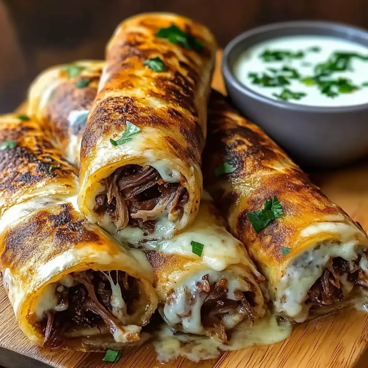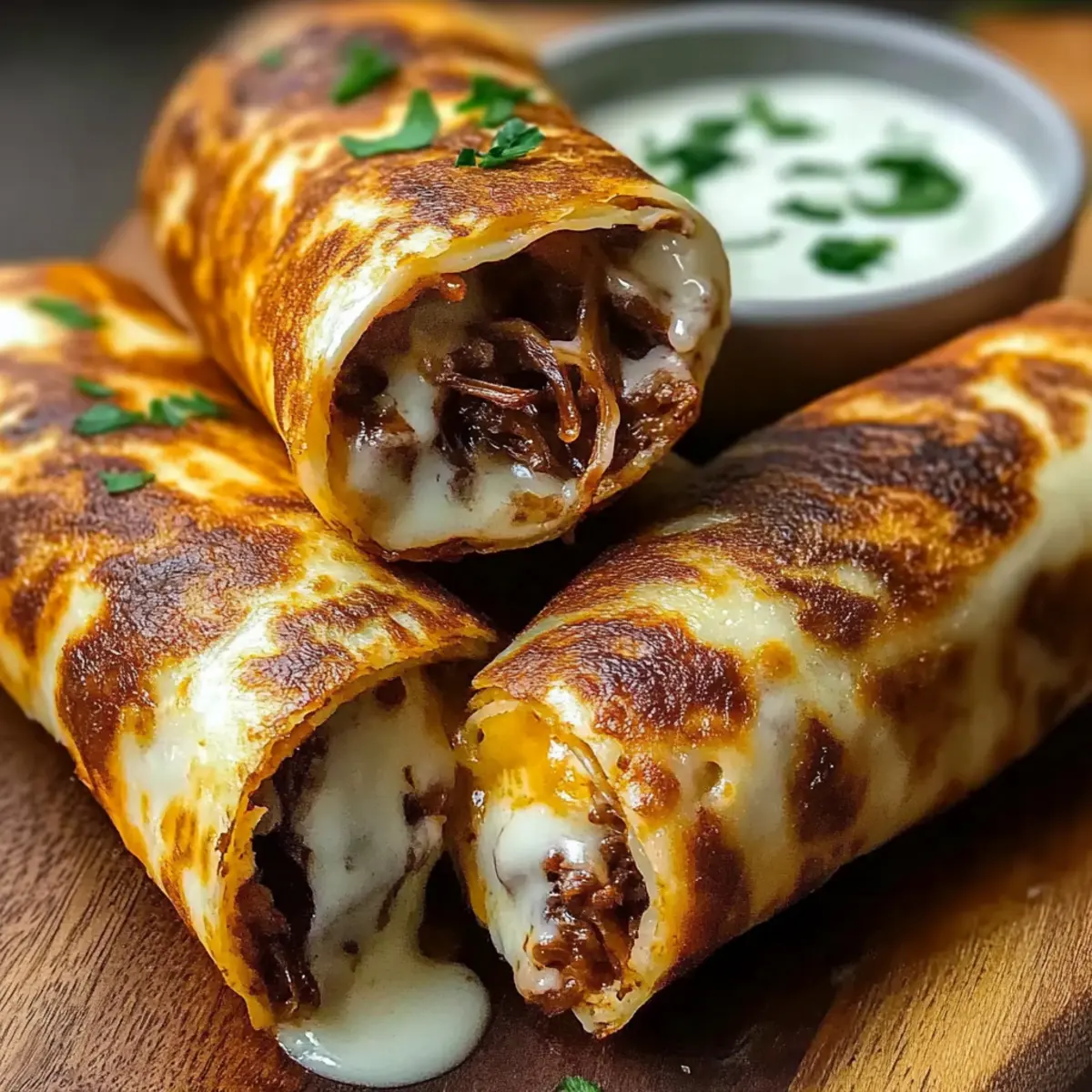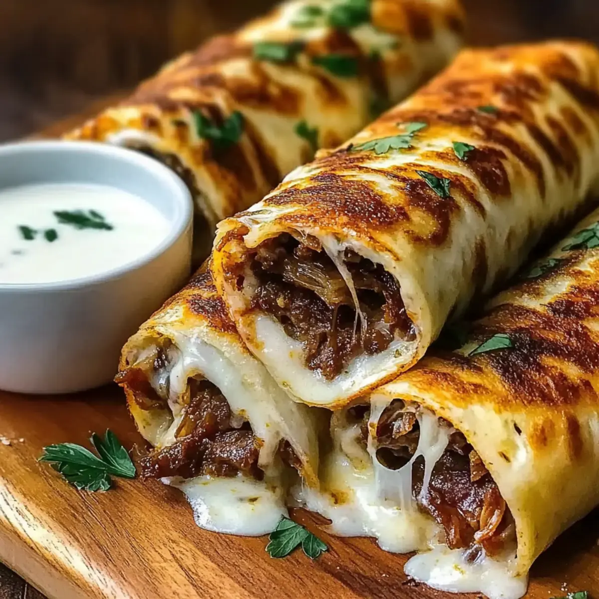 Jump to Recipe Print RecipeAs I unwrapped my favorite leftover roast beef for a quick bite, the thought struck me: why not transform this classic into something utterly captivating? Enter the Easy Cheesy French Dip Tortilla Roll Ups! These delightful handheld meals capture all the savory richness of a traditional French dip sandwich, yet come together in just 25 minutes. They’re perfect for those busy weeknights or when you’re hosting friends and need a crowd-pleaser without the stress. With just a few simple ingredients, you can create a comforting dish that’s not only quick to prepare but also low in lactose, making it an inviting option for everyone. Curious about how to roll up this flavor-packed experience? Let’s dive into the recipe! Why are Tortilla Roll Ups so irresistible? Quick and Easy: With just 25 minutes from prep to table, these roll-ups fit perfectly into any busy lifestyle. Flavor Explosion: The rich, savory taste of roast beef combined with gooey melted cheese creates an unforgettable bite that’ll have you coming back for more. Handheld Delight: These portable delights make for a fantastic snack or meal, perfect for gatherings or cozy nights in. Customizable Options: Whether you want to spice things up or keep it classic, variations like adding jalapeños or swapping cheese keep things interesting. Crowd-Pleasing Comfort: Perfectly suited for satisfying cravings, these roll-ups will impress friends and family alike, making them a new favorite! Consider pairing them with your favorite dipping sauces or enjoying them alongside a refreshing salad. French Dip Tortilla Roll Ups Ingredients • Ready to create this savory delight? Let’s gather everything you need! For the Roll Ups 1 lb thinly sliced roast beef – The star of the show, for juicy and savory goodness. 1½ cups shredded mozzarella or provolone – Choose mozzarella for a melty stretch or provolone for added flavor depth. 4 large flour tortillas – Soft and durable, perfect for wrapping all the deliciousness. 2 tablespoons melted butter – A golden touch to give your roll-ups a crispy exterior. 1 teaspoon garlic powder – Infuses warmth and aroma into every bite. 1 teaspoon onion powder – Provides essential savory notes, enhancing overall flavor. 1 teaspoon dried parsley – Adds a pop of color and a hint of freshness. For the Au Jus (Dipping Sauce) 2 cups beef broth – A rich base that brings the sauce to life. 1 tablespoon Worcestershire sauce – Deepens the umami experience effortlessly. 1 teaspoon soy sauce – A little boost to the savory profile of your dipping sauce. 1 teaspoon garlic powder – Extra flavor to match the buttery rolls. 1 teaspoon onion powder – Complements the garlic for a layered taste. Salt & pepper to taste – Essential to balance and enhance all flavors. Now that you have everything ready, you’re just minutes away from enjoying the delightful taste of French Dip Tortilla Roll Ups! Step‑by‑Step Instructions for French Dip Tortilla Roll Ups Step 1: Preheat the Oven Begin by preheating your oven to 375°F (190°C). While the oven warms up, line a baking sheet with parchment paper to prevent sticking and ensure easy cleanup. This setup will ensure that your French Dip Tortilla Roll Ups bake evenly and achieve a perfect crispy exterior. Step 2: Assemble the Tortillas Lay the large flour tortillas flat on a clean surface. In the center of each tortilla, layer thinly sliced roast beef and a generous amount of shredded cheese, leaving about an inch of space at the edges. This step is crucial for keeping the fillings secure as you roll up, ensuring each bite is deliciously cheesy and meaty. Step 3: Roll the Tortillas Carefully fold in the sides of each tortilla and then roll them tightly from the bottom up, encasing the fillings. Place the roll-ups seam-side down on the prepared baking sheet to help them hold their shape during baking. This technique is important for a mess-free cooking experience that allows the cheese to melt perfectly inside. Step 4: Prepare the Topping Using a pastry brush, generously brush each tortilla roll-up with melted butter. Then, evenly sprinkle the tops with garlic powder, onion powder, and dried parsley. This step adds flavor and helps achieve a beautiful golden color on your French Dip Tortilla Roll Ups as they crisp up in the oven. Step 5: Bake the Roll Ups Slide the baking sheet into the preheated oven and bake for 12–15 minutes. Keep an eye on the roll-ups, and look for them to turn golden brown and become crispy, with the cheese melting and bubbling inside. This visual cue signals that your tasty treat is almost ready to enjoy. Step 6: Prepare the Au Jus While the roll-ups are baking, prepare the dipping sauce. In a saucepan, combine beef broth, Worcestershire sauce, soy sauce, garlic powder, onion powder, and a pinch of salt and pepper. Bring this mixture to a simmer over medium heat for about 5–7 minutes, stirring occasionally to blend the flavors. This savory au jus complements the roll-ups perfectly. Step 7: Serve and Enjoy Once the French Dip Tortilla Roll Ups are golden and crispy, remove them from the oven and let them cool slightly. Slice each roll-up into manageable pieces, and serve warm alongside the prepared au jus for dipping. Gather your family or friends around to experience these delicious handheld delights together! Make Ahead Options These Easy Cheesy French Dip Tortilla Roll Ups are a fantastic choice for meal prep, saving you time during those busy weeknights! You can prepare the roll-ups up to 24 hours in advance by assembling them and placing them in an airtight container in the refrigerator. To maintain their crispiness, brush them with melted butter and season them just before baking. When you’re ready to enjoy, simply pop them into a preheated oven at 375°F (190°C) for 12–15 minutes until crispy and golden. This way, you’ll have flavorful roll-ups ready to serve with minimal effort, ensuring the