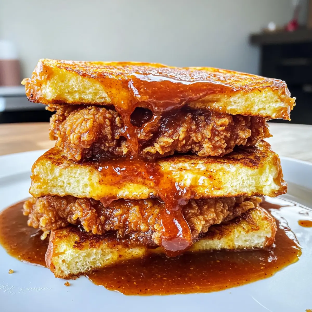 This French Toast Fried Chicken Sandwich combines crispy fried chicken and soft French toast, topped with bourbon sweet chili sauce for an unforgettable flavor.