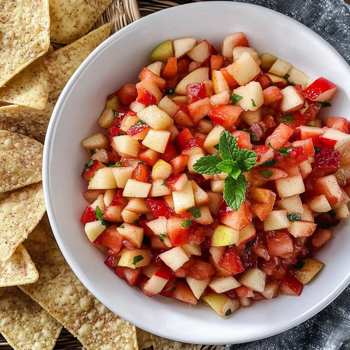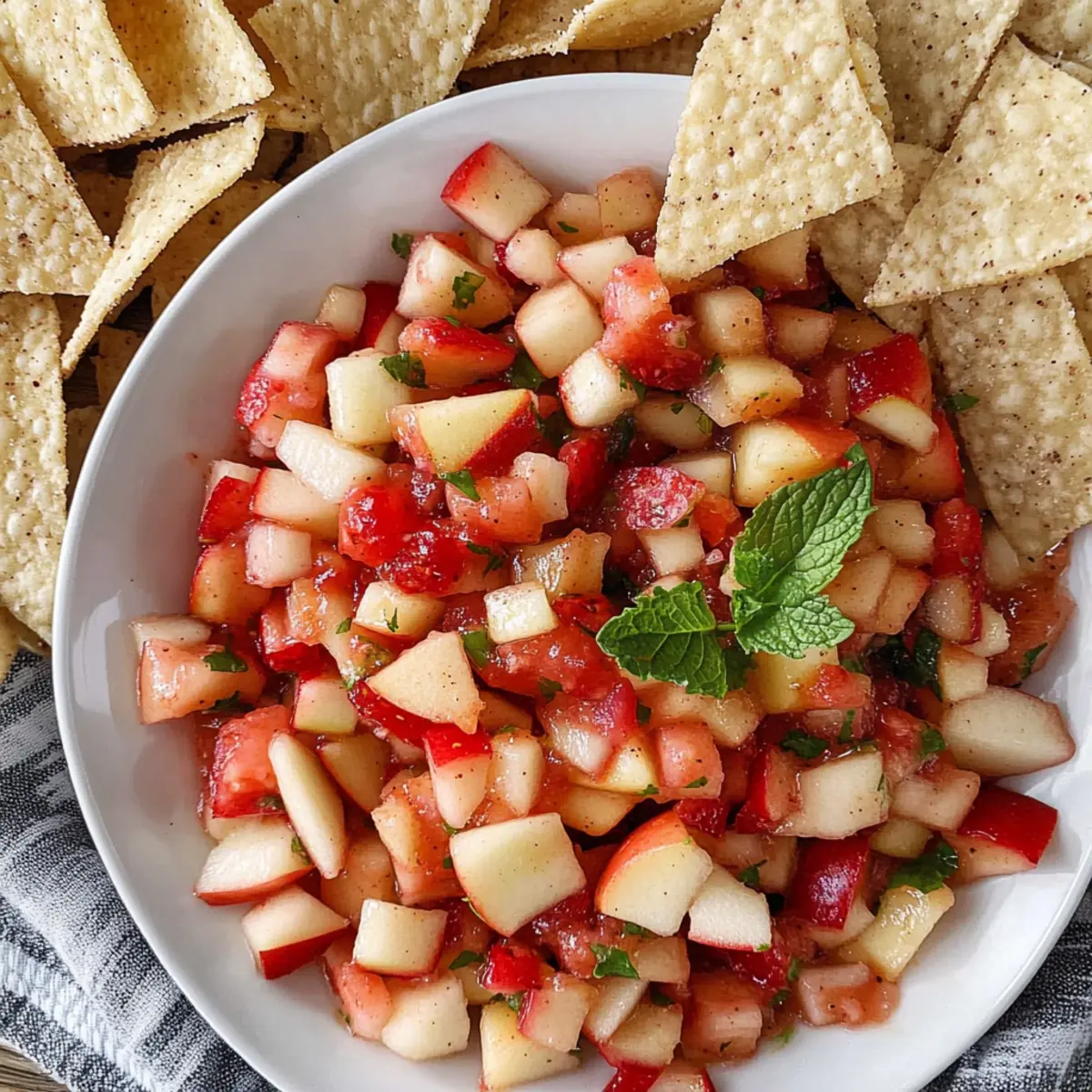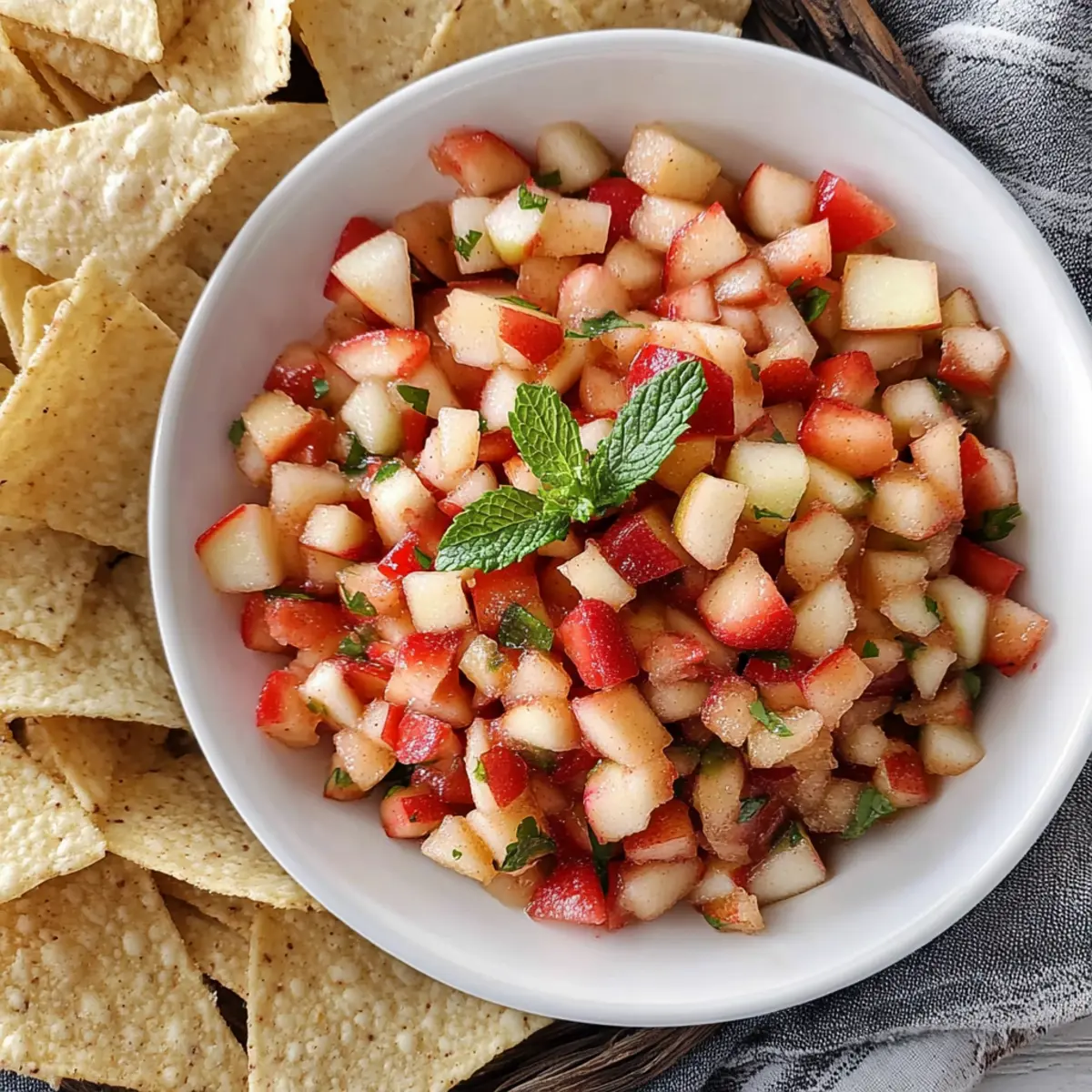 Jump to Recipe Print RecipeIn the heart of summer, when strawberries are at their juiciest, I stumbled upon a vibrant twist to my usual snacking routine—Fresh Apple Salsa with Strawberries. This delightful combo marries the crispness of tart apples with the natural sweetness of ripe strawberries, creating a refreshing dip that’s both invigorating and easy to whip up. Whether you’re hosting a sun-soaked gathering or simply looking to elevate your afternoon munching, this salsa offers a deliciously healthy escape from fast food without compromising on flavor. With just a handful of ingredients and a sprinkle of fresh mint, you’ll have a snack or appetizer that dazzles the palate and looks fabulous on any table. Curious how to make this fruity delight come alive? Let’s dive into the recipe! Why is Fresh Apple Salsa a Must-Try? Vibrant Colors: The striking contrast of green apples and red strawberries creates a visually appealing dish that brightens any table. Refreshing Flavor: Each bite offers a delightful burst of sweetness balanced with a tangy zing, making it ideal for warm weather. Easy Preparation: With minimal chopping and tossing, you can create this salsa in no time—perfect for busy days or spontaneous gatherings. Versatile Serving Options: Pair it with homemade cinnamon sugar tortilla chips or use it as a topping for desserts like vanilla ice cream. Healthy Snacking: At just 42 calories per serving, this delight not only satisfies your sweet tooth but also keeps your nutrition in check—perfect for anyone looking to ditch fast food. Fresh Apple Salsa Ingredients Unlock the deliciousness of Fresh Apple Salsa with Strawberries! For the Salsa Medium Apples – Provides crunch and tartness; substitute with firm, sweet varieties like Honeycrisp or Gala for a sweeter taste. Medium Strawberries – Adds natural sweetness and a soft texture; fresh blackberries or raspberries can be used as a substitute if needed. Fresh Mint – Enhances freshness and aroma; feel free to swap with herbs like basil for a different flavor twist. Orange Juice – Offers acidity and sweetness to balance flavors; fresh juice is recommended for the best taste, though bottled juice works in a pinch. Orange Zest – Adds aromatic oils and elevates citrus flavors; omit if unavailable, but it’s a great addition for depth. Lemon Juice – Provides extra acidity; lime juice can be used for a different zing. Brown Sugar – Sweetens the salsa and complements the tart fruits; honey or agave syrup can be used as substitutions. Salt – Enhances flavor; just a pinch will do, adjust according to your preference. This cozy blend of ingredients promises to bring a refreshing twist to your snacking routine! Step‑by‑Step Instructions for Fresh Apple Salsa with Strawberries Step 1: Prepare the Apples Begin by washing and coring your medium apples, then finely chop them into small pieces, about a quarter-inch in size. Place the chopped apples in a large mixing bowl, ensuring they are spread evenly for easy mixing later. This step serves as the refreshing base for your Fresh Apple Salsa with Strawberries, adding a crisp texture. Step 2: Chop the Strawberries Next, take your medium strawberries and carefully remove their green tops. Finely chop the strawberries into small pieces, similar in size to the apples, so they blend seamlessly in your salsa. Once chopped, add the strawberries to the bowl with the apples, creating a colorful mix that’s bursting with sweetness and vibrancy. Step 3: Add Fresh Mint Finely dice a handful of fresh mint, releasing its aromatic oils, and add it to the fruit combination in the bowl. The mint will bring a refreshing lift to the Fresh Apple Salsa with Strawberries, contrasting beautifully with the sweet fruits. Gently fold the mint into the mixture, allowing it to distribute evenly throughout the salsa. Step 4: Incorporate Citrus Juices Now, zest an orange and add the orange zest to the bowl for a delightful citrus aroma. Then, pour in fresh orange juice along with a splash of lemon juice. These bright flavors will enhance the natural sweetness of the salsa, providing that necessary tangy balance. Mix gently to combine all the flavors without mashing the fruits. Step 5: Sweeten and Season Sprinkle in some brown sugar and a pinch of salt over the mixture. The brown sugar will complement the tartness of the apples while enhancing the overall sweetness of the salsa. Stir the ingredients gently until everything is well coated with the sweet, citrusy juices, ensuring an even distribution of flavors. Step 6: Final Toss and Serve Using a spatula, gently toss the Fresh Apple Salsa with Strawberries until all the ingredients are fully combined. Aim for a colorful mixture that highlights the vibrant notes of the fruits. Serve immediately for the freshest taste, ideally alongside homemade cinnamon sugar tortilla chips for a delightful snack or appetizer experience. Make Ahead Options These Fresh Apple Salsa with Strawberries are a fantastic option for meal prep! You can chop the apples and strawberries up to 24 hours in advance, storing them separately in airtight containers in the refrigerator to maintain their crispness. Similarly, you can finely dice the mint and combine it with the citrus juices (orange and lemon) for a refreshing flavor boost. Keep the brown sugar and salt aside, and when you’re ready to serve, simply mix all the prepped ingredients together, sprinkle with the brown sugar, and toss gently to combine. This method ensures your salsa stays fresh and vibrant while saving you precious time during busy weeknights or unexpected gatherings. How to Store and Freeze Fresh Apple Salsa with Strawberries Fridge: Store leftovers in an airtight container for up to 1-2 days. This helps maintain freshness and flavor, though the texture may change as the fruits release their juices. Room Temperature: Avoid keeping Fresh Apple Salsa at room temperature for prolonged periods, especially