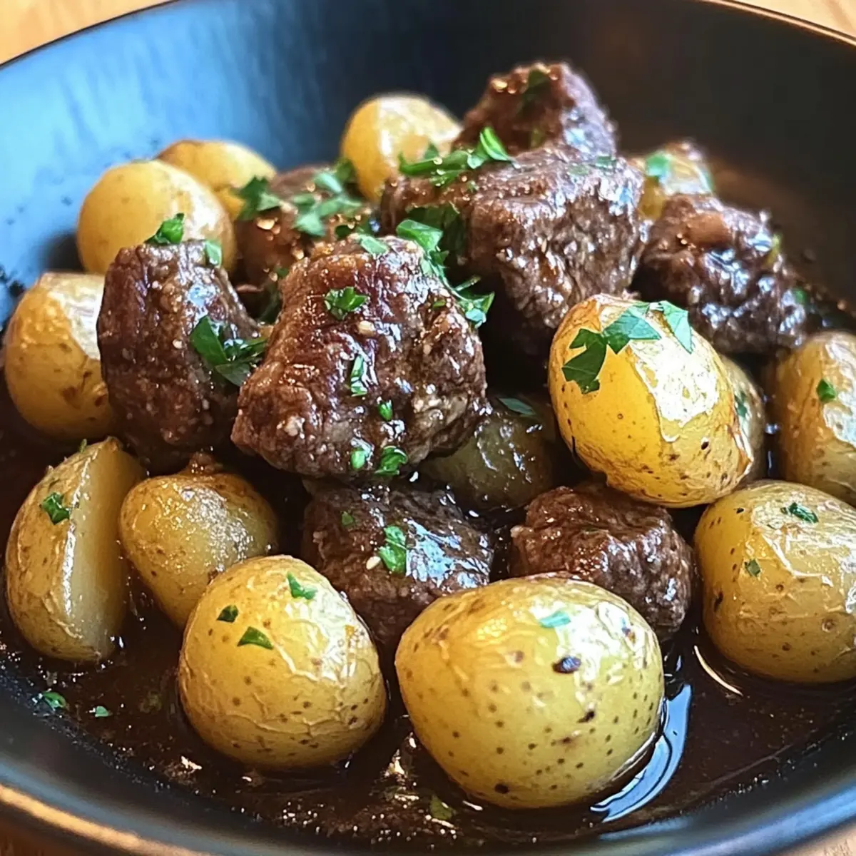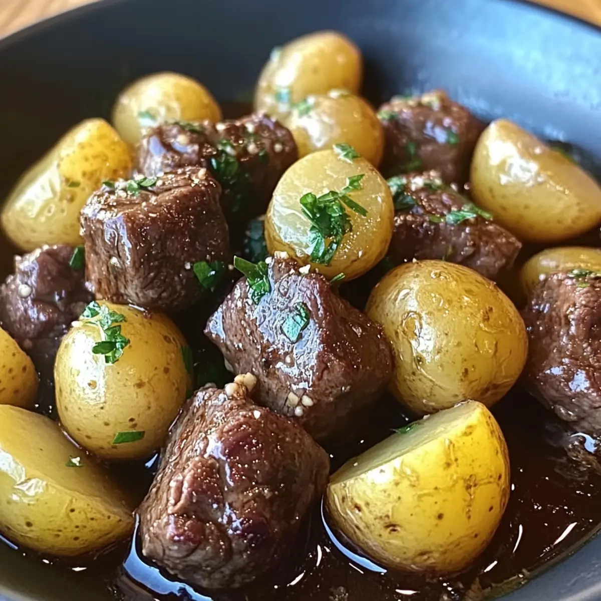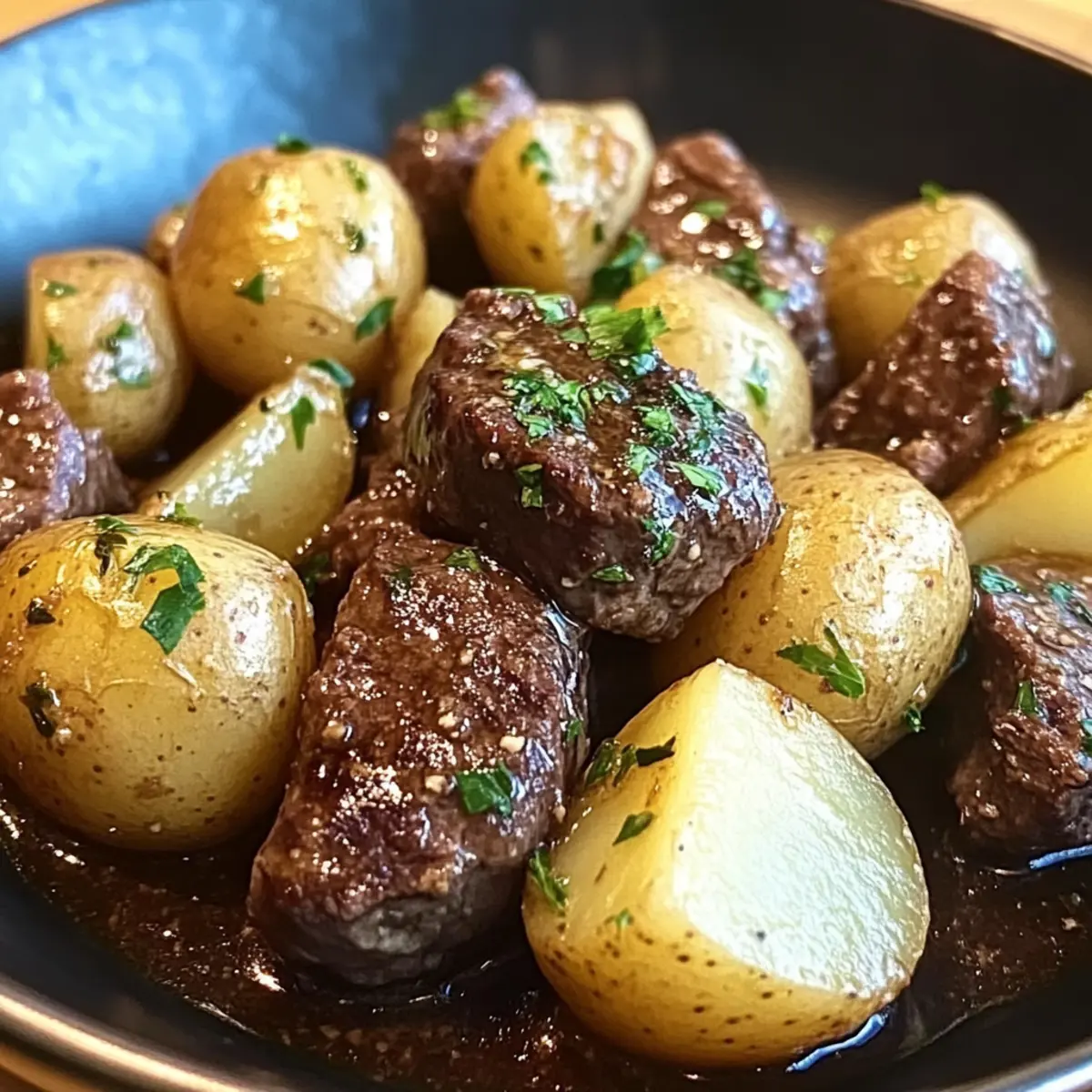 Jump to Recipe Print RecipeThe aroma of garlic wafting through the house can instantly transport me to my favorite cozy restaurant, where comfort food reigns supreme. Enter my Garlic Butter Beef Bites with Potatoes—a recipe that not only captures those familiar flavors but also transforms your kitchen into a haven of warmth and indulgence. With just 15 minutes of prep time, this slow cooker dish is perfect for busy weeknights or when you’re entertaining family and friends. You’ll love how easily it adapts to your taste: swap cuts of beef or toss in your favorite veggies for a personalized spin. Best of all, the melt-in-your-mouth beef combined with tender potatoes drenched in a luscious garlic butter sauce creates a meal that feels as good as it tastes. Curious about how to bring this hearty comfort dish to your table? Let’s dive into the recipe! Why Choose Garlic Butter Beef Bites? Simplicity: This recipe takes only 15 minutes of prep time, making it a breeze for busy cooks. Melt-in-your-Mouth Tenderness: The slow-cooking method ensures the beef bites turn out incredibly tender and flavorful, perfect for comforting weeknight dinners. Customizable: Easily swap in your favorite cuts of beef or seasonal veggies to create a personalized dish that suits your family’s tastes. How about trying it with Hasselback Potatoes Garlic on the side? Hearty & Satisfying: Each serving packs a punch of rich protein, with about 30-35 grams per portion, leaving everyone feeling full and satisfied. Crowd-Pleaser: The savory garlic butter sauce will win over guests of all ages, making it a fantastic option for gatherings or family meals. With its delightful flavors and comforting aroma, your kitchen will feel like the warmest spot in the house! Garlic Butter Beef Bites Ingredients For the Beef • Beef stew meat – Provides a rich protein base, adding depth to the dish. Substitution: Chuck roast or brisket for more flavor. For the Potatoes • Baby potatoes – Adds a comforting texture that pairs perfectly with beef. Preparation: Halve for even cooking to ensure tenderness. For the Garlic Butter Sauce • Unsalted butter – Creates the luxurious garlic butter sauce that ties everything together. Note: Melting before mixing enhances flavor distribution. • Garlic (3 cloves, minced) – This aromatic flavor powerhouse elevates the dish. Tip: Fresh garlic preferred for a more vibrant taste. • Onion powder – Adds depth to the overall flavor profile. Consider mixing with garlic for a robust base flavor. • Smoked paprika – Infuses a subtle smoky undertone. Optional: Use regular paprika if you prefer a milder flavor. • Dried thyme – Enhances the aromatic quality of the sauce. Fresh thyme can work wonders—just adjust the amount as needed. • Dried rosemary – Complements the other herbs with its fragrant touch. Fresh could be better; adjust the quantity for intensity. • Salt – Essential for enhancing all the flavors in the dish. Tip: Adjust based on the sodium level of your broth. • Black pepper – For overall seasoning that balances the richness. Consider adding red pepper flakes for a hint of heat if desired. For Cooking • Beef broth (1/4 cup) – Keeps the dish moist during the slow cooking process. Opt for low-sodium broth to control salt levels. • Olive oil – Used to sear the beef, locking in those delicious juices. Tip: Use a high smoke point oil for optimal browning. With these carefully chosen ingredients, you’re just moments away from creating the delicious Garlic Butter Beef Bites & Potatoes that will warm your heart and satisfy your cravings! Step‑by‑Step Instructions for Garlic Butter Beef Bites & Potatoes Step 1: Prepare the Ingredients Begin by cutting the beef stew meat into bite-sized pieces, ensuring they’re uniform for even cooking. Next, halve the baby potatoes, which will help them cook through and absorb the flavors of the garlic butter sauce better. Have all your ingredients measured and ready for a smooth cooking experience. Step 2: Optional Potato Parboiling If you desire to speed up the cooking process for your baby potatoes, bring a pot of salted water to a boil and parboil the halved potatoes for about 5 minutes until they are slightly tender but not fully cooked. Drain and set aside; this step will enhance their texture when slow-cooked with the beef. Step 3: Sear the Beef Heat a tablespoon of olive oil in a skillet over medium-high heat. Once the oil is shimmering, add the beef pieces in a single layer, searing them for about 3-4 minutes per side until they are nicely browned. This step locks in the juices and adds a delicious depth of flavor to your Garlic Butter Beef Bites. Step 4: Make the Garlic Butter Sauce In a mixing bowl, combine the melted unsalted butter, minced garlic, onion powder, smoked paprika, dried thyme, and rosemary. Season the mixture with salt and black pepper to taste. Stir well until all the ingredients are thoroughly incorporated, creating a rich garlic butter sauce that will coat both the beef and potatoes beautifully. Step 5: Assemble in the Slow Cooker In your slow cooker, layer the parboiled halved potatoes evenly across the bottom. Next, add the seared beef pieces on top of the potatoes. Pour the garlic butter sauce generously over the beef and potatoes, ensuring everything is well coated. Finally, pour in the beef broth to keep the dish moist and enhance the flavors as it cooks. Step 6: Slow Cook the Mixture Cover the slow cooker with its lid and set it to cook on low for 6-8 hours or on high for 3-4 hours. The goal is to have the beef become fork-tender and the potatoes fully cooked—check for doneness by piercing the beef with a fork. The aroma of Garlic Butter Beef Bites & Potatoes will fill your kitchen! Step 7: Rest and Serve Once cooked, take the slow cooker off the heat and let the dish rest for about 10 minutes with the lid on. This resting phase allows the flavors to meld beautifully. Then, serve th