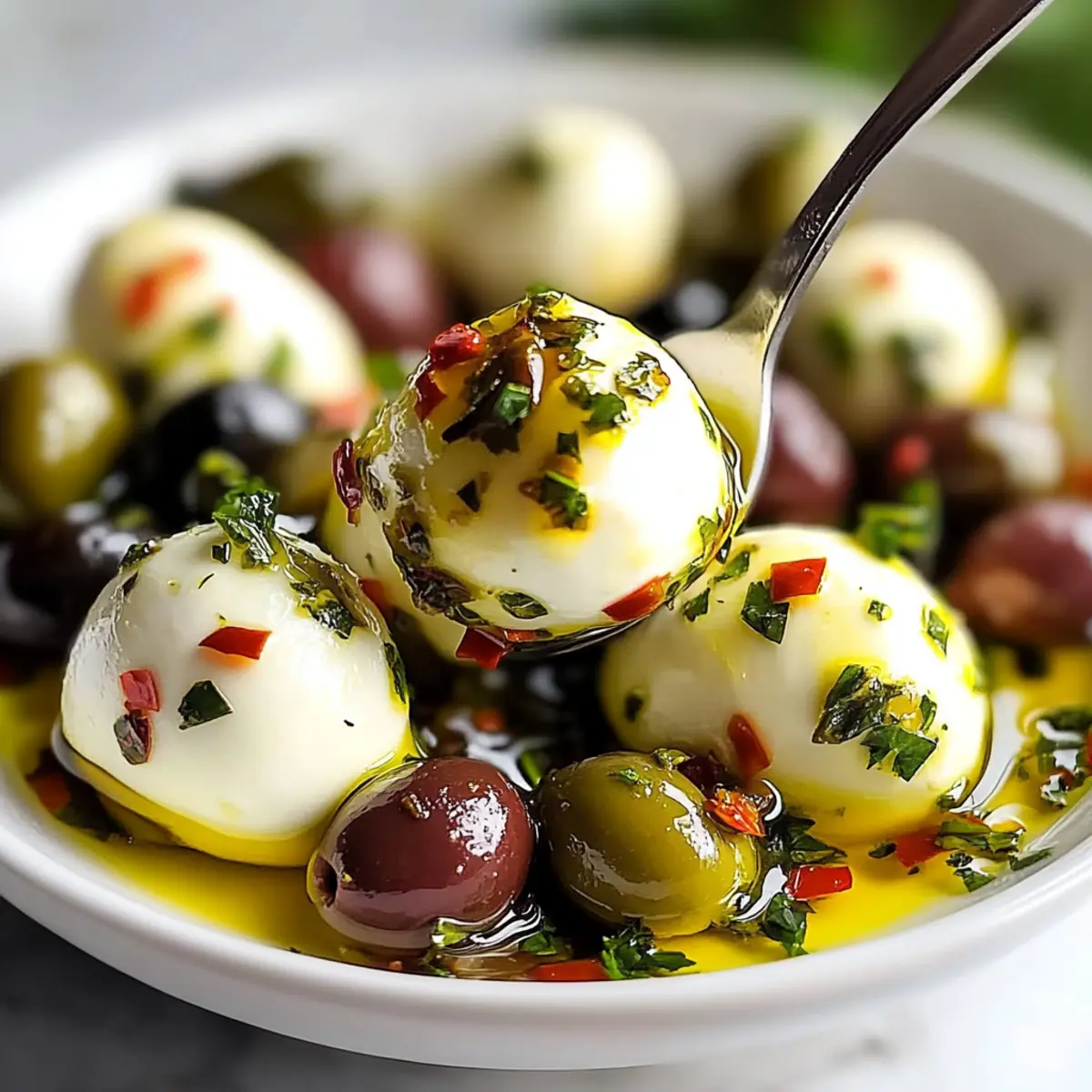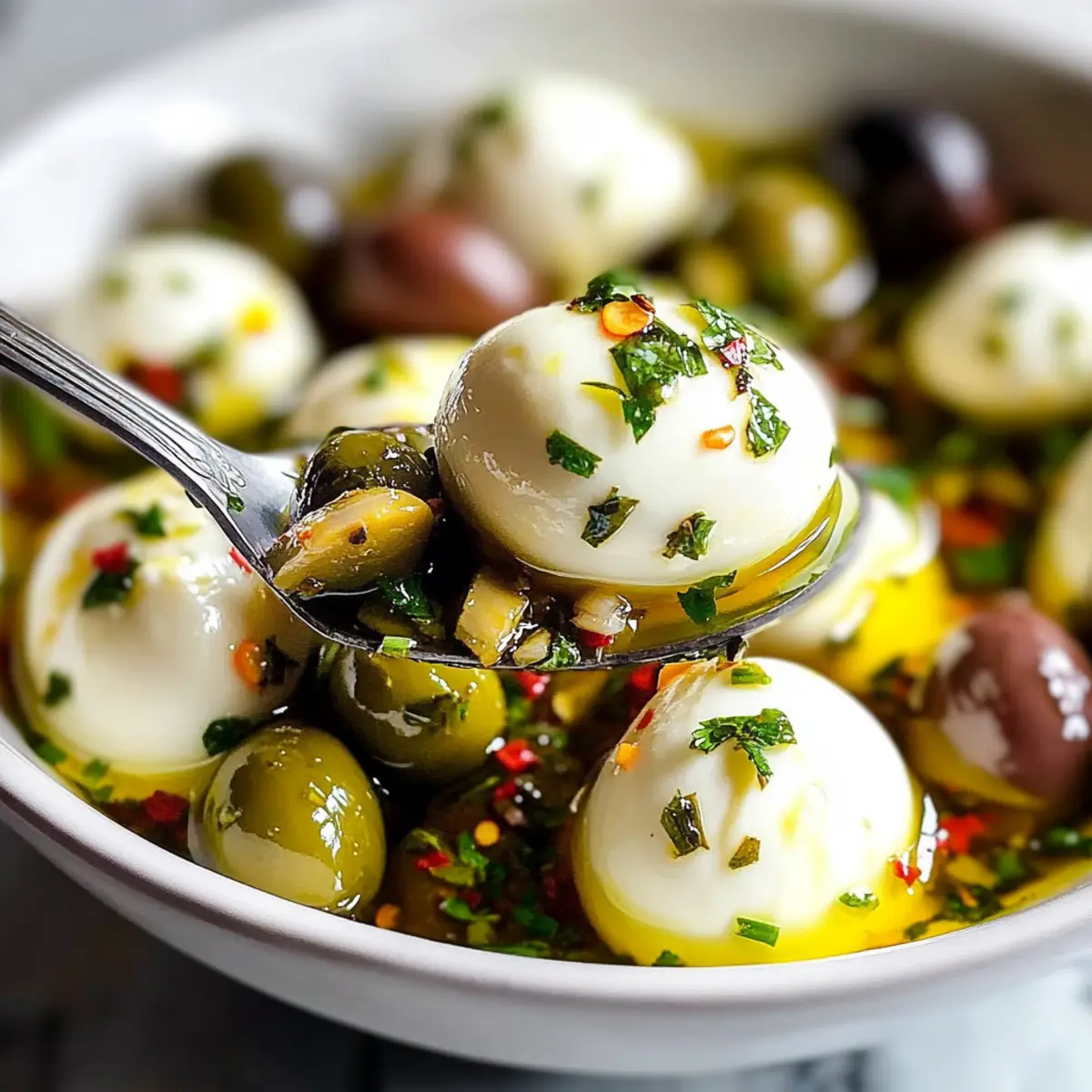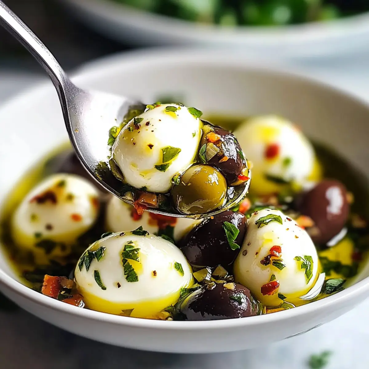 Jump to Recipe Print RecipeAs the aroma of garlic wafts through the kitchen, I can’t help but feel a tingle of excitement. Enter the Garlicky Marinated Mozzarella Balls with Olives—a dazzling no-cook appetizer that transforms any gathering into a flavorful Italian escape. This recipe not only dazzles the palate but also cuts down on prep time, giving you more moments to enjoy with your guests. Each creamy mozzarella ball, delicately marinated in a blend of olive oil and zesty garlic, offers an irresistible taste that will keep everyone coming back for seconds. Perfect for those who crave homemade goodness without the fuss, these marinated bites can even be made ahead of time, allowing the flavors to develop for an even richer experience. So, what are you waiting for? Let’s dive into the joys of crafting this delightful appetizer together! Why Are These Mozzarella Balls Irresistible? Unforgettable Flavor: Each creamy mozzarella ball is bathed in a luscious marinade bursting with garlic, olive oil, and vibrant herbs, creating a taste sensation that transports you straight to Italy. No-Cook Convenience: Perfect for those busy days, this easy appetizer requires minimal prep and no cooking, making it a breeze to whip up. Versatile Pairing: Serve them with crusty bread, crackers, or as part of a stunning charcuterie board for added flair. They’re an ideal companion to dishes like Grilled Lime Salmon or Chickpea Salad Grilled. Make-Ahead Magic: Prepare them in advance to enhance their flavors! These marinated bites taste even better after a day in the fridge, saving you time during those bustling gatherings. Crowd-Pleasing Delight: With their irresistible taste and colorful presentation, they’re sure to be a favorite at parties, ensuring your guests keep returning for more! Garlicky Marinated Mozzarella Balls with Olives Ingredients For the Marinade Olive Oil – Provides richness and acts as a base for the marinade; substitute with avocado oil for a lighter taste. Red Wine Vinegar – Adds acidity for balance; white wine vinegar can be used for a milder flavor. Minced Garlic – Imparts a robust aroma and flavor; substitute with garlic powder in smaller quantities if fresh is unavailable. Dried Italian Seasoning – Adds herbal depth; fresh herbs can provide a more vibrant flavor. Lemon Zest – Brightens flavor profile; lime zest can be a substitute. Salt – Enhances overall flavor; adjust based on sodium content in olives and artichokes. Black Pepper – Freshly ground adds spice and depth; pre-ground can be used but may lack flavor. For the Assembly Mini Fresh Mozzarella Balls – The star ingredient, soft and chewy; bocconcini can be substituted or cut in half for bite-size pieces. Pitted Green Olives – Provides a tangy contrast; black olives can be used for a different flavor profile. Marinated Artichokes – Adds texture and taste; skip if not available or use extra olives instead. Chopped Pistachios (optional) – Introduces a crunchy texture; almonds or walnuts can serve as alternatives. Discover the perfect combination of flavors with these Garlicky Marinated Mozzarella Balls with Olives that are sure to impress! Step‑by‑Step Instructions for Garlicky Marinated Mozzarella Balls with Olives Step 1: Whisk Together the Marinade In a medium bowl, combine olive oil, red wine vinegar, minced garlic, dried Italian seasoning, lemon zest, salt, and black pepper. Using a whisk, mix the ingredients together vigorously until fully emulsified and you see a glossy, smooth blend. This marinade is the foundation of your Garlicky Marinated Mozzarella Balls with Olives, so aim for a well-blended consistency. Step 2: Fold in the Delights Gently add the mini mozzarella balls, pitted green olives, and marinated artichokes into the bowl with the marinade. Use a spatula to carefully fold these ingredients into the mixture, ensuring that the mozzarella balls remain intact and don’t break apart. As you do this, let the flavors begin to combine and infuse into the delightful ingredients. Step 3: Marinate for Maximum Flavor Cover the bowl with plastic wrap or a lid, and let the mixture marinate at room temperature for about 30 minutes. For deeper flavors, refrigerate it for up to 3 days. As the mixture sits, the mozzarella will absorb all the garlicky goodness, making each bite of your Garlicky Marinated Mozzarella Balls with Olives a flavor explosion. Step 4: Finish with Fresh Elements Before serving, bring the marinated dish back to room temperature if it was refrigerated. Chop some fresh herbs, such as parsley or basil, and sprinkle them over the mozzarella balls along with the optional chopped pistachios for extra crunch. This final touch not only adds flavor but also enhances the beautiful presentation of your no-cook appetizer. Step 5: Serve and Savor Transfer the Garlicky Marinated Mozzarella Balls with Olives to a serving platter, ensuring they are beautifully arranged for visual appeal. Serve at room temperature alongside crusty bread or crackers. This dish is perfect for sharing, inviting your guests to enjoy the vibrant flavors and textures you’ve created. What to Serve with Garlicky Marinated Mozzarella Balls with Olives Elevate your gathering with delightful pairings that enhance the creamy, garlicky goodness of this irresistible appetizer. Crusty Bread: Perfect for scooping up the marinated mozzarella, it adds satisfying texture and helps absorb all the flavorful juices. Savory Crackers: Crisp and flavorful, these provide a fun crunch and a delightful contrast to the creamy mozzarella balls. Events feel more festive with these on the spread! Cherry Tomatoes: Juicy and sweet, they balance the richness of the cheese and add a burst of fresh flavor. Roasted Vegetables: The hearty, slightly smoky flavor of roasted peppers or zucchini complements the Italian herbs in the marinade and adds substance to your spread. Antipasto Platter: Include cured meats, nuts, and fresh olives to cr