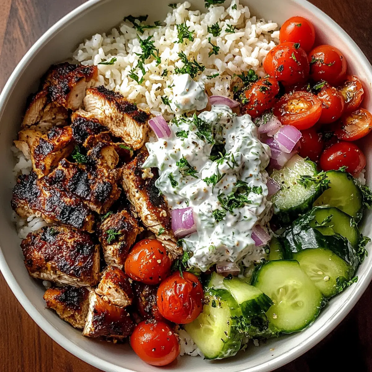 Enjoy Greek Chicken Gyro Bowls featuring marinated chicken, fresh veggies, and tzatziki sauce for a delightful weeknight dinner.