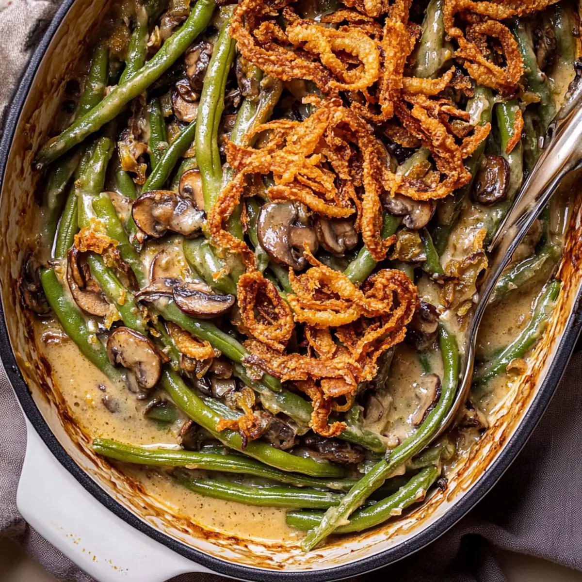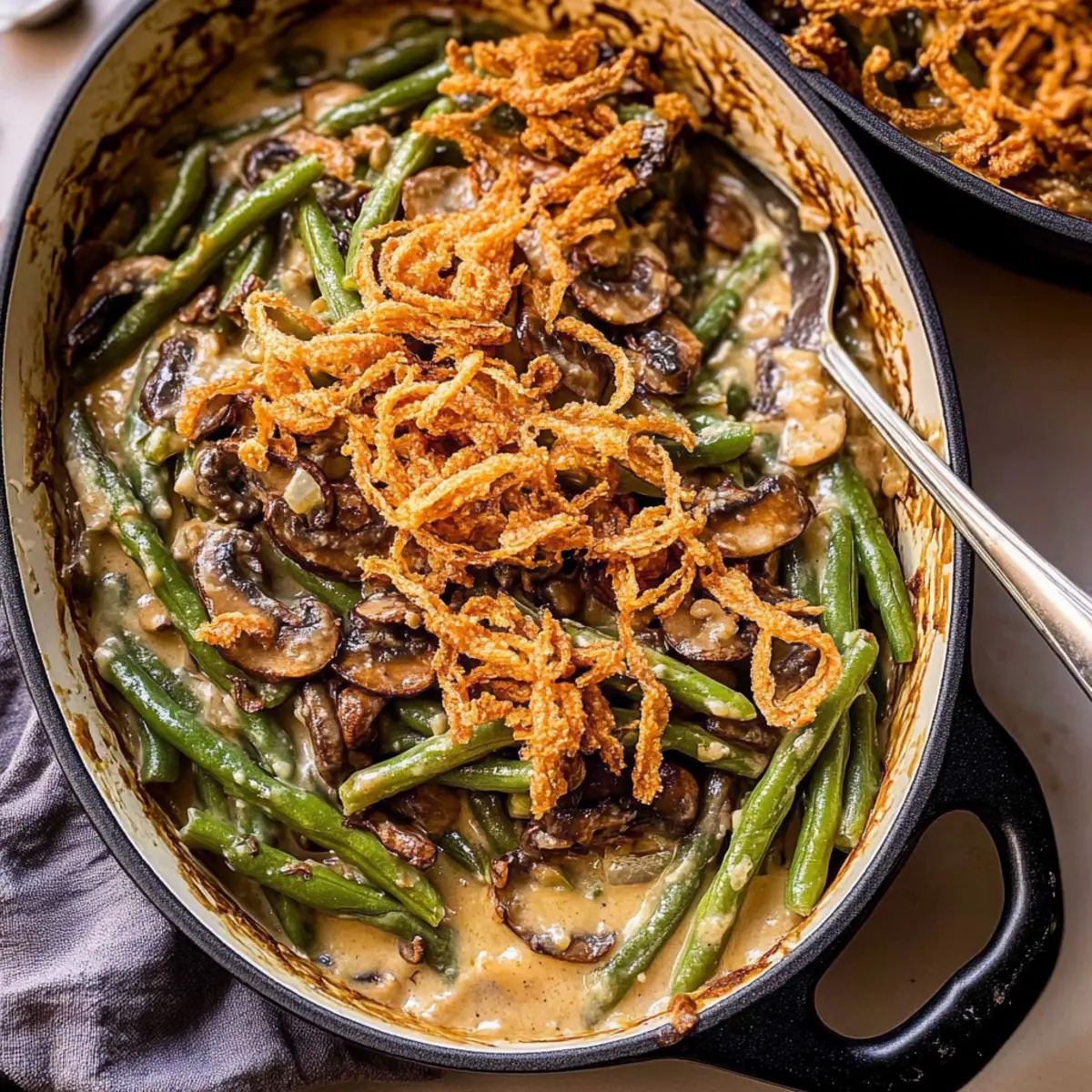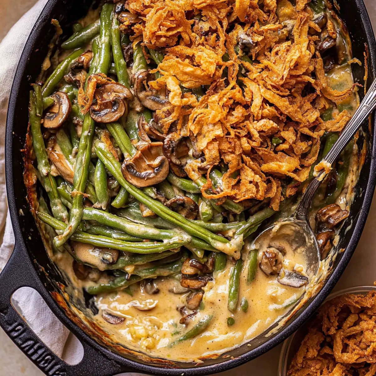 Jump to Recipe Print RecipeAs I stirred the pot on a chilly afternoon, the comforting aroma of sautéed mushrooms filled my kitchen, instantly transporting me to holiday gatherings of my childhood. This delightfully creamy Homemade Green Bean Casserole brings back those cherished memories, transforming a typical side dish into something extraordinary. With fresh green beans, a velvety homemade mushroom sauce, and crunchy fried shallots, it’s not only a crowd-pleaser but also a perfect opportunity to ditch processed ingredients for a wholesome upgrade. Easy to prepare and sure to impress, this recipe is ideal for holiday feasts or weeknight dinners alike. Are you ready to elevate your holiday table with flavors that invite everyone to come back for seconds? Let’s dive into this irresistible dish! Why is Homemade Green Bean Casserole a Must-Try? Irresistibly Creamy: The velvety homemade mushroom sauce elevates this dish like no canned soup can. Crispy Topping: Golden fried shallots add a satisfying crunch that balances the creaminess. Fresh Ingredients: Using bright green beans ensures a tender yet crunchy bite, making every forkful delightful. Easy to Make: This recipe is straightforward, perfect for both novice cooks and experienced chefs. Versatile Delight: Whether for holiday feasts or cozy weeknight dinners, this casserole appeals to all taste buds. Enjoy as a side with your favorite roast or as a comforting standalone dish! Green Bean Casserole Ingredients • Elevate your dish with these fresh choices! For the Casserole Green Beans – Fresh, tender-crisp green beans provide the main vegetable base for this comforting dish. Creamy Mushroom Sauce – A rich, homemade sauce made from fresh mushrooms and cream, it’s a delightful upgrade from canned versions. Parmesan Cheese – Adds a nutty depth of flavor; swap in nutritional yeast for a tasty dairy-free option. Butter – Use unsalted butter for cooking, allowing better control of your seasoning and enhancing the sauce’s flavor. Olive Oil – This works beautifully for sautéing the shallots and mushrooms, adding another layer of richness. For the Topping Fried Shallots – Homemade shallots offer a delicious crunch; store-bought can be used but freshness is key! Step‑by‑Step Instructions for Homemade Green Bean Casserole Step 1: Prepare the Green Beans Begin by bringing a large pot of salted water to a boil. Blanch fresh green beans in the boiling water for about 3-4 minutes until they turn bright green and become tender-crisp. Immediately transfer the beans to an ice water bath to stop the cooking process, then drain and set aside. This step is essential for ensuring your green beans retain a vibrant color and a slight crunch in the final casserole. Step 2: Make the Creamy Mushroom Sauce In a large skillet, melt 2 tablespoons of unsalted butter with 1 tablespoon of olive oil over medium heat. Sauté 1 cup of chopped shallots and 2 cloves of minced garlic until they become translucent, about 4-5 minutes. Add 8 ounces of sliced mushrooms to the pan and cook until browned and tender, approximately 6-8 minutes. Stir in 2 tablespoons of flour, cooking for an additional minute to form a roux, then gradually whisk in 1 cup of heavy cream. Let the sauce simmer for 5-7 minutes until it thickens. Step 3: Combine Ingredients In a large mixing bowl, combine the blanched green beans with the creamy mushroom sauce, stirring gently to coat evenly. Season the mixture with salt and pepper to taste, allowing the flavors to meld together. Transfer the combined ingredients into a greased baking dish, leveling the surface with a spatula. Top generously with crispy fried shallots and freshly grated parmesan cheese for that perfect crunch and flavor. Step 4: Bake the Casserole Set your oven to 375°F (190°C) and bake the assembled casserole for 20 minutes, or until it is hot and bubbling. Keep an eye on the top; after the initial baking time, remove the cover and continue baking for an additional 7-10 minutes to ensure the fried shallots turn golden and crispy. The delicious aroma will fill your kitchen, signaling it’s almost time to enjoy your homemade Green Bean Casserole. Step 5: Let It Rest and Serve Once baked, remove the casserole from the oven and let it rest for about 5 minutes to allow the sauce to settle. This step enhances the texture and makes serving easier. Serve warm as a delectable side dish during holiday feasts or cozy family dinners, reveling in the flavors of your homemade creation. Expert Tips for Green Bean Casserole Perfectly Blanched Beans: Blanch your green beans for 3-4 minutes, then shock them in ice water to lock in crunch and color. Homemade Sauce Wins: Avoid shortcuts with canned soup; the creamy mushroom sauce gives the casserole its rich flavor. Crispy Shallots: To keep fried shallots crispy, let them cool completely before topping the casserole to prevent sogginess. Seasoning Balance: Taste the creamy sauce before mixing; adjust salt and pepper to ensure each bite of green bean casserole is flavorful. Make-Ahead Flexibility: Prepare everything ahead of time and refrigerate; just pop it in the oven when you’re ready for a hassle-free holiday side! Make Ahead Options These Homemade Green Bean Casseroles are a lifesaver for busy weeknights! You can prepare the entire casserole (without baking) up to two days in advance. Simply follow the instructions to blanch the green beans and make the creamy mushroom sauce, then combine them in a baking dish, covering it tightly with plastic wrap to refrigerate. To maintain quality, avoid adding the fried shallots until you’re ready to bake; this ensures they stay crispy. When it’s time to serve, simply remove the casserole from the fridge, top with fried shallots and parmesan cheese, and bake at 375°F (190°C) for 20 minutes, adding another 7-10 minutes uncovered. Enjoy restaurant-quality results with minimal effort! What to Serve with Homemade Green Bean Casserole